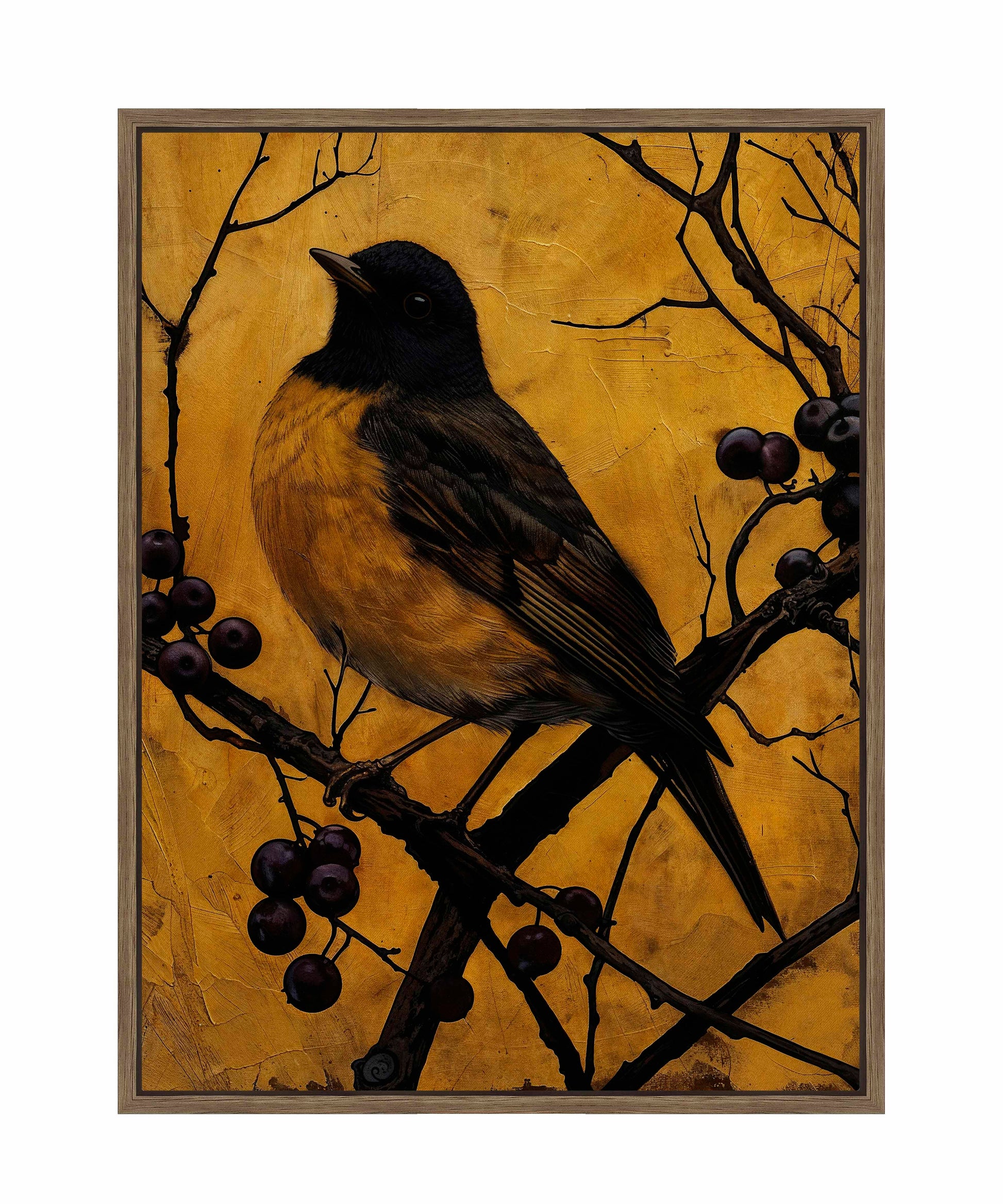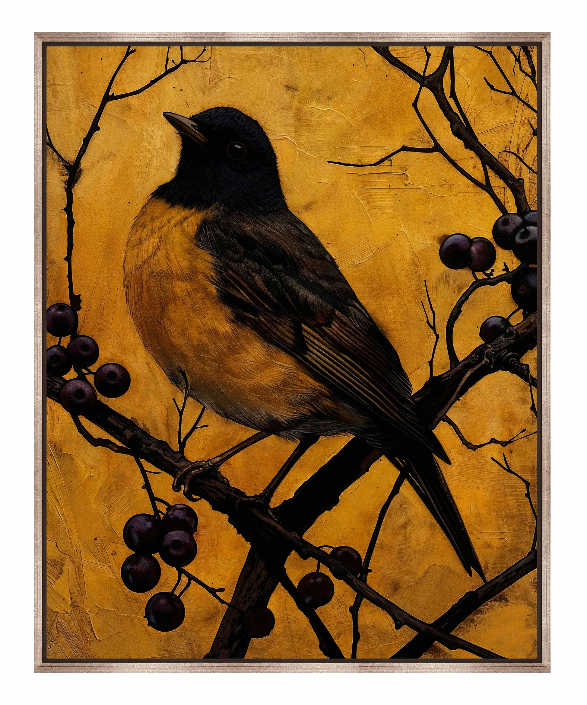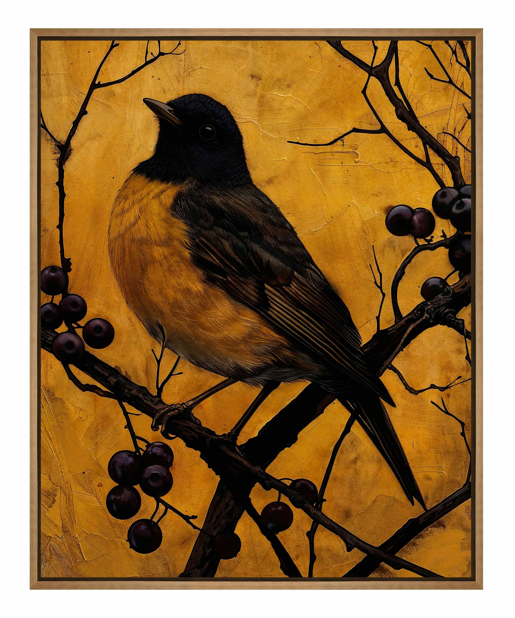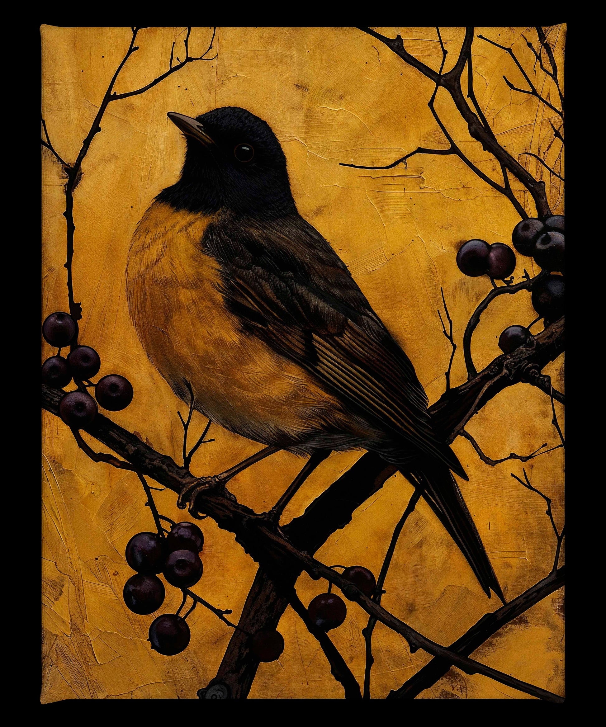 Golden Twilight - Warbler Among Berries is a stunning artwork that captures the serene beauty and elegance of a warbler perched on a branch adorned with dark berries. The painting features a warbler with rich, golden-yellow plumage and deep brown feathers, meticulously detailed to highlight the bird's natural grace.
