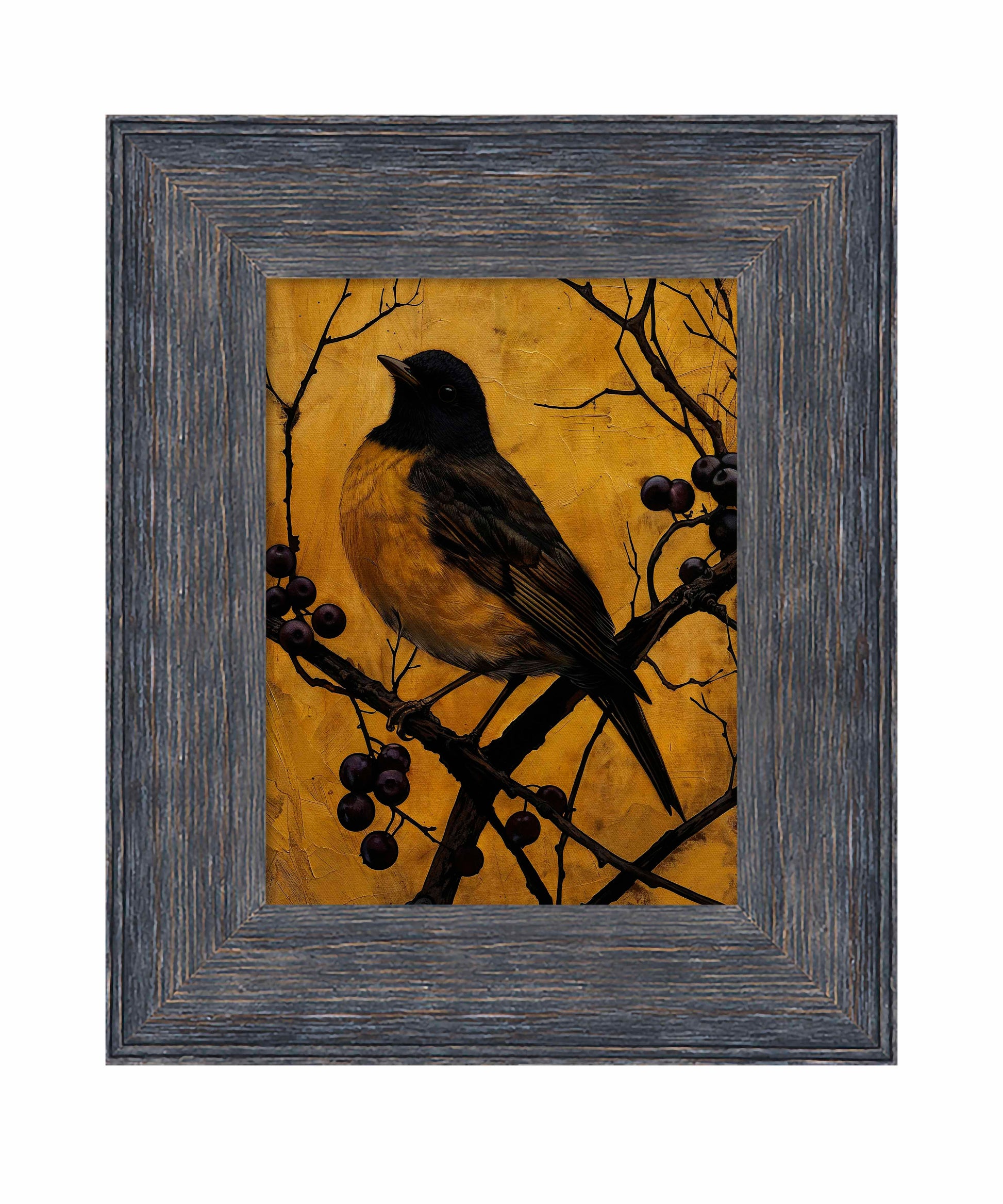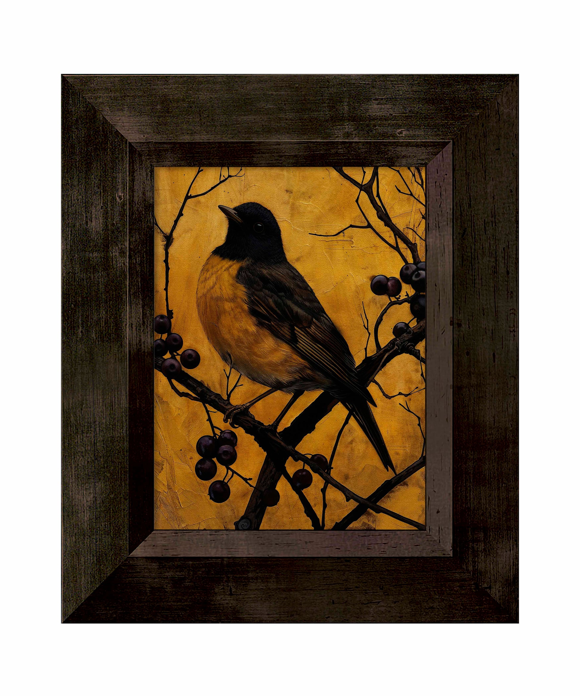 The artist's masterful use of a warm, golden backdrop enhances the dramatic effect of the scene, making the warbler stand out against the richly hued berries and branches. The subtle interplay of light and shadow adds depth and dimension, bringing the composition to life and inviting viewers to immerse themselves in the tranquil moment captured in the painting.