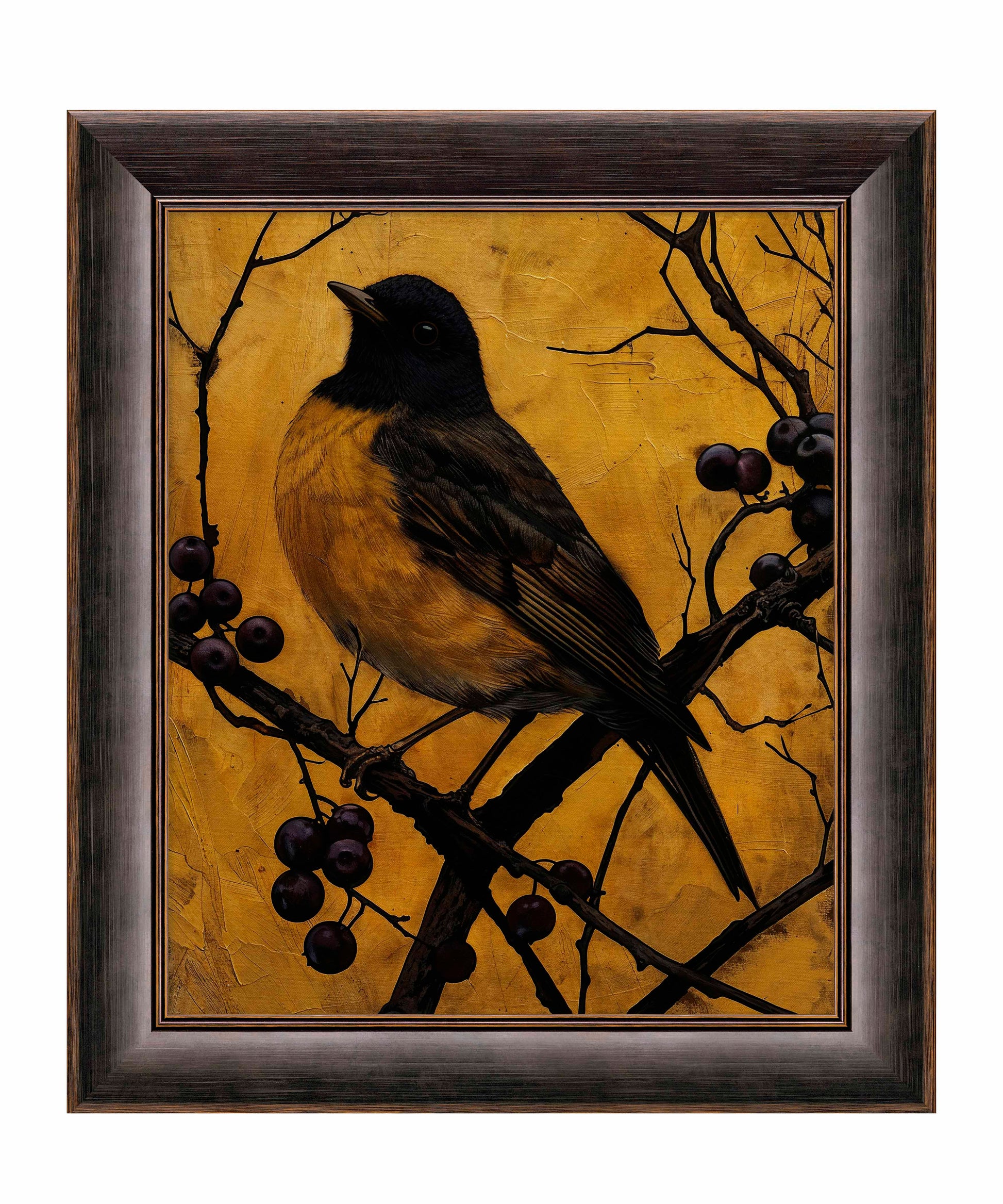 Golden Twilight - Warbler Among Berries is a stunning artwork that captures the serene beauty and elegance of a warbler perched on a branch adorned with dark berries. The painting features a warbler with rich, golden-yellow plumage and deep brown feathers, meticulously detailed to highlight the bird's natural grace.