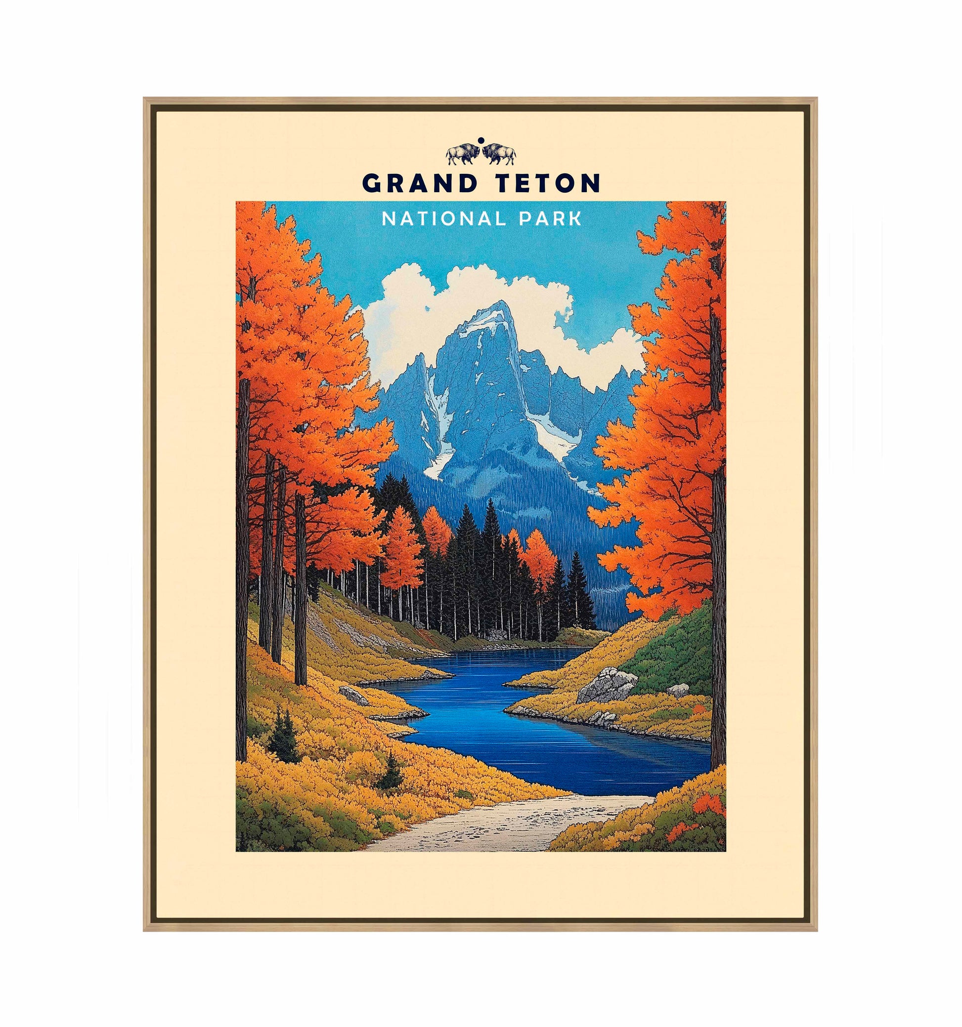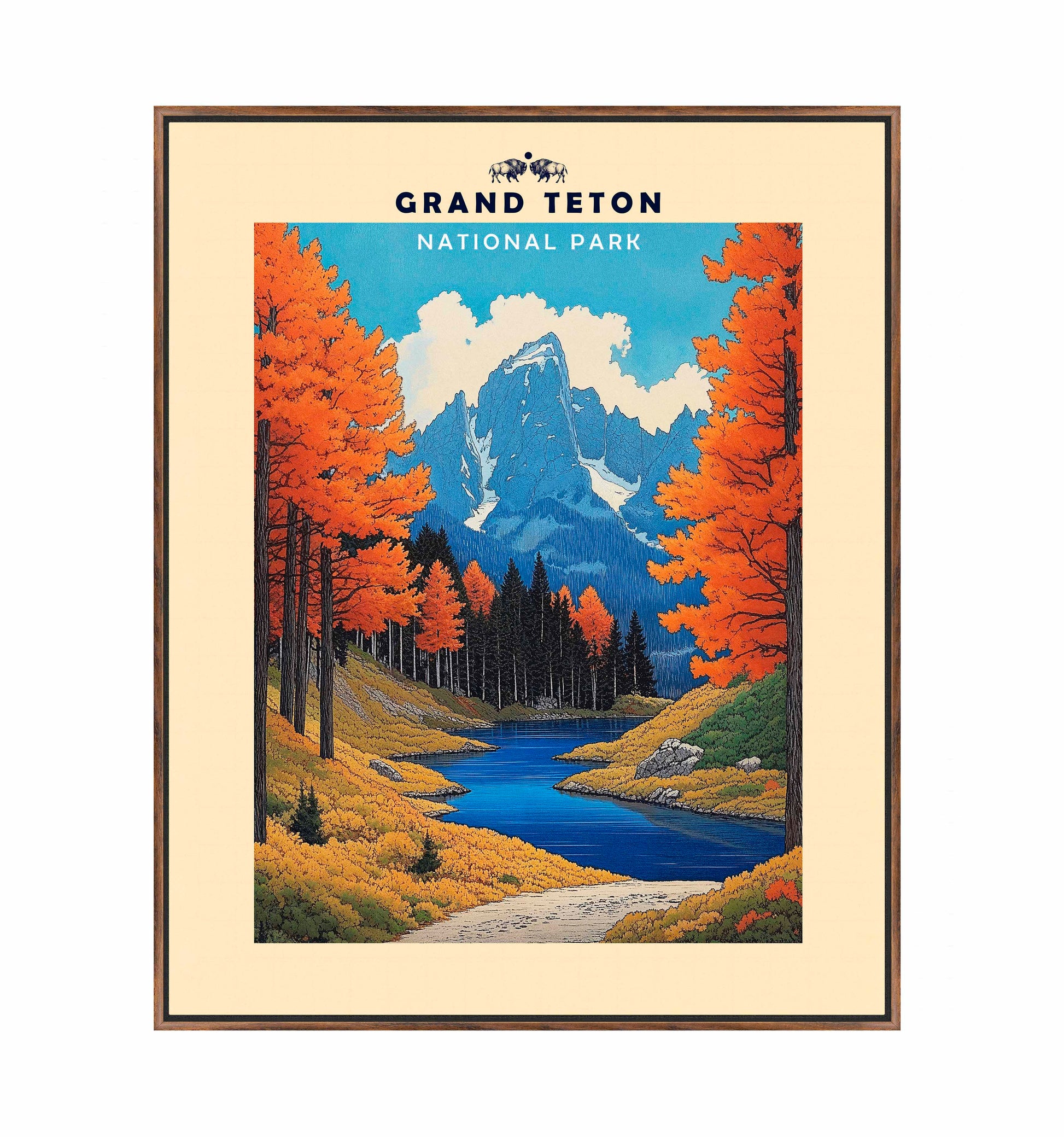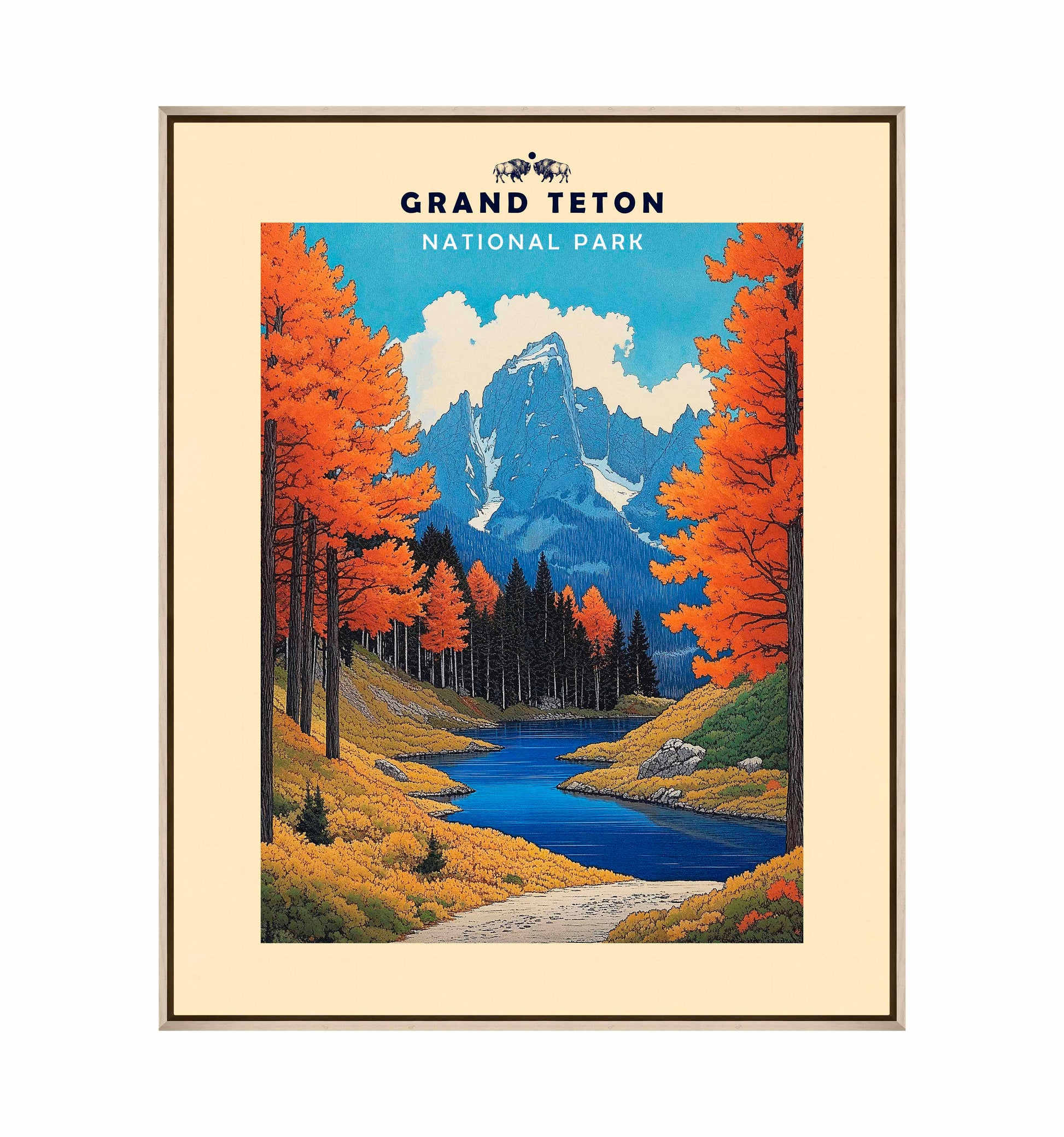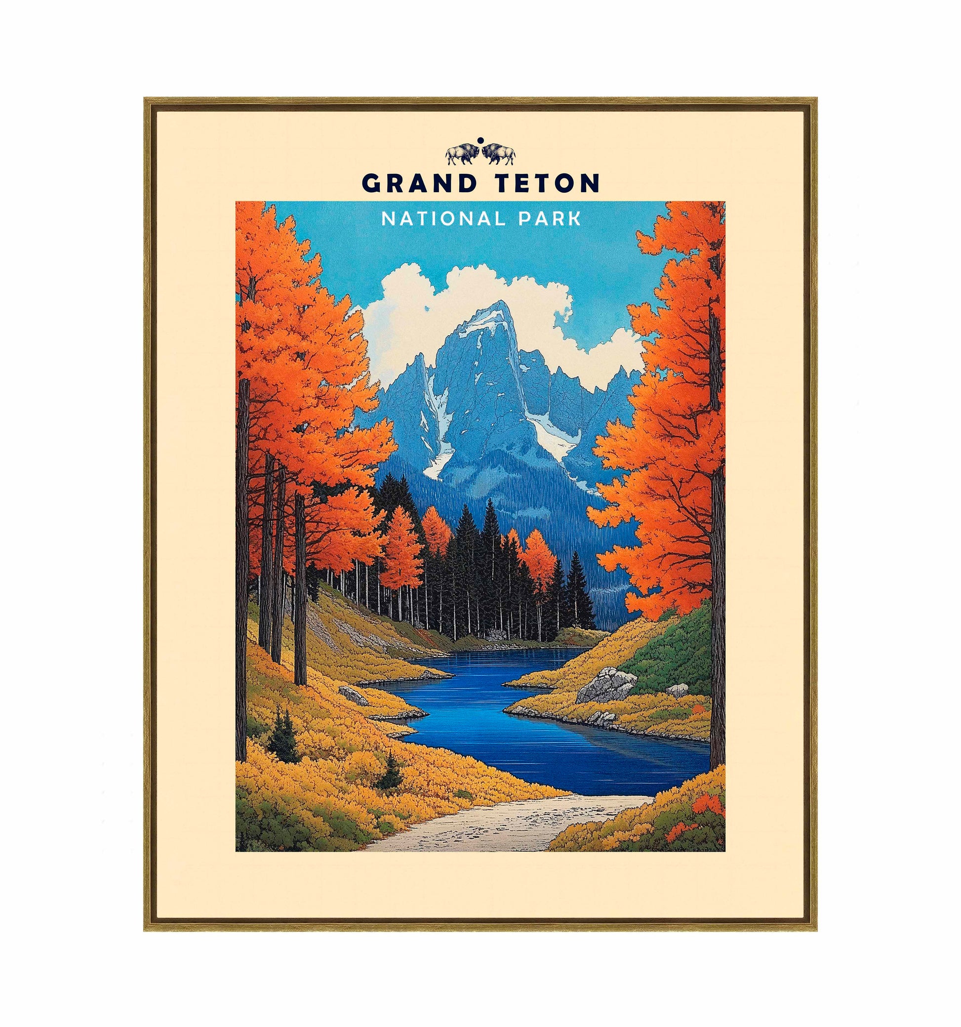 This vintage-style poster art of Grand Teton National Park captures the park's iconic beauty in a vibrant autumnal scene. The composition is dominated by the majestic, snow-capped peaks of the Teton Range, their jagged silhouettes rising dramatically against a bright blue sky and billowing white clouds. In the foreground, a winding blue river cuts through a golden valley, flanked by trees ablaze in vivid orange fall colors. The scene is framed by tall evergreens and deciduous trees, creating a natural window that draws the eye towards the mountains. The artwork's use of bold, contrasting colors - particularly the interplay of orange, blue, and gold - evokes the park's stunning fall scenery. This striking design not only showcases the park's diverse landscapes but also invites viewers to imagine experiencing the grandeur of the Tetons amidst the changing seasons.