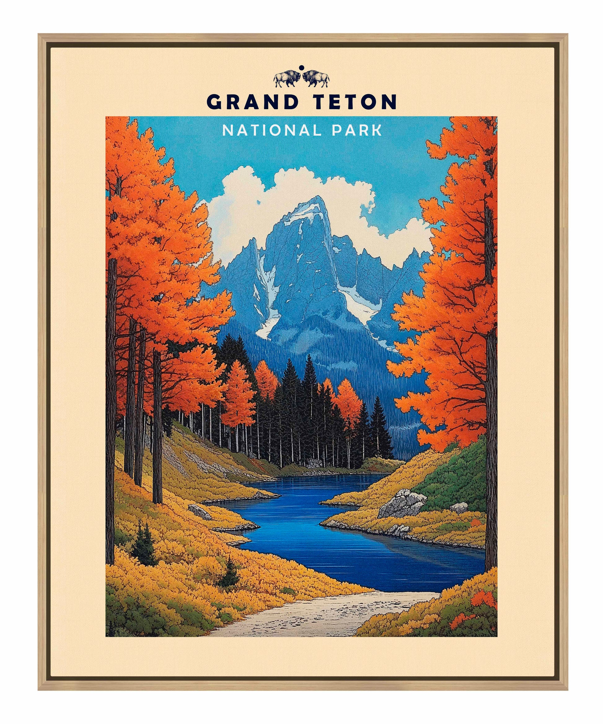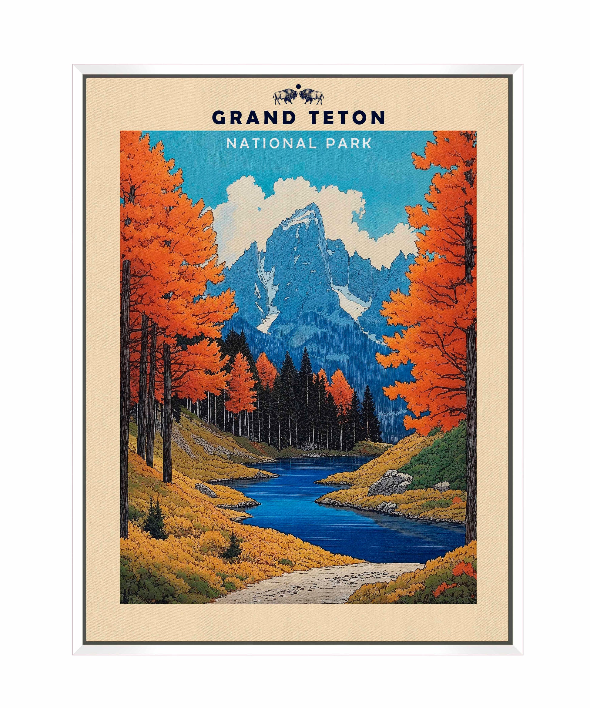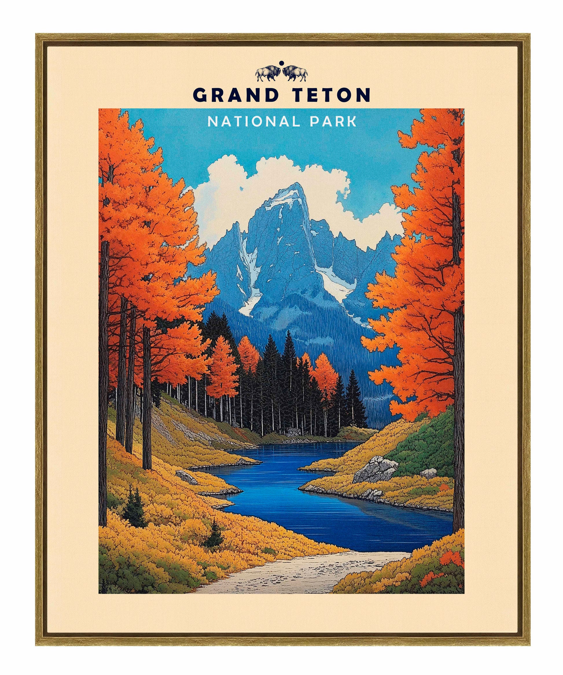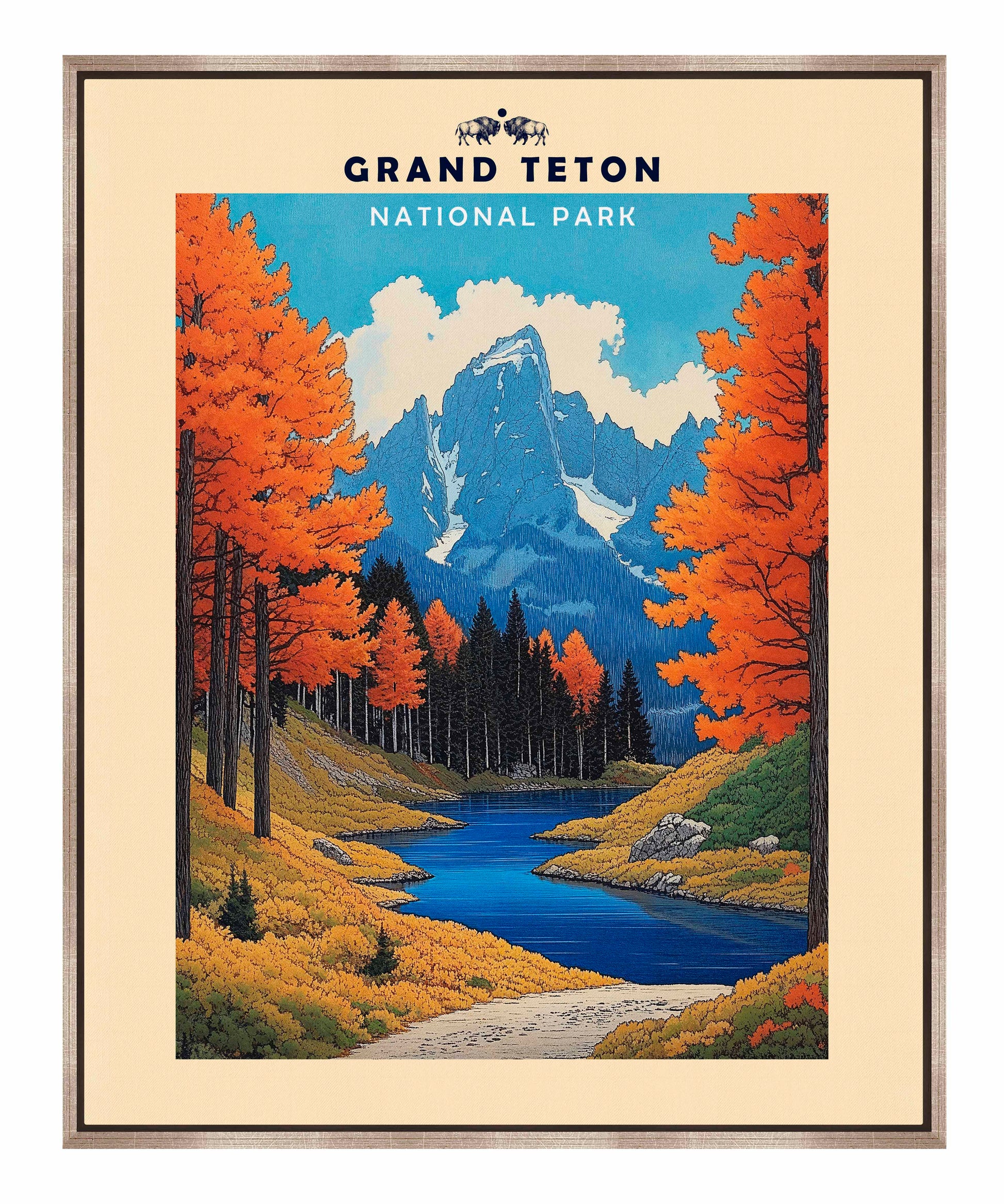 This vintage-style poster art of Grand Teton National Park captures the park's iconic beauty in a vibrant autumnal scene. The composition is dominated by the majestic, snow-capped peaks of the Teton Range, their jagged silhouettes rising dramatically against a bright blue sky and billowing white clouds. In the foreground, a winding blue river cuts through a golden valley, flanked by trees ablaze in vivid orange fall colors. The scene is framed by tall evergreens and deciduous trees, creating a natural window that draws the eye towards the mountains. The artwork's use of bold, contrasting colors - particularly the interplay of orange, blue, and gold - evokes the park's stunning fall scenery. This striking design not only showcases the park's diverse landscapes but also invites viewers to imagine experiencing the grandeur of the Tetons amidst the changing seasons.