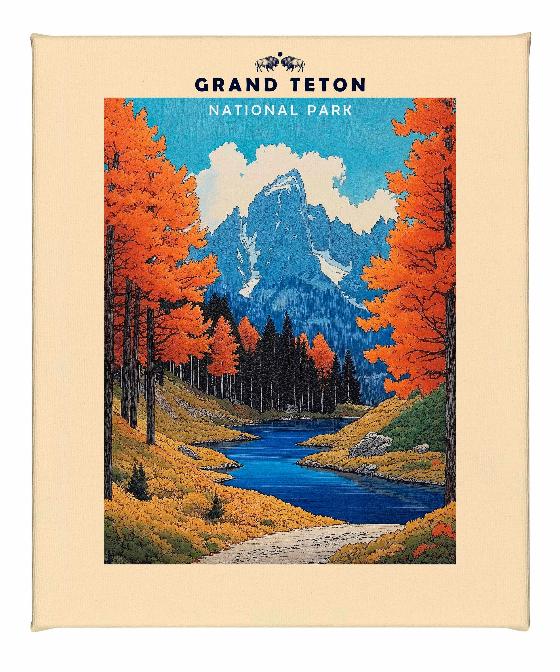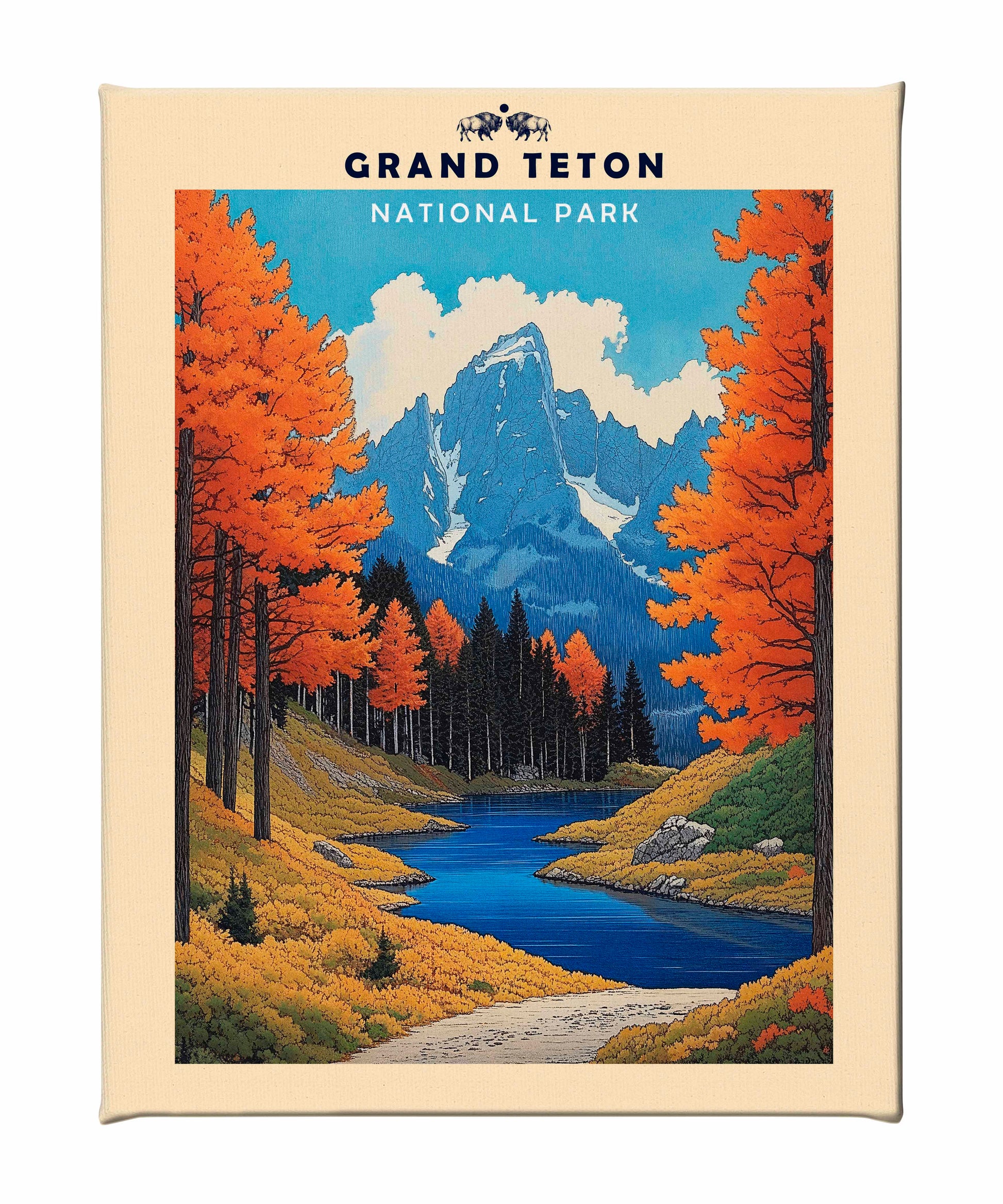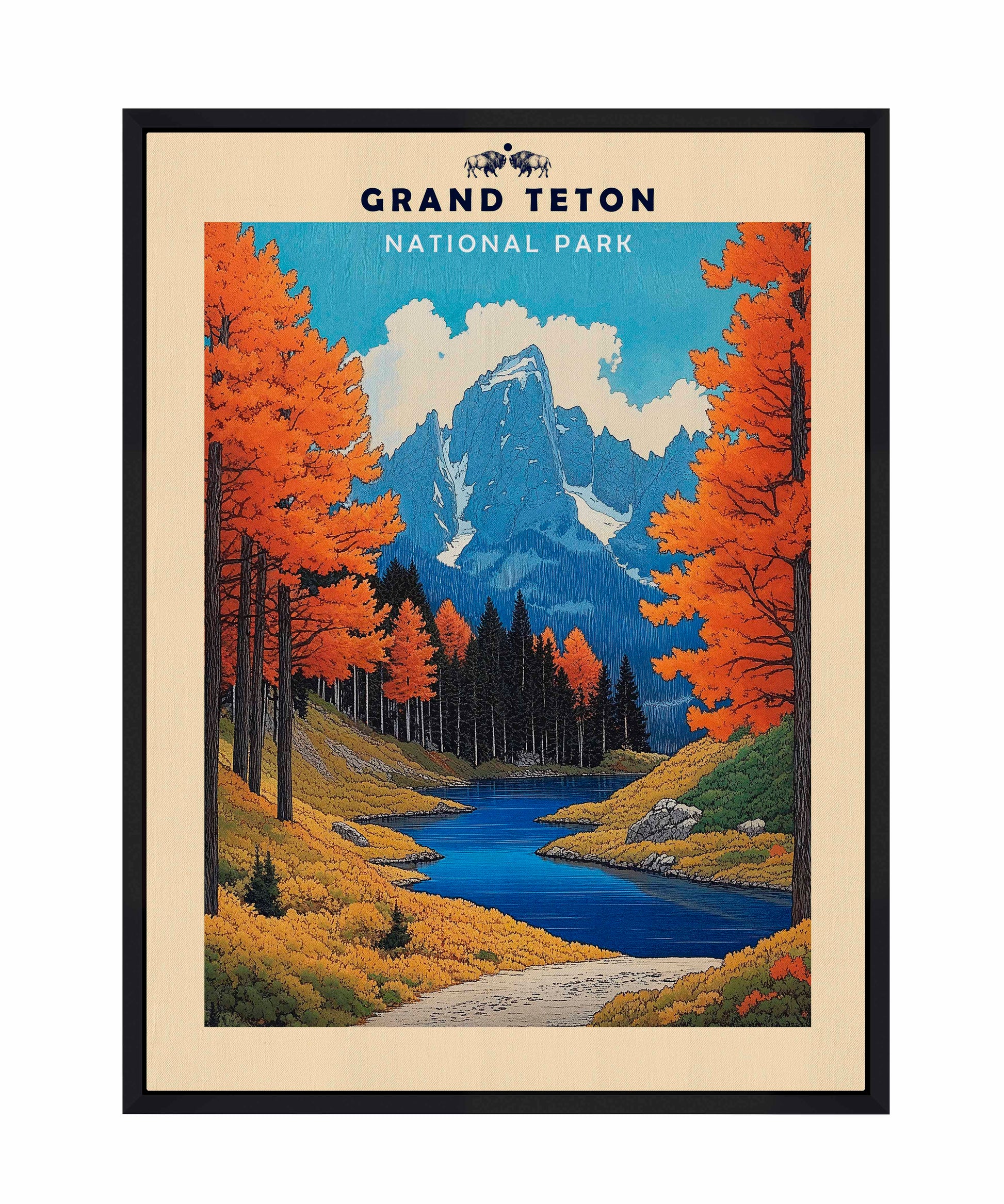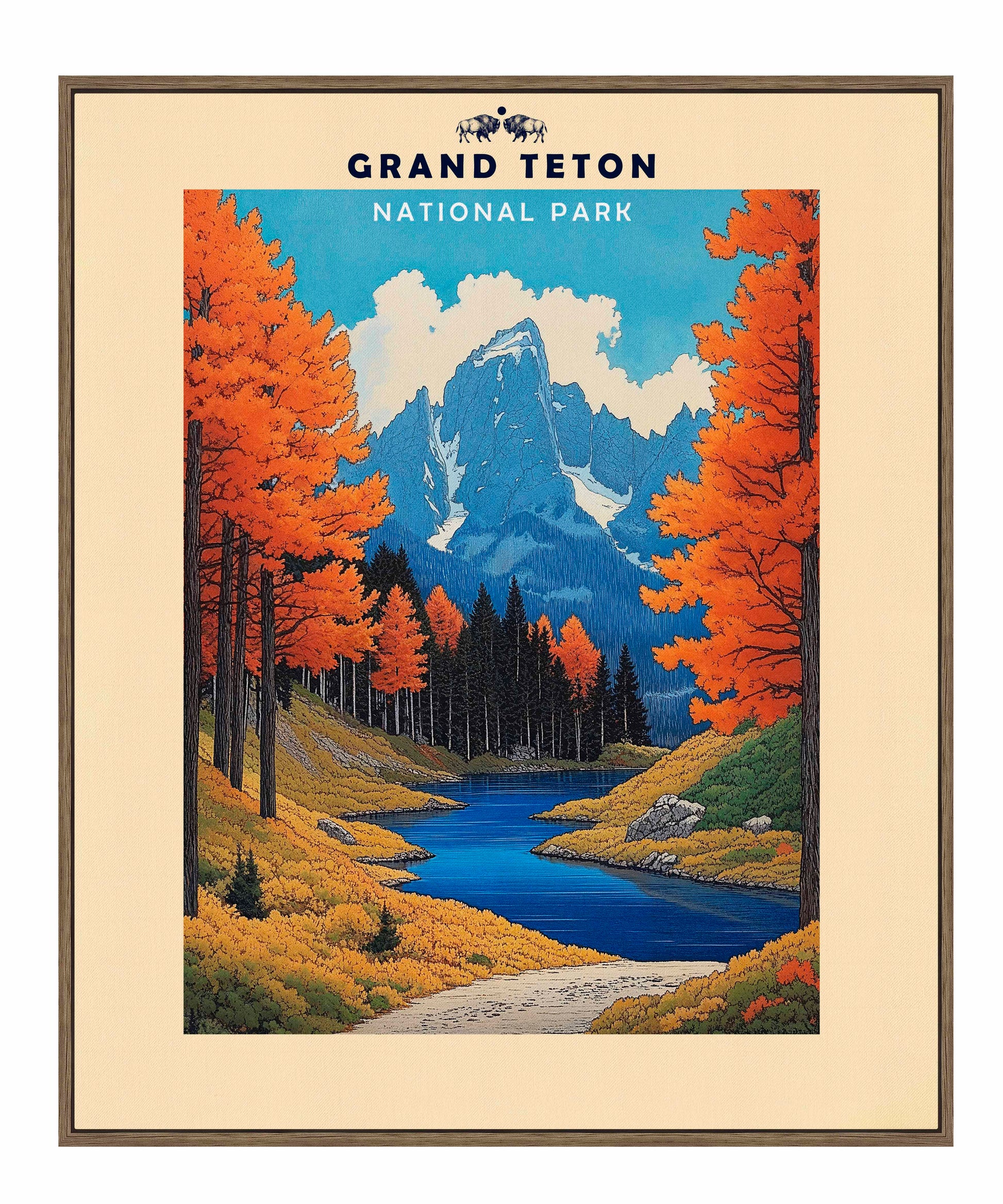 This vintage-style poster art of Grand Teton National Park captures the park's iconic beauty in a vibrant autumnal scene. The composition is dominated by the majestic, snow-capped peaks of the Teton Range, their jagged silhouettes rising dramatically against a bright blue sky and billowing white clouds. In the foreground, a winding blue river cuts through a golden valley, flanked by trees ablaze in vivid orange fall colors. The scene is framed by tall evergreens and deciduous trees, creating a natural window that draws the eye towards the mountains. The artwork's use of bold, contrasting colors - particularly the interplay of orange, blue, and gold - evokes the park's stunning fall scenery. This striking design not only showcases the park's diverse landscapes but also invites viewers to imagine experiencing the grandeur of the Tetons amidst the changing seasons.