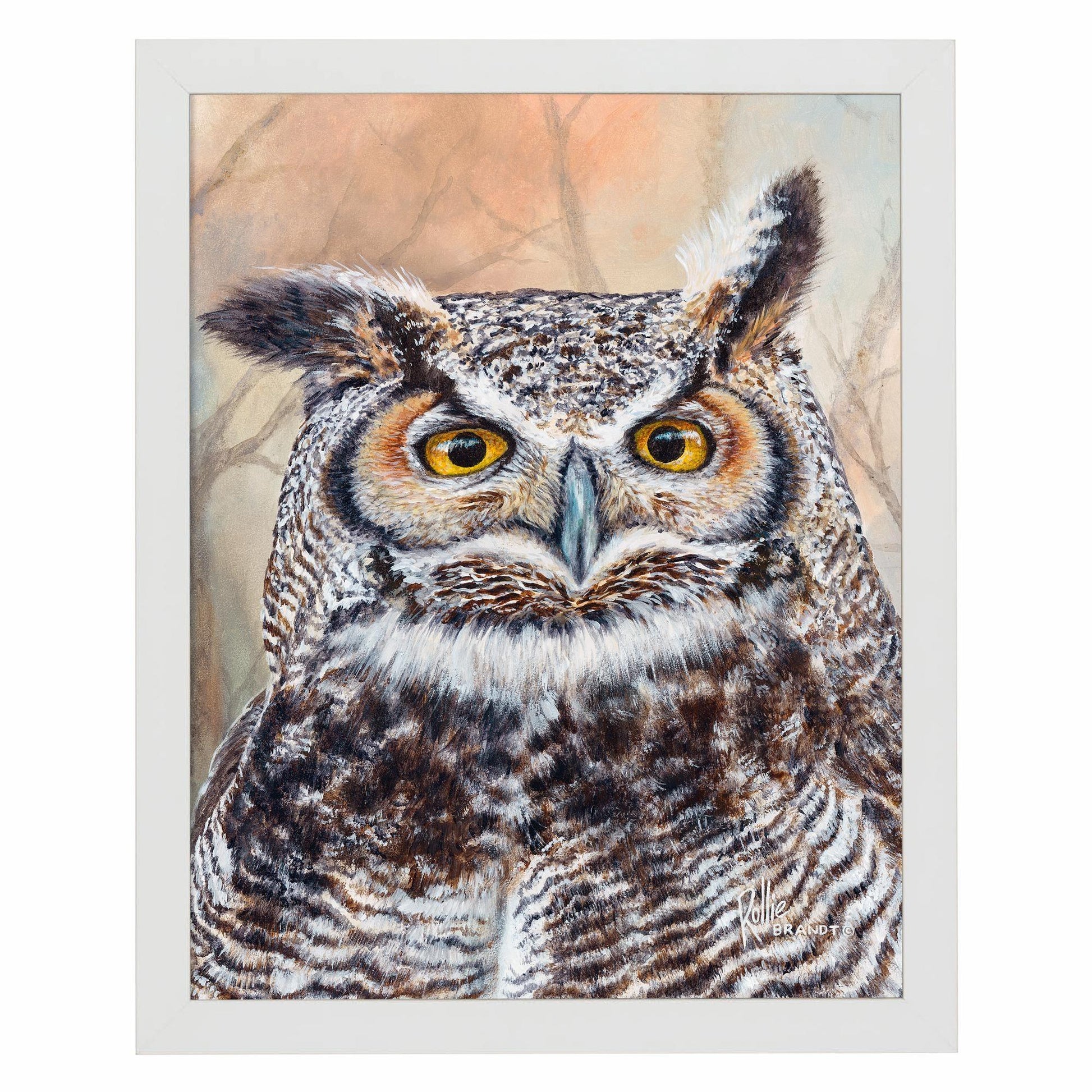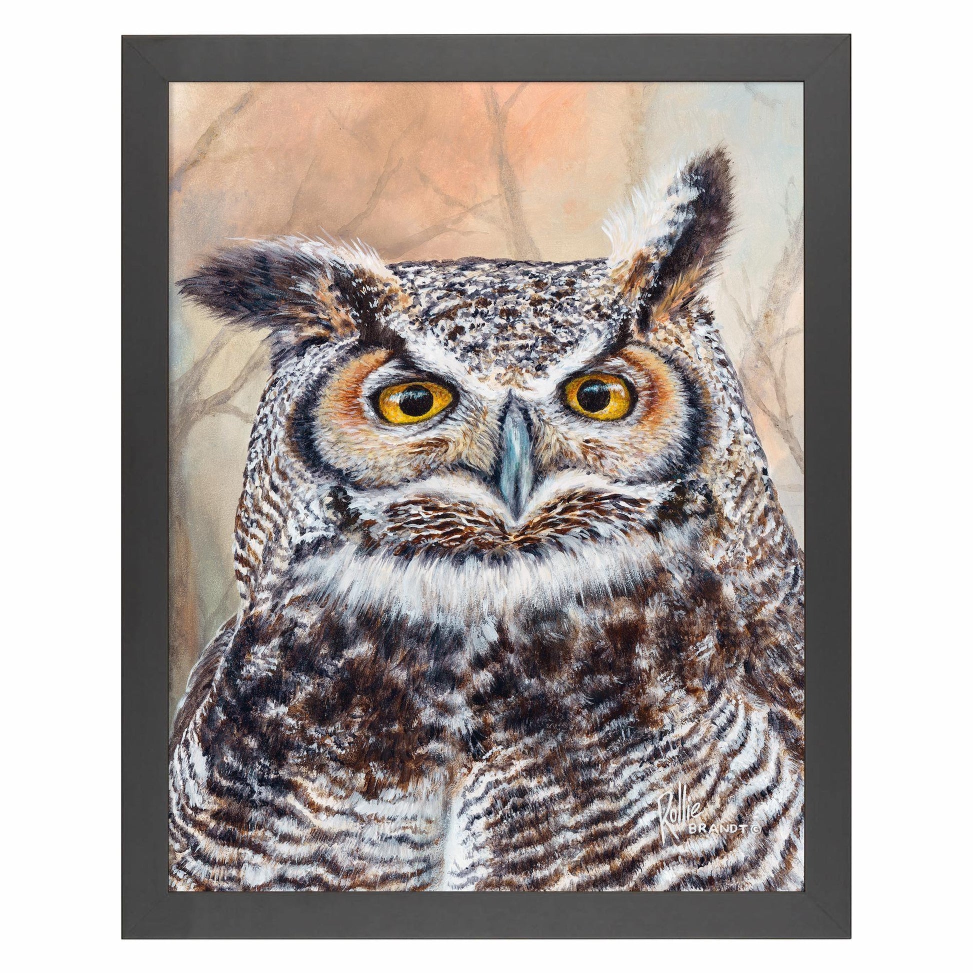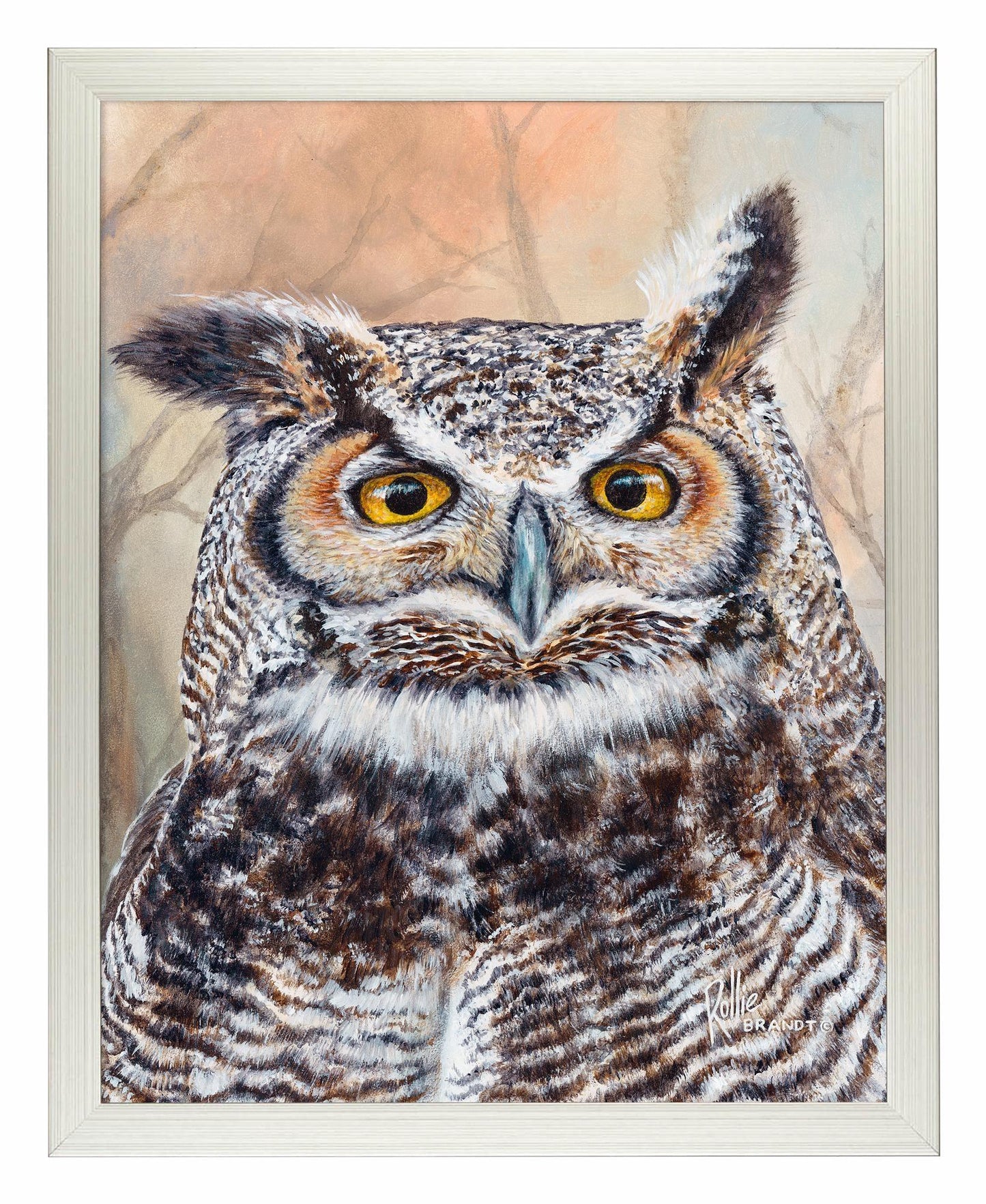 Open edition art print made from the original acrylic painting depicting a portrait of a majestic great horned owl. Image size, 14" x 11. Framed size, 16" x 13" with 1" brushed silver finished moulding. Published exclusively by Wild Wings; a division of Art Brand Studios.