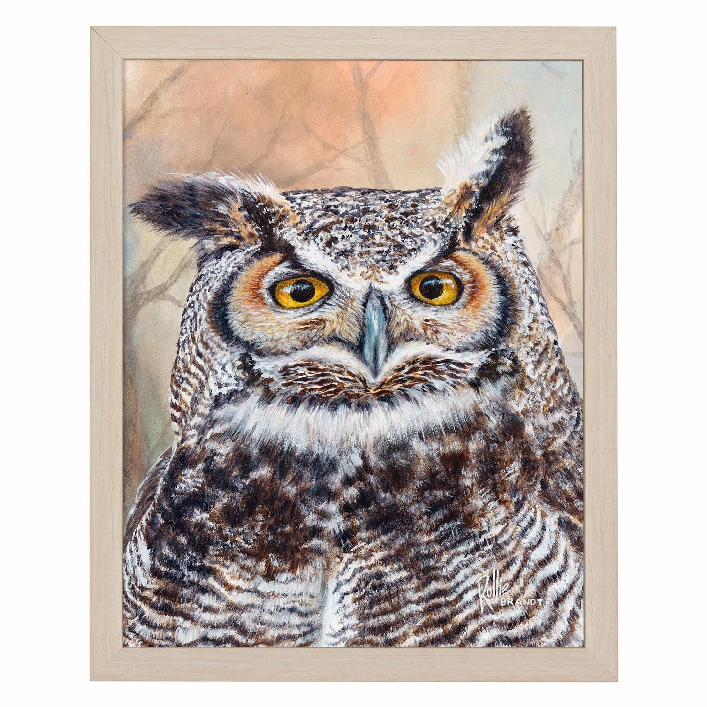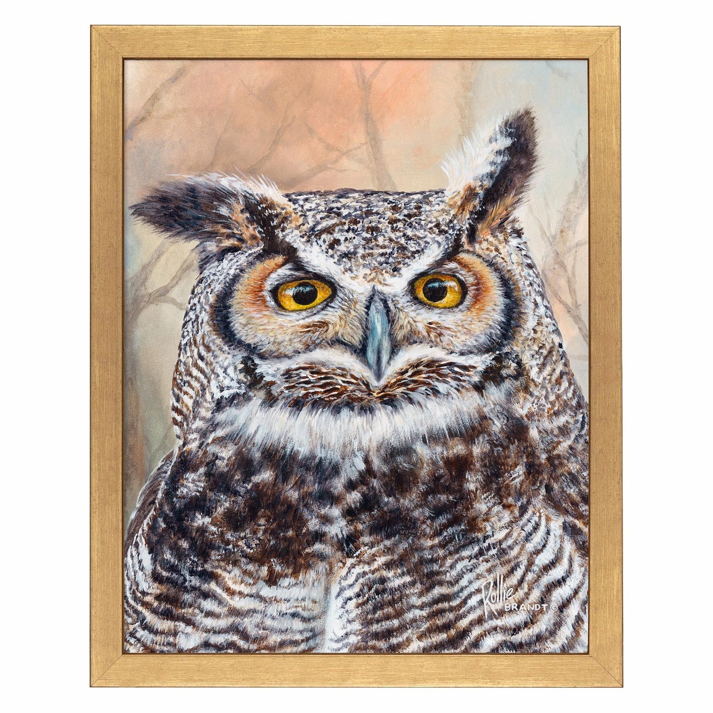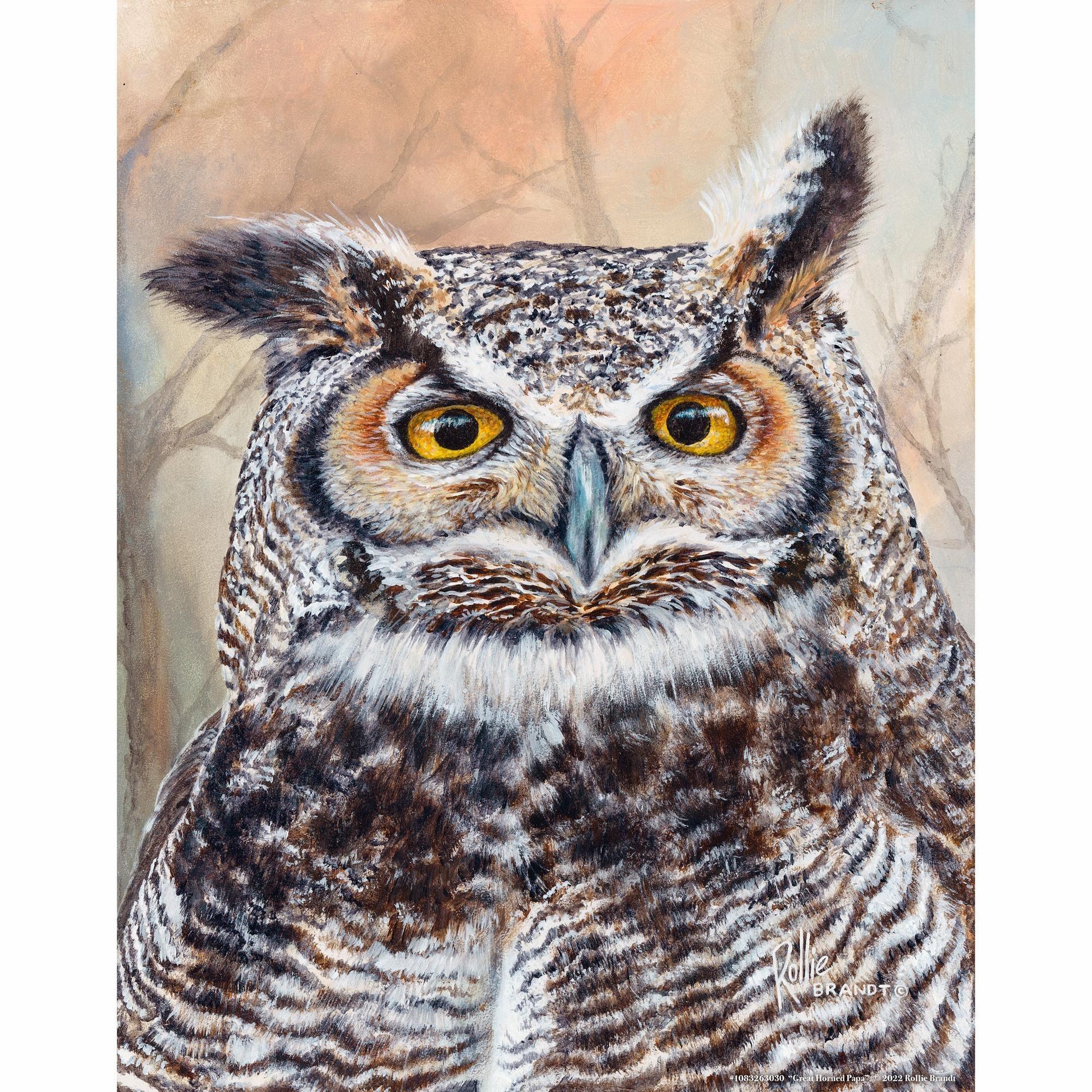 Open edition art print made from the original acrylic painting depicting a portrait of a majestic great horned owl. Image size, 14" x 11. Framed size, 16" x 13" with 1" brushed silver finished moulding. Published exclusively by Wild Wings; a division of Art Brand Studios.