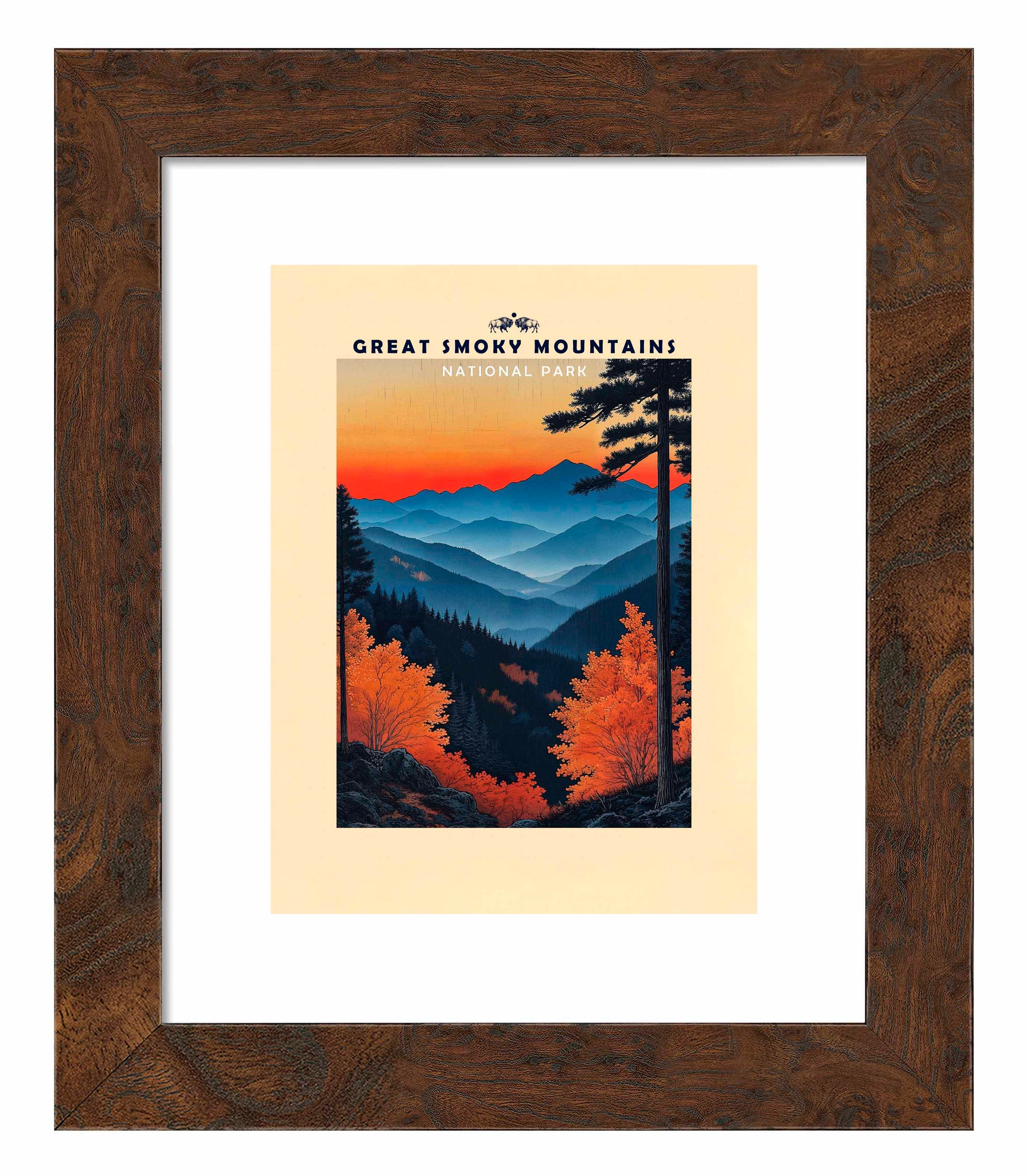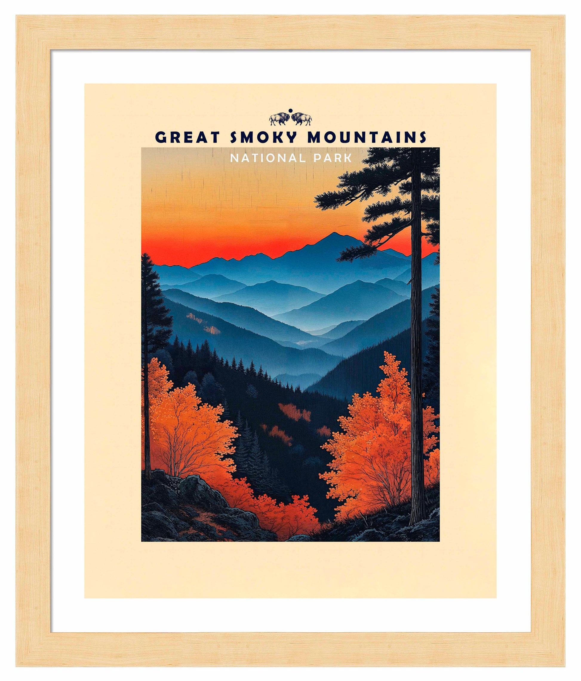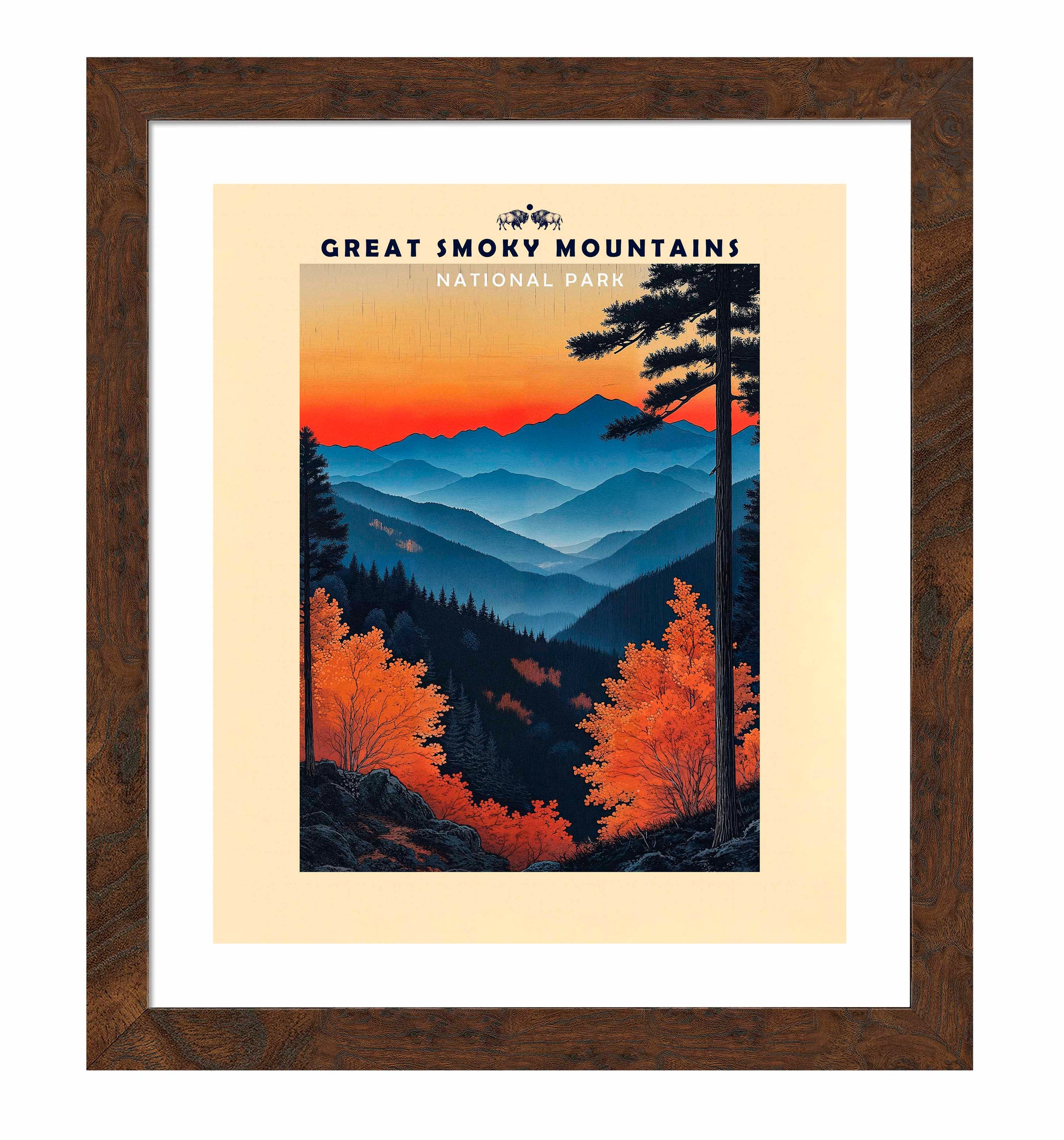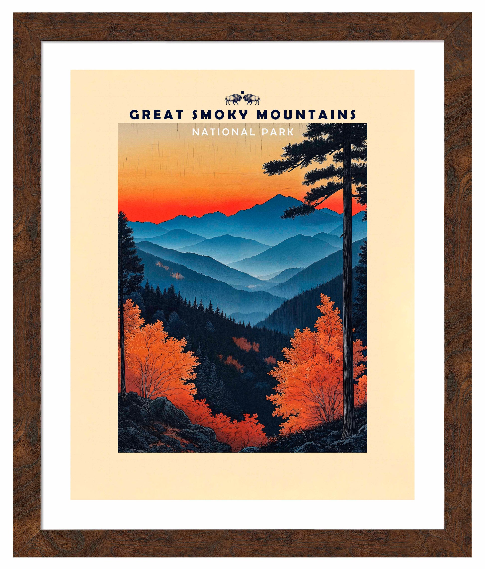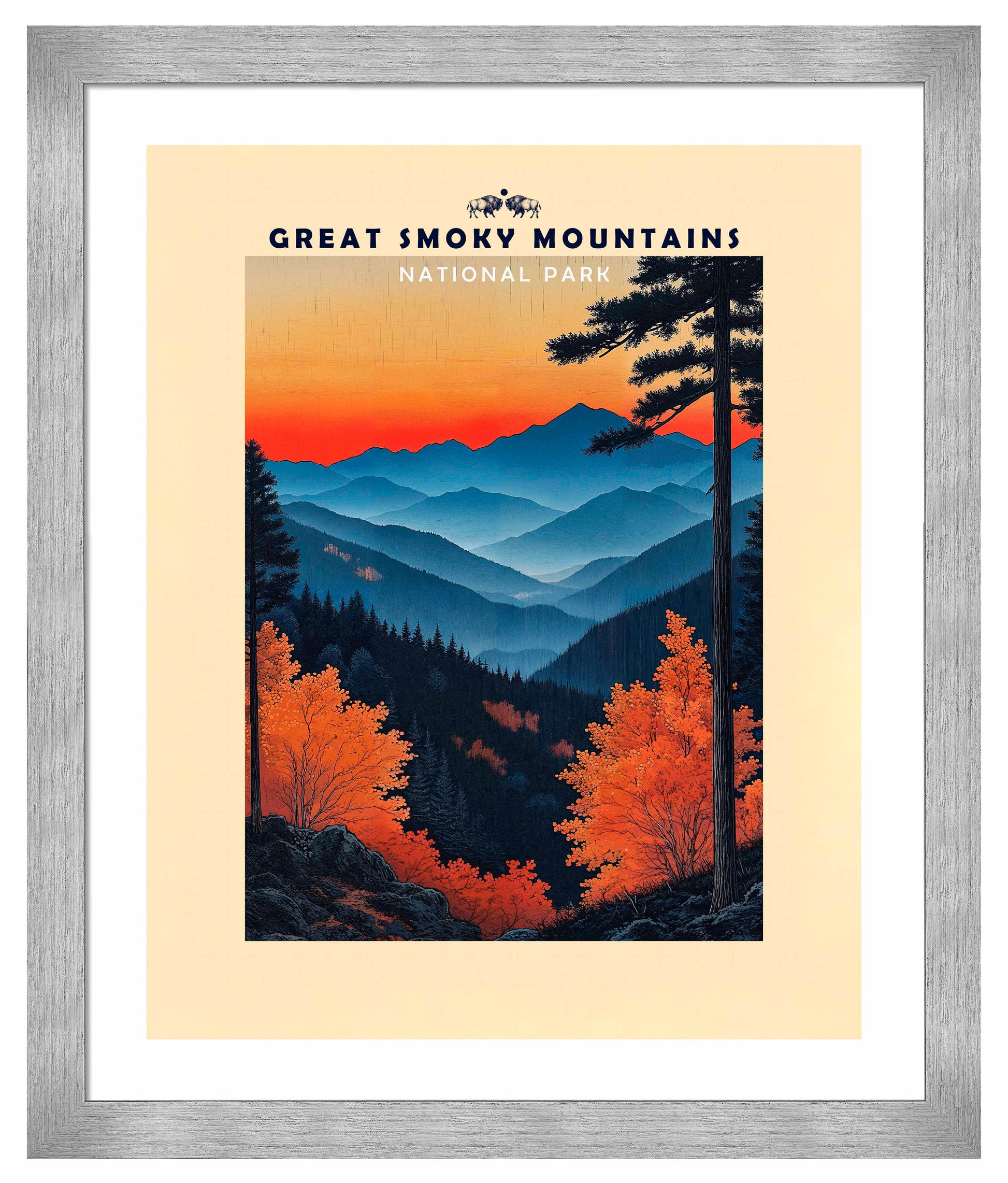 This vintage-style poster art of Great Smoky Mountains National Park beautifully captures the essence of its namesake landscape. The composition showcases a sweeping vista of layered mountain ridges receding into the distance, creating the park's signature "smoky" effect through the use of gradually lightening shades of blue. The foreground is framed by vibrant autumn foliage in fiery orange, providing a striking contrast to the cool blues of the mountains. A lone evergreen stands tall on the right, adding vertical interest and depth to the scene. The sky is ablaze with a dramatic sunset, transitioning from deep red at the horizon to softer oranges and yellows above, perfectly complementing the fall colors below. This interplay of warm and cool colors is characteristic of mid-20th century travel poster aesthetics and effectively conveys the park's stunning beauty during the changing seasons. The artwork masterfully captures the park's diverse flora, the majesty of its ancient mountains, and the ethereal quality of light that gives the Smokies their name.