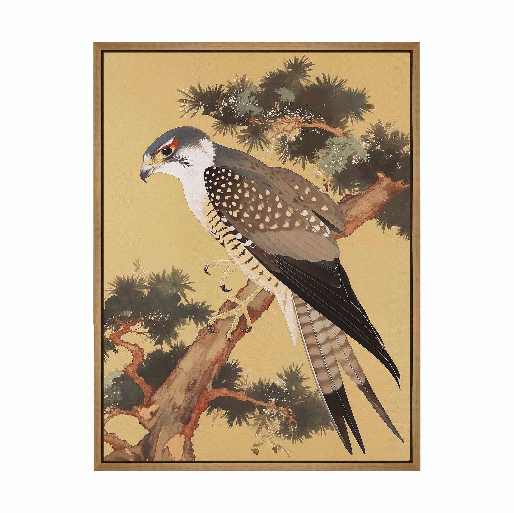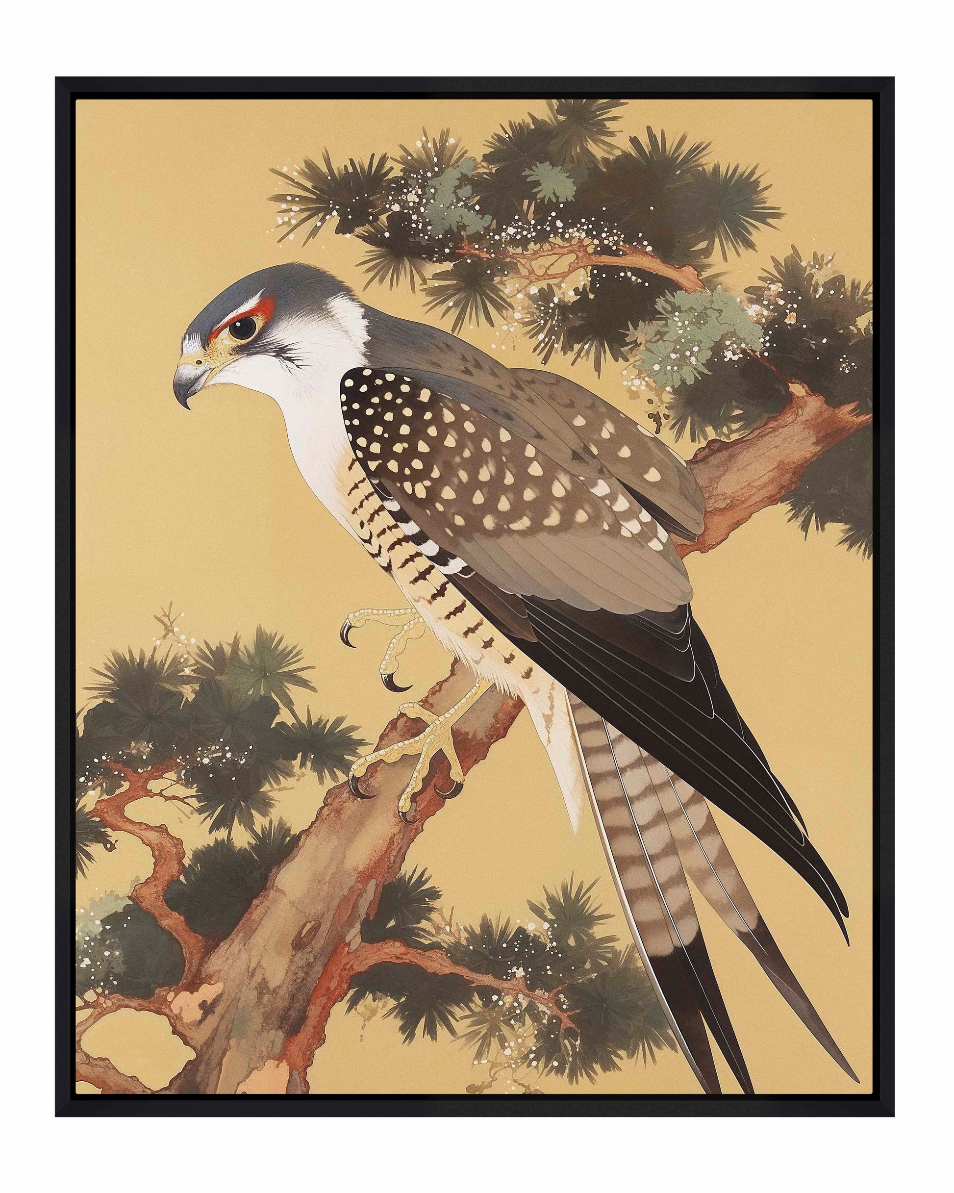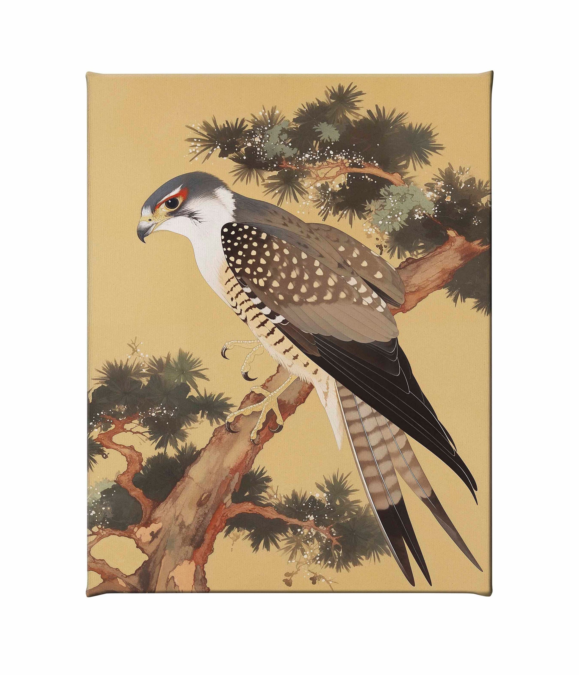 Graceful Sentinel - Falcon in Pine Grove is a striking piece from the Kyoto Summer Collection, capturing the elegant presence of a falcon perched in a serene pine grove. The falcon's poised stance and keen gaze convey a sense of vigilance and strength, embodying the majestic beauty of this raptor. The artist employs a refined color palette, using muted browns, grays, and whites for the falcon, which contrasts beautifully with the warm, golden backdrop and the intricate pine branches.