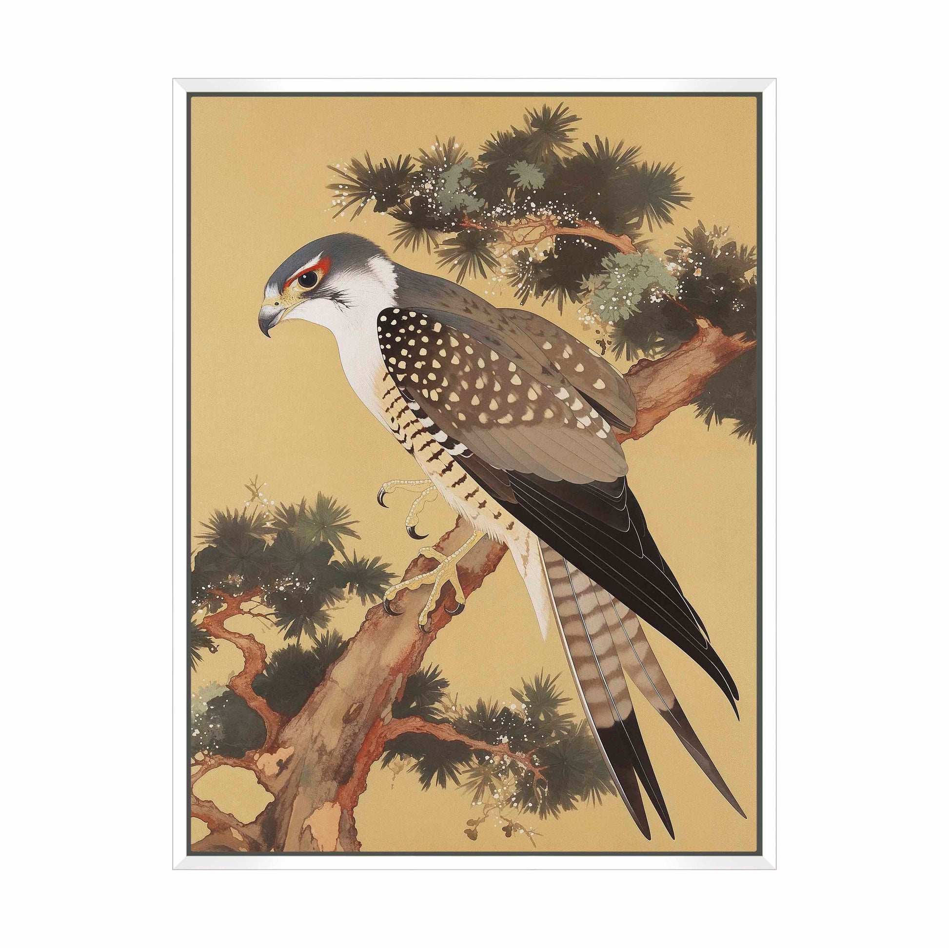 The delicate brushwork and meticulous attention to detail highlight the falcon's intricate feather patterns and the textured bark of the pine tree. The composition exudes a harmonious balance between the bird and its natural surroundings, evoking the tranquility and timeless beauty of Japanese art traditions.