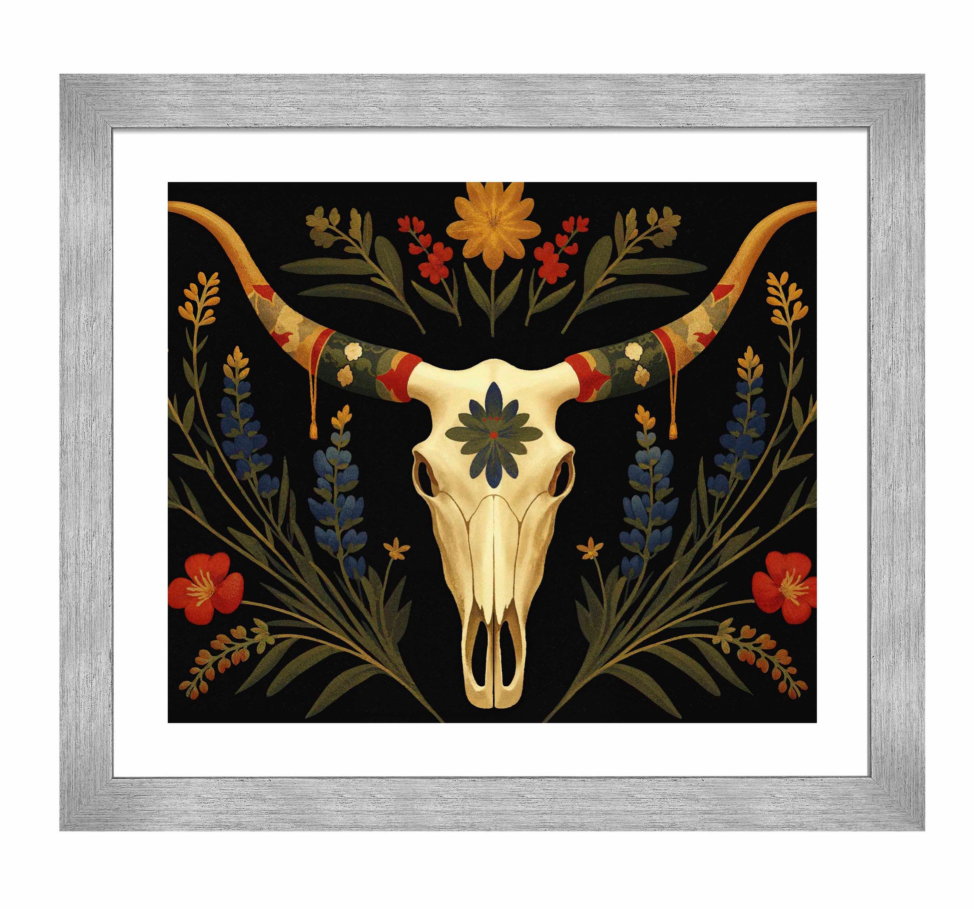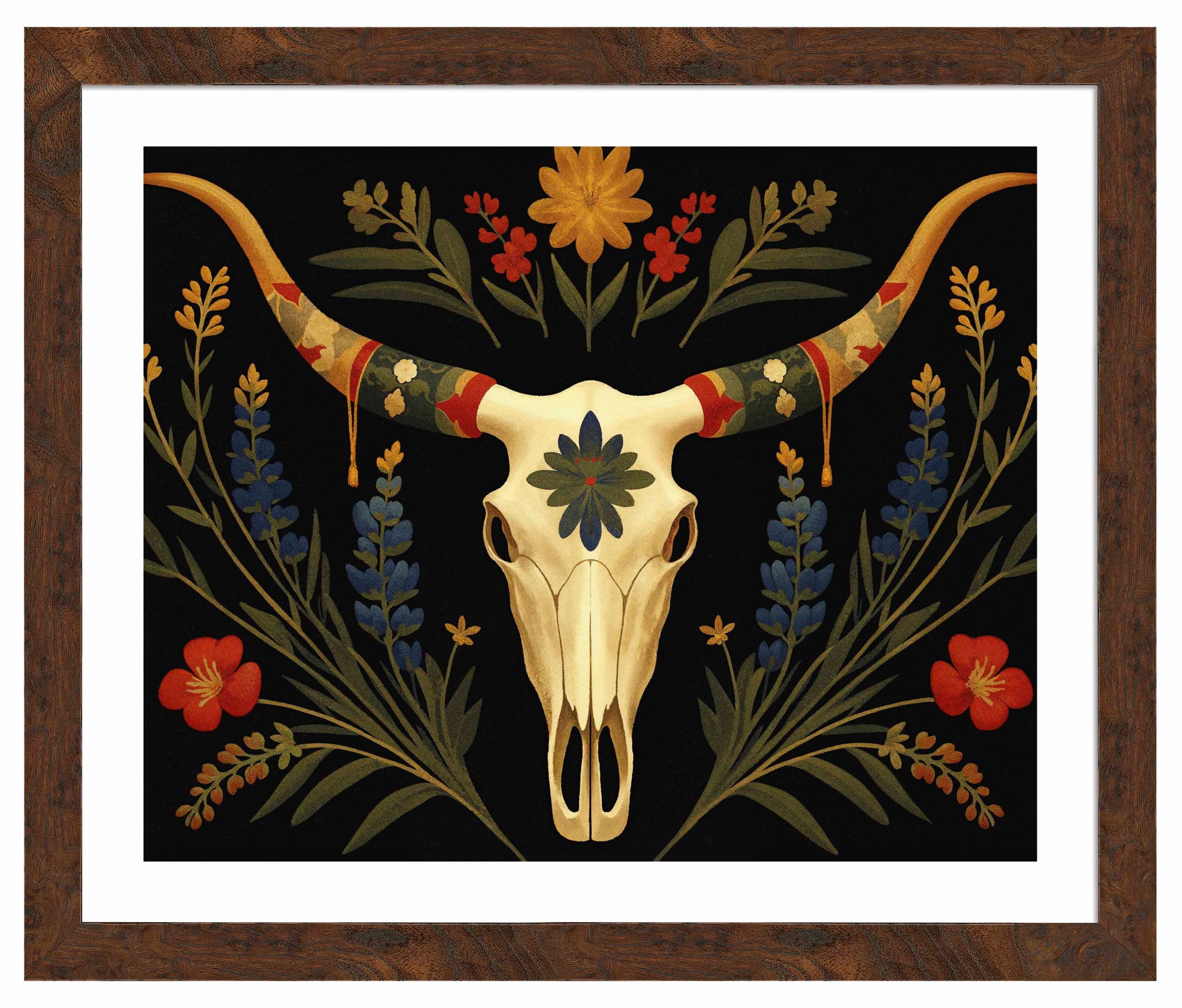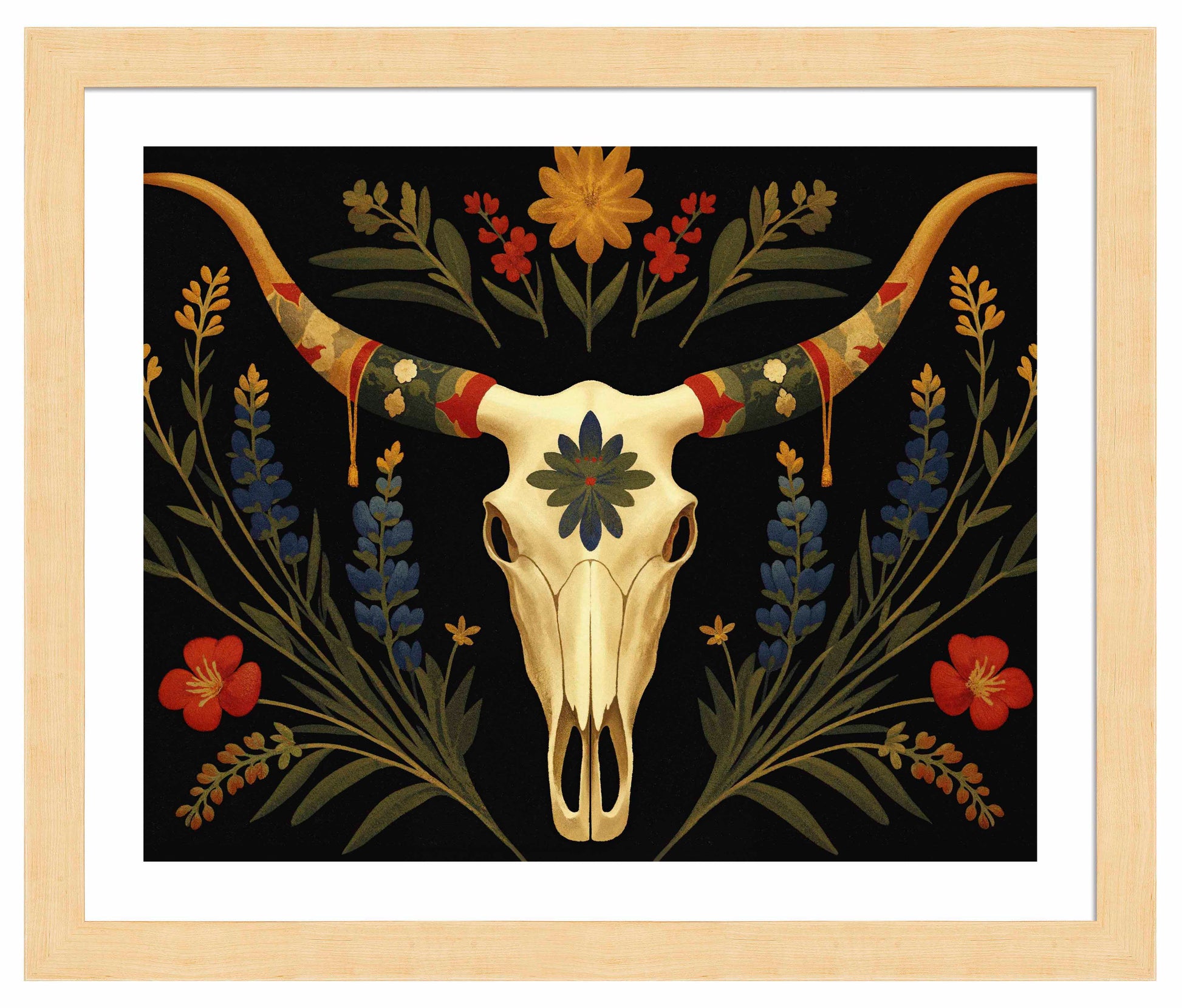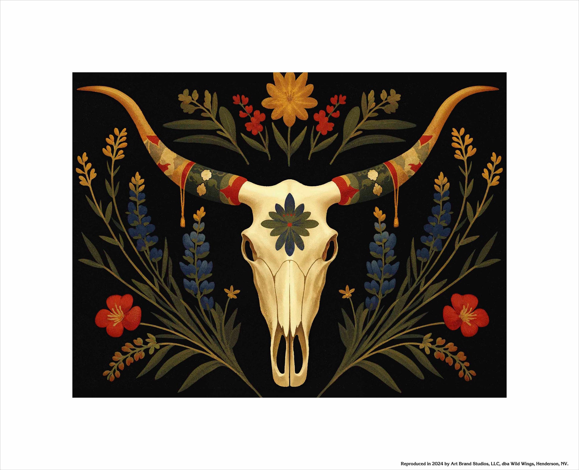 Surrounding the longhorn skull, vibrant bluebonnets and golden wildflowers bloom upward, weaving together with deep green leaves. Bright red flowers provide striking pops of color that contrast with the darker background, creating an almost spectral atmosphere that feels both serene and timeless. The skull itself, adorned with a central blue-green floral motif, speaks to the enduring beauty found in the intersection of life and death in the natural world.