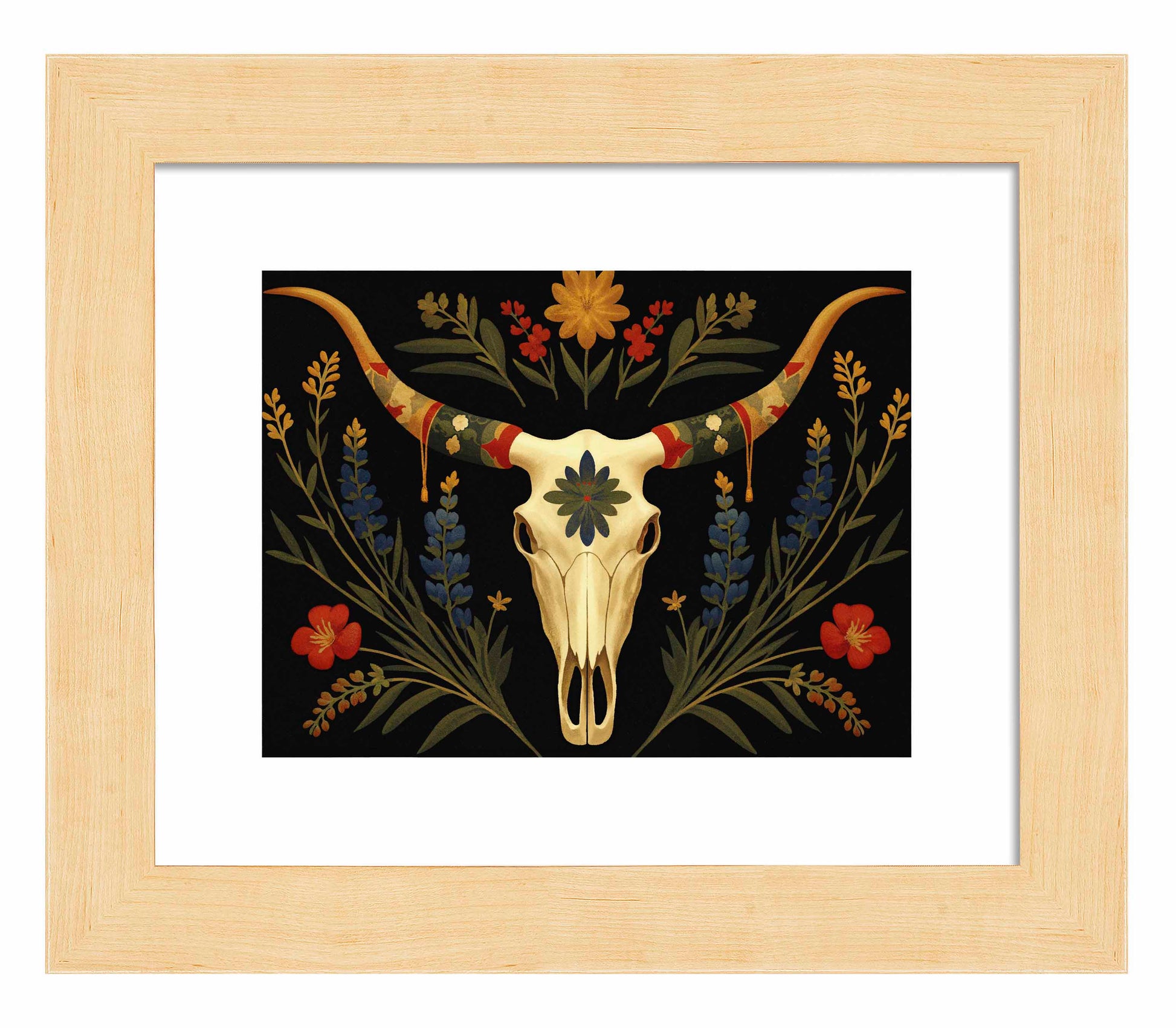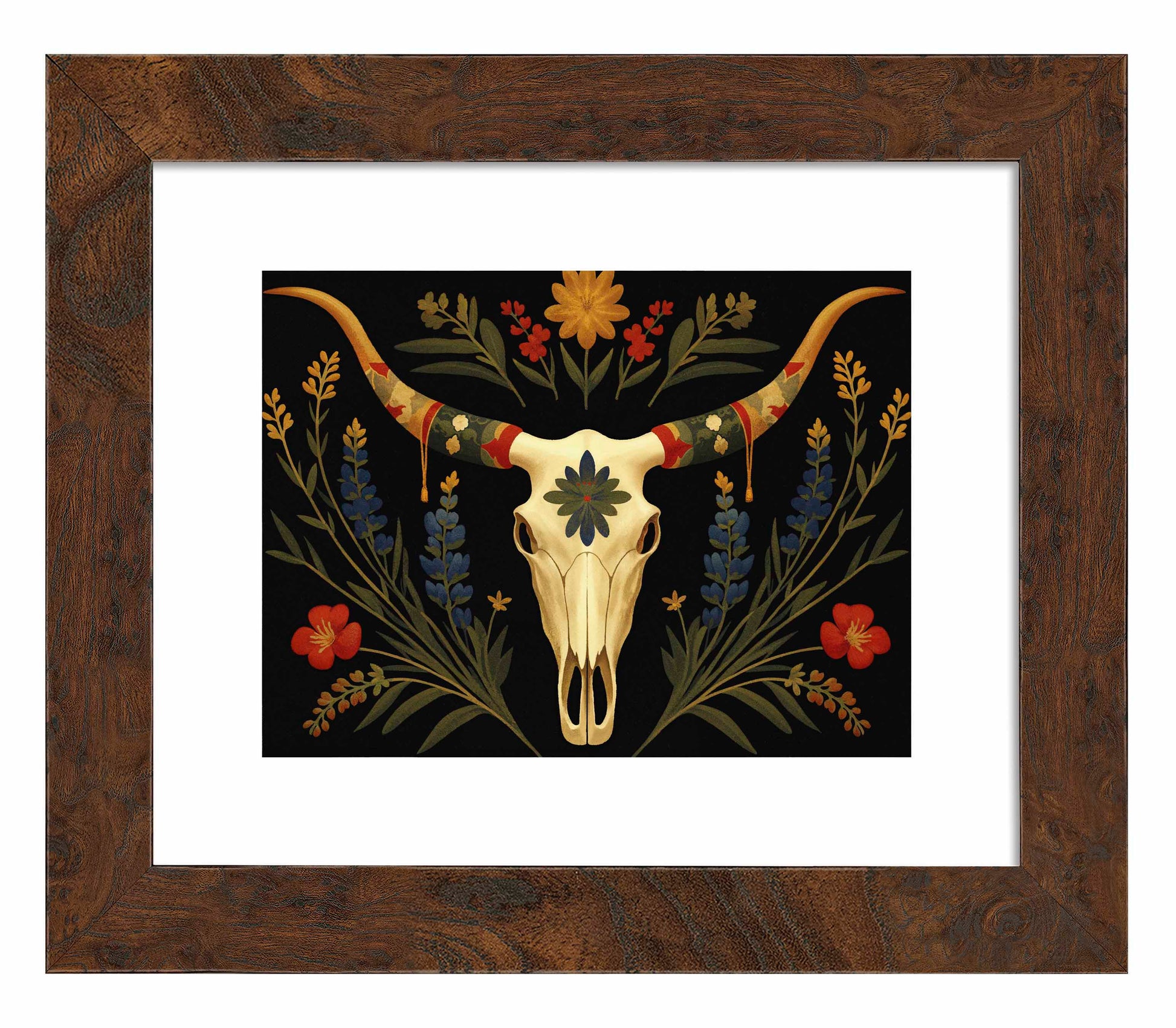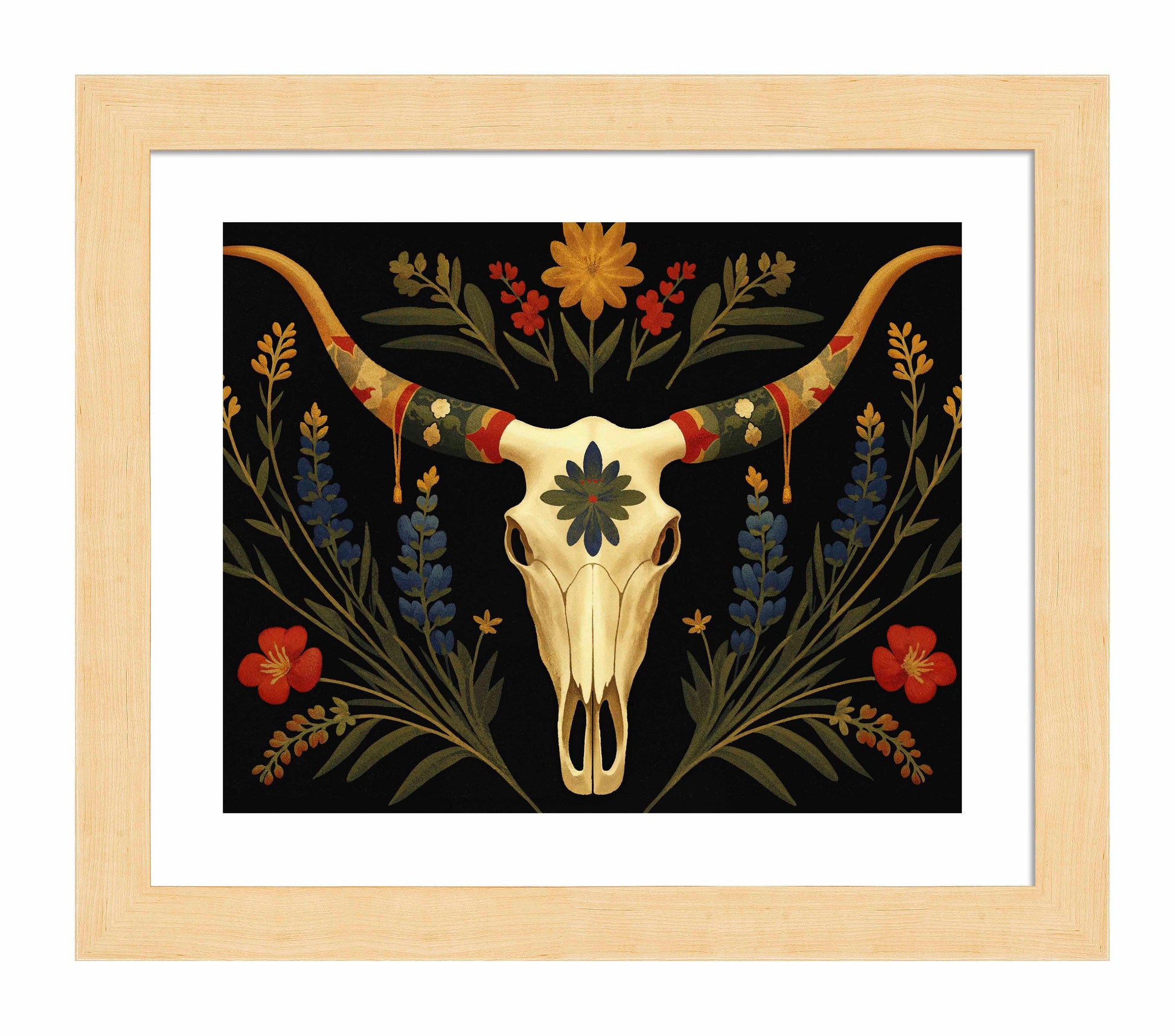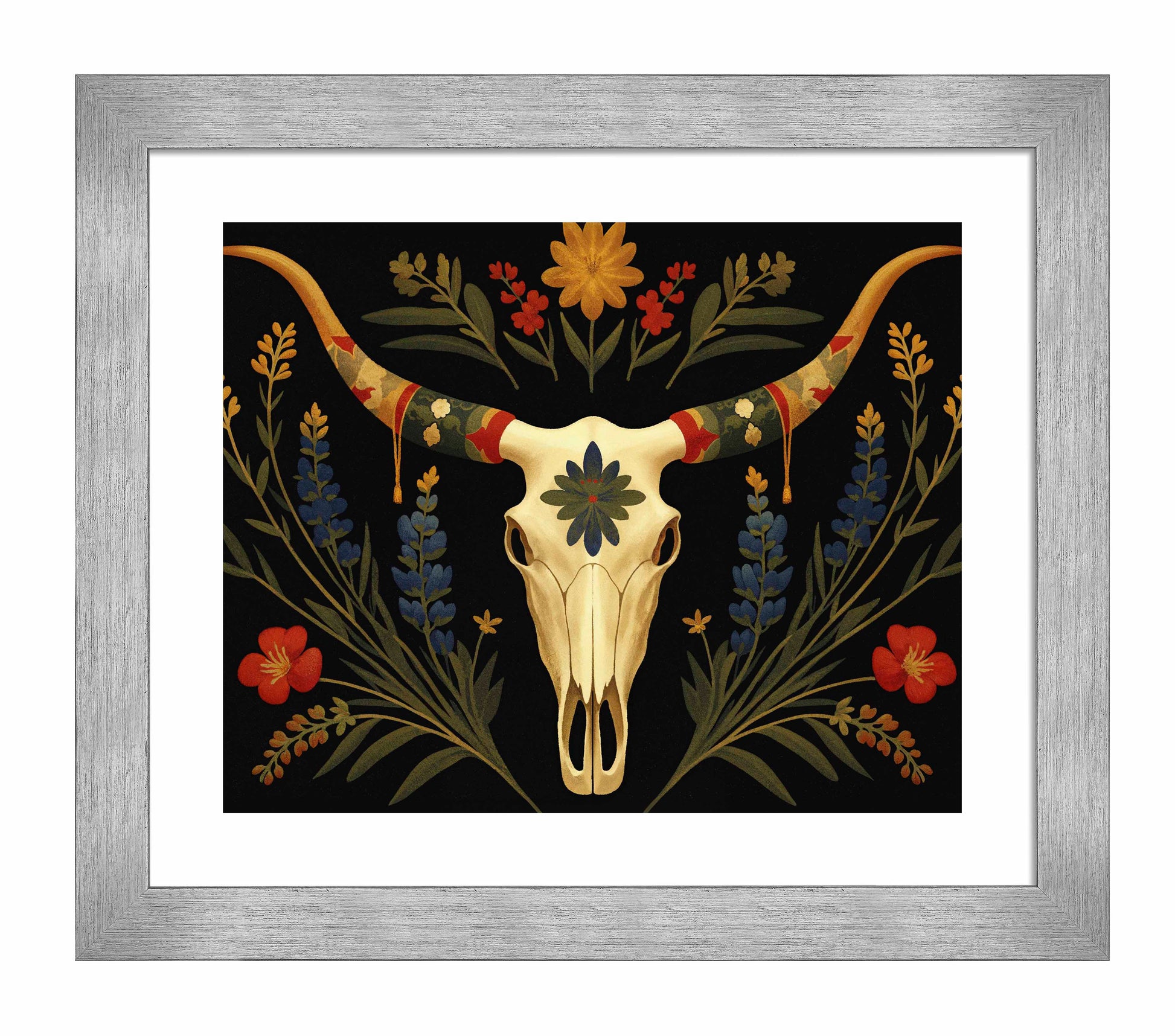 Surrounding the longhorn skull, vibrant bluebonnets and golden wildflowers bloom upward, weaving together with deep green leaves. Bright red flowers provide striking pops of color that contrast with the darker background, creating an almost spectral atmosphere that feels both serene and timeless. The skull itself, adorned with a central blue-green floral motif, speaks to the enduring beauty found in the intersection of life and death in the natural world.
