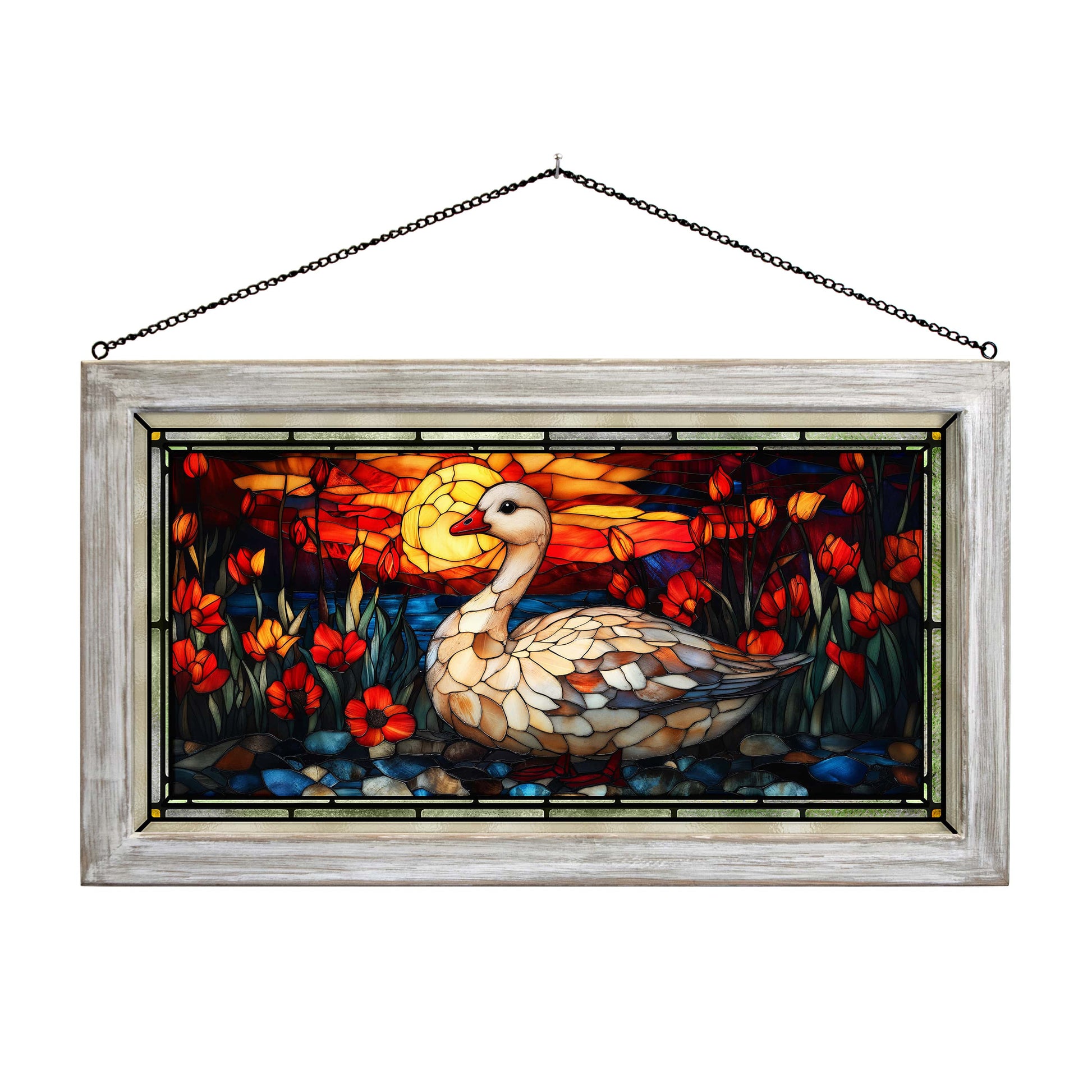 Let the light shine! Stained glass art hangings show their true colors when back-lit with natural sunlight. Popular designs are printed with fade resistant inks on 11" x 21" glass, framed with 1" black-finished moulding. Framed size 13" x 23". Ready to hang with provided chain. Designed, printed, and assembled in North America.