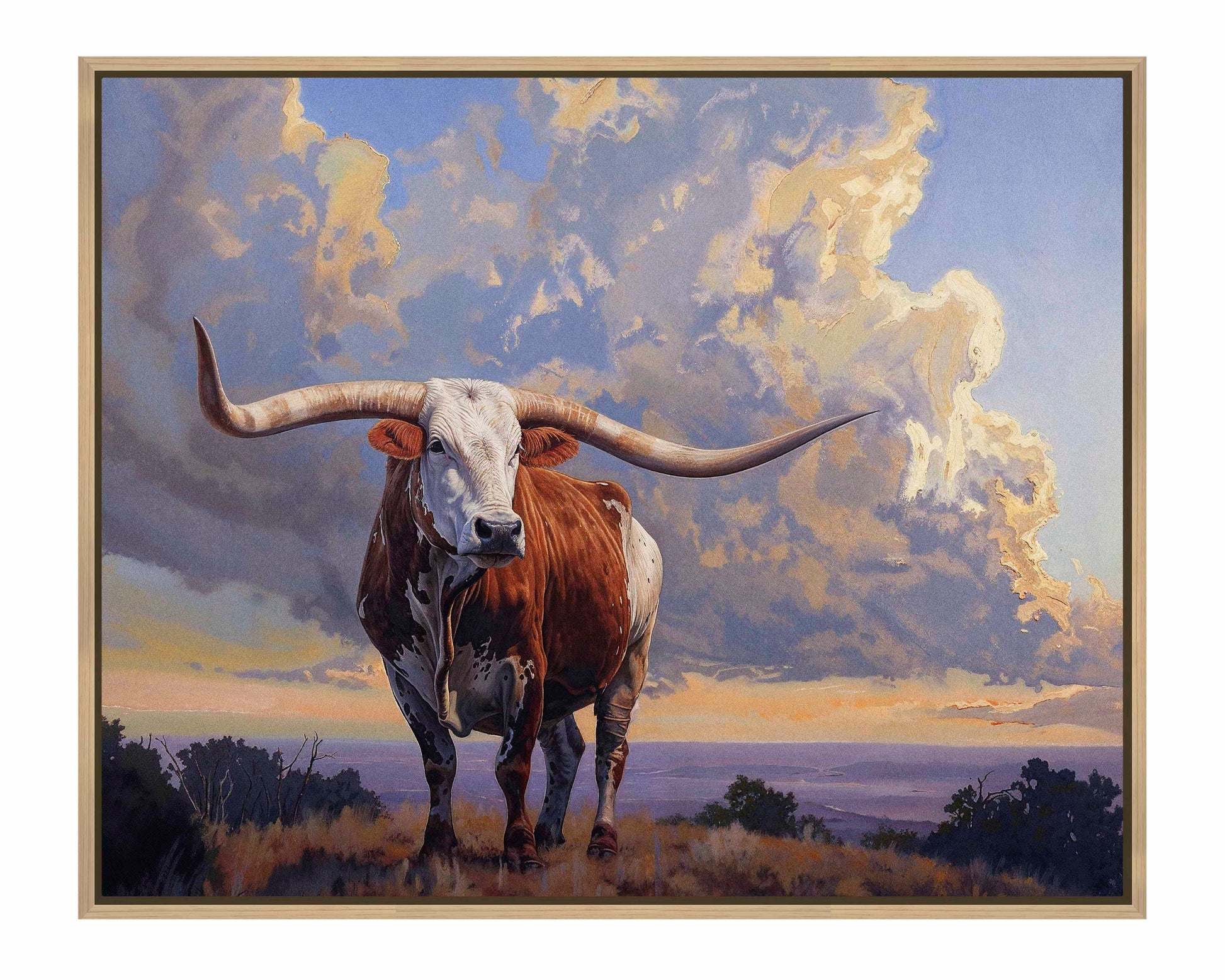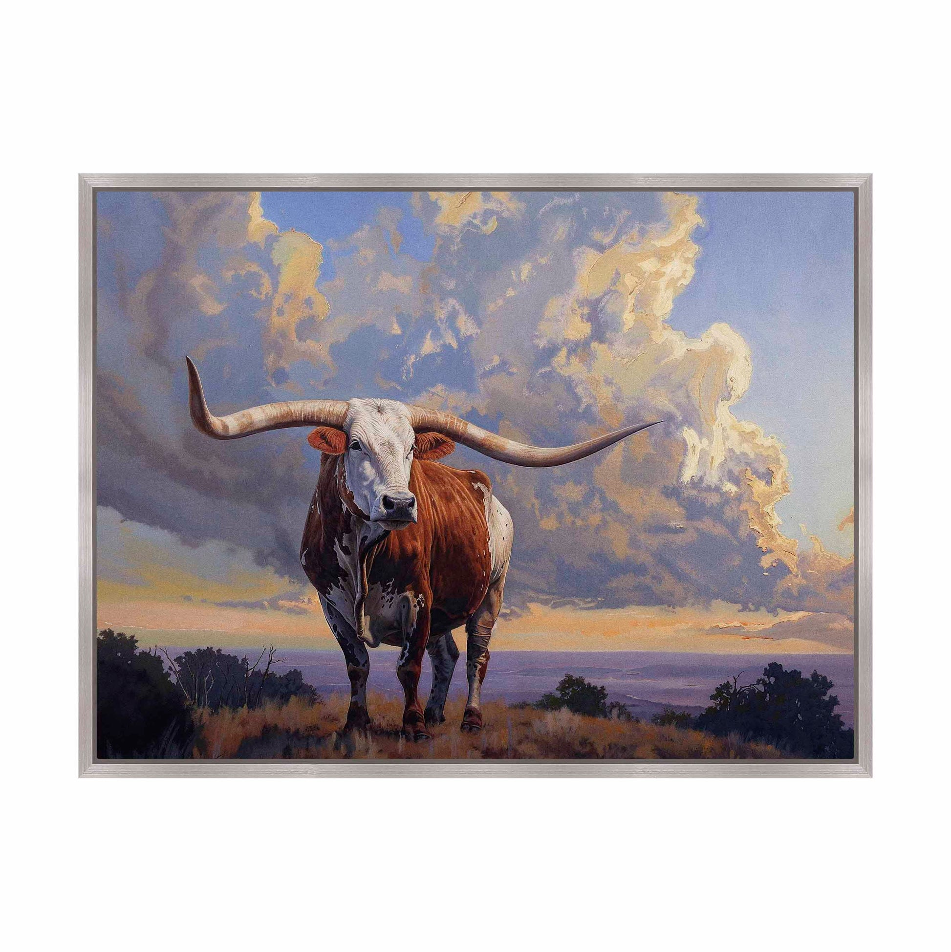 "Hill Country Monarch I" captures the majestic presence of a longhorn, a symbol of Texas heritage, standing proudly against the backdrop of a dramatic sunset. The expansive sky, with its vibrant clouds, enhances the sense of grandeur, while the rugged landscape reflects the enduring spirit of the Hill Country. This piece celebrates both the natural beauty and cultural significance of the region.