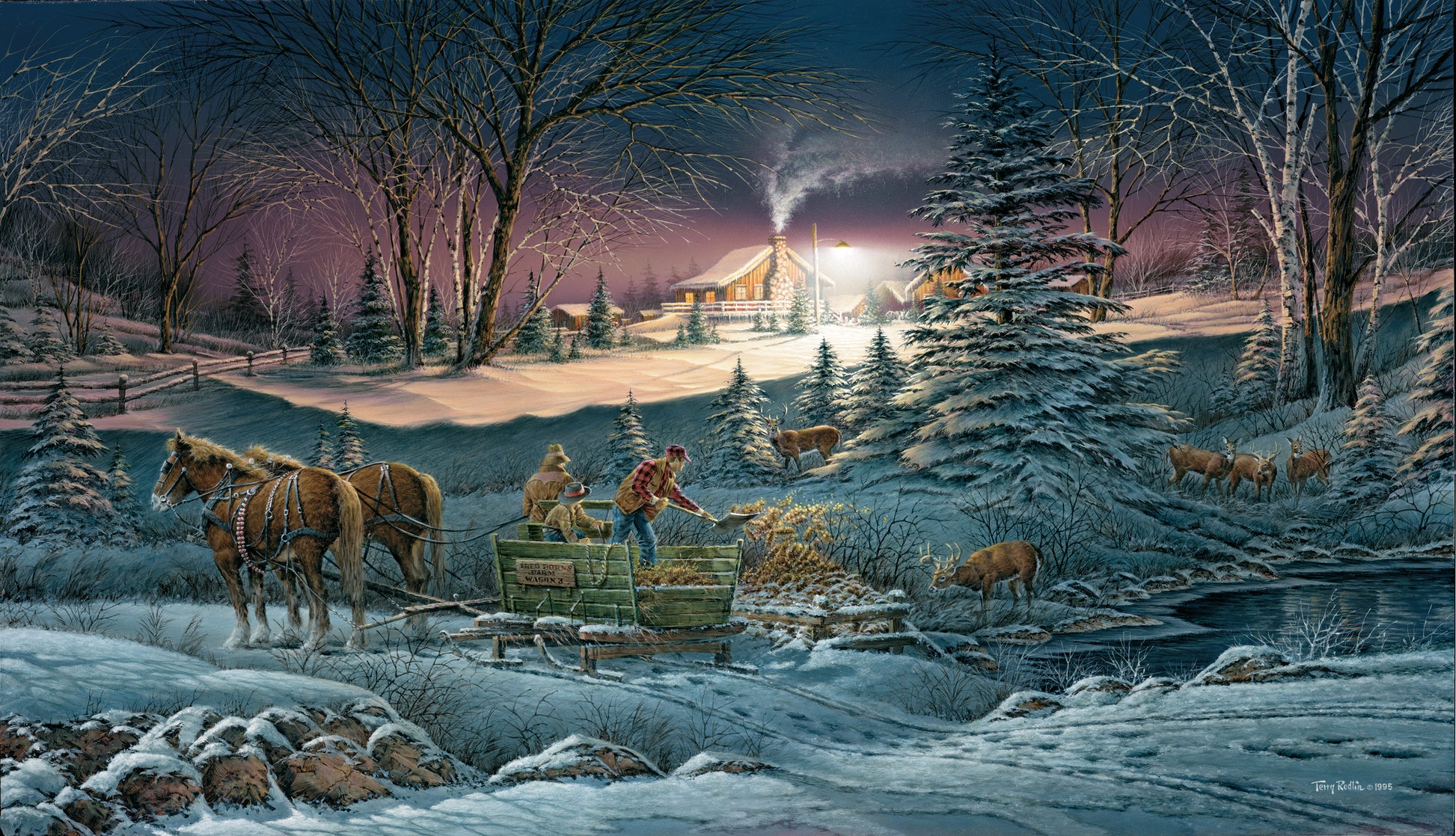 The artist often witnessed this scene on his great-grandfather's farm. Deep snow has covered most of the available browse and the deer are hungry. Local farmers have constructed a bin down by the creek and are filling it with corn. These farmers never looked for, or expected, publicity or compliments. They simply went out and lent a helping hand to their wildlife neighbors.