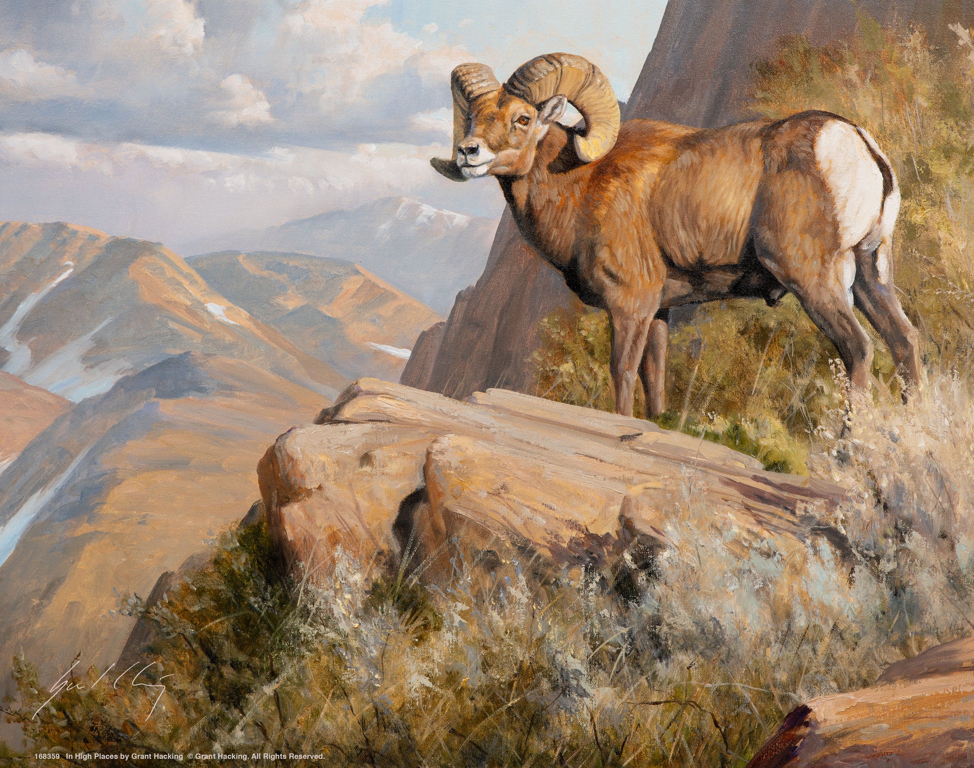 This painting is all about composition. I had a great photo of a bighorn sheep, and I had some photos of landscape that I liked. The design of this piece has a vertical angle that runs from top left to bottom right dividing the canvas in two sections, one focusing on the landscape and one focusing on the animal. I was careful to put the sheep’s head in the landscape section to join the two scenes together. I also want the viewer to look up at the sheep while at the same time looking down into the valley. The foreground has all this sage bush and scrub that is important to anchor the sheep, but I did not want it to draw the viewers eye from the sheep, so I used a lot of pallet knife work.