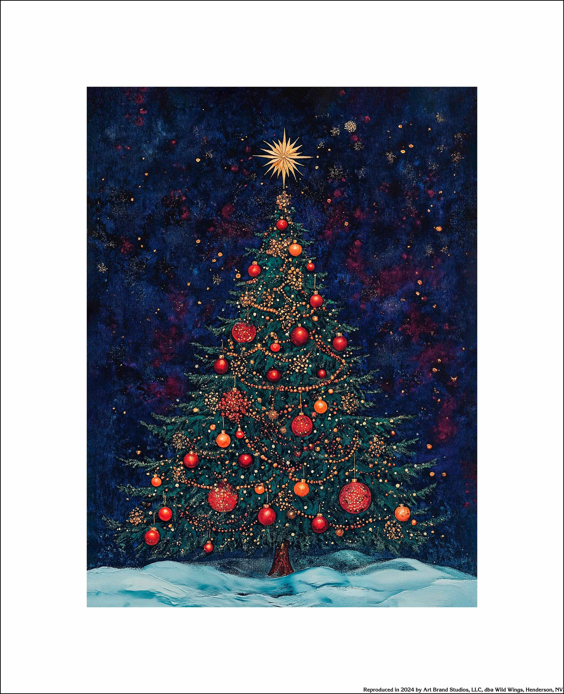 "Homestead Christmas Spruce" captures the essence of holiday magic and nostalgia in a beautifully rendered Christmas tree scene. The artwork centers on a majestic evergreen, its branches laden with a dazzling array of ornaments and lights. The tree stands proud against a deep, midnight blue background that evokes a clear winter's night, dotted with twinkling stars and subtle hints of purple nebulae, suggesting a vast, cosmic expanse.