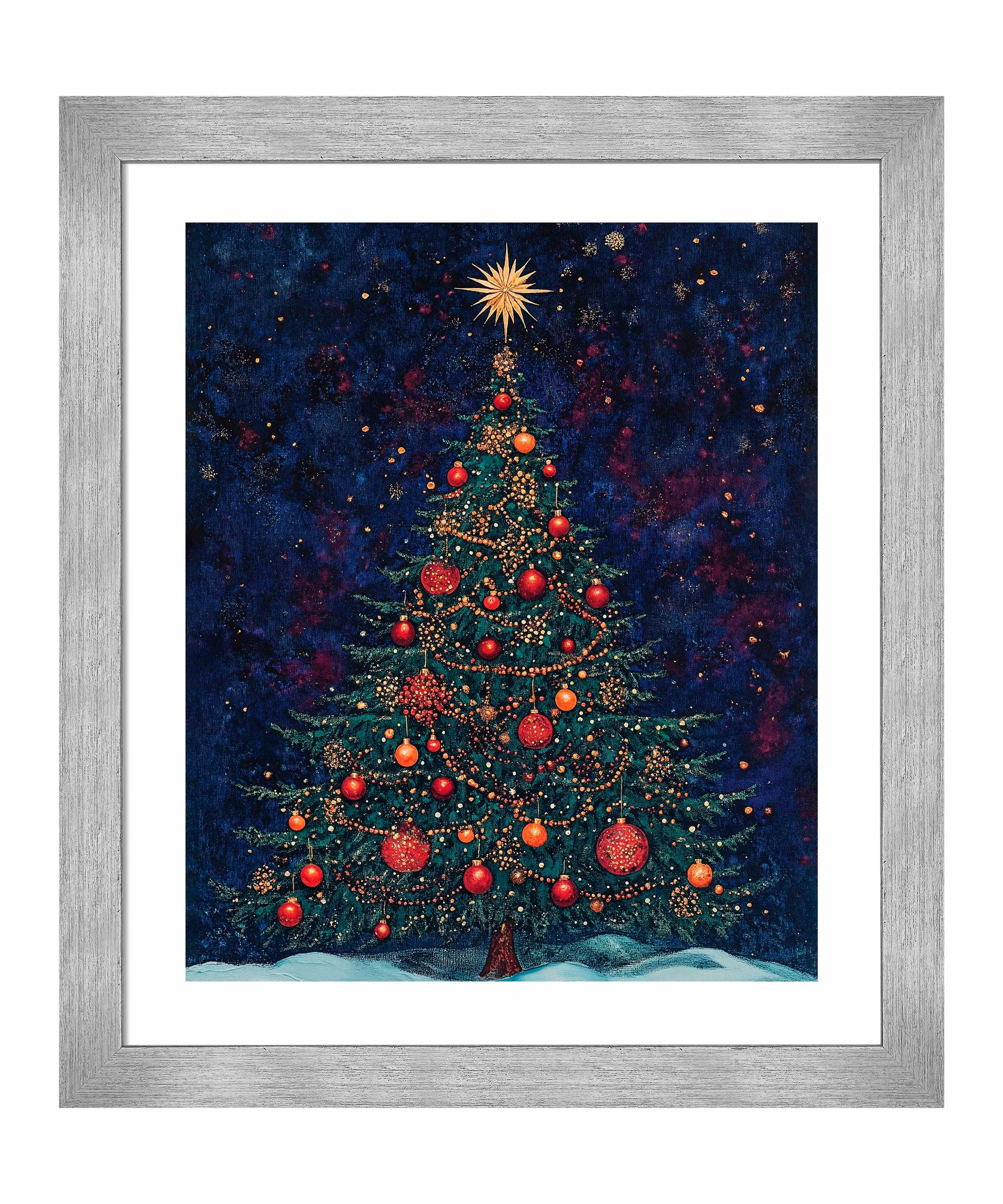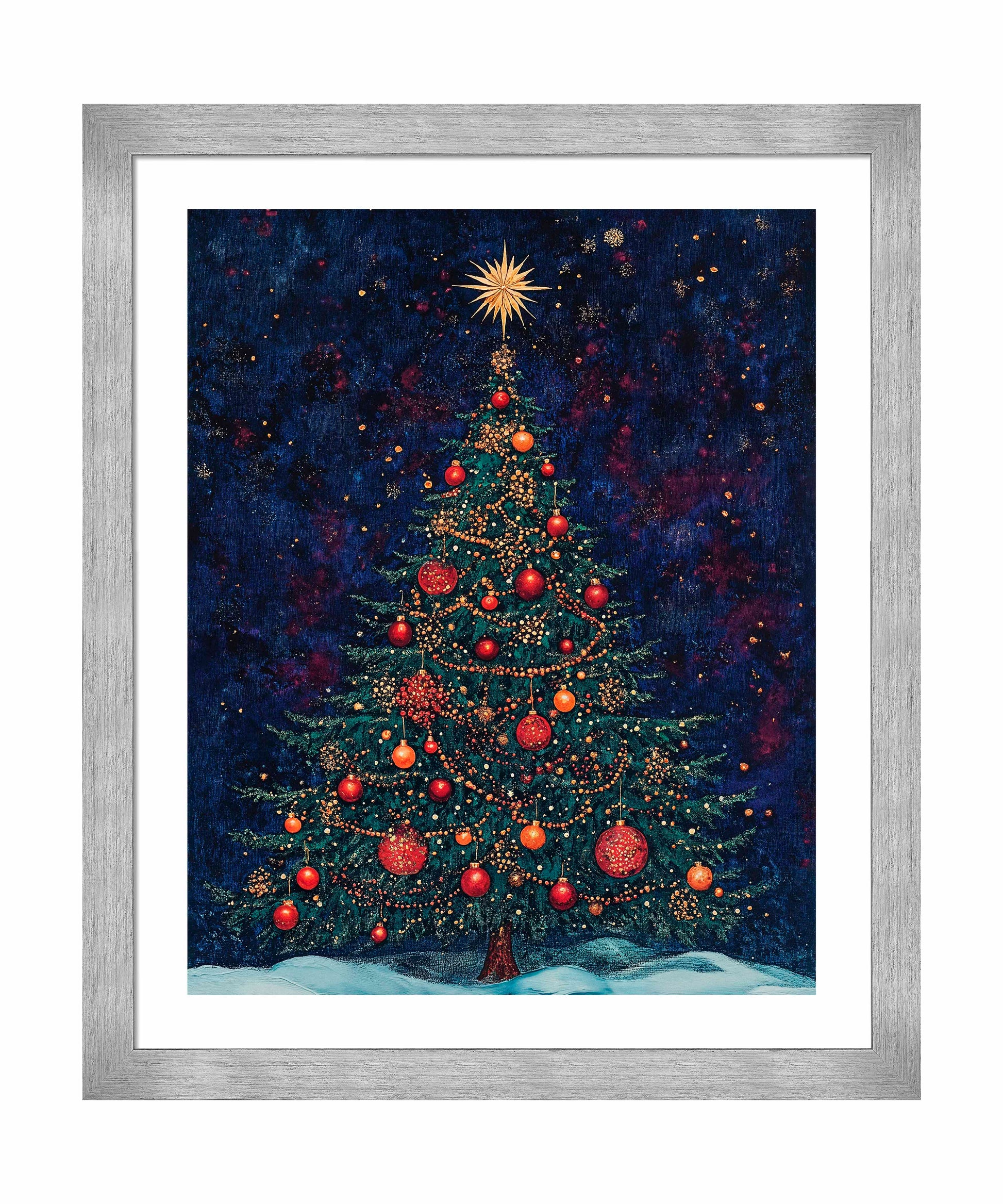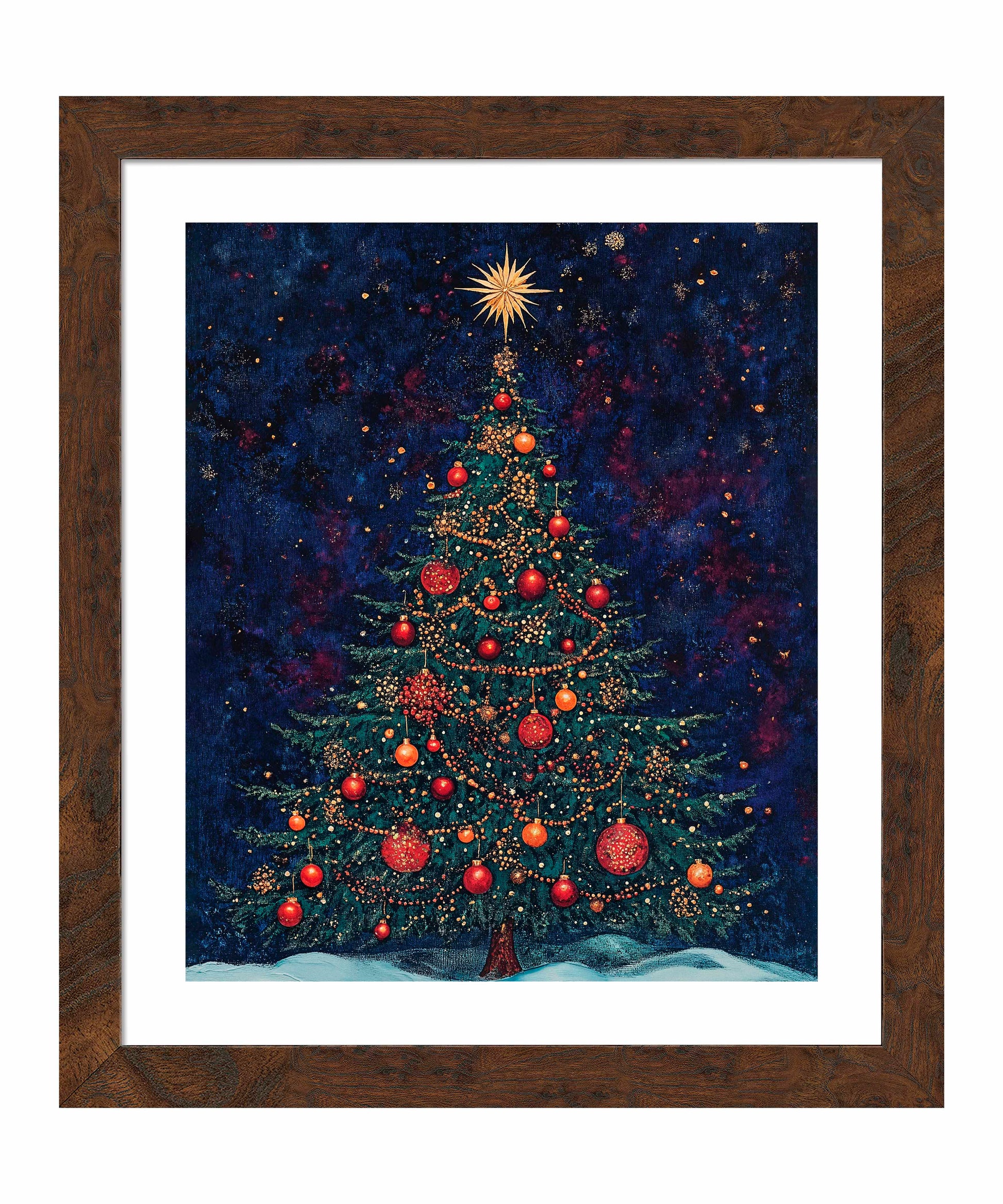 Atop the tree, a brilliant golden star bursts with radiant light, symbolizing the Star of Bethlehem and serving as the crowning glory of this festive display. At the base, a gentle blanket of snow suggests a serene winter setting, grounding the cosmic feel of the background in earthly comfort.