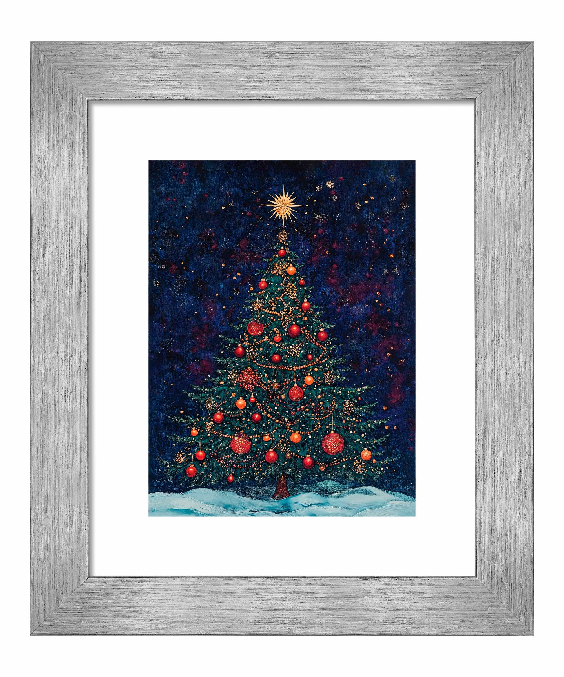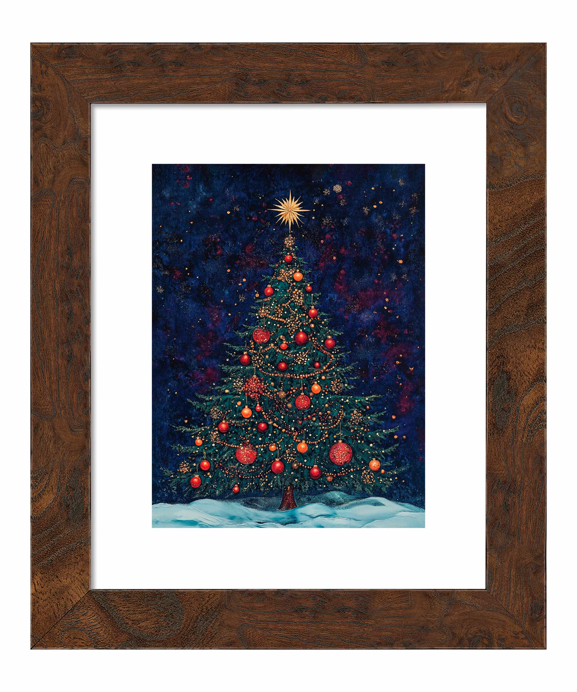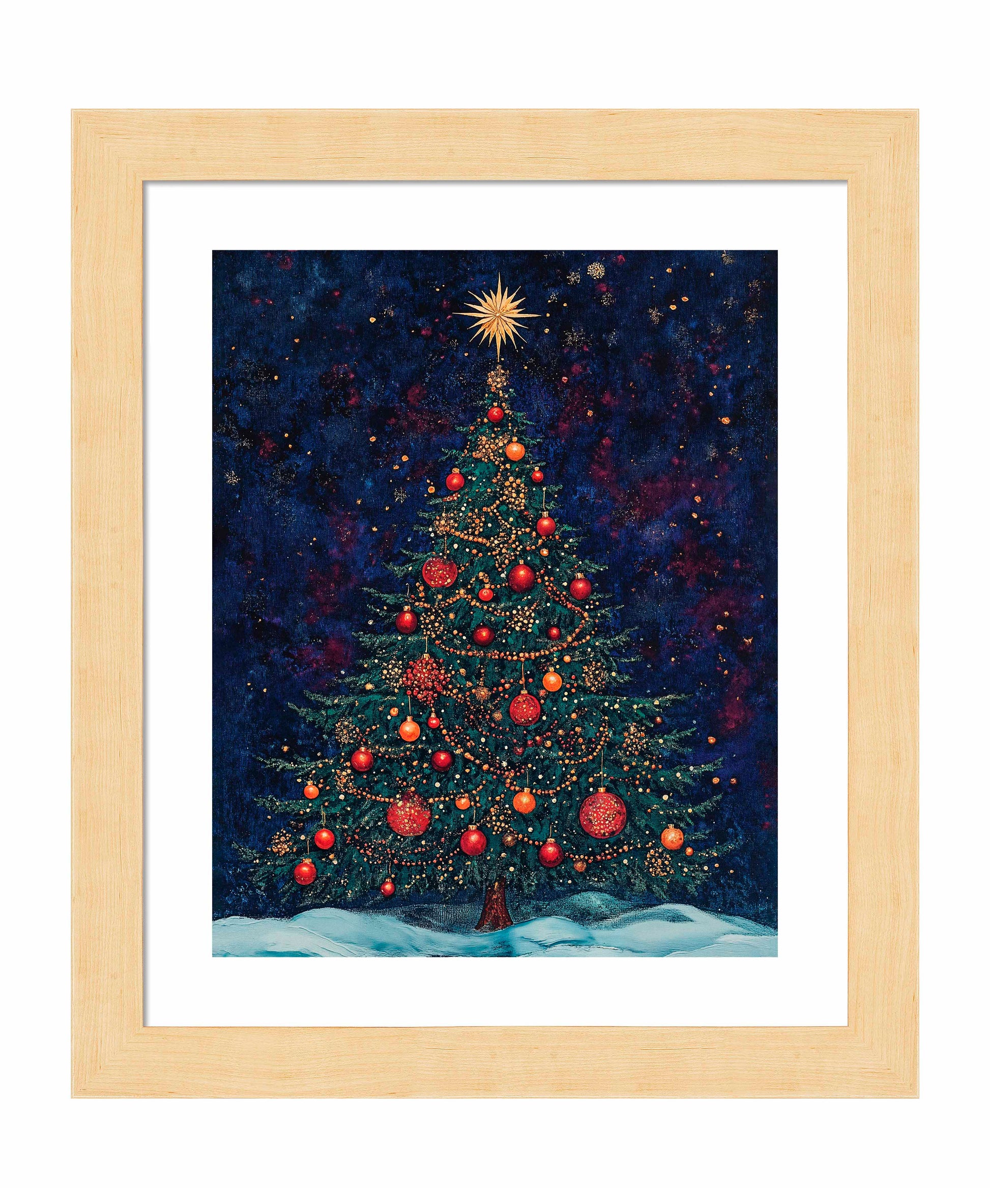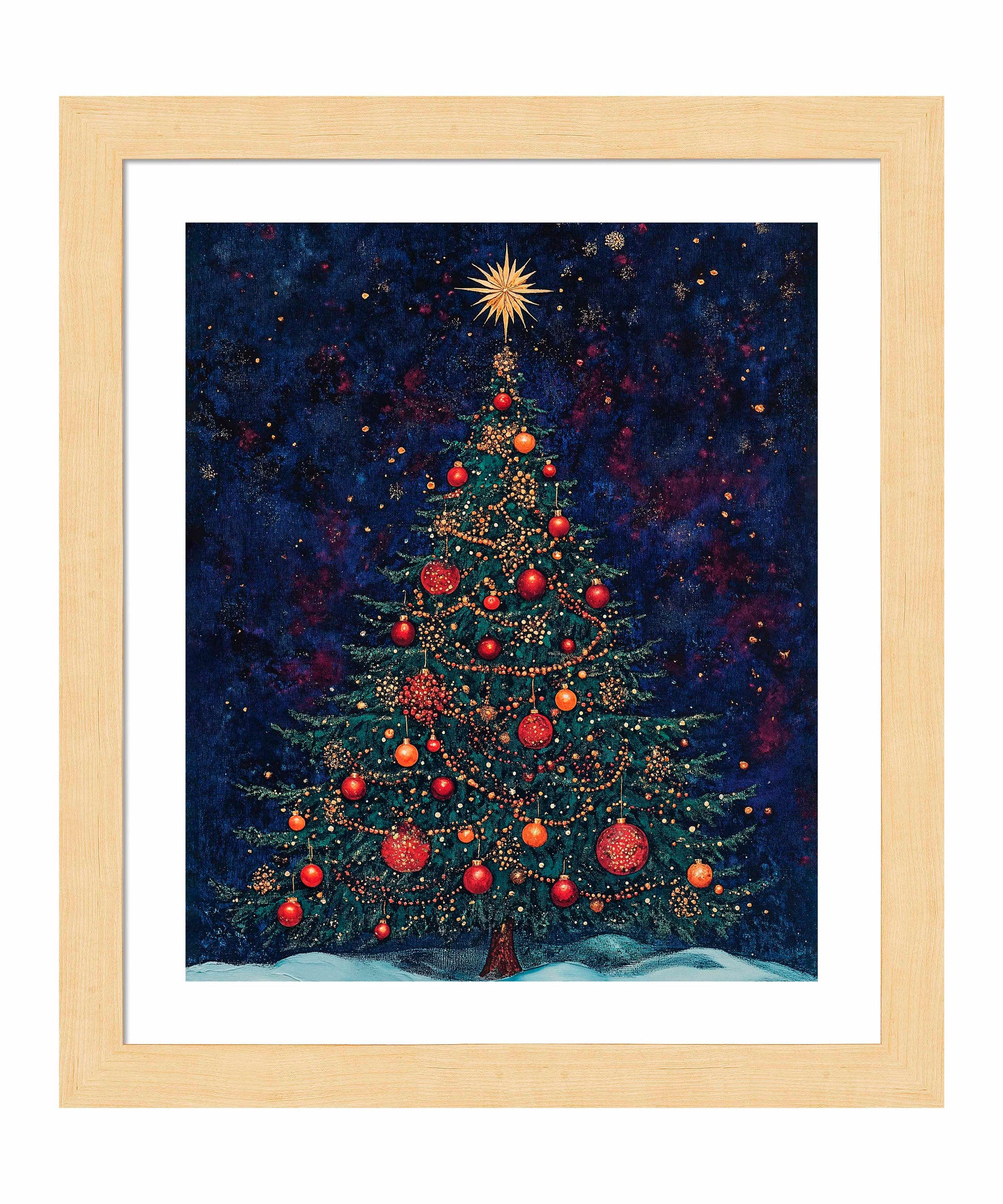 Atop the tree, a brilliant golden star bursts with radiant light, symbolizing the Star of Bethlehem and serving as the crowning glory of this festive display. At the base, a gentle blanket of snow suggests a serene winter setting, grounding the cosmic feel of the background in earthly comfort.