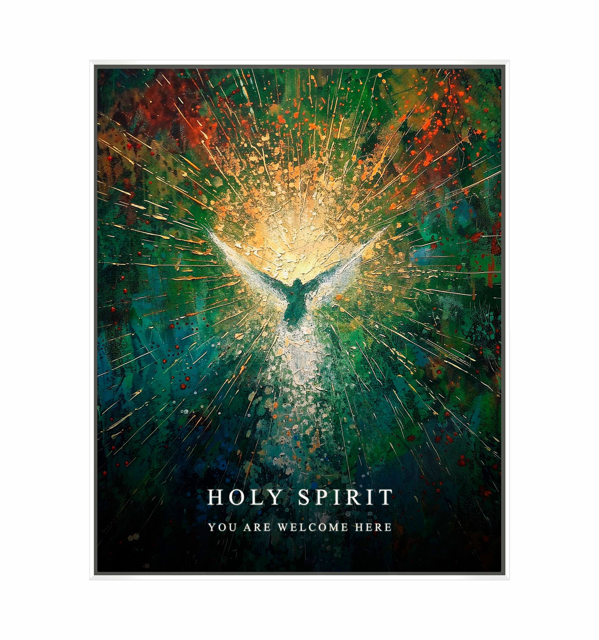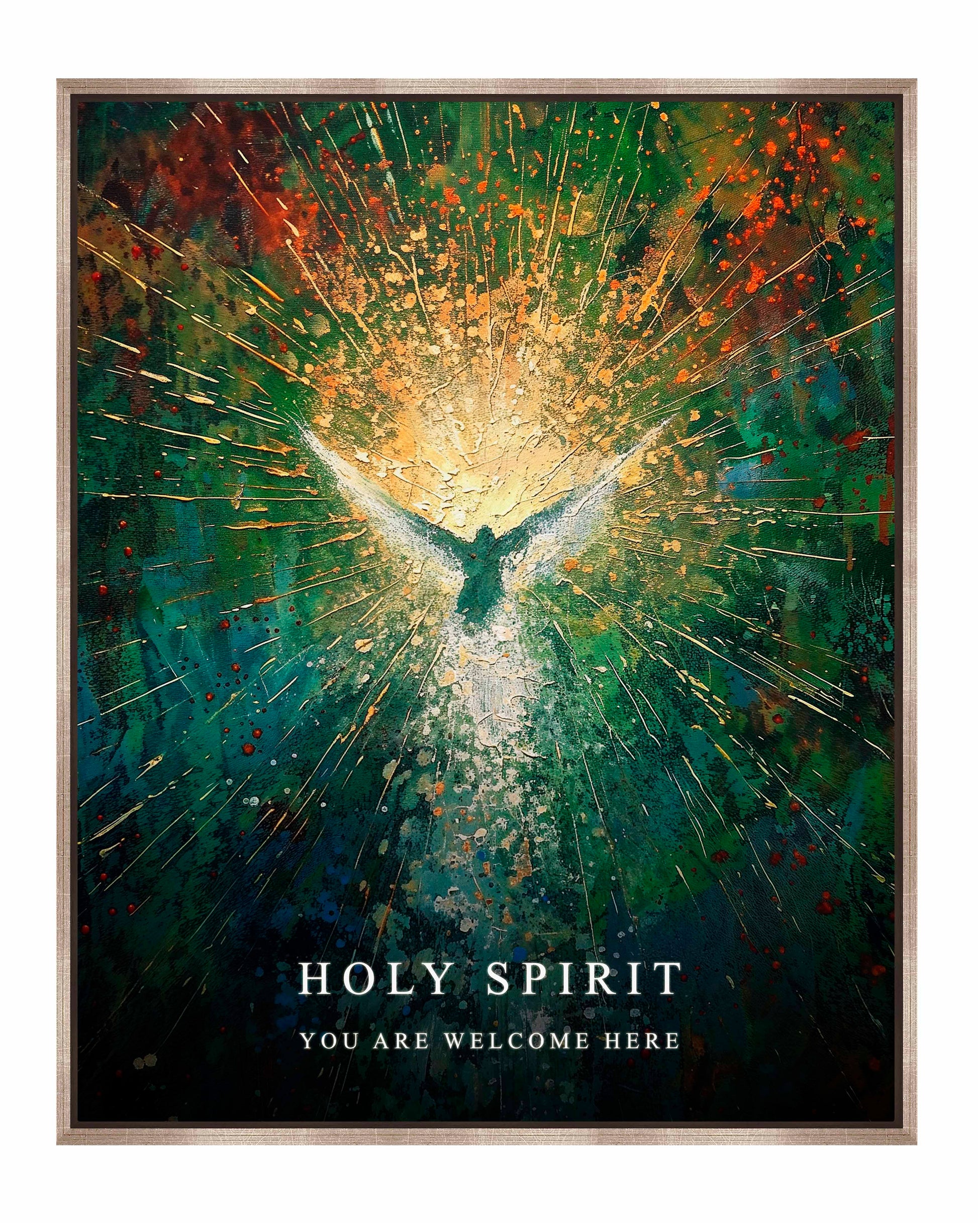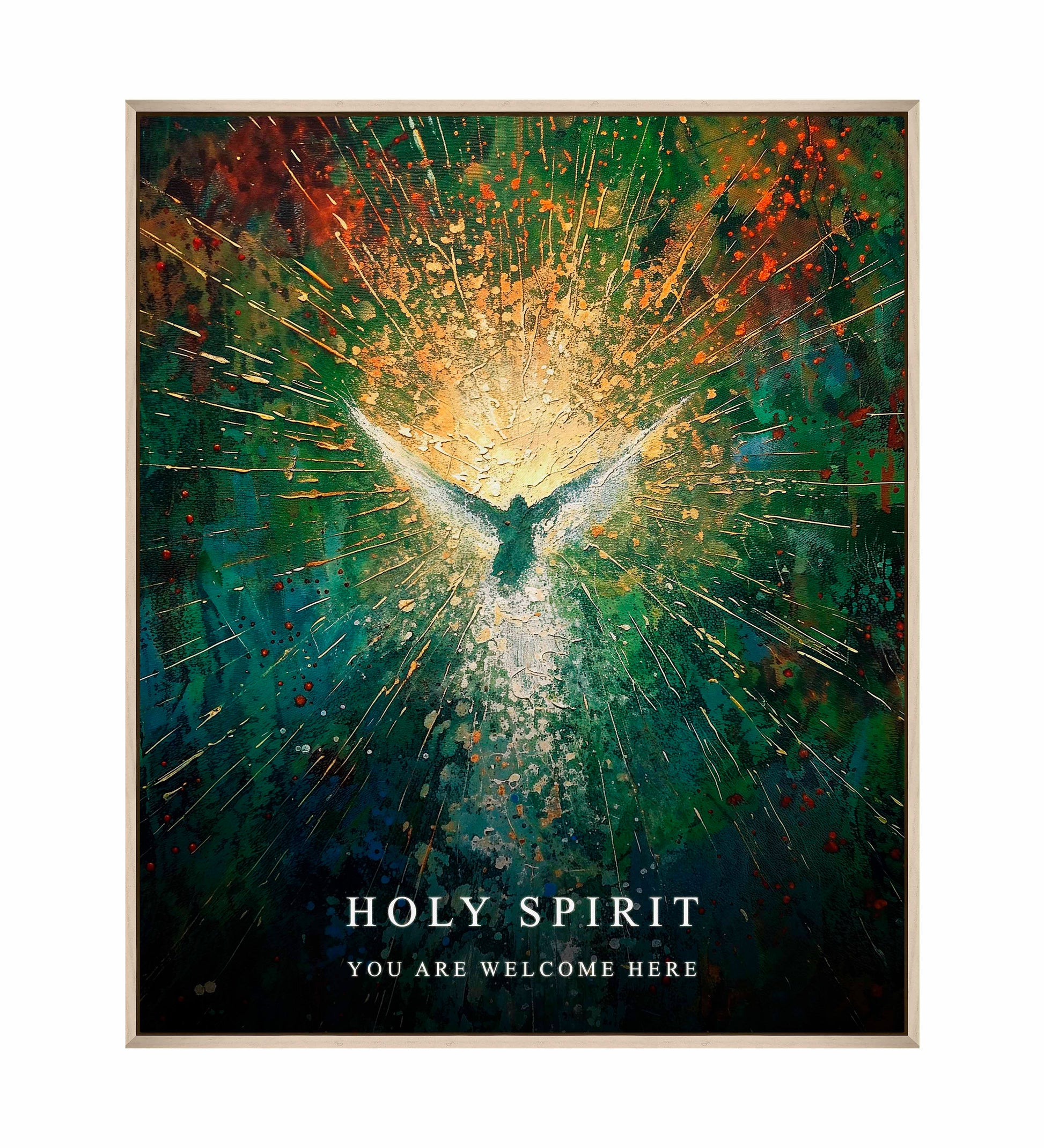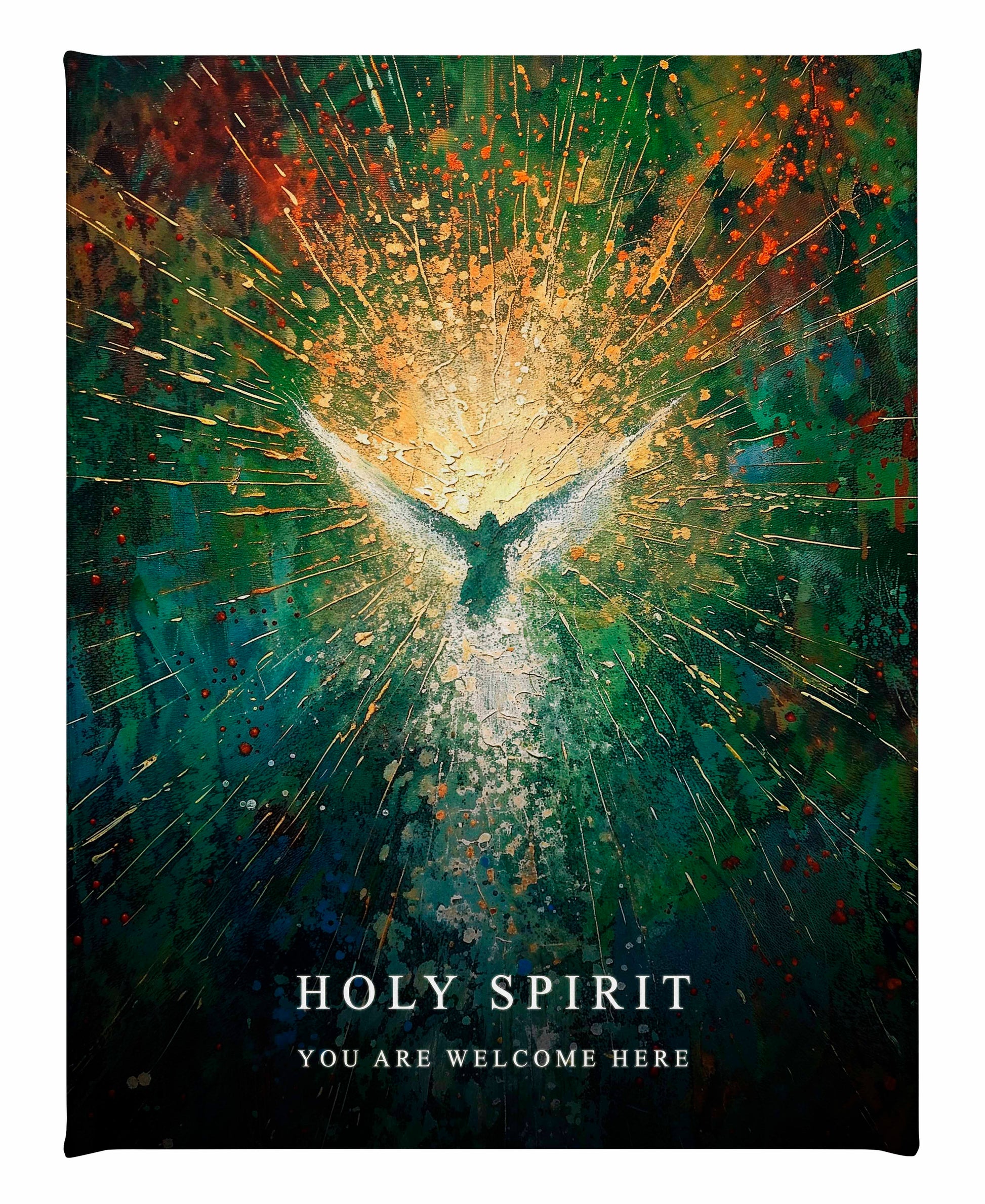 Holy Spirit is a dynamic painting that depicts the spiritual essence of the Holy Spirit through a glowing dove, a traditional symbol of divine presence in Christian art. The artwork features expressive brushstrokes that radiate outward, giving a sense of energy and movement. The dove, surrounded by golden light, contrasts with a background of deep greens and blues, symbolizing the interplay between the divine and earthly realms. The inscription, "HOLY SPIRIT - YOU ARE WELCOME HERE," emphasizes openness to spiritual connection and the transformative power of divine presence.