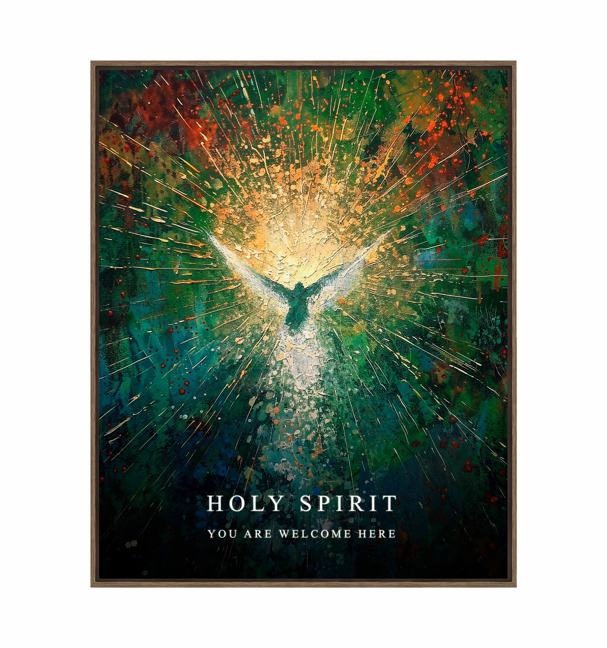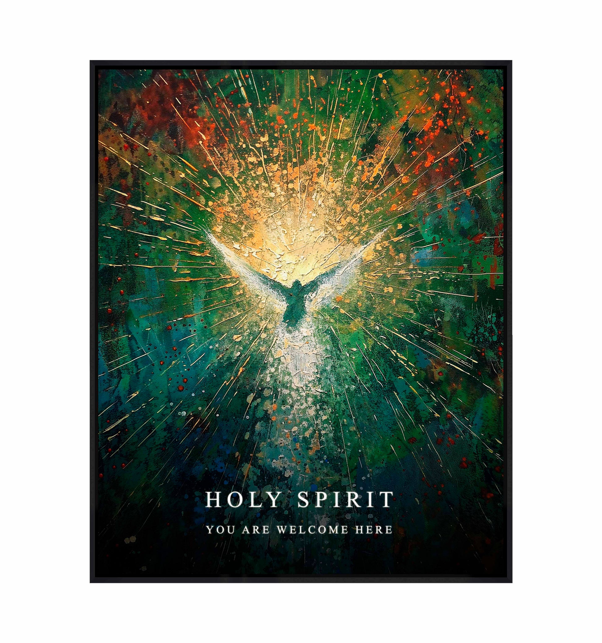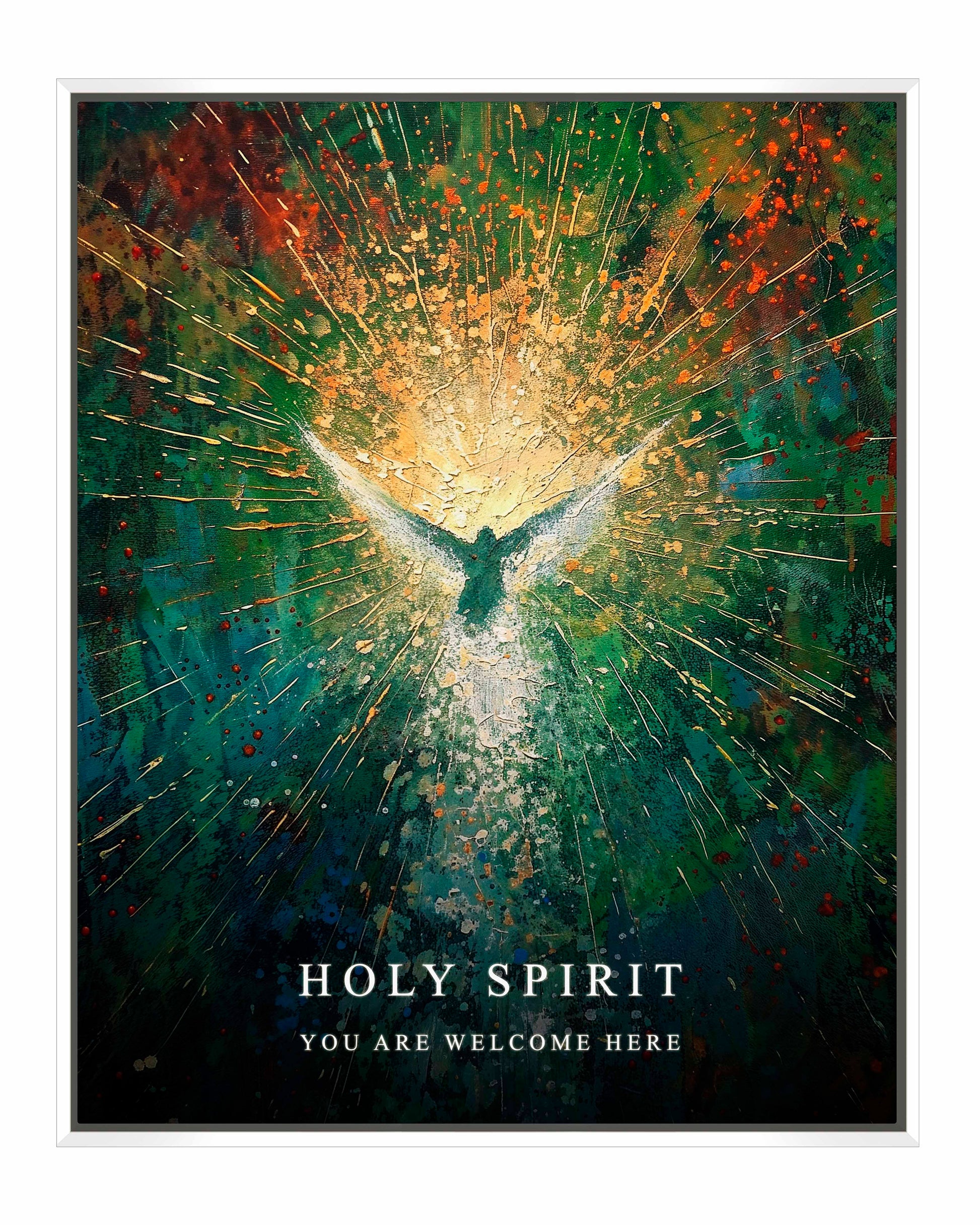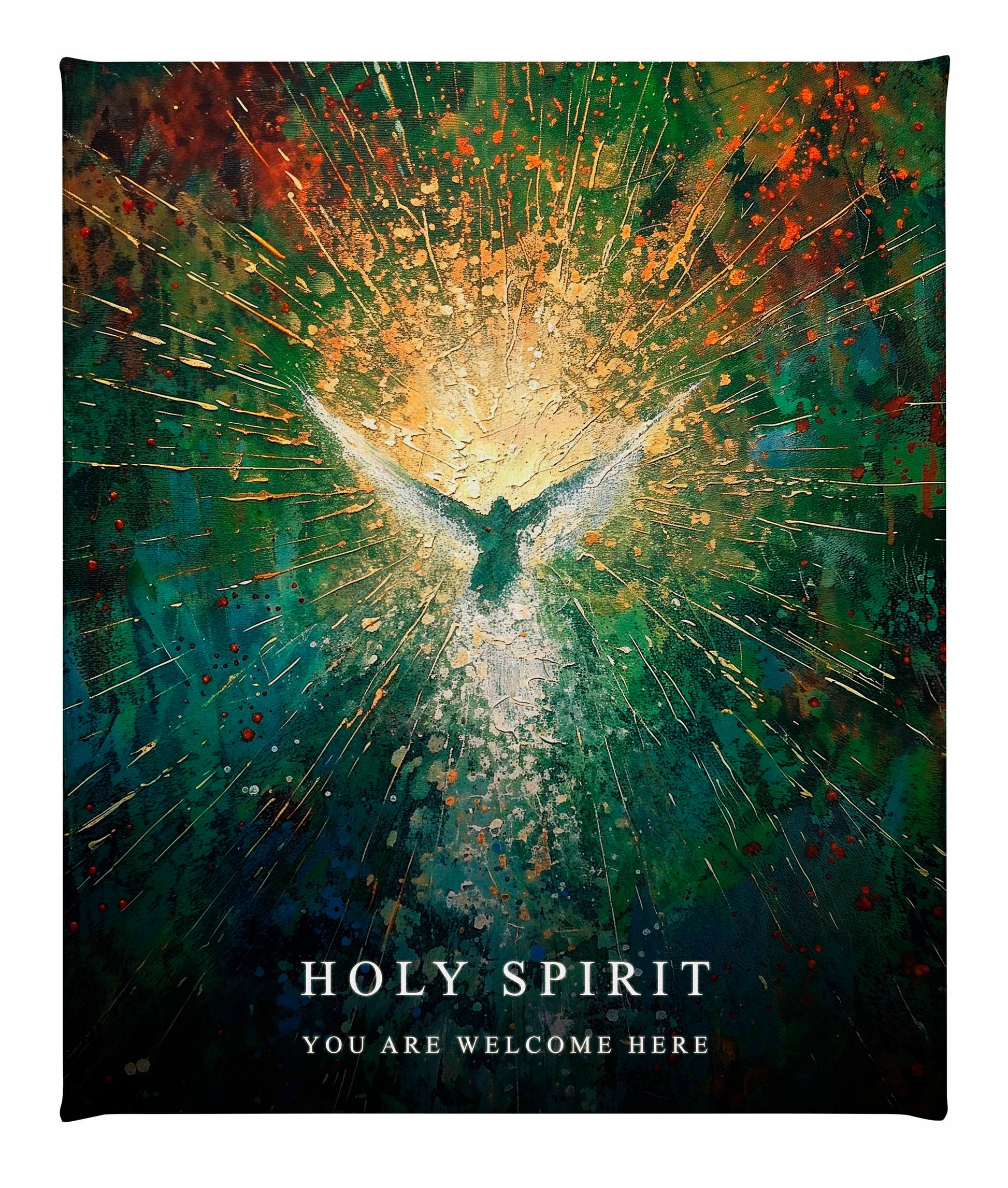 Holy Spirit is a dynamic painting that depicts the spiritual essence of the Holy Spirit through a glowing dove, a traditional symbol of divine presence in Christian art. The artwork features expressive brushstrokes that radiate outward, giving a sense of energy and movement. The dove, surrounded by golden light, contrasts with a background of deep greens and blues, symbolizing the interplay between the divine and earthly realms. The inscription, "HOLY SPIRIT - YOU ARE WELCOME HERE," emphasizes openness to spiritual connection and the transformative power of divine presence.