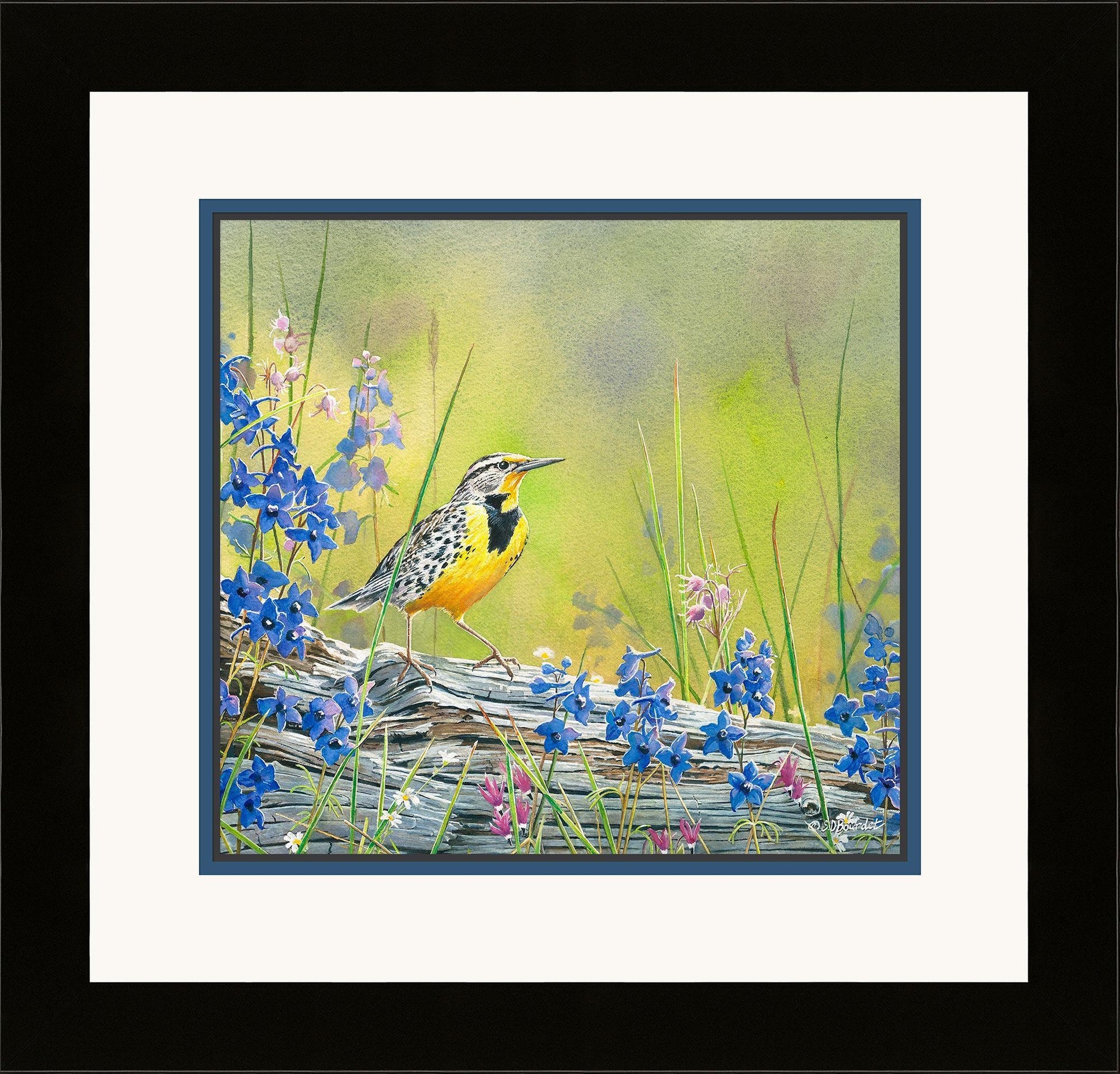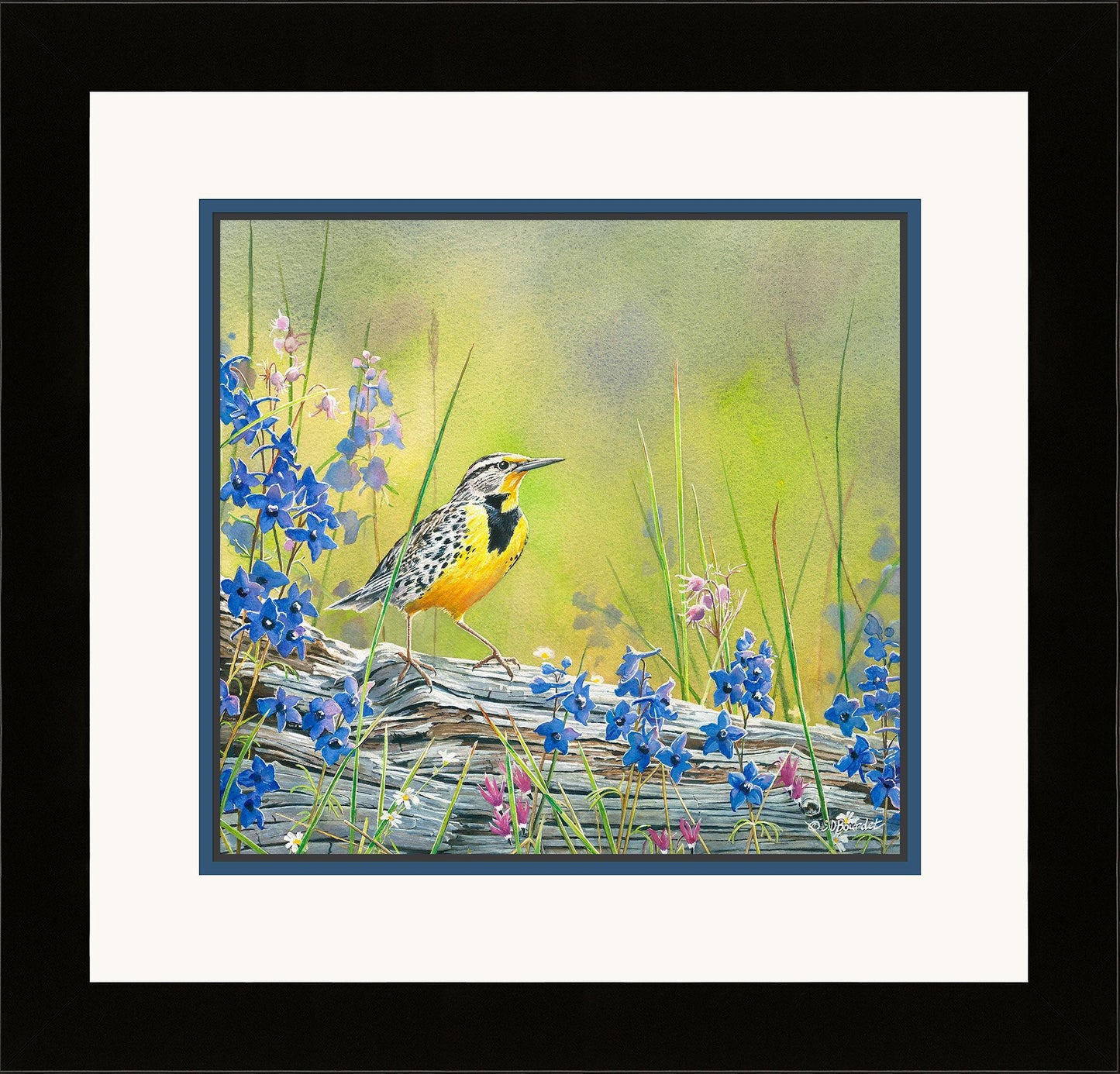 Open edition of art prints featuring a lark among wildflowers by artist Susan Bourdet. Unframed image size: 14 x 15. Published exclusively by Wild Wings.