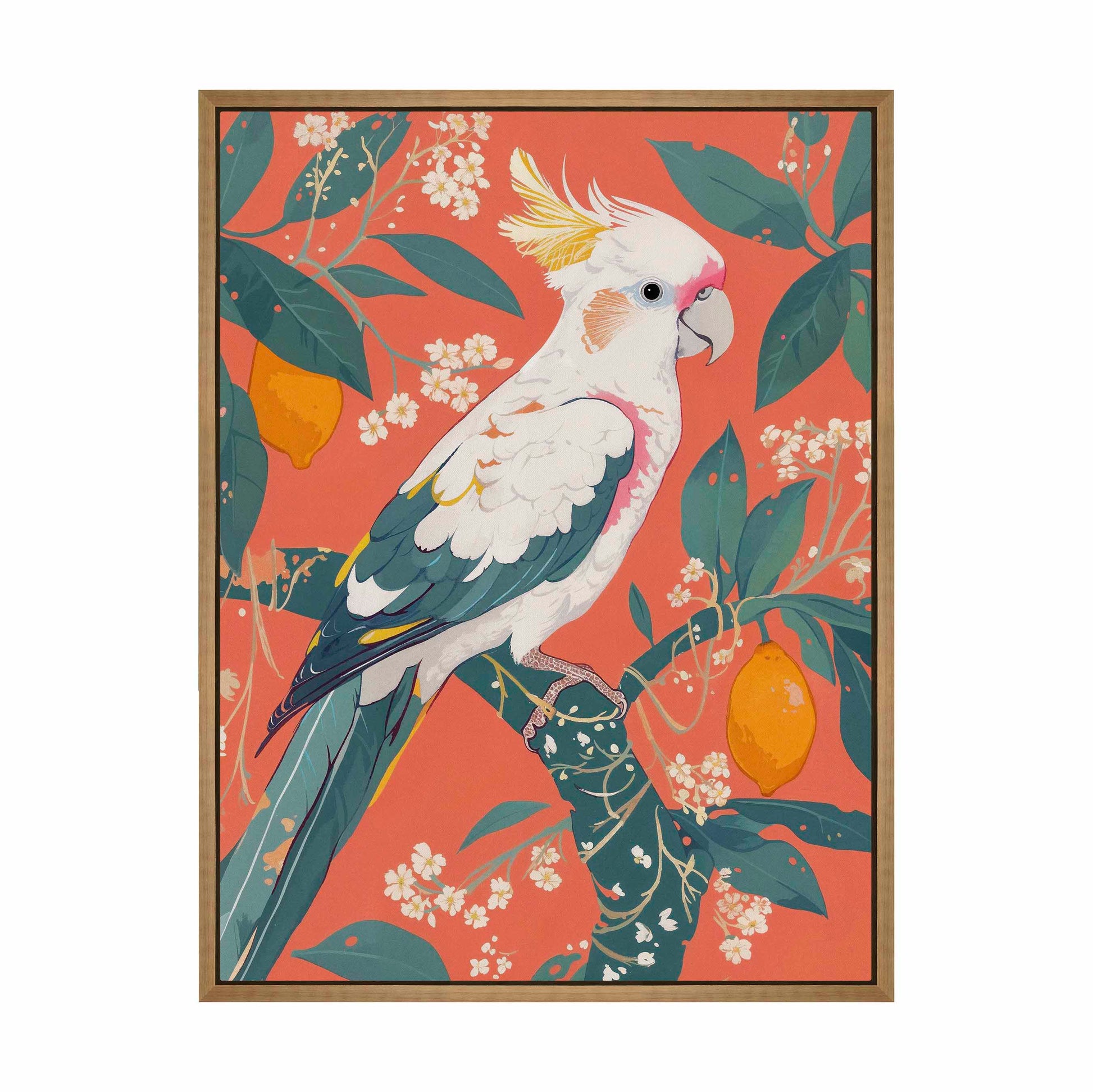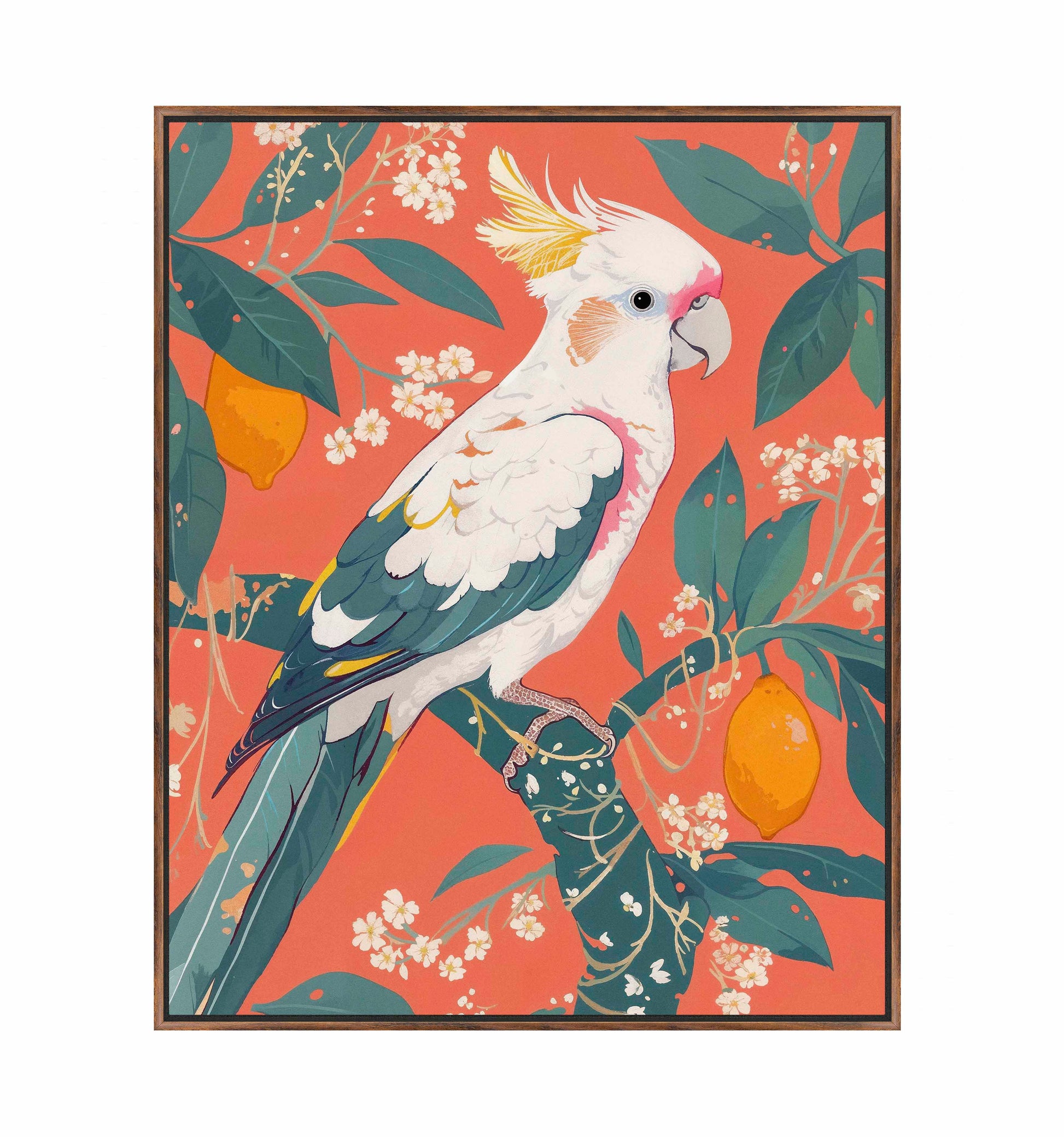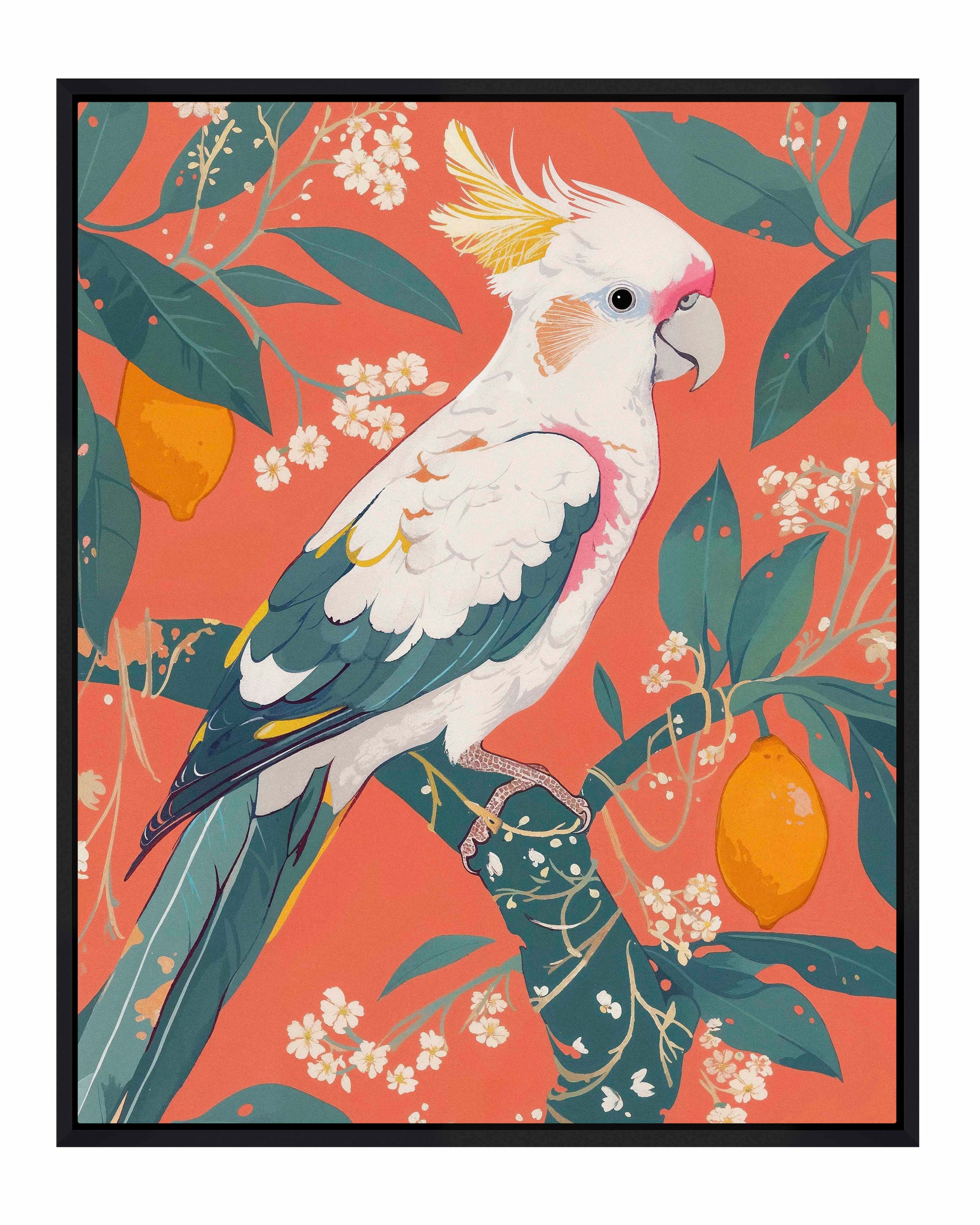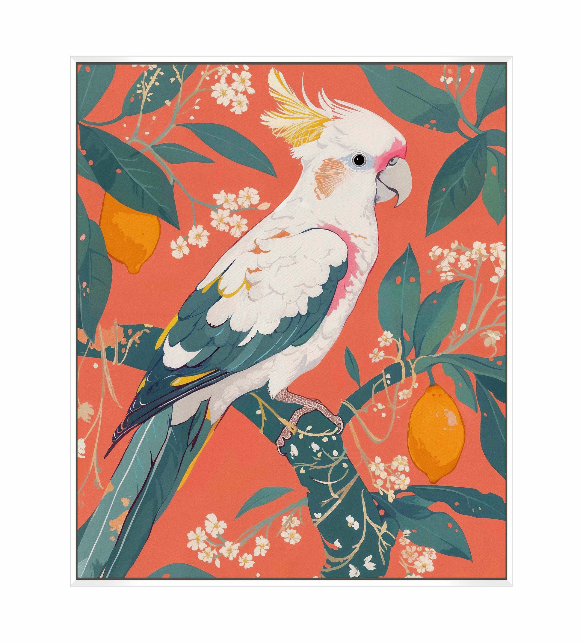 Lemon Grove Serenade - Cockatoo Amidst Citrus Blooms is a vibrant and enchanting addition to any collection, celebrating the lively and exotic beauty of nature. This painting features a striking Cockatoo, perched elegantly on a branch surrounded by lush citrus leaves and bright, golden lemons. The warm, coral background sets a cheerful tone, enhancing the colorful plumage of the Cockatoo and the rich greens of the foliage.