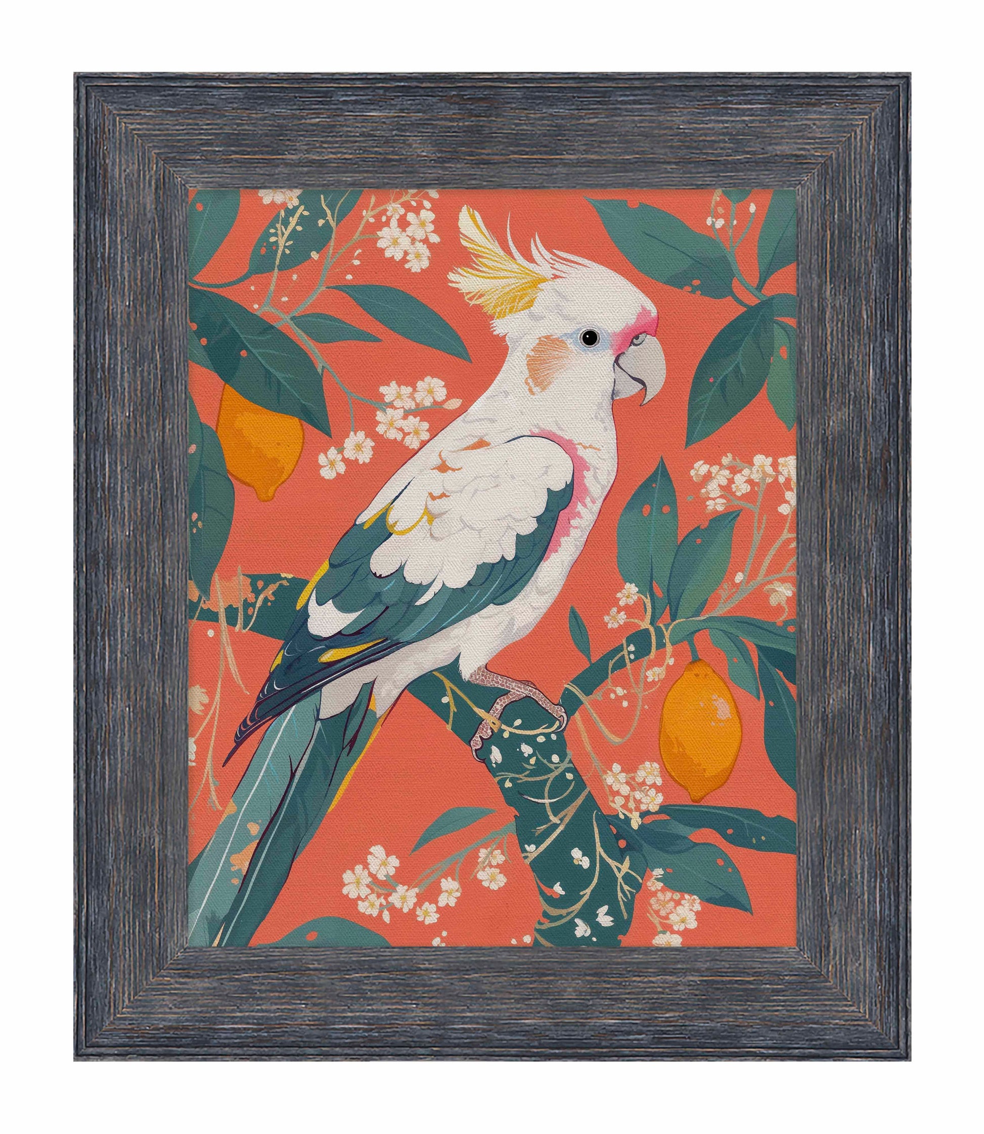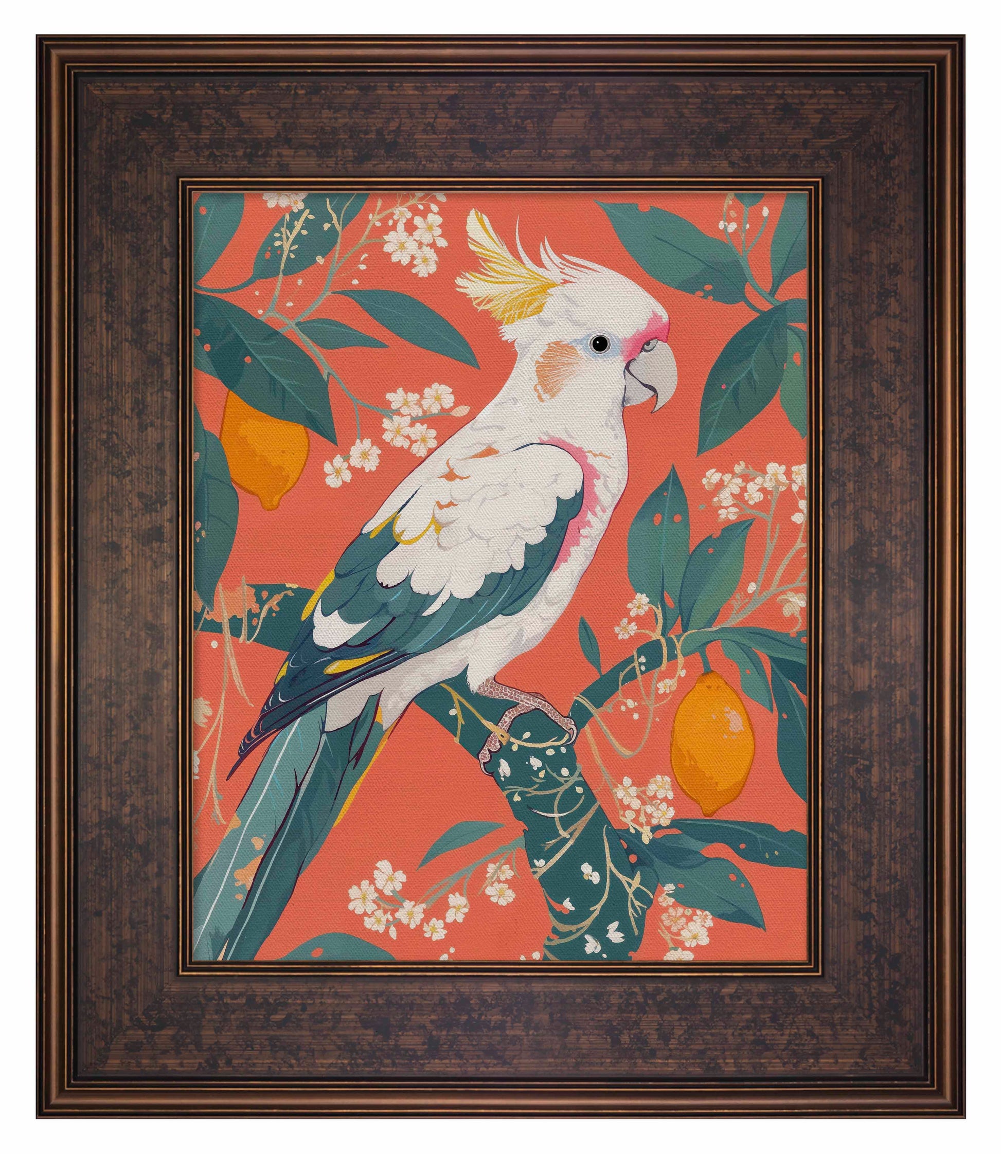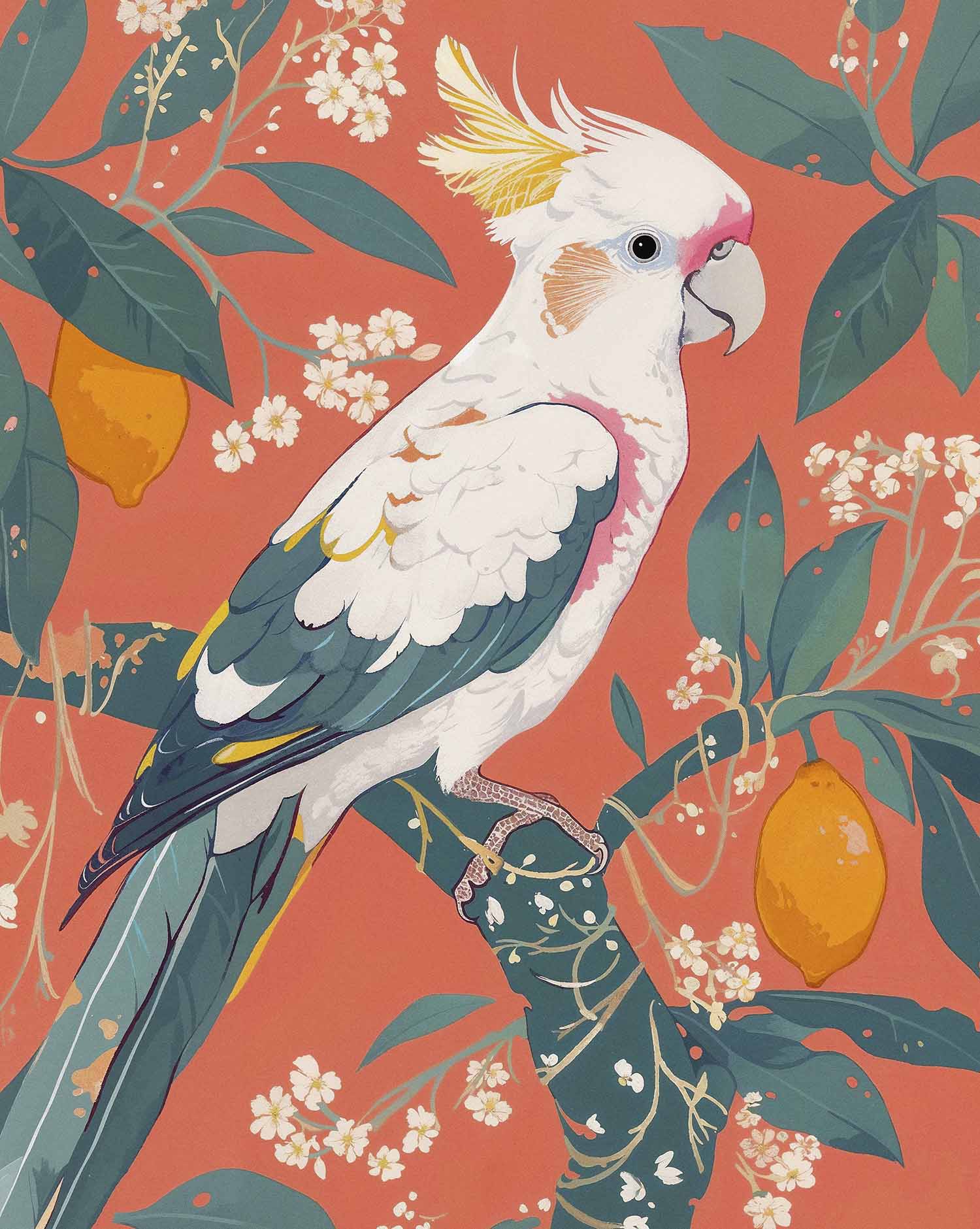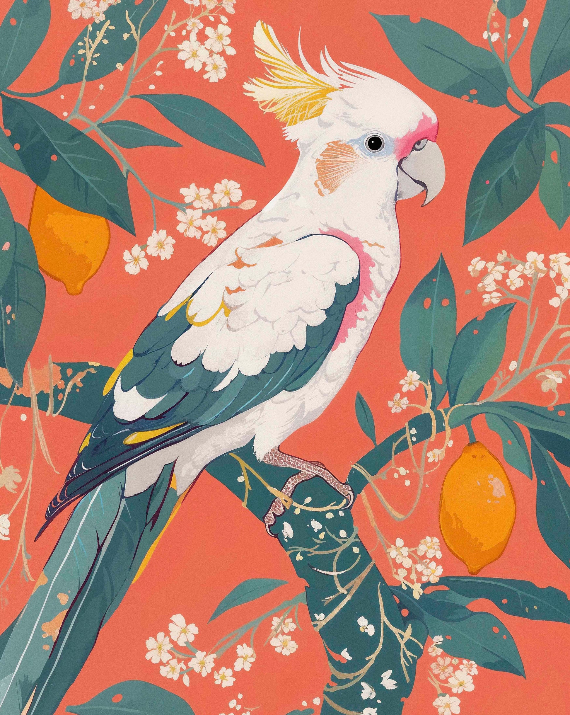 Lemon Grove Serenade - Cockatoo Amidst Citrus Blooms is a vibrant and enchanting addition to any collection, celebrating the lively and exotic beauty of nature. This painting features a striking Cockatoo, perched elegantly on a branch surrounded by lush citrus leaves and bright, golden lemons. The warm, coral background sets a cheerful tone, enhancing the colorful plumage of the Cockatoo and the rich greens of the foliage.