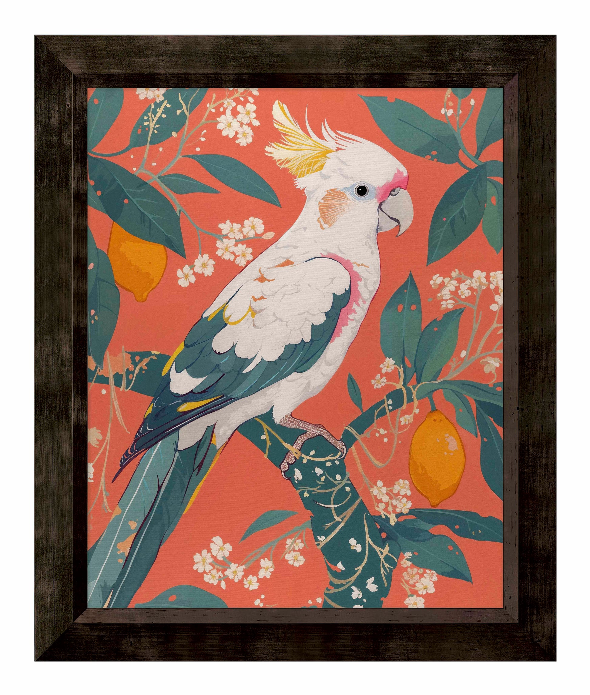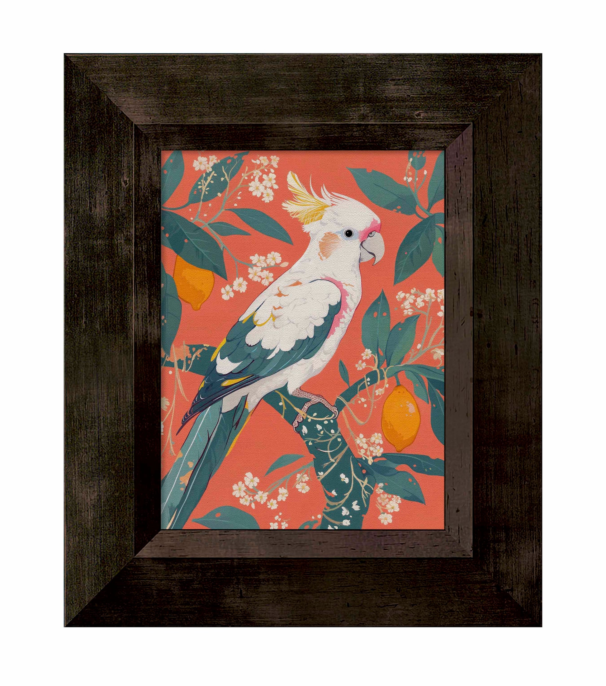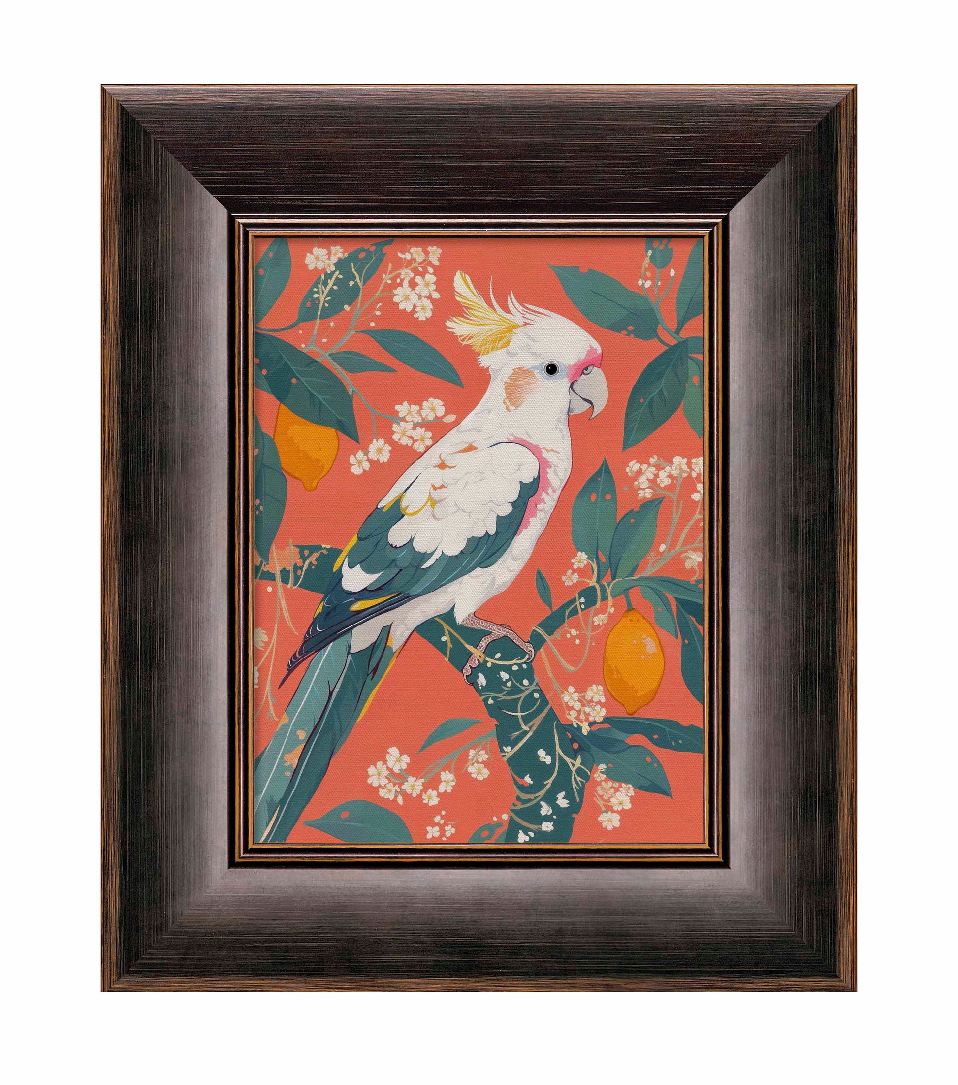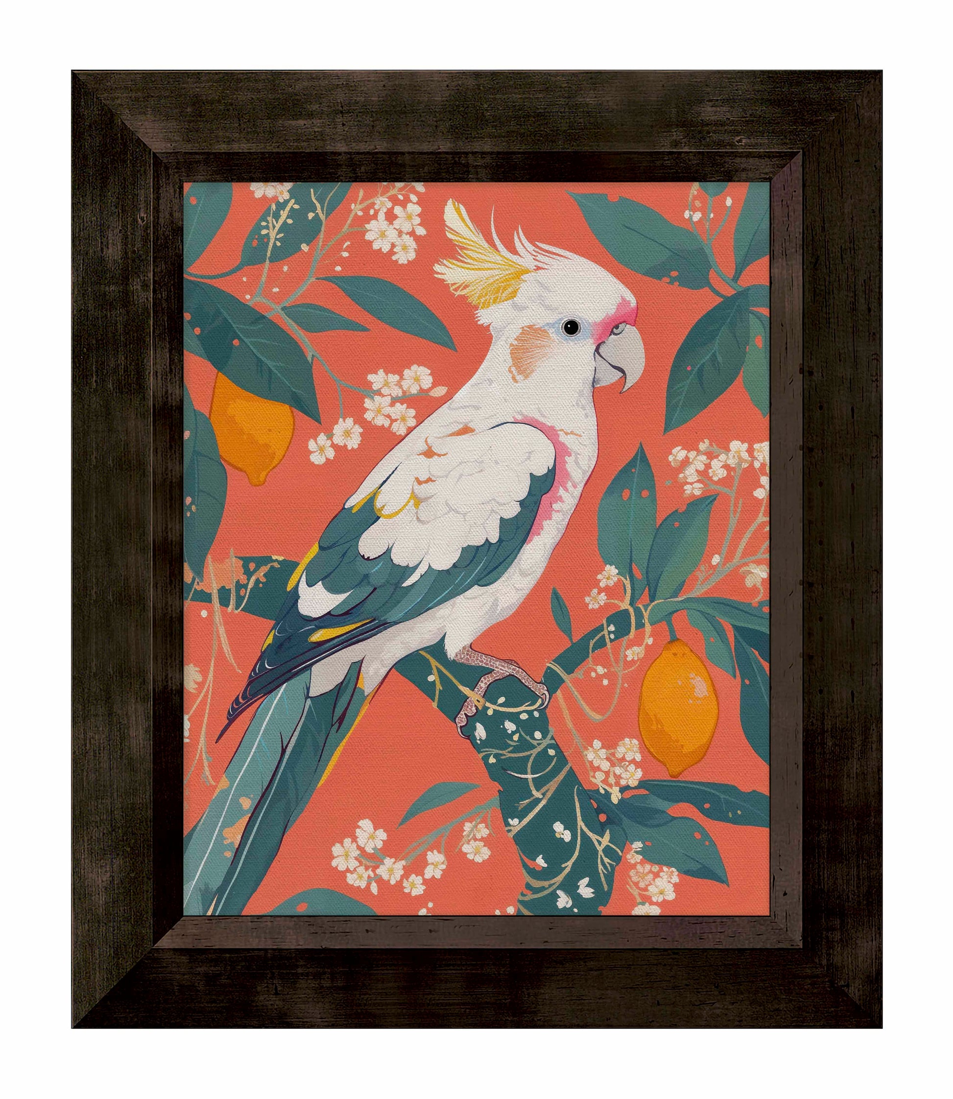 Lemon Grove Serenade - Cockatoo Amidst Citrus Blooms is a vibrant and enchanting addition to any collection, celebrating the lively and exotic beauty of nature. This painting features a striking Cockatoo, perched elegantly on a branch surrounded by lush citrus leaves and bright, golden lemons. The warm, coral background sets a cheerful tone, enhancing the colorful plumage of the Cockatoo and the rich greens of the foliage.