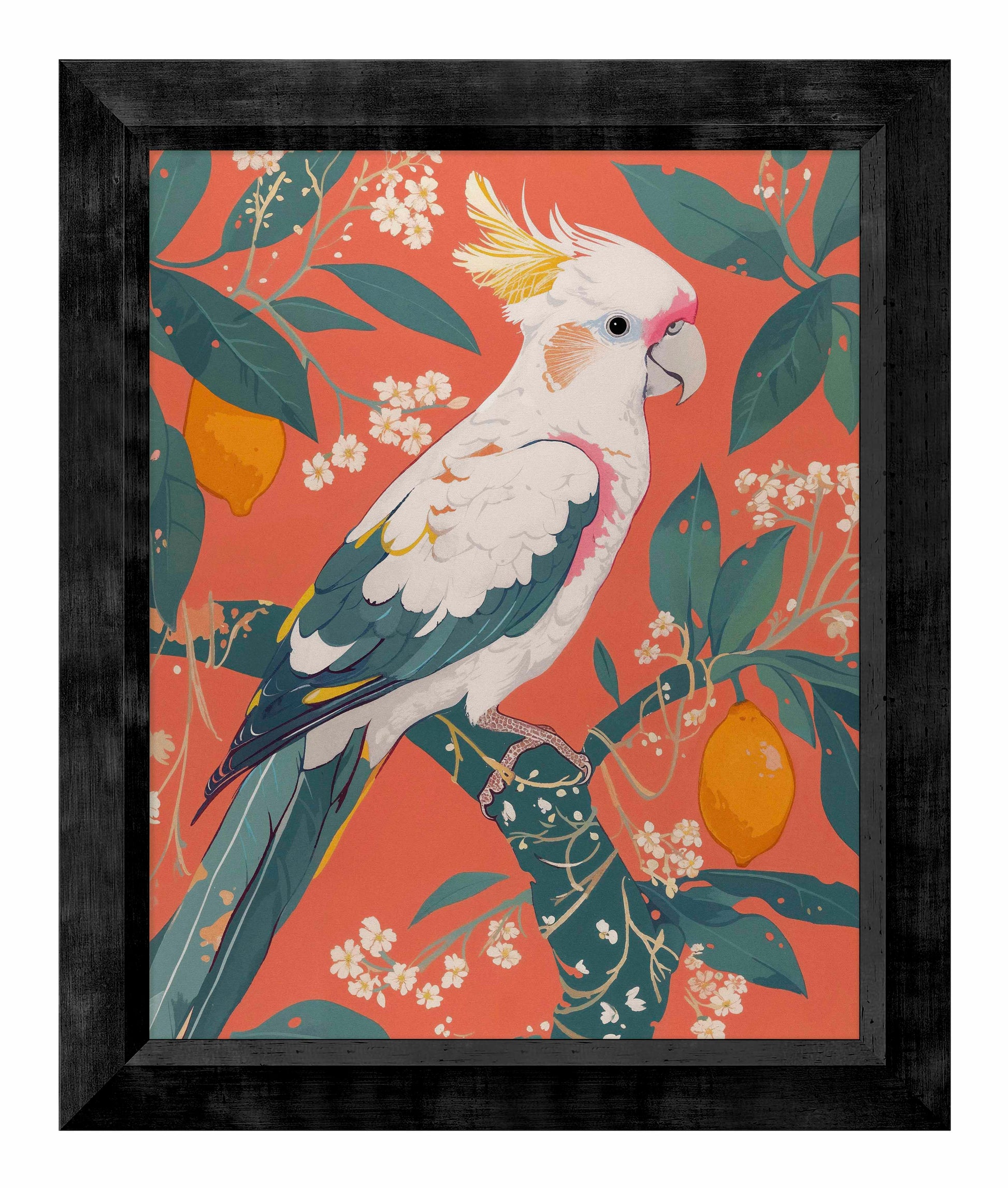The artist's use of bold colors and crisp lines creates a modern yet timeless feel, capturing the viewer's attention with its dynamic composition. The Cockatoo's intricate feather patterns and the delicate blossoms add a touch of refinement and grace, showcasing the artist's attention to detail and appreciation for natural beauty.
