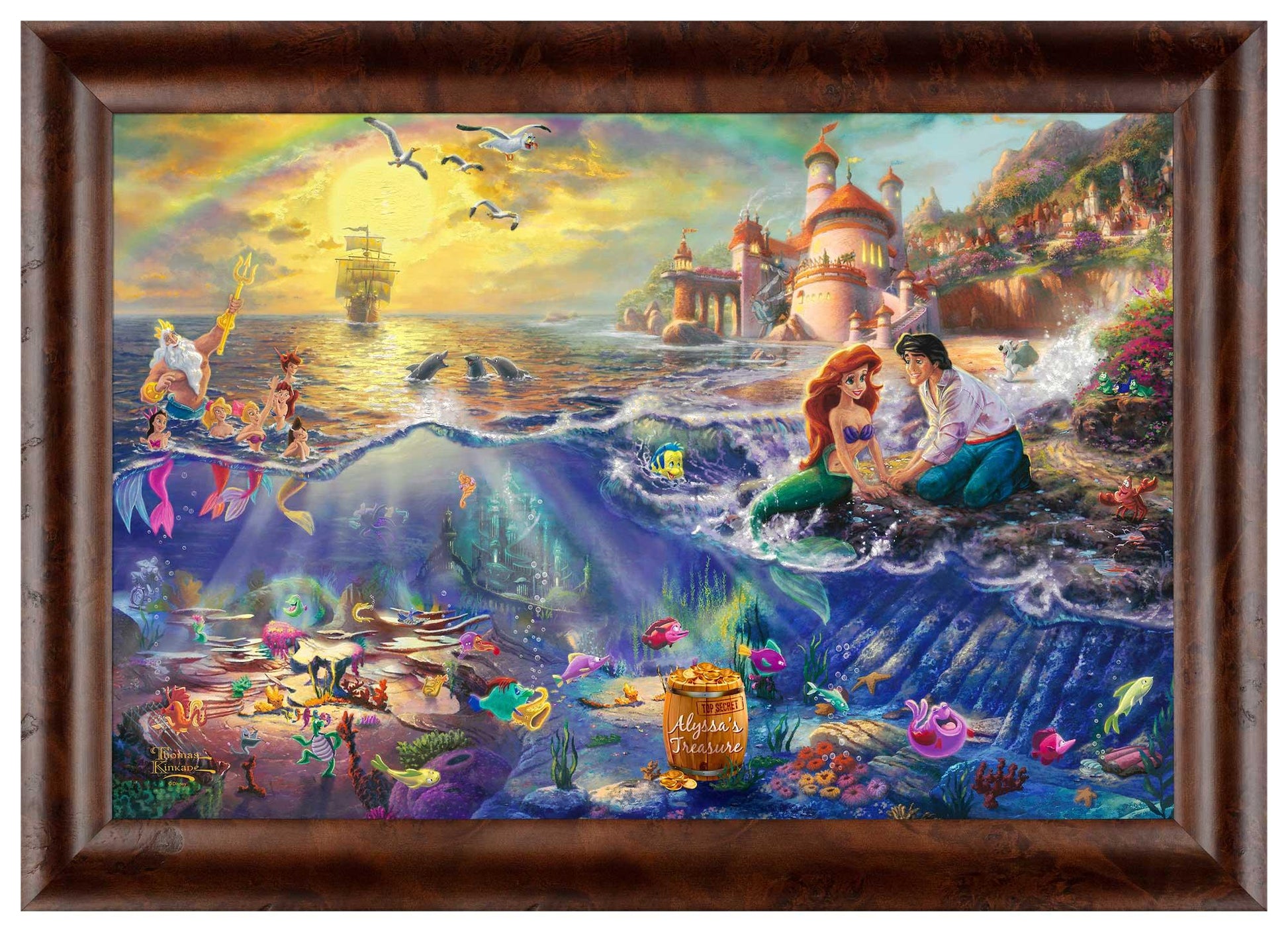 Disney Dreams Collection by Thomas Kinkade Studios is now available as a personalized framed canvas! Specify a line of personalization to the barrel of treasures in the image and you or someone special will feel part of this famous love story! Personalization information will be entered in your shopping cart during the checkout process, or please contact us for additional personalization requests. Open edition canvas framed. Available with multiple frame choices in multiple sizes. Open Edition Certificate of Authenticity included.