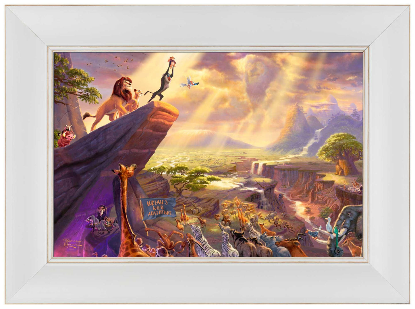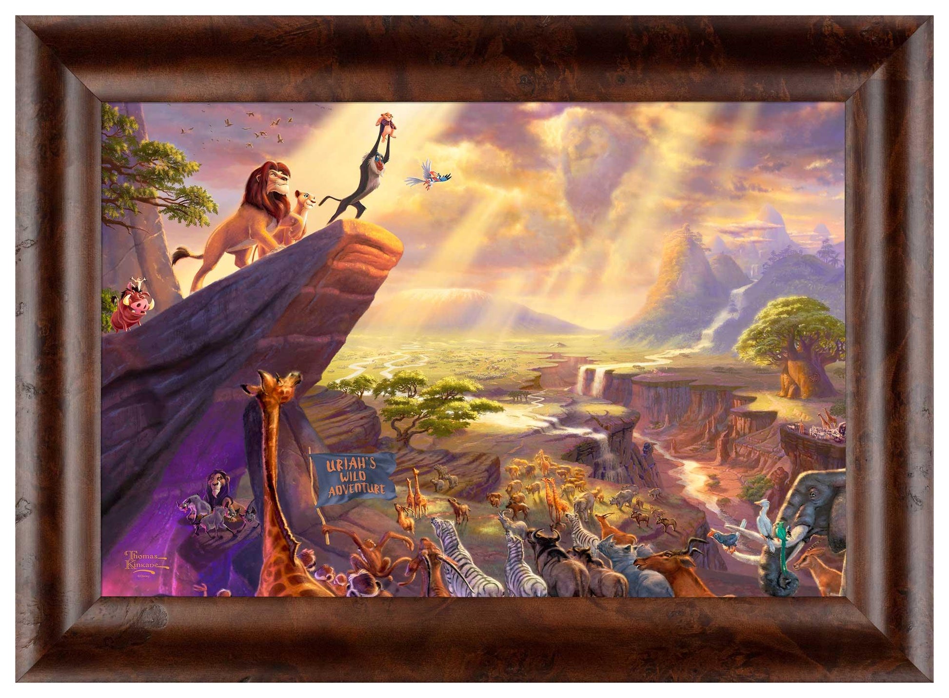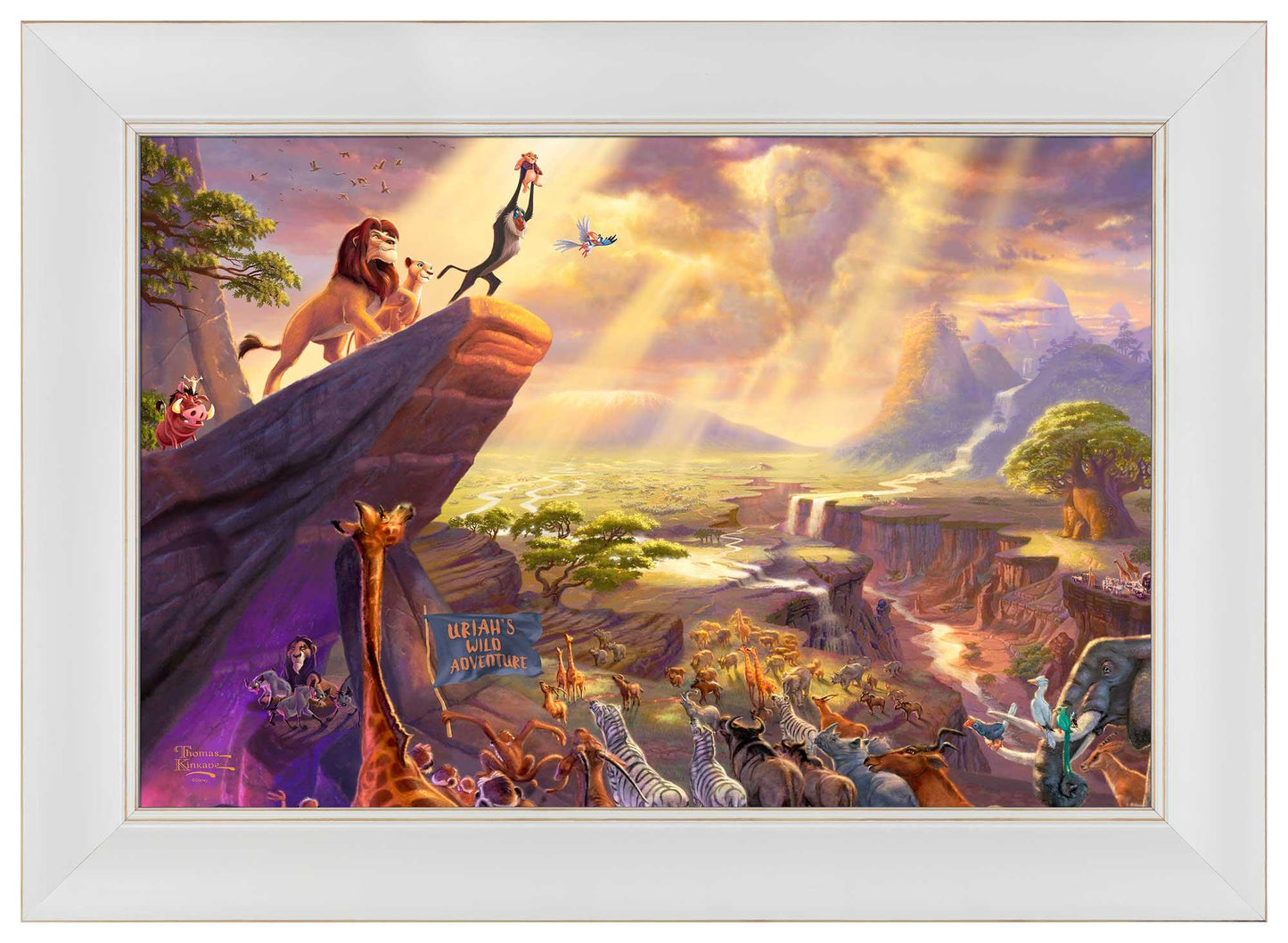 As I painted my homage to this amazing story, I could not help but be moved by the intricate interplay between all of the magnificent creatures under Simba's domain. I imagined a lush, colorful, and bountiful African plain rightfully reestablished to its splendor after Simba vanquished Scar and his comedic, yet treacherous, hyenas each now forlorn in their punishment. The multitudes of animals have been summoned to pay tribute to Simba's new baby and their future regent as they wait under a spectacular sky illuminated in great anticipation. The world is as it should be&in harmony and perfectly balanced. Simba's heir is exalted by Rafiki and proudly symbolizes what awaits when destiny is embraced, challenges faced, and one summons the courage to stand in the spotlight of providence. I trust that this image will both remind you of this fantastic story and its amazing characters and, most importantly, move you to face the future irrespective of history's impasses knowing that the watchful and approving eye of the King is content as you embrace your place in the circle of life. - Thomas Kinkade