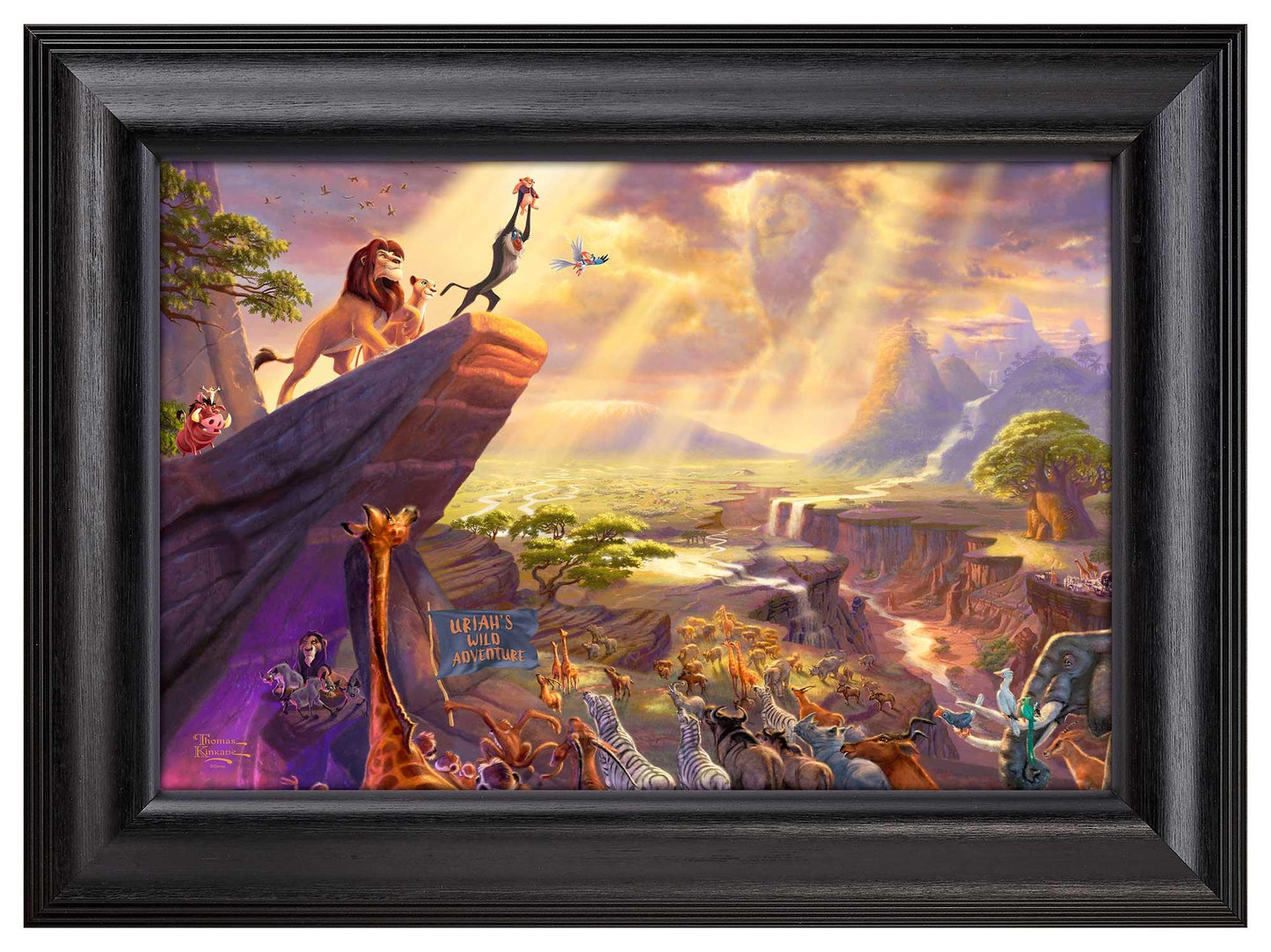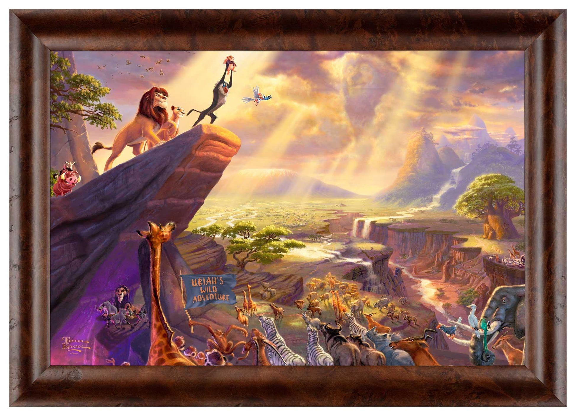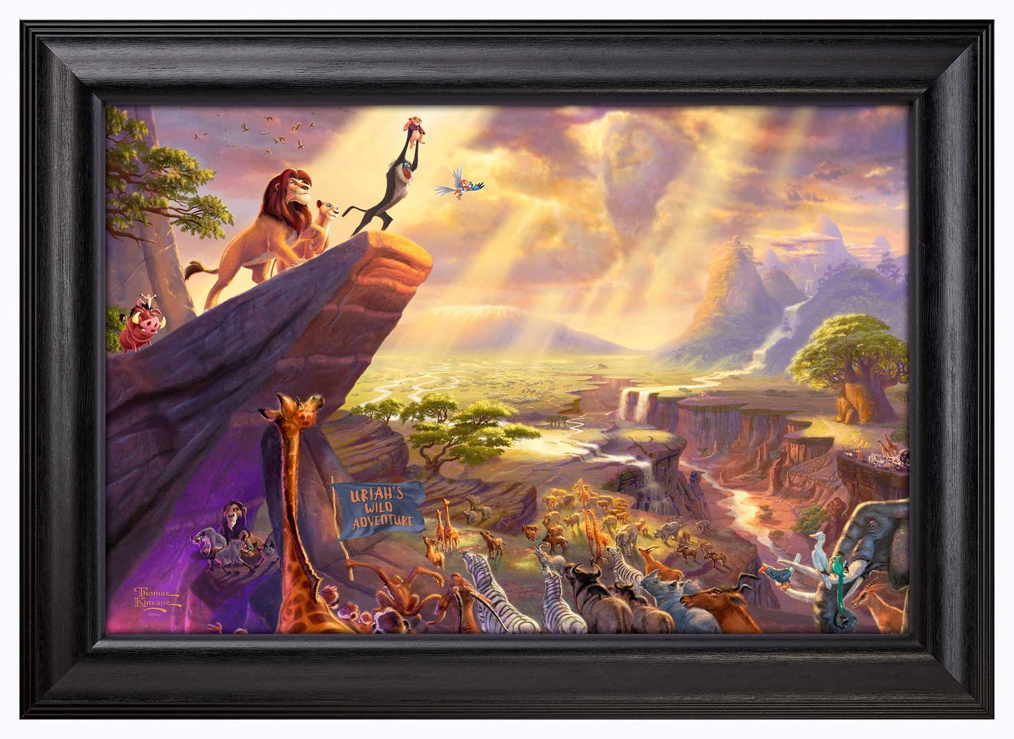 As I painted my homage to this amazing story, I could not help but be moved by the intricate interplay between all of the magnificent creatures under Simba's domain. I imagined a lush, colorful, and bountiful African plain rightfully reestablished to its splendor after Simba vanquished Scar and his comedic, yet treacherous, hyenas each now forlorn in their punishment. The multitudes of animals have been summoned to pay tribute to Simba's new baby and their future regent as they wait under a spectacular sky illuminated in great anticipation. The world is as it should be&in harmony and perfectly balanced. Simba's heir is exalted by Rafiki and proudly symbolizes what awaits when destiny is embraced, challenges faced, and one summons the courage to stand in the spotlight of providence. I trust that this image will both remind you of this fantastic story and its amazing characters and, most importantly, move you to face the future irrespective of history's impasses knowing that the watchful and approving eye of the King is content as you embrace your place in the circle of life. - Thomas Kinkade