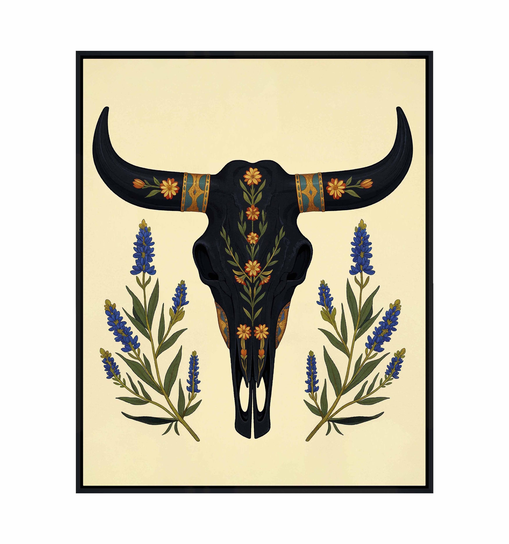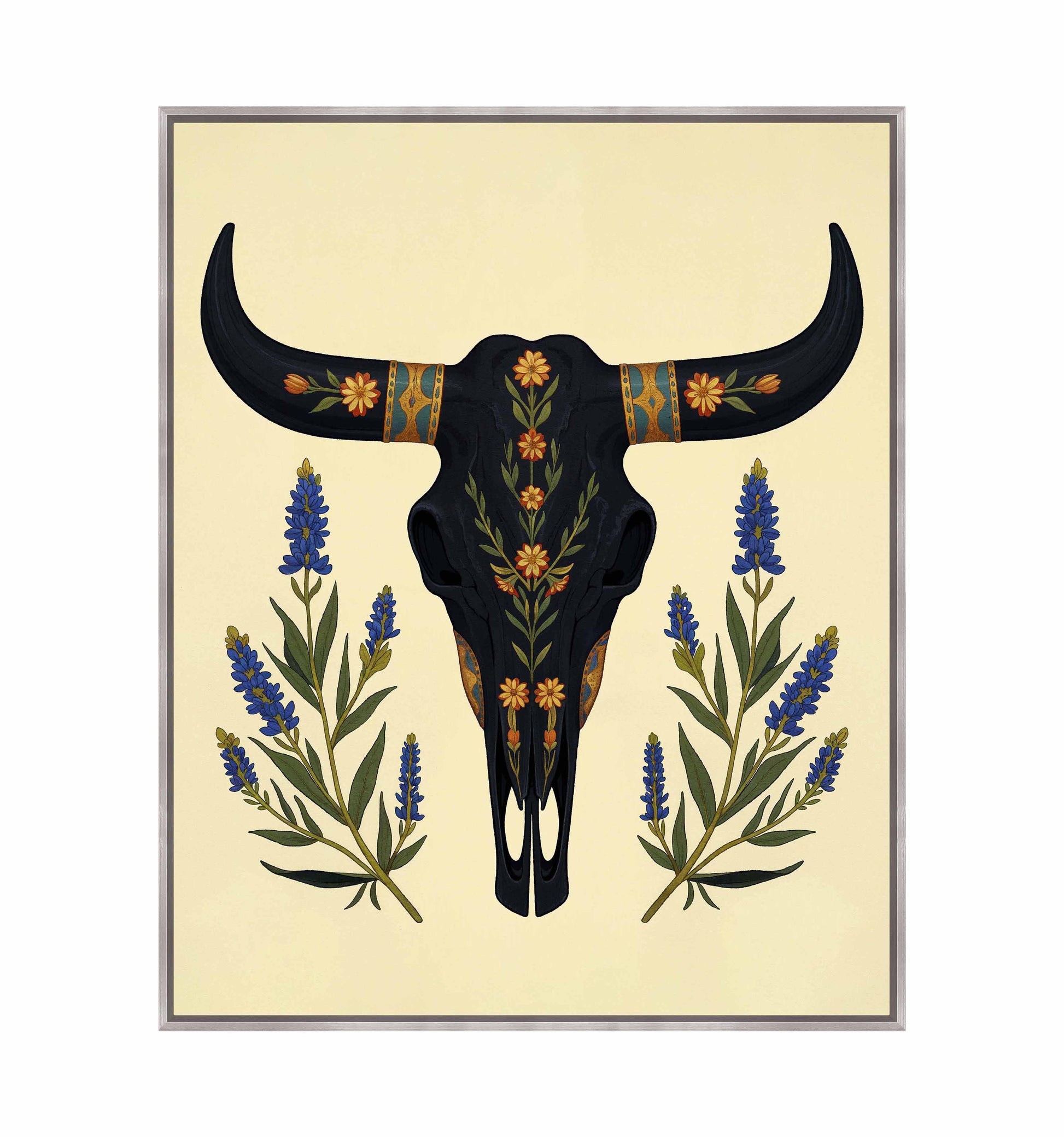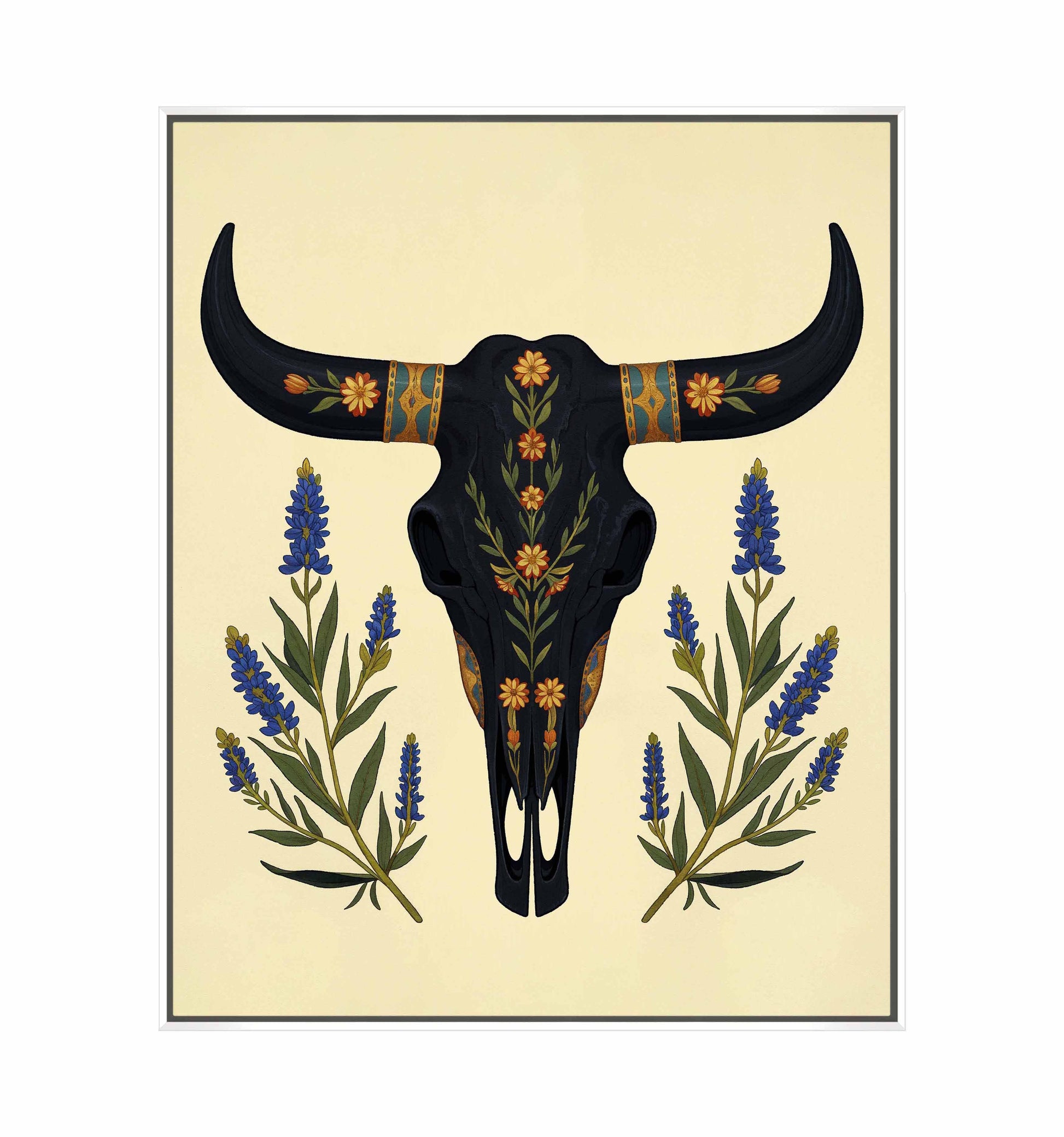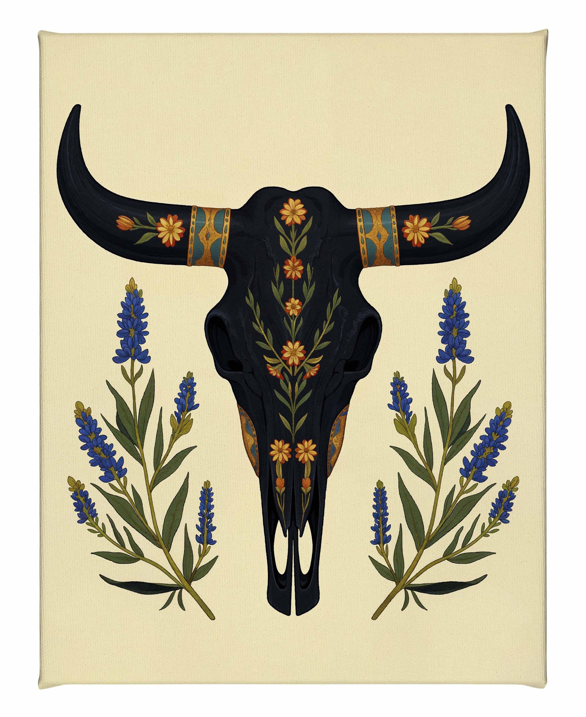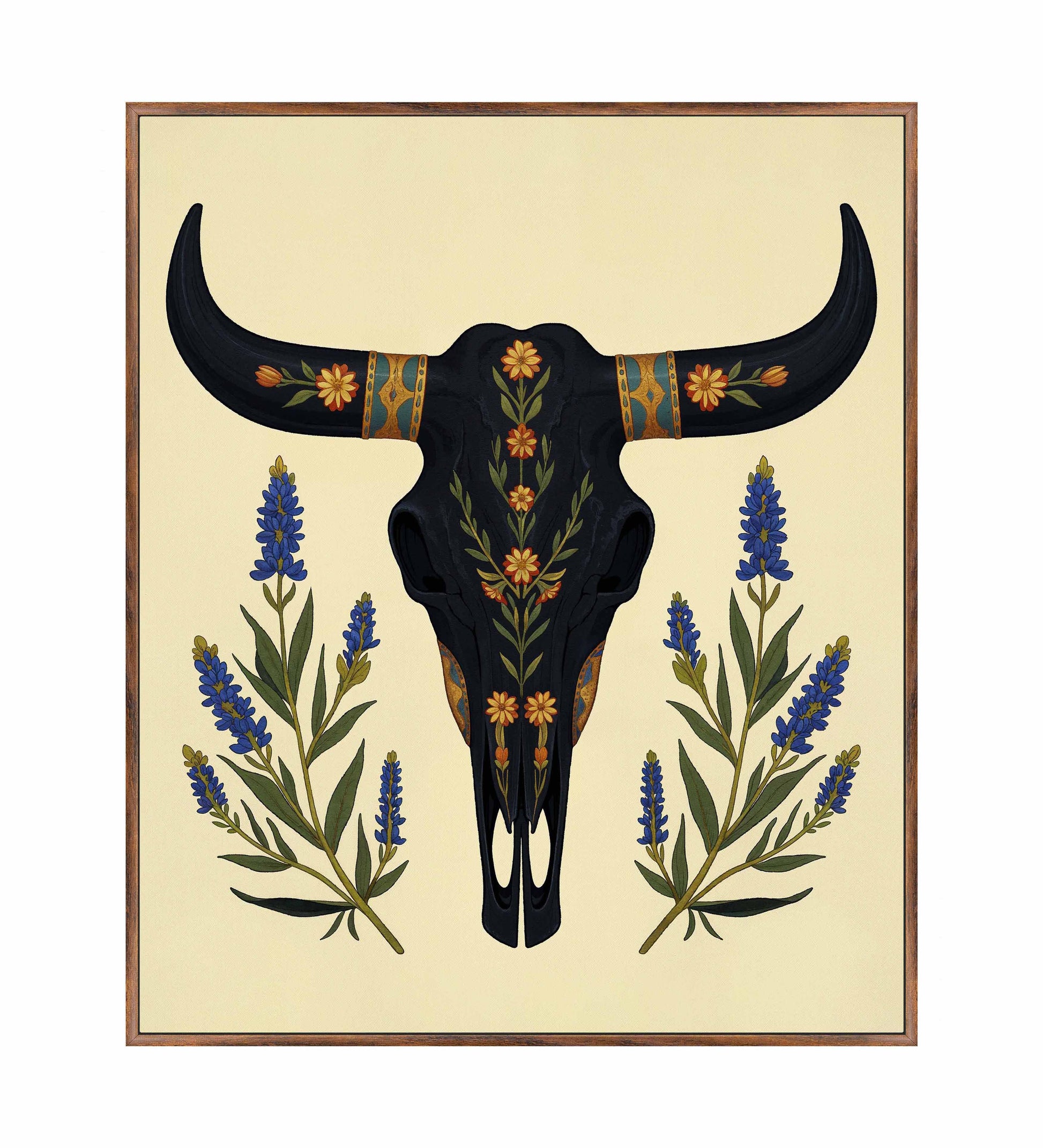 "Lone Star Lament" is a striking piece that marries elements of natural beauty with the poignant symbolism of a lone bull skull. The central figure is a stylized, black bull skull, detailed with intricate floral and geometric patterns that are reminiscent of Southwestern and indigenous designs. The skull is adorned with bright yellow and orange flowers, adding a touch of life and color to an otherwise somber symbol of mortality.