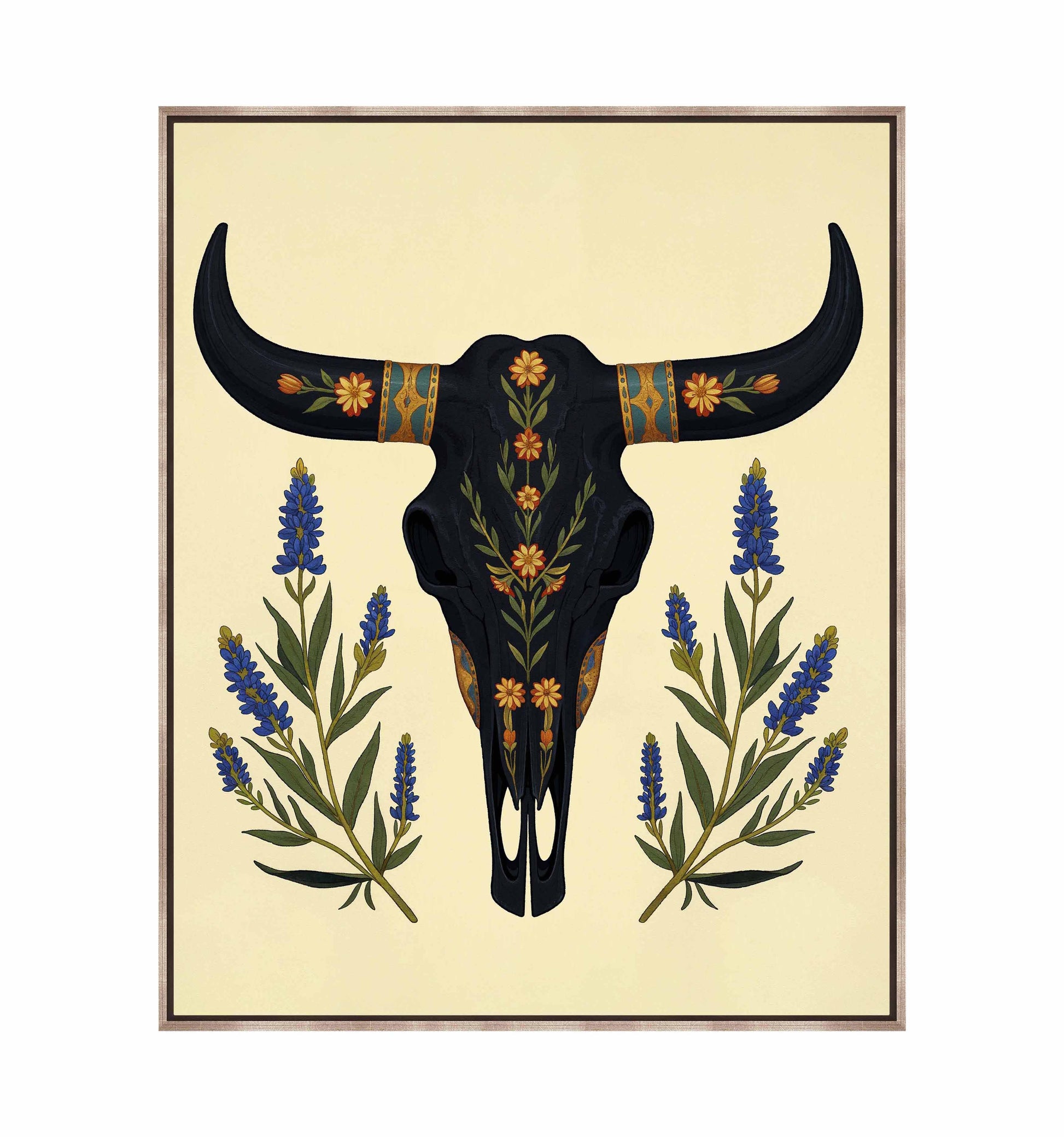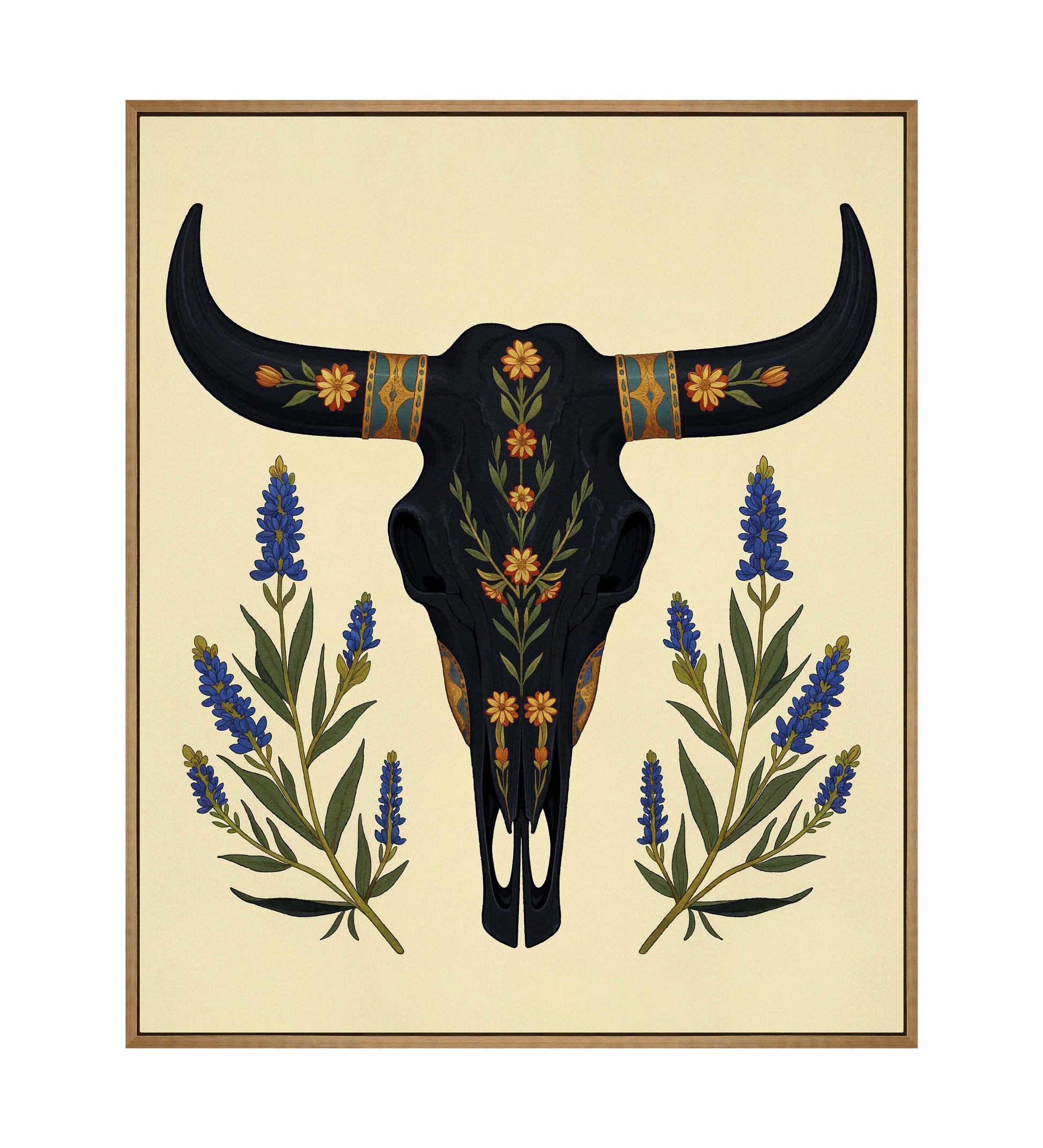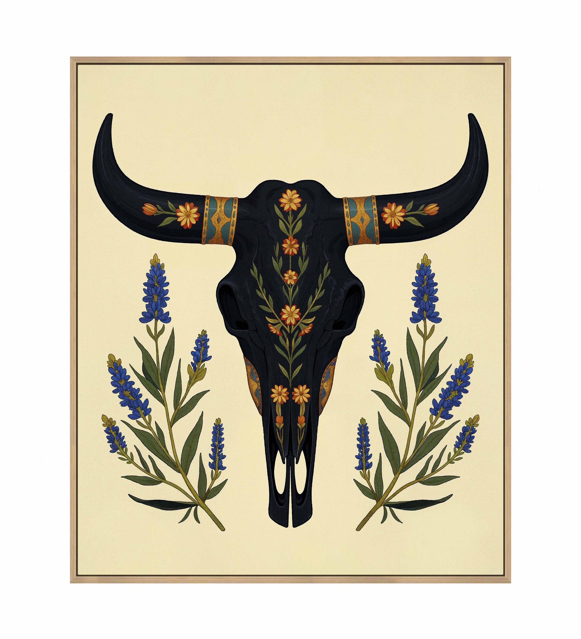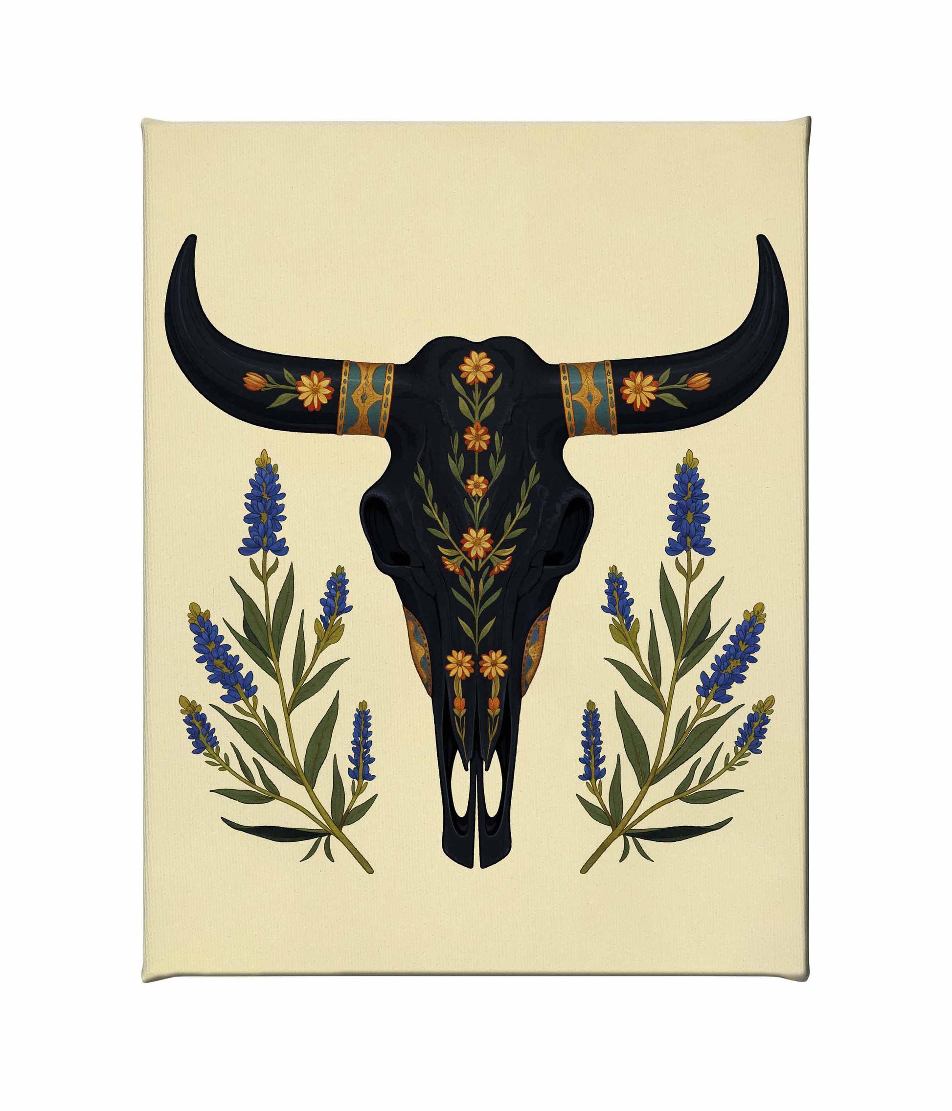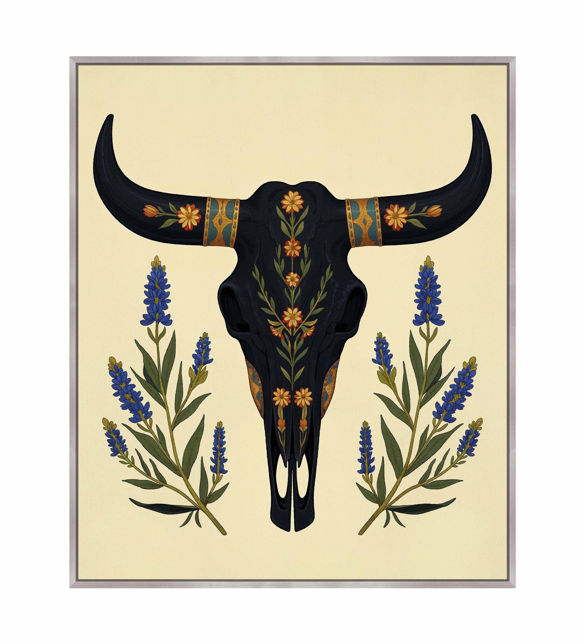 "Lone Star Lament" is a striking piece that marries elements of natural beauty with the poignant symbolism of a lone bull skull. The central figure is a stylized, black bull skull, detailed with intricate floral and geometric patterns that are reminiscent of Southwestern and indigenous designs. The skull is adorned with bright yellow and orange flowers, adding a touch of life and color to an otherwise somber symbol of mortality.