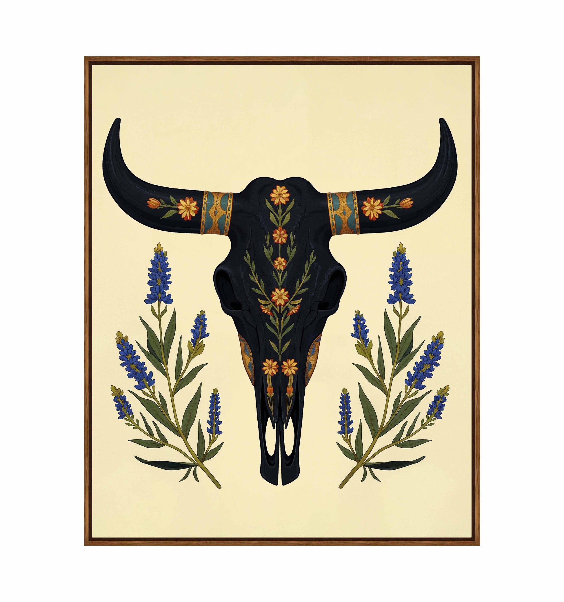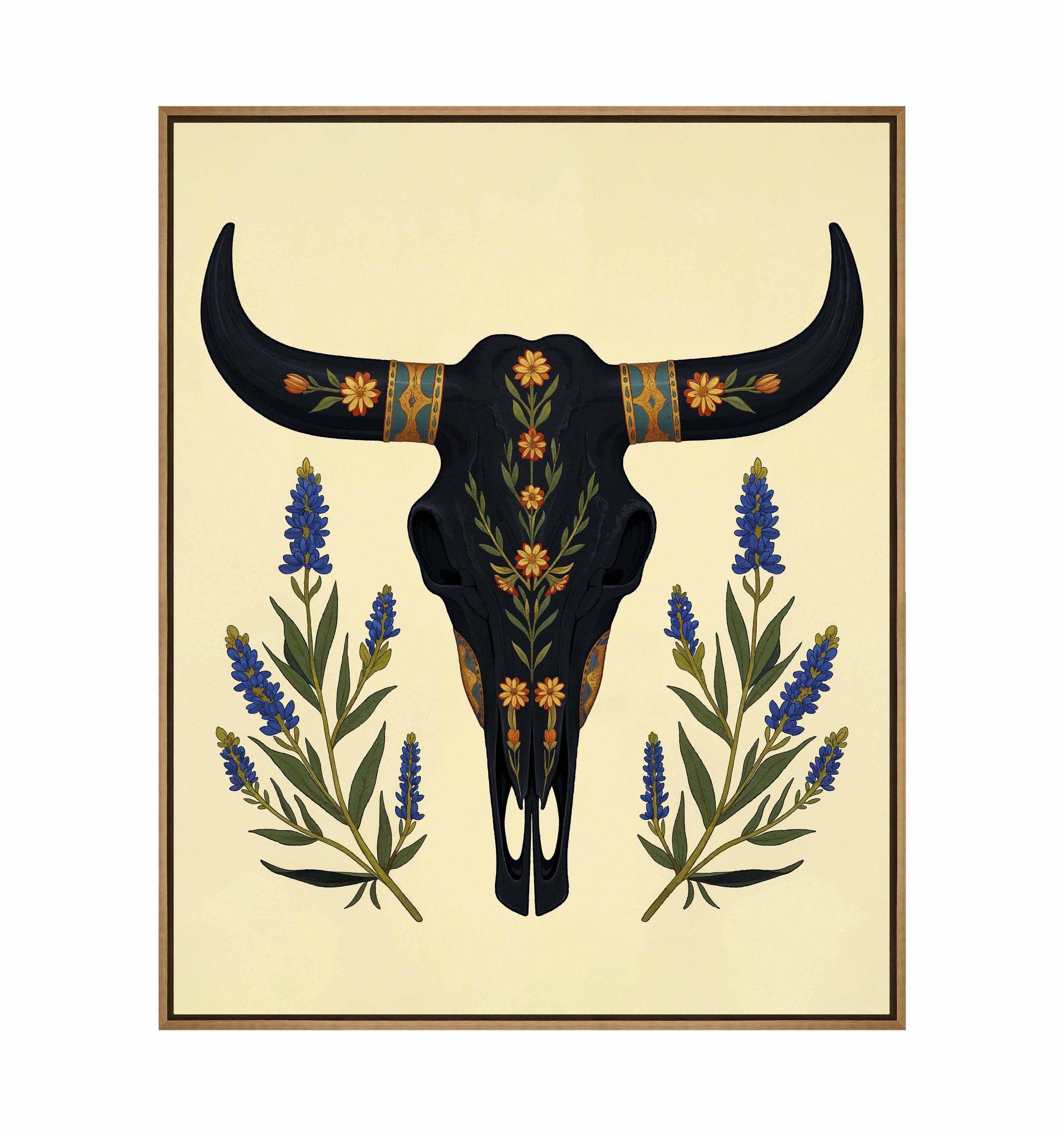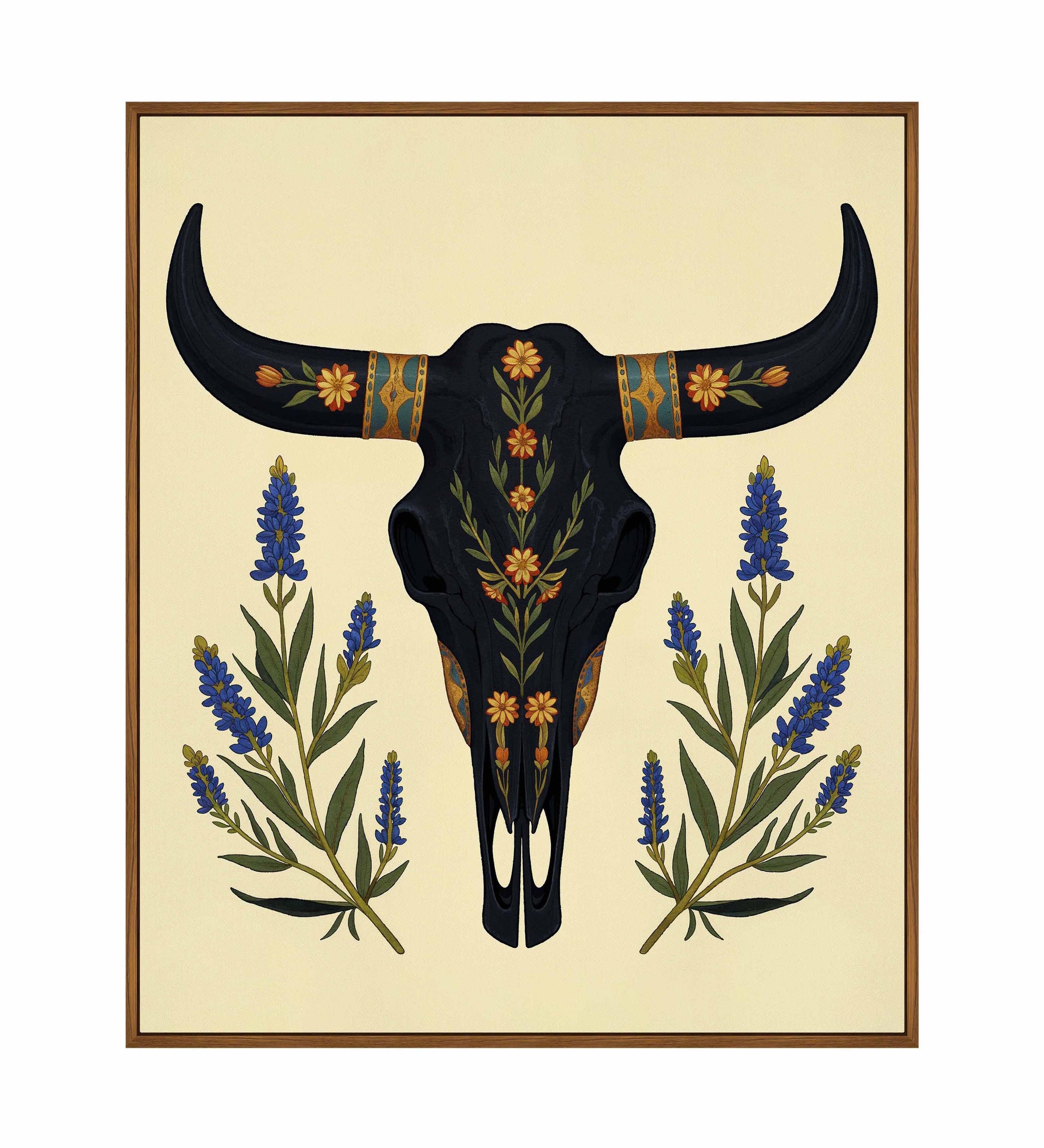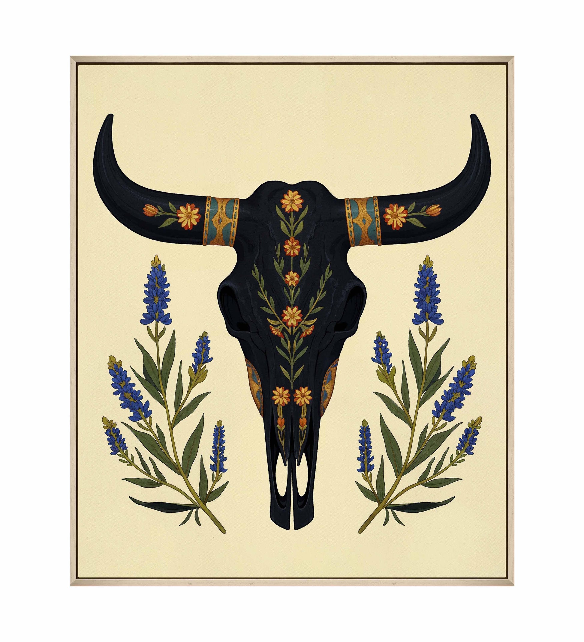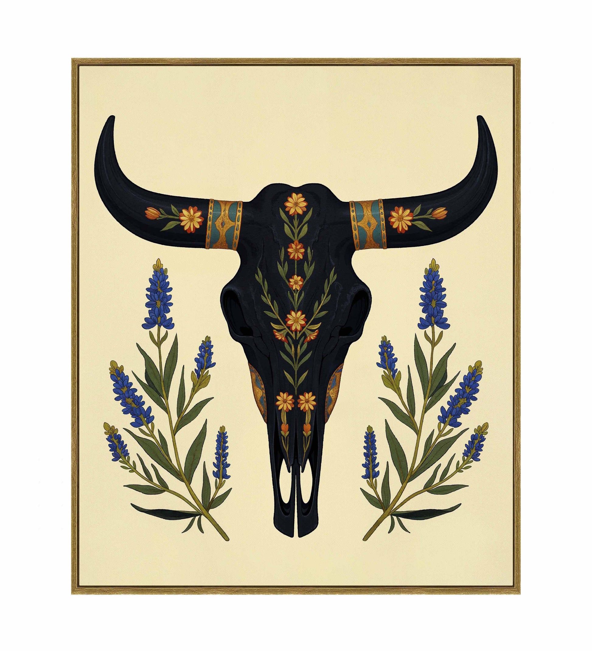 "Lone Star Lament" is a striking piece that marries elements of natural beauty with the poignant symbolism of a lone bull skull. The central figure is a stylized, black bull skull, detailed with intricate floral and geometric patterns that are reminiscent of Southwestern and indigenous designs. The skull is adorned with bright yellow and orange flowers, adding a touch of life and color to an otherwise somber symbol of mortality.