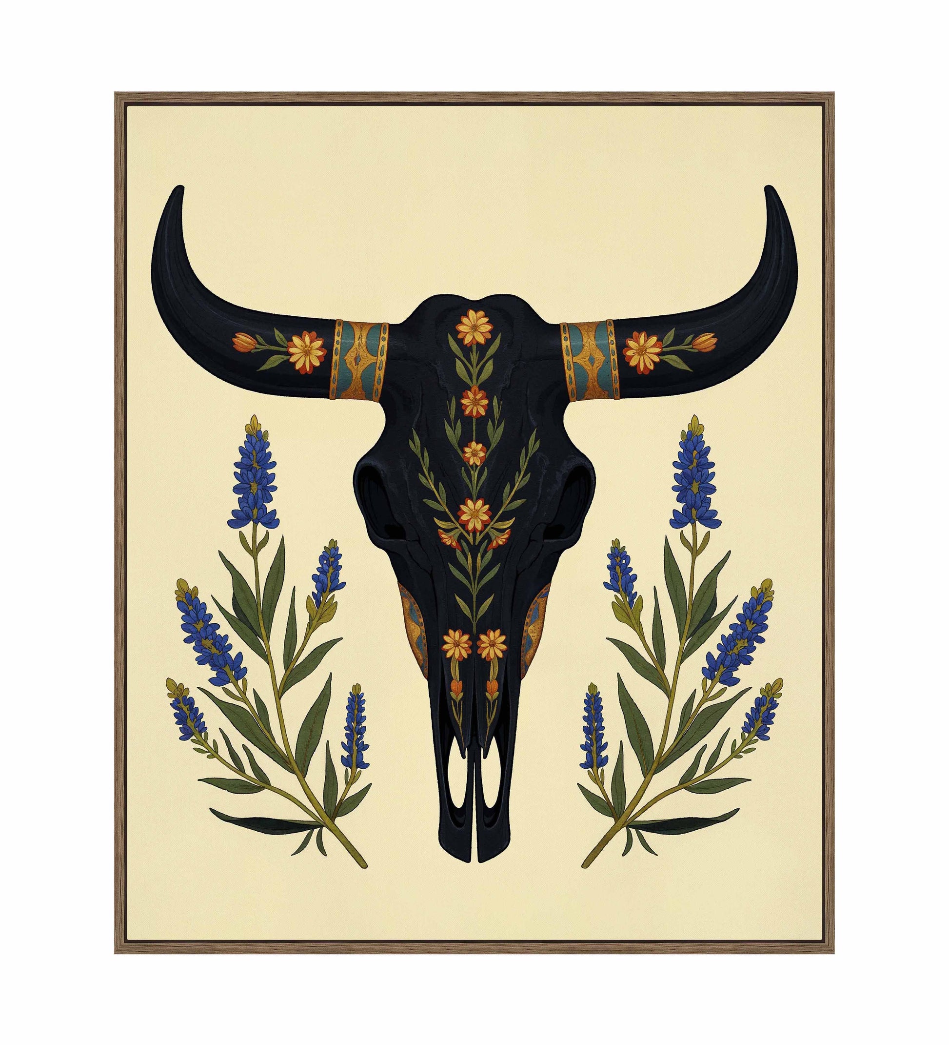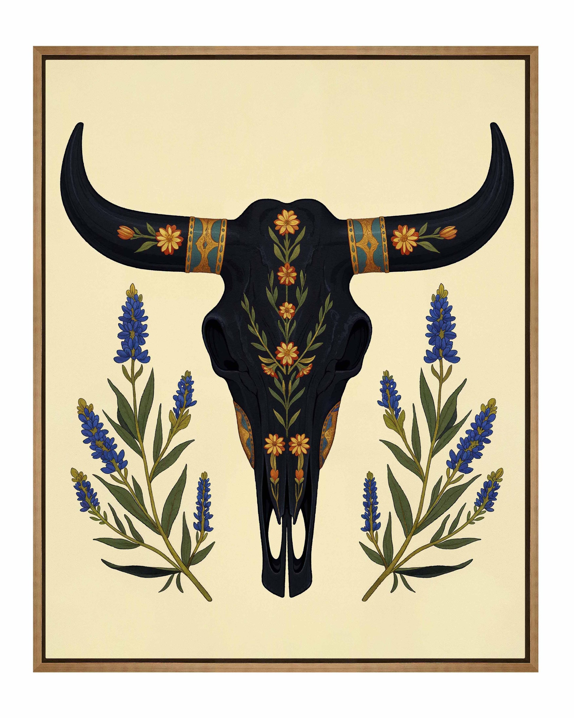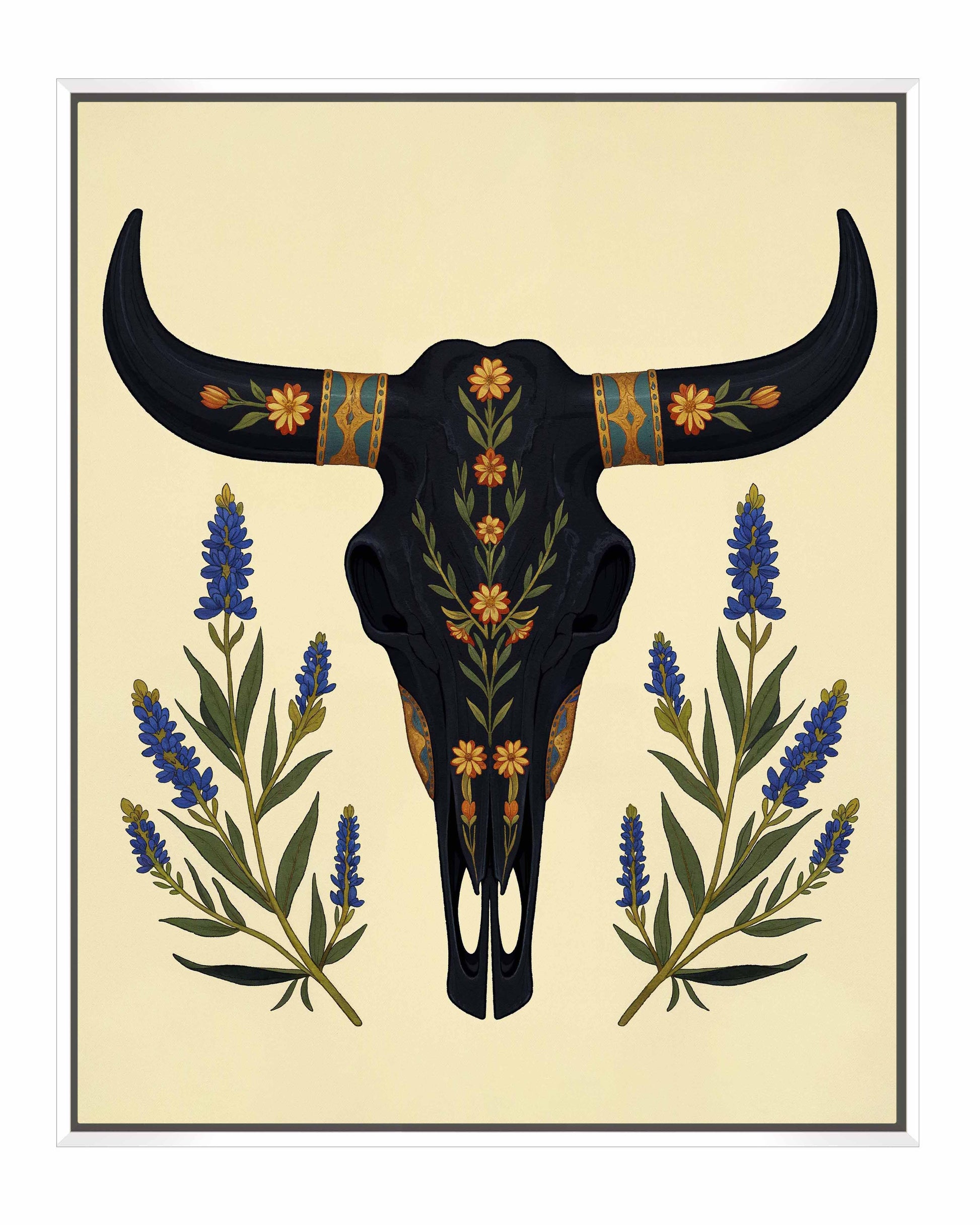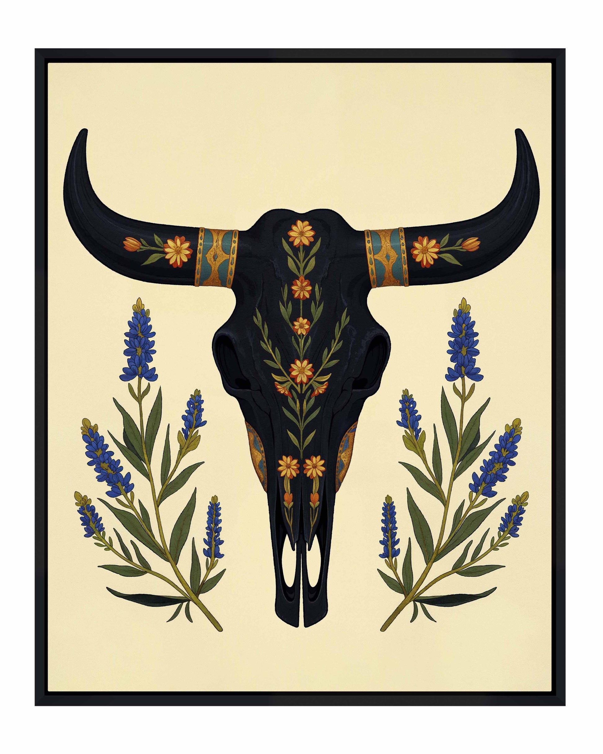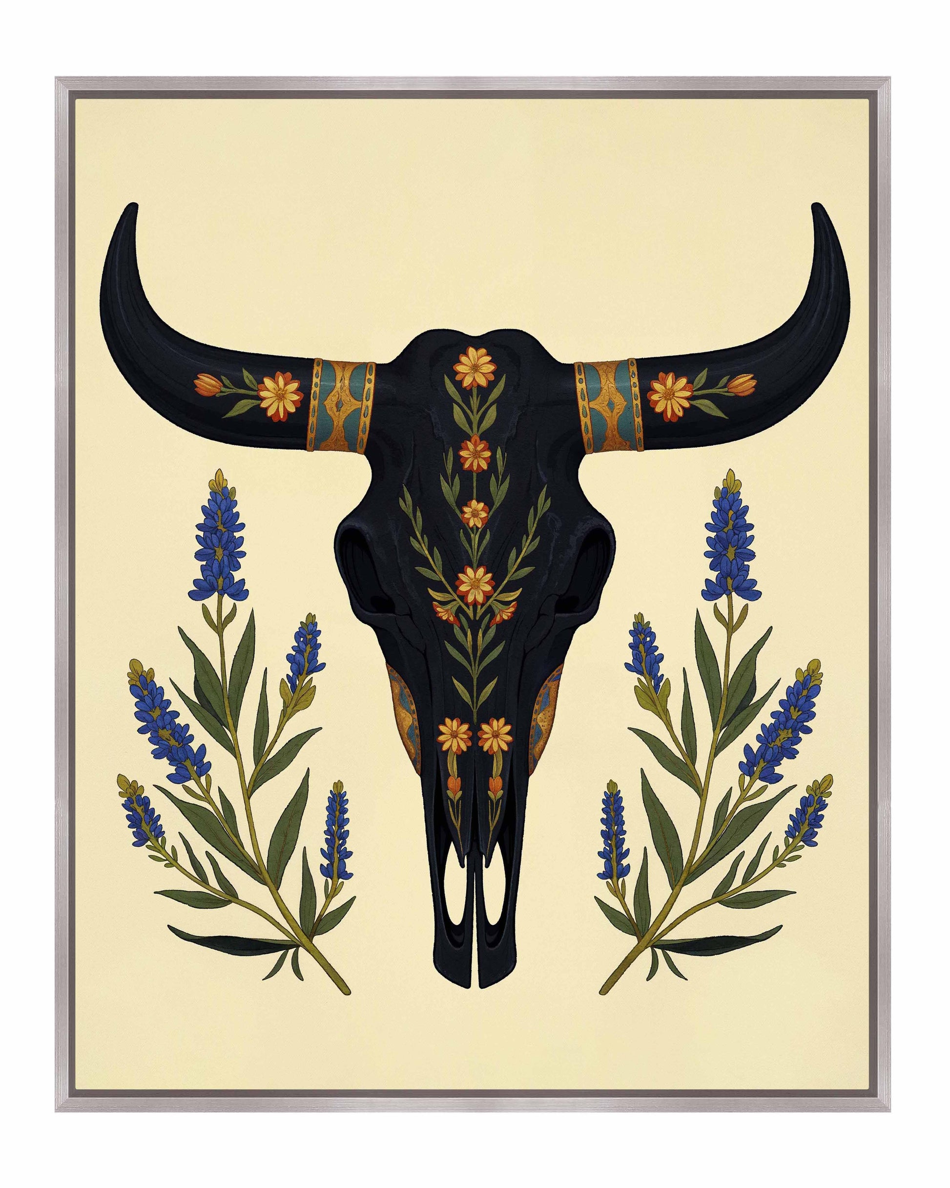 "Lone Star Lament" is a striking piece that marries elements of natural beauty with the poignant symbolism of a lone bull skull. The central figure is a stylized, black bull skull, detailed with intricate floral and geometric patterns that are reminiscent of Southwestern and indigenous designs. The skull is adorned with bright yellow and orange flowers, adding a touch of life and color to an otherwise somber symbol of mortality.