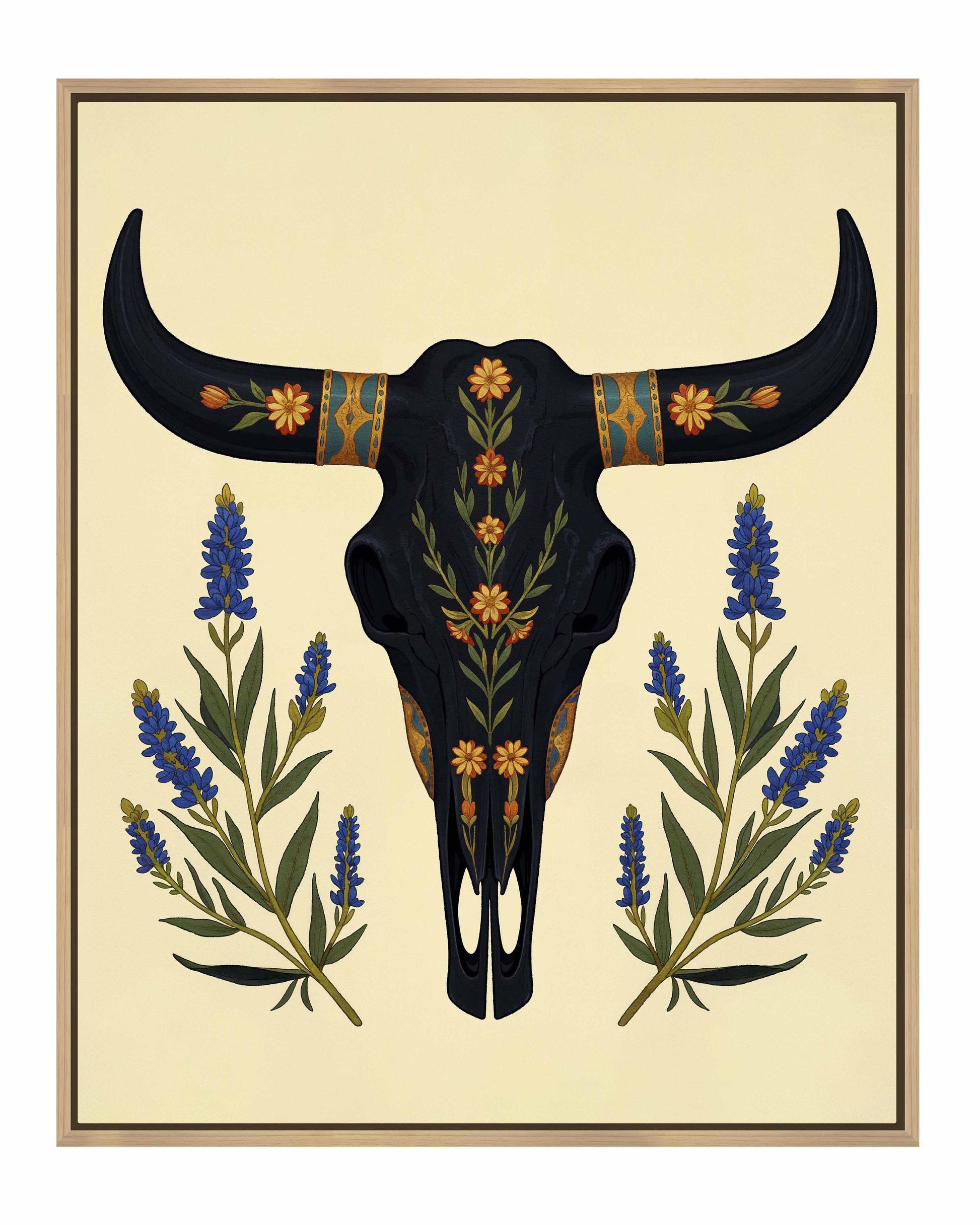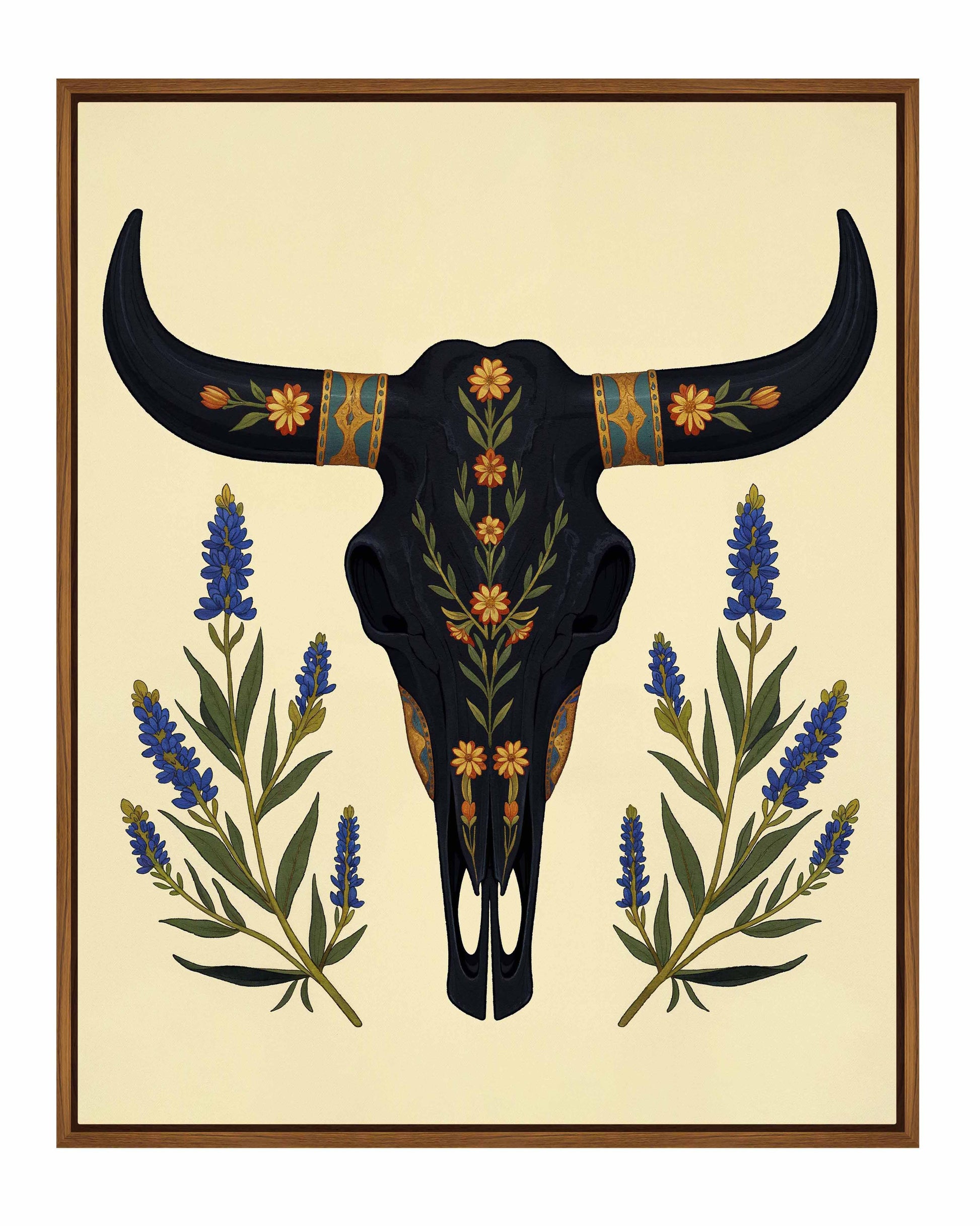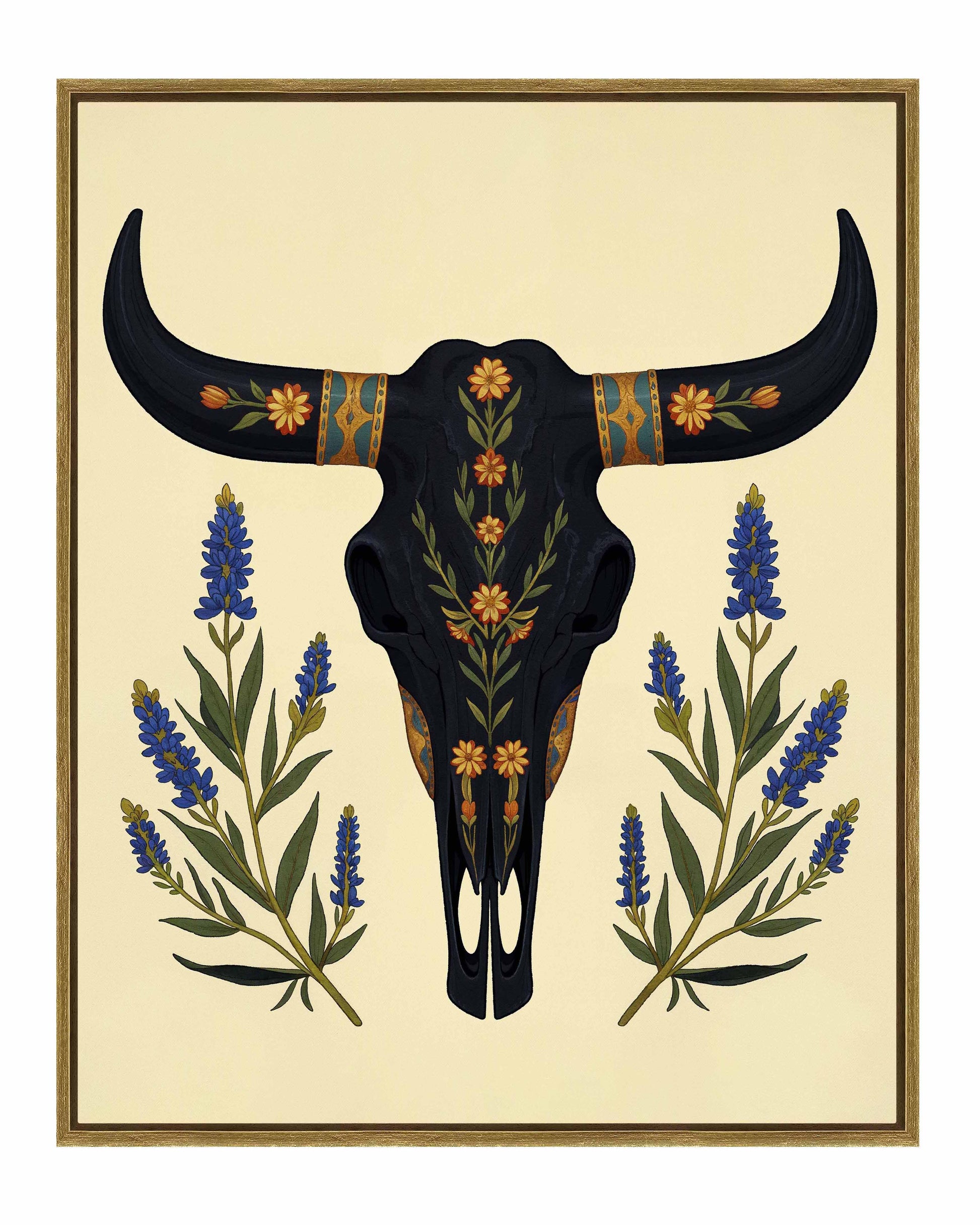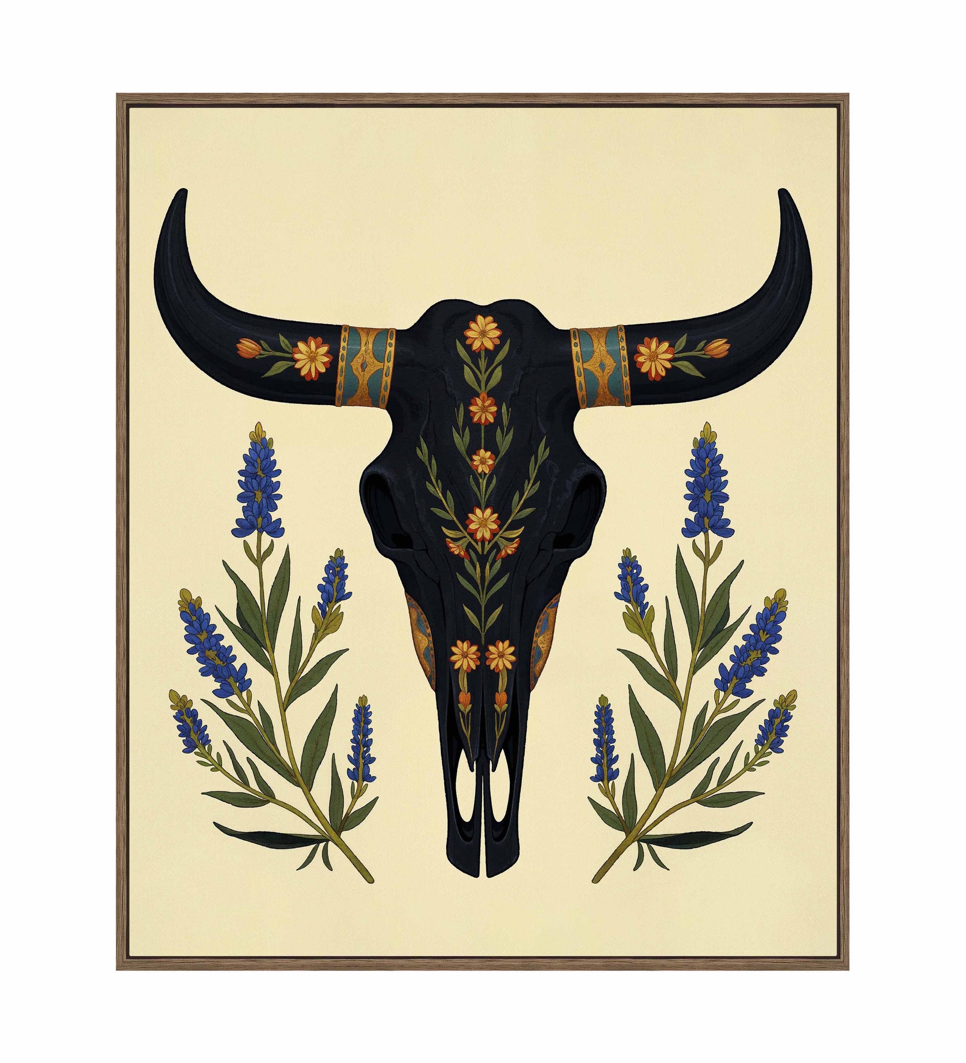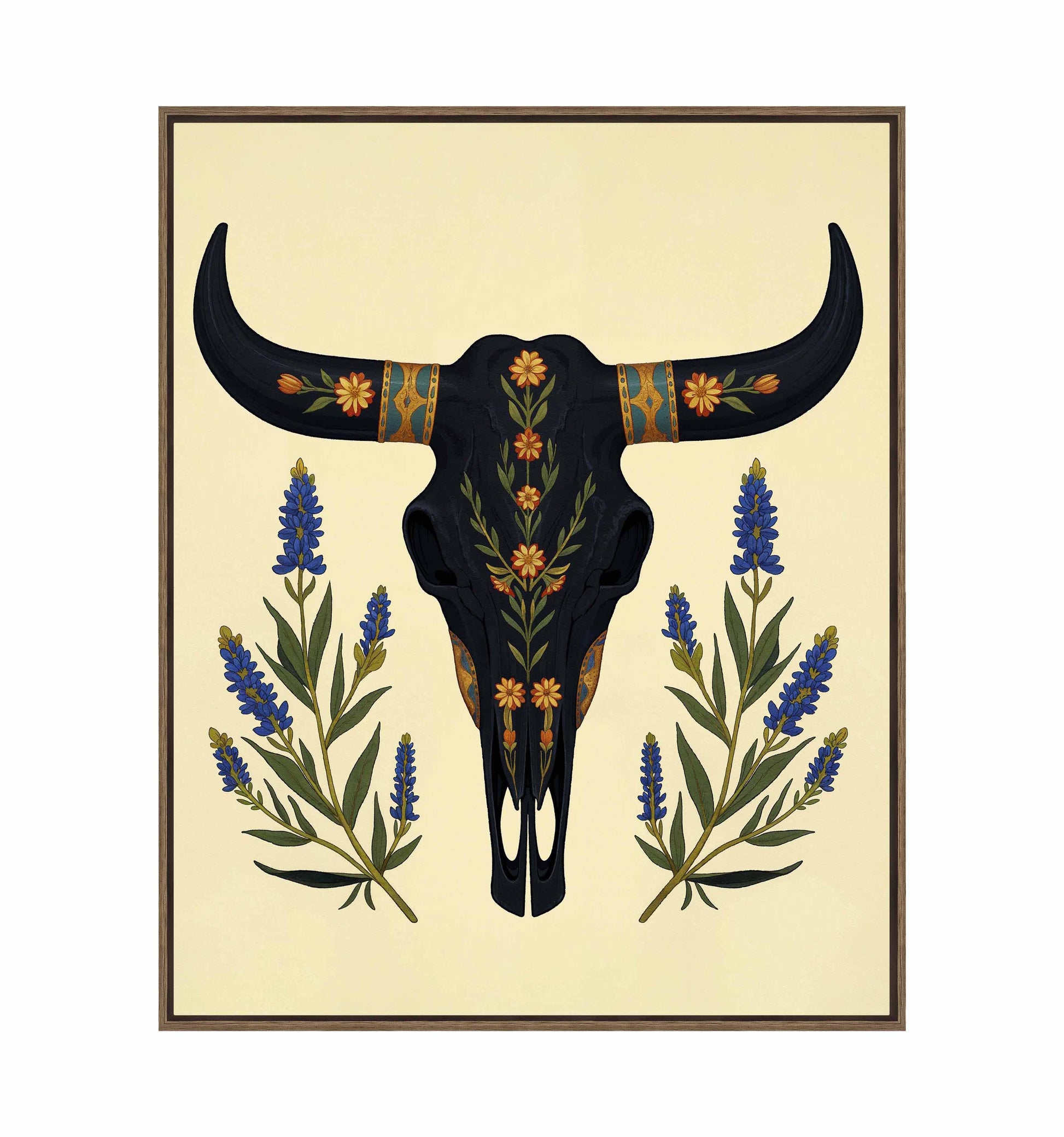 "Lone Star Lament" is a striking piece that marries elements of natural beauty with the poignant symbolism of a lone bull skull. The central figure is a stylized, black bull skull, detailed with intricate floral and geometric patterns that are reminiscent of Southwestern and indigenous designs. The skull is adorned with bright yellow and orange flowers, adding a touch of life and color to an otherwise somber symbol of mortality.