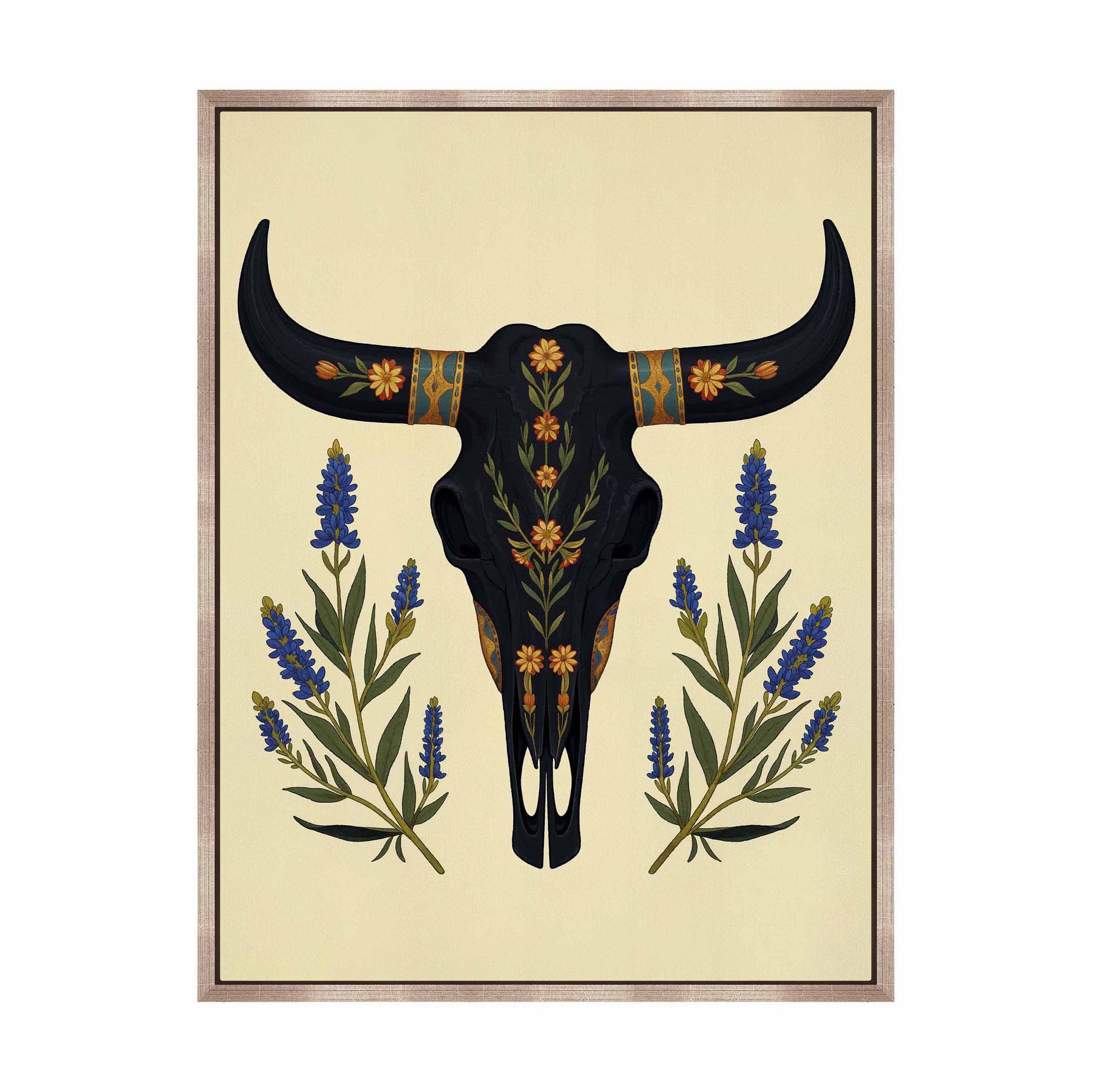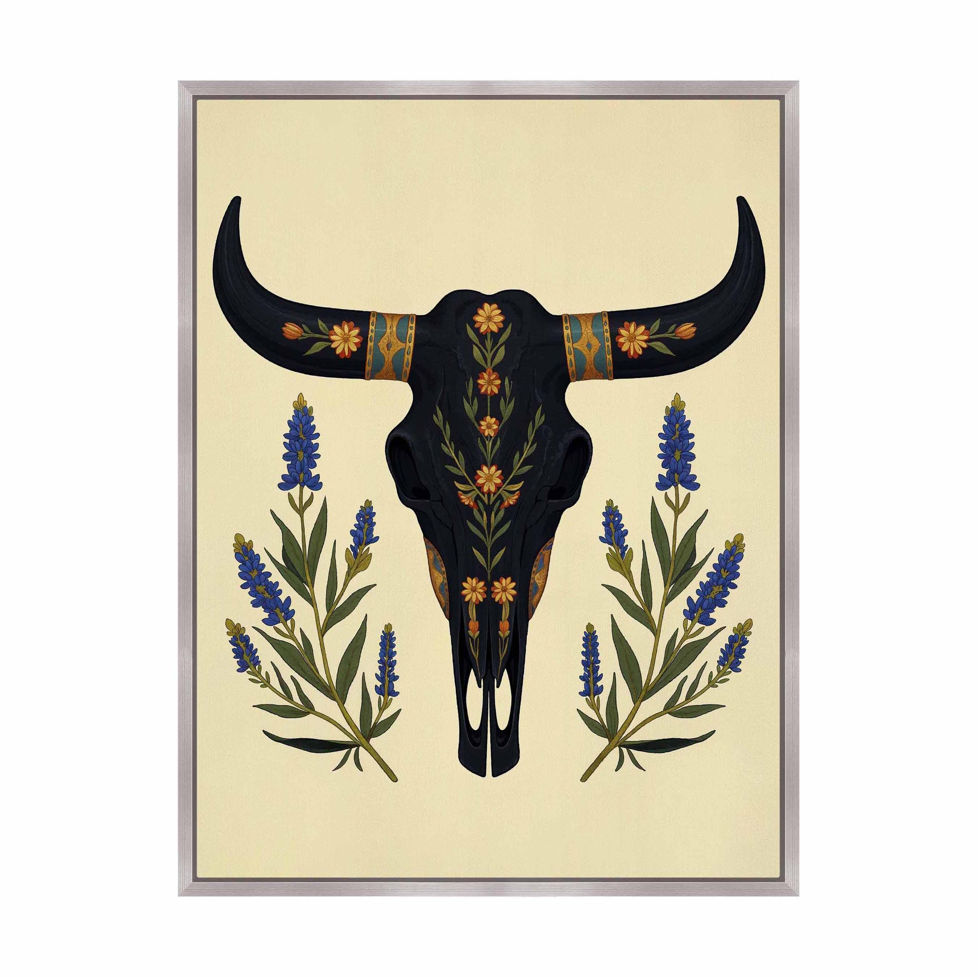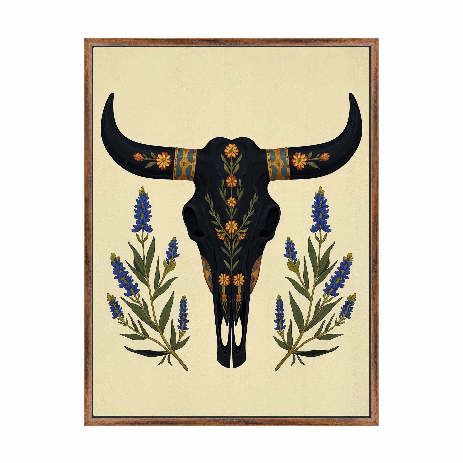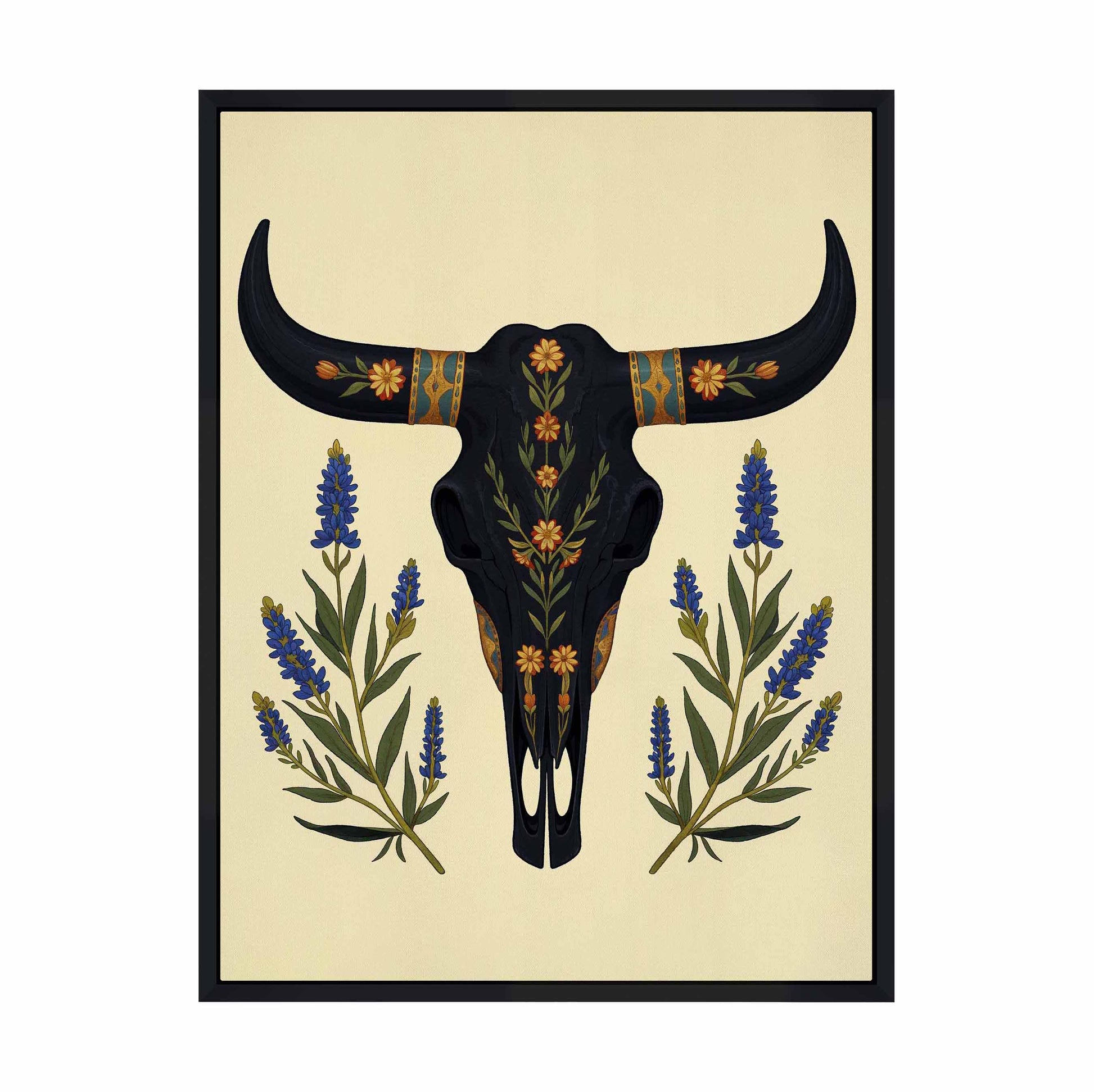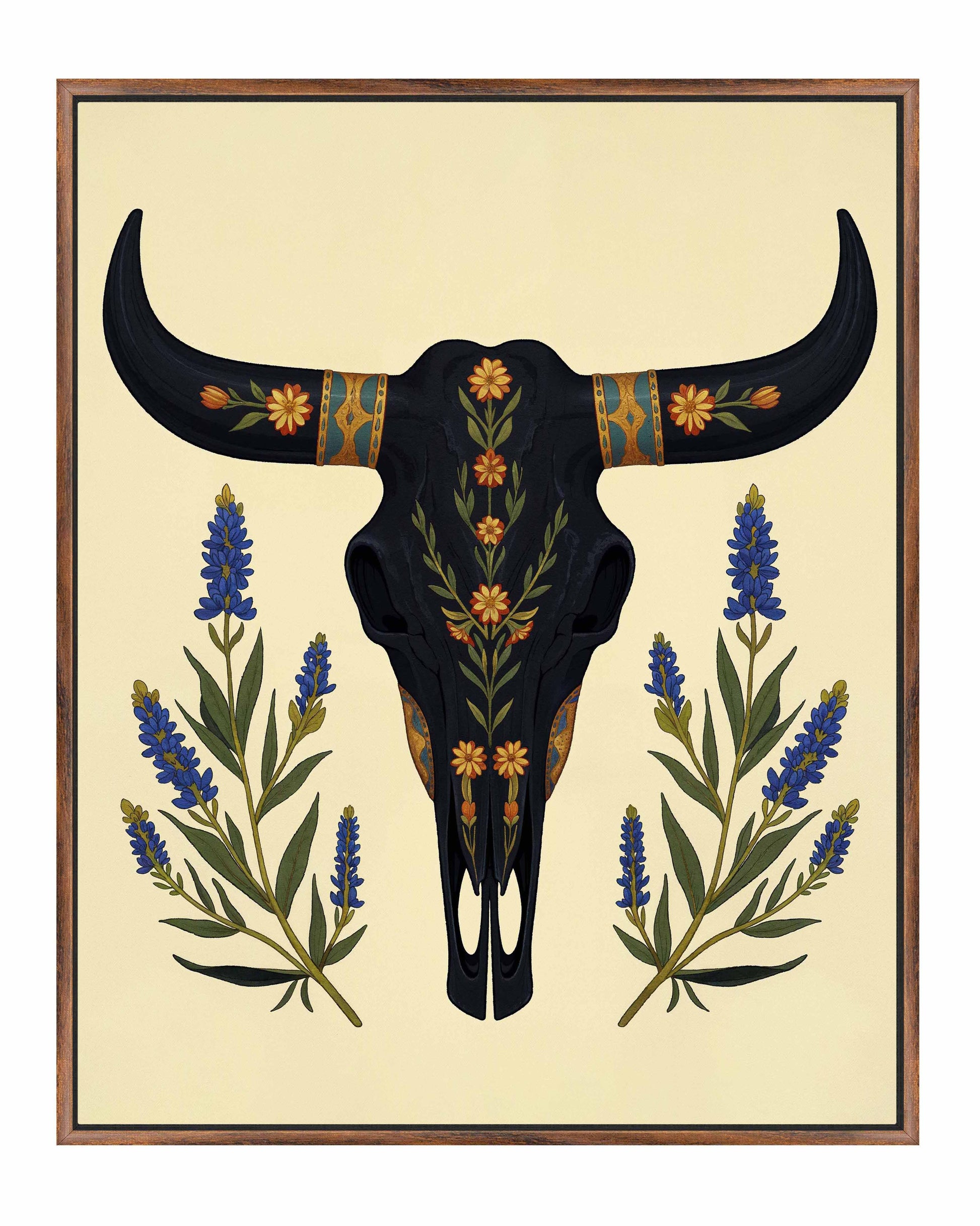 "Lone Star Lament" is a striking piece that marries elements of natural beauty with the poignant symbolism of a lone bull skull. The central figure is a stylized, black bull skull, detailed with intricate floral and geometric patterns that are reminiscent of Southwestern and indigenous designs. The skull is adorned with bright yellow and orange flowers, adding a touch of life and color to an otherwise somber symbol of mortality.