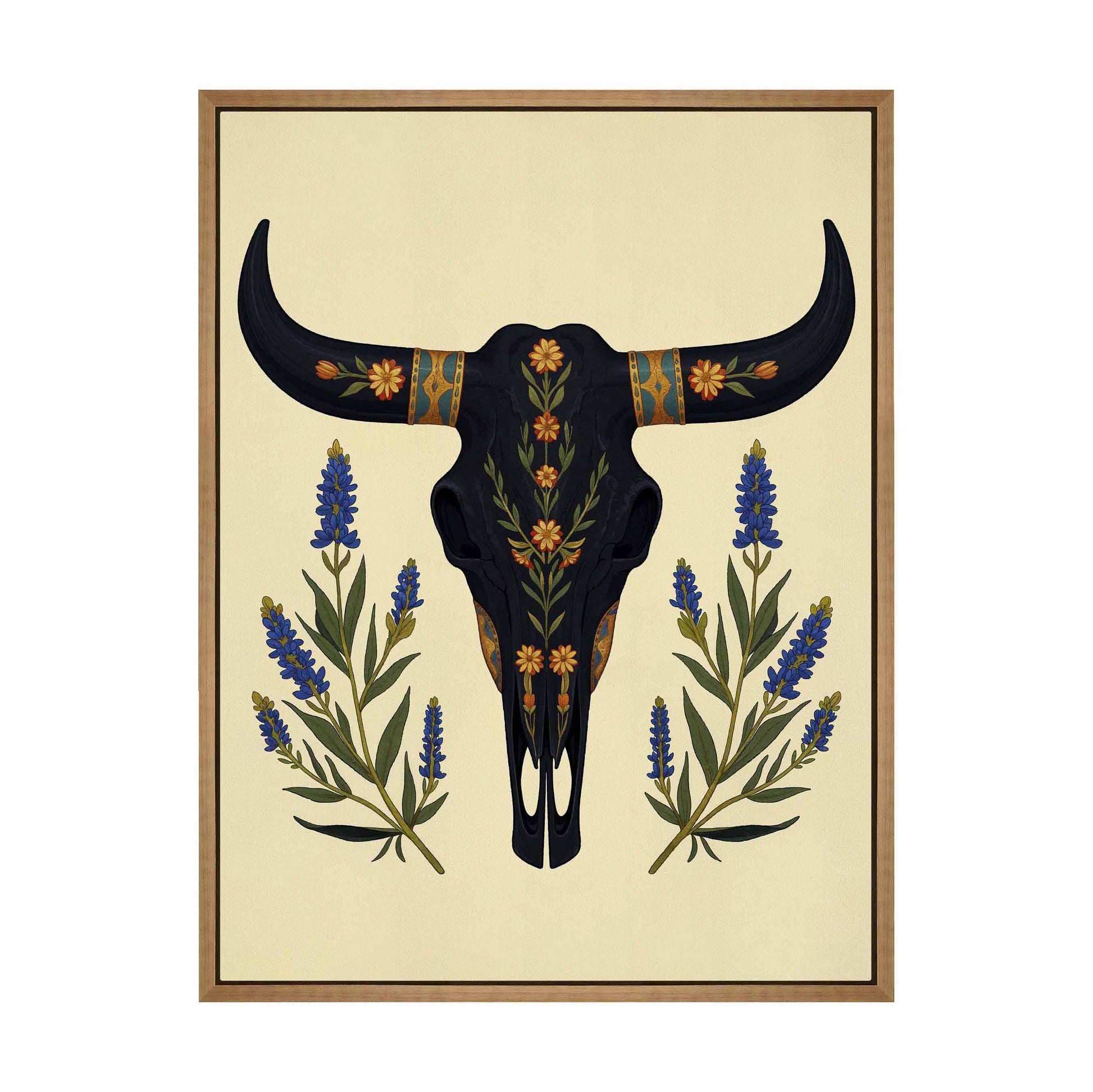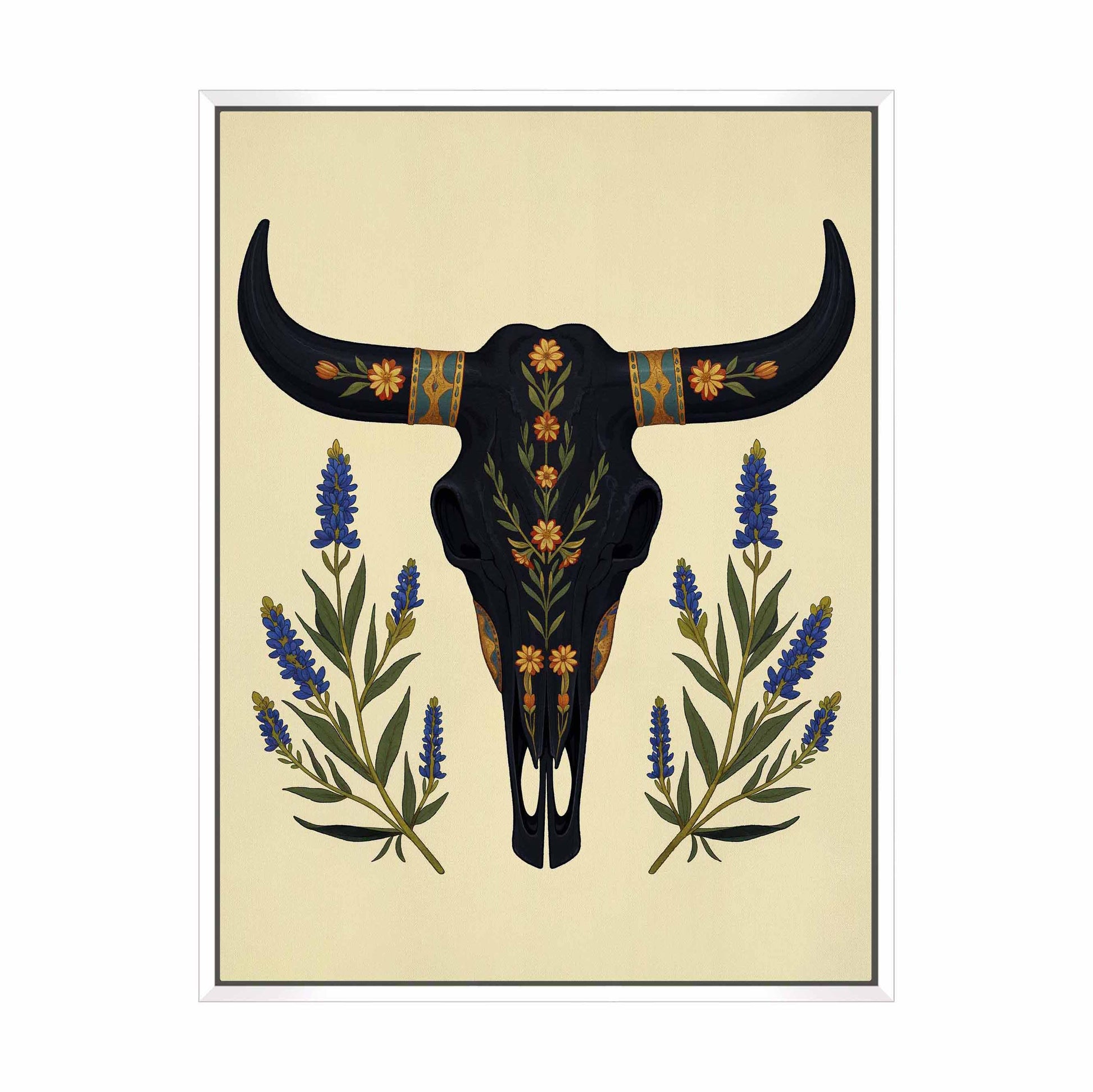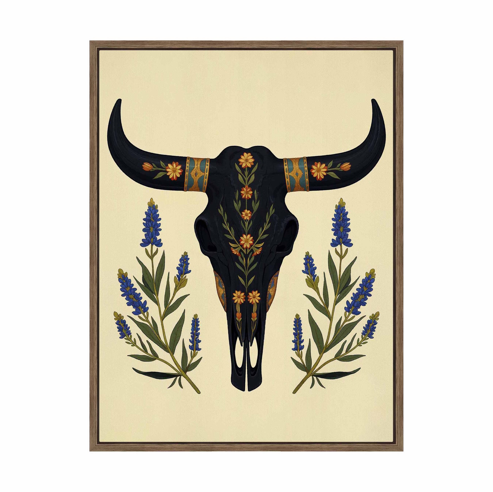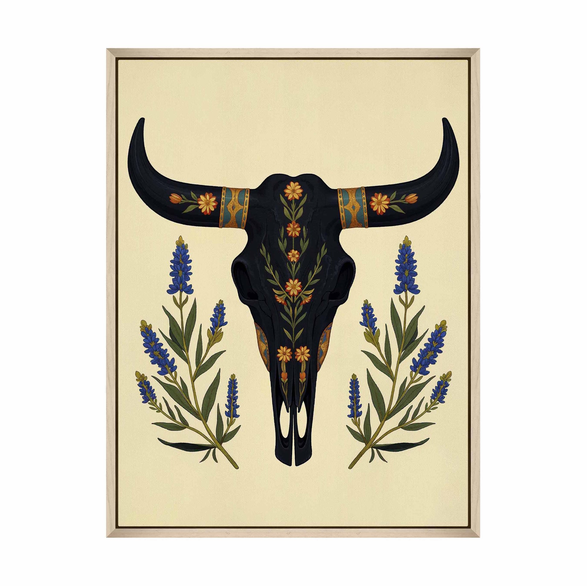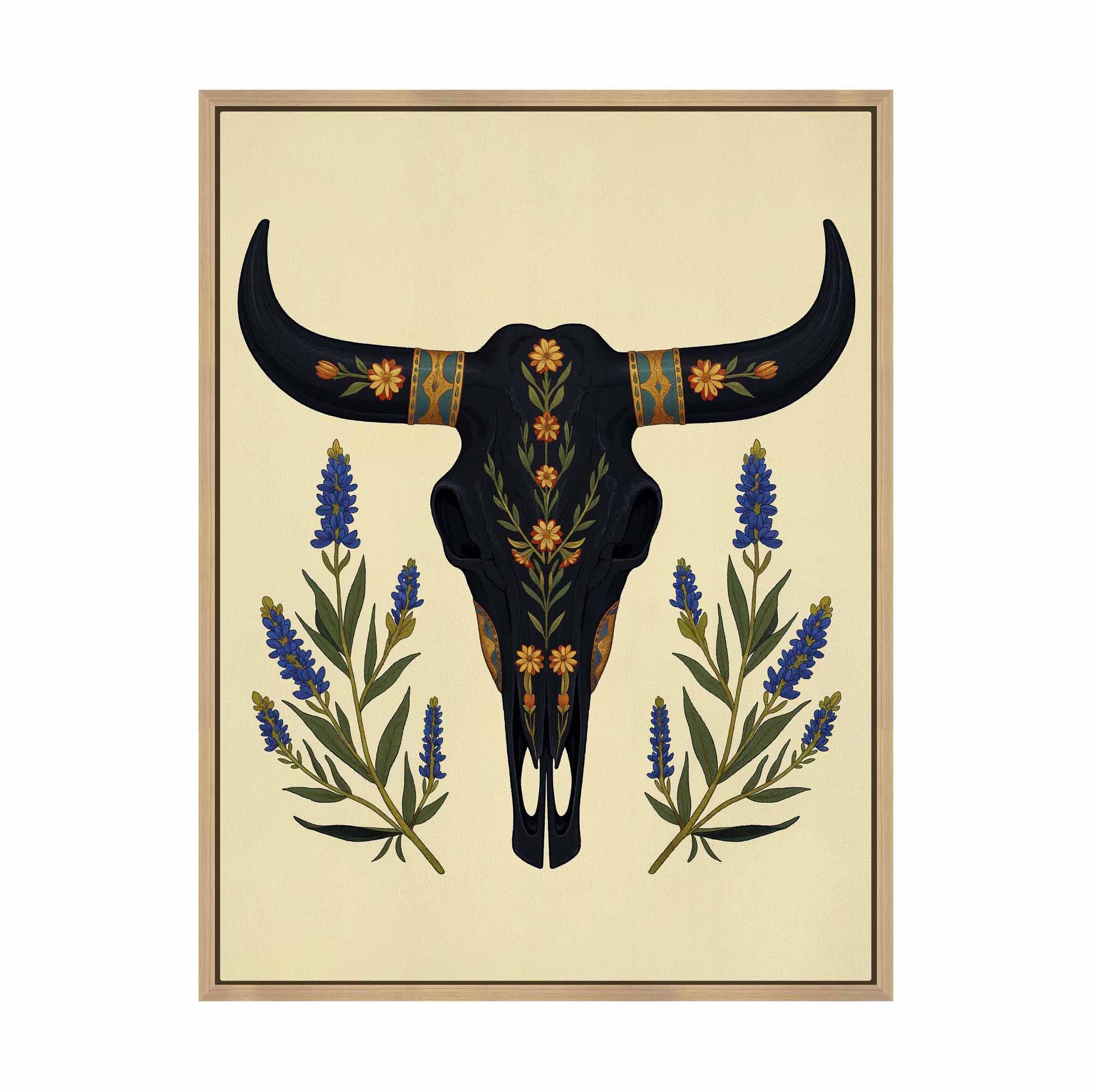 "Lone Star Lament" is a striking piece that marries elements of natural beauty with the poignant symbolism of a lone bull skull. The central figure is a stylized, black bull skull, detailed with intricate floral and geometric patterns that are reminiscent of Southwestern and indigenous designs. The skull is adorned with bright yellow and orange flowers, adding a touch of life and color to an otherwise somber symbol of mortality.