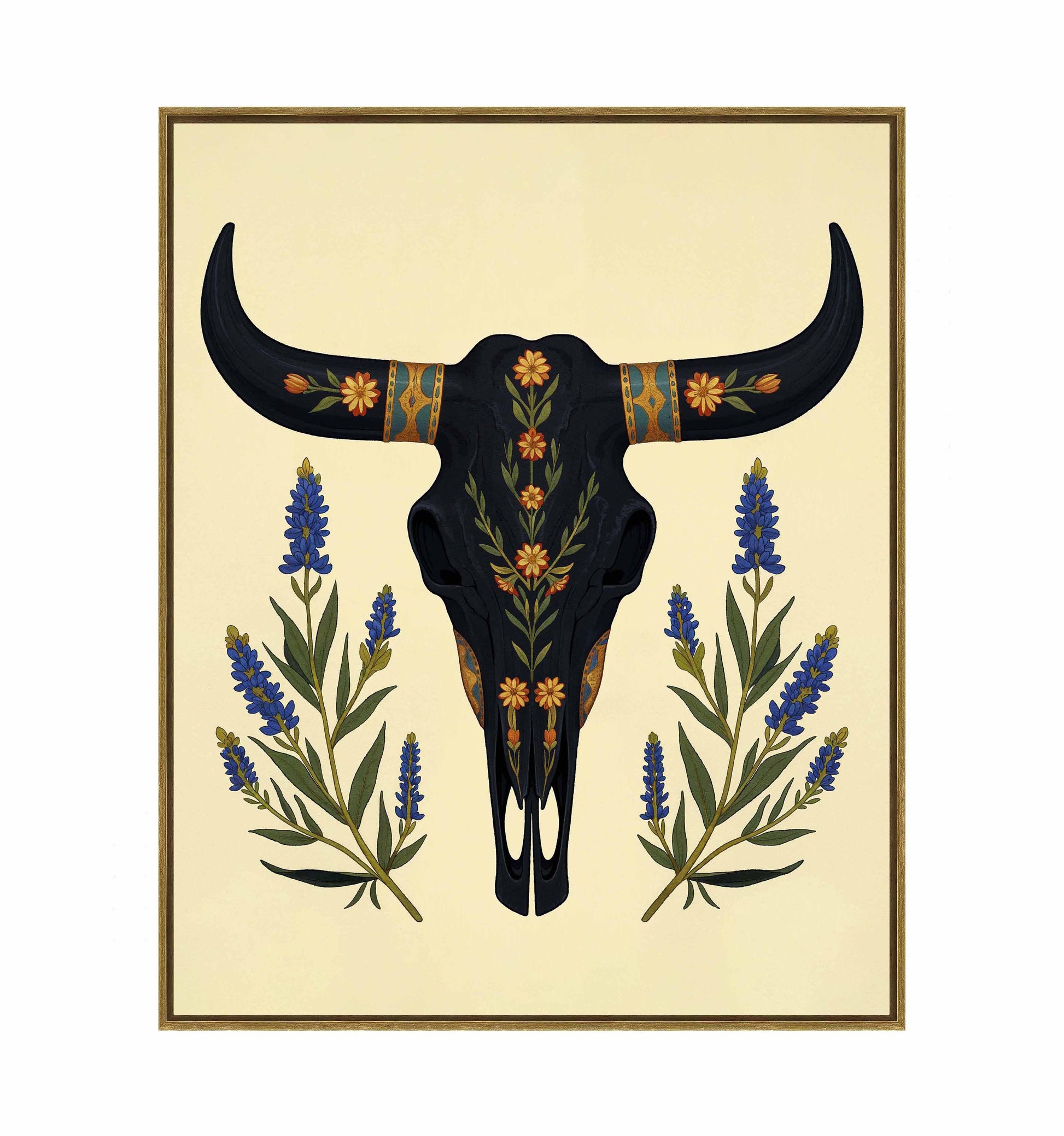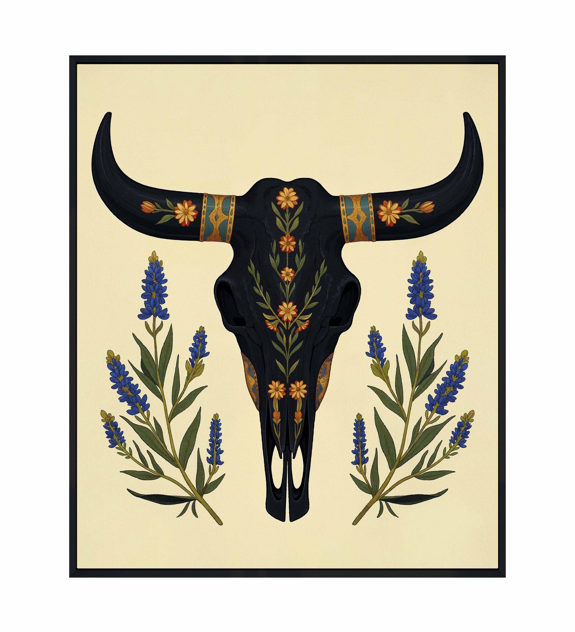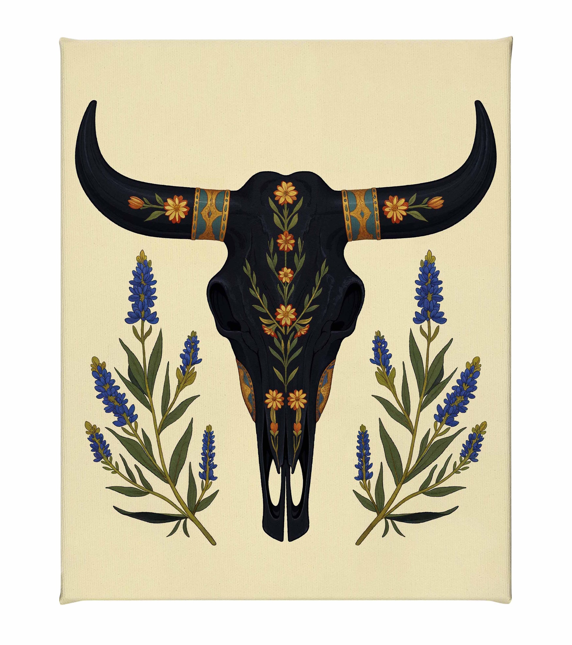 On either side of the skull, tall stalks of blue flowers, possibly Texas bluebonnets, rise with elegance, their delicate petals providing a visual contrast to the dark, bold lines of the skull. These flowers are an homage to the state flower of Texas, further anchoring the piece in a specific cultural and geographical context.