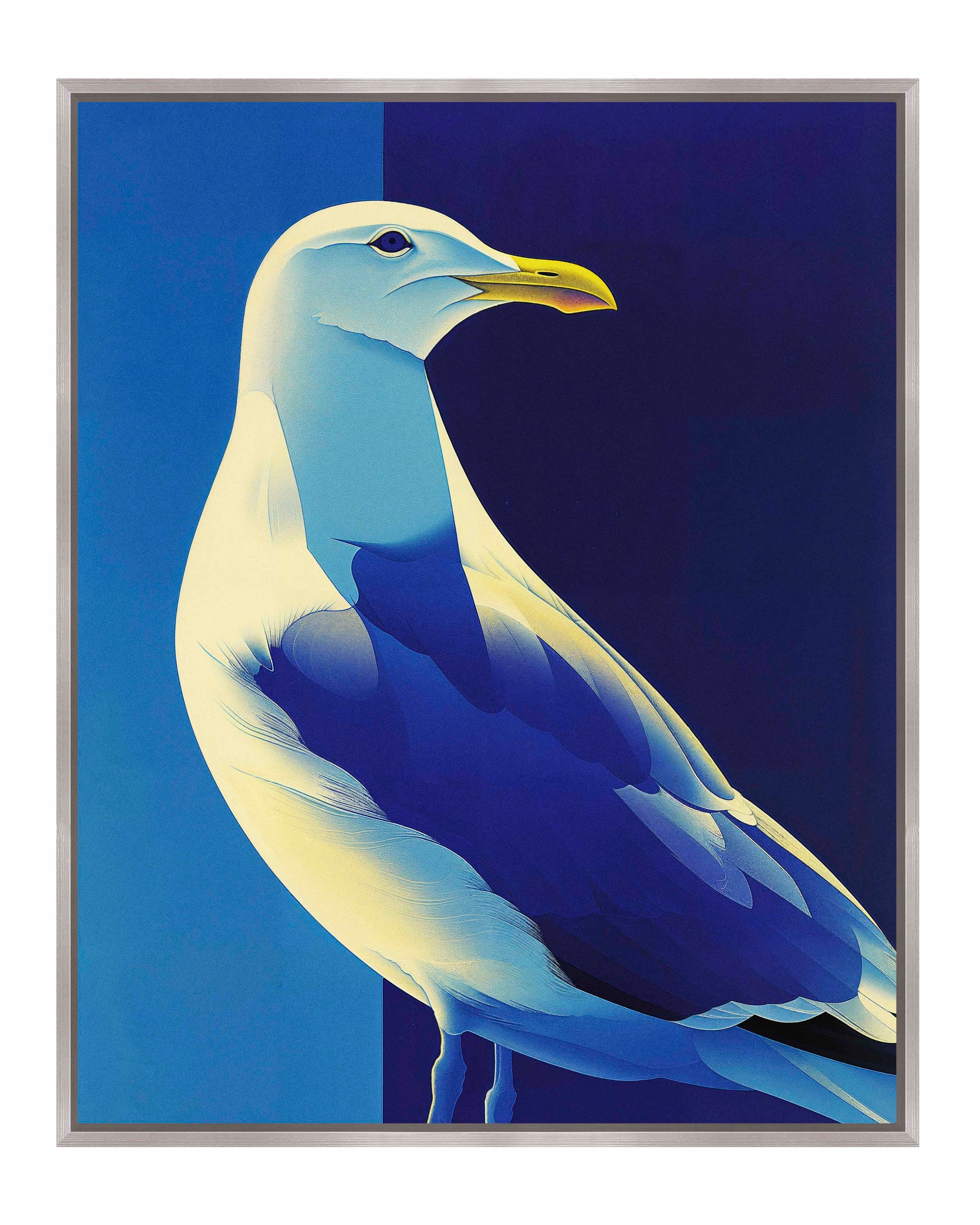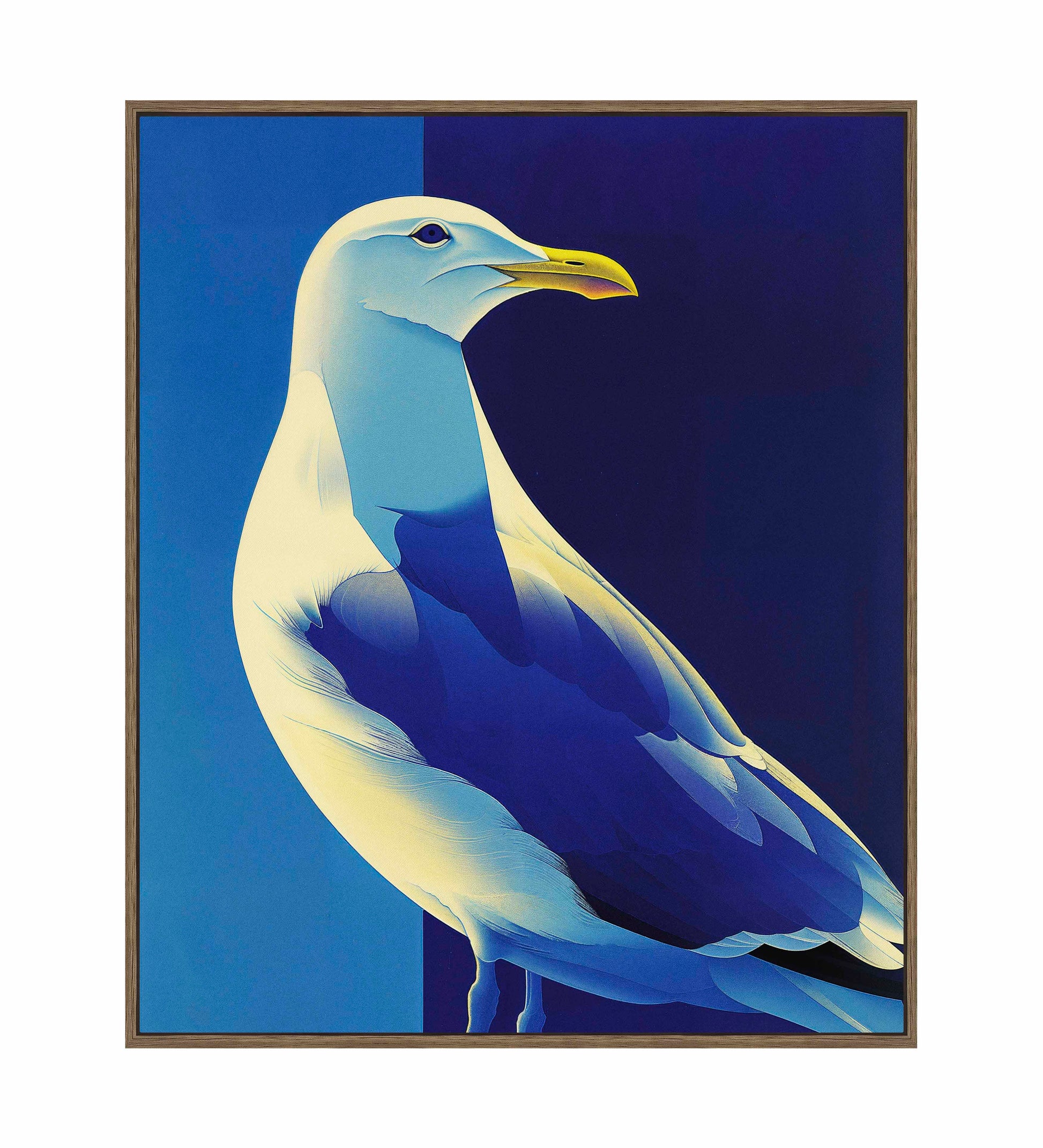 The artist's use of rich, saturated colors and soft gradients brings a sense of depth and tranquility to the composition. The seagull, with its poised stance and sharp, yellow beak, stands out vividly against the deep blue background, emphasizing its graceful and commanding presence. The minimalist approach to the background further enhances the focus on the seagull, allowing its elegant form to dominate the scene.