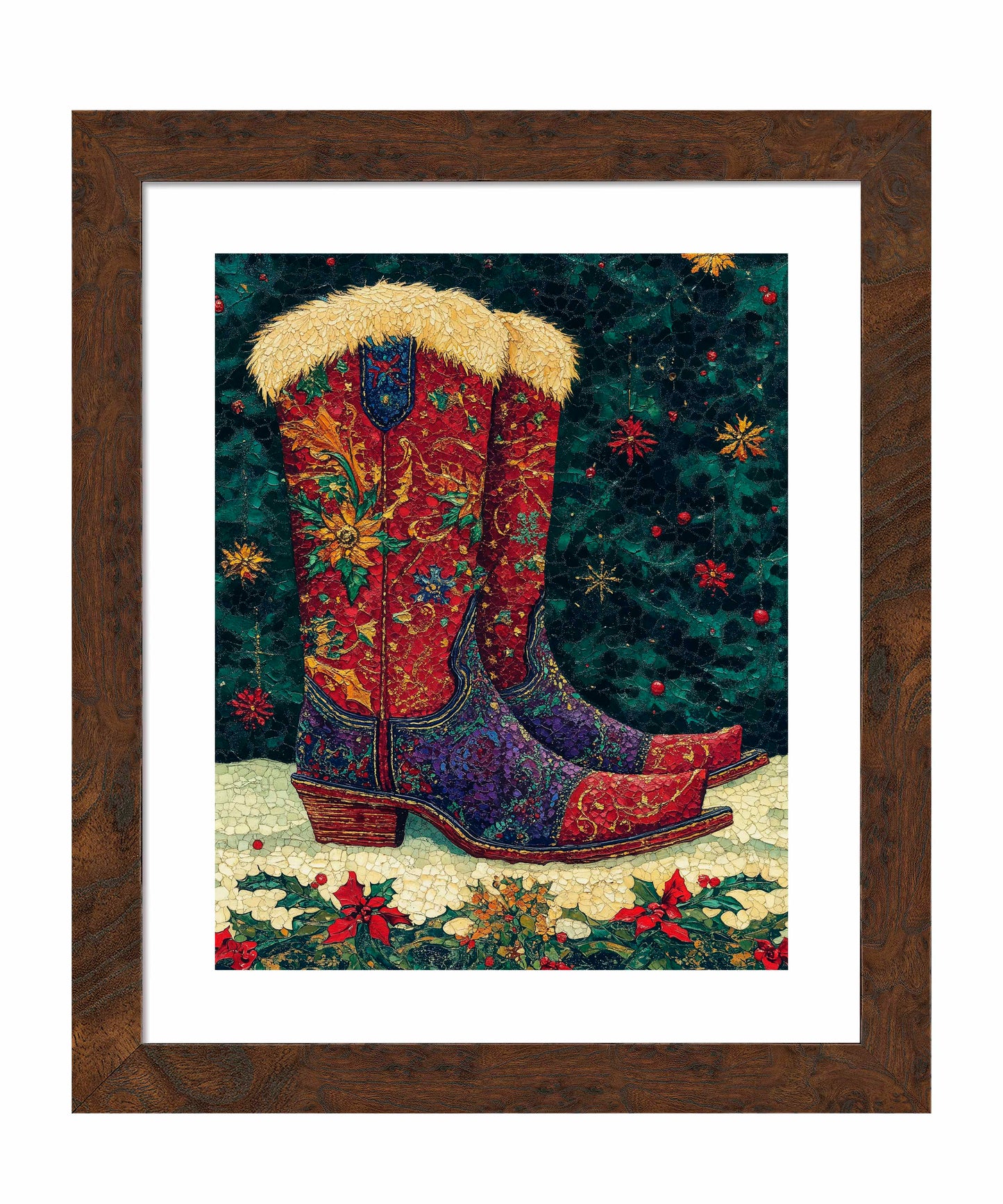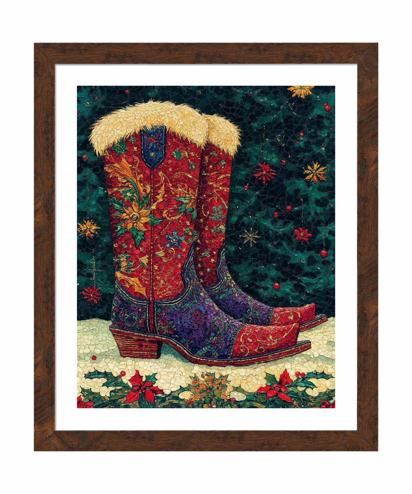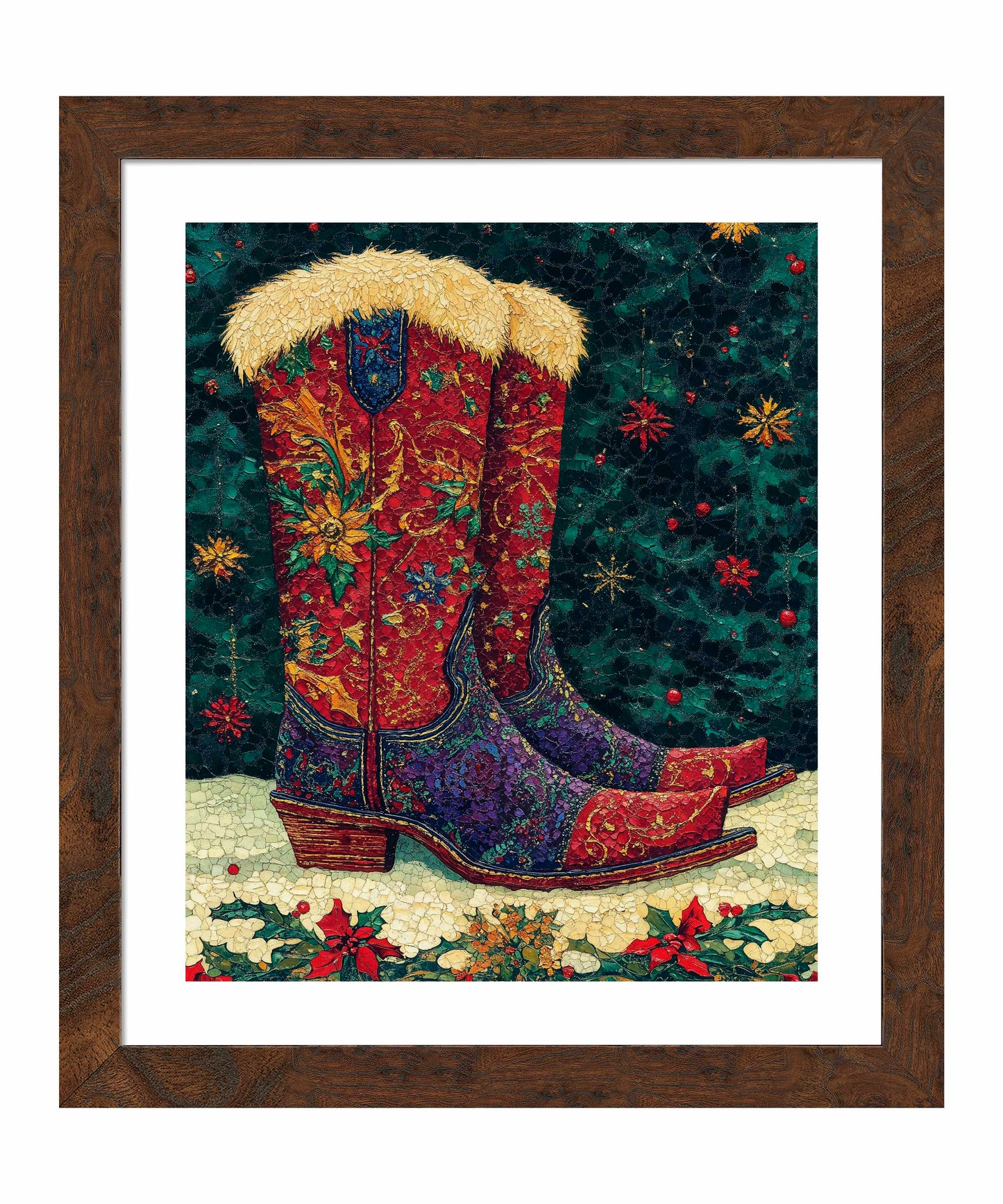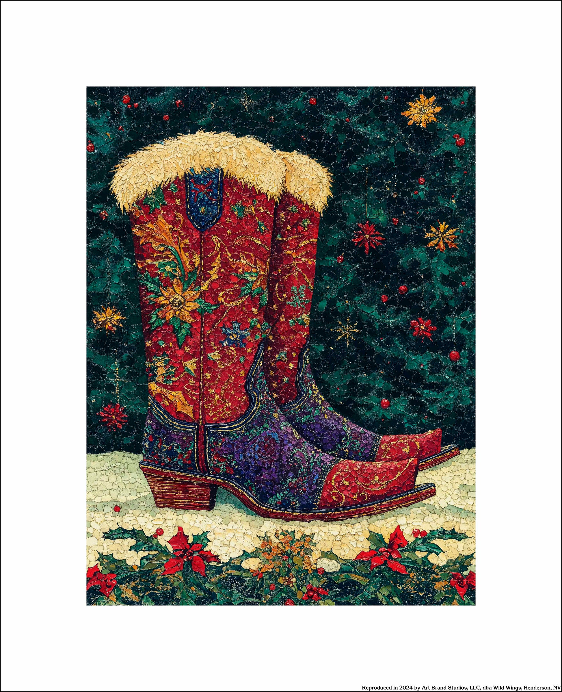 "Merry Trails to You" presents a festive and uniquely Western take on holiday imagery. The artwork features a pair of intricately decorated cowboy boots as its centerpiece, set against a deep green background reminiscent of a starry night sky. These boots are a riot of color and pattern, with rich reds, purples, and golds swirling in floral and paisley designs across their surface. The boots are topped with plush, golden fur trim, adding a touch of warmth and luxury. The artist's attention to detail is evident in the intricate stitching patterns and the textured appearance of the leather.