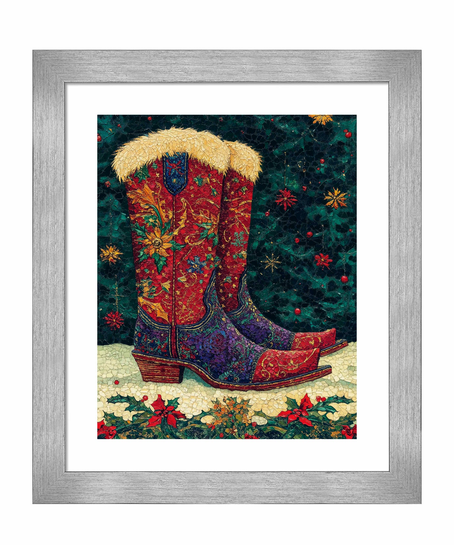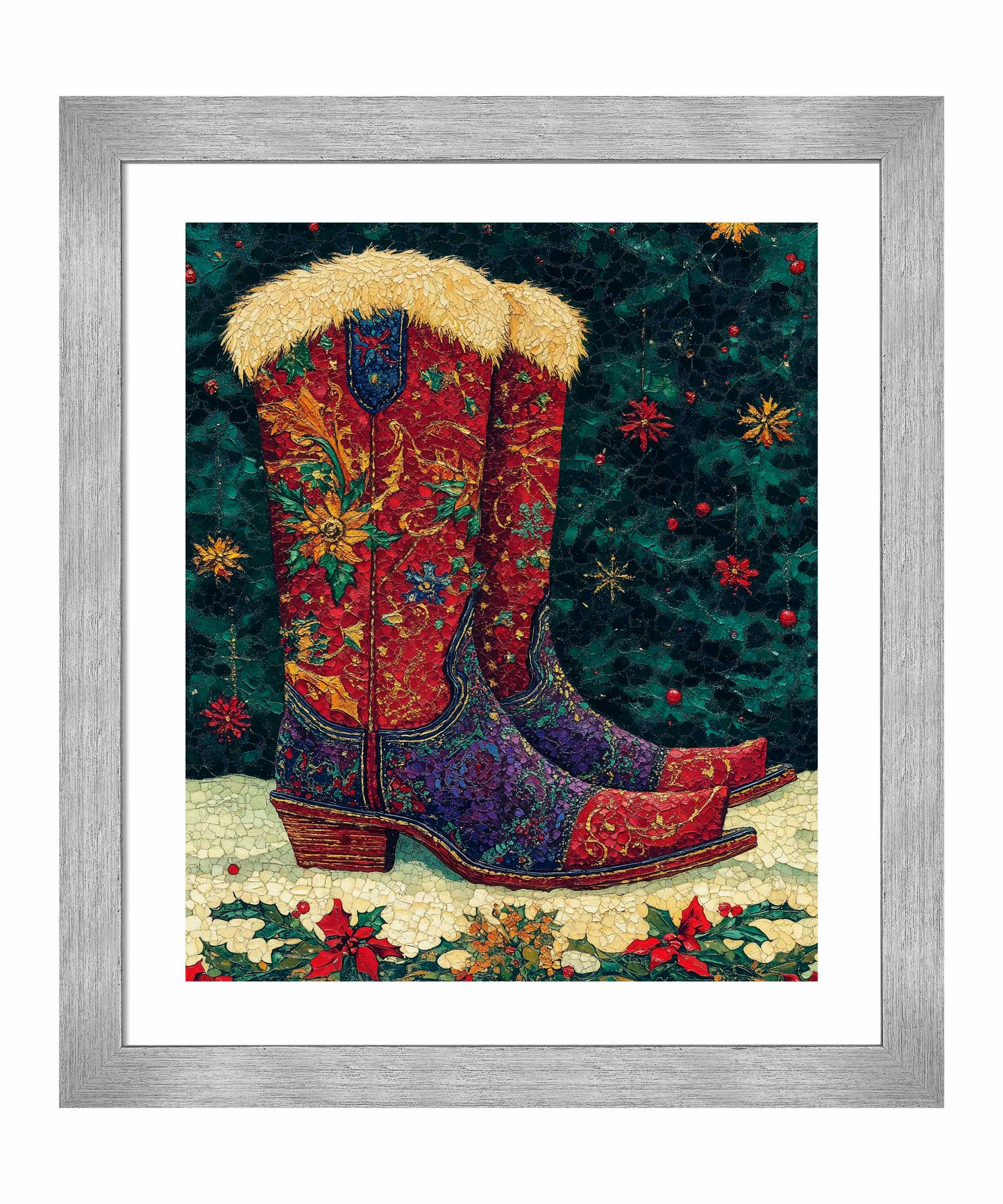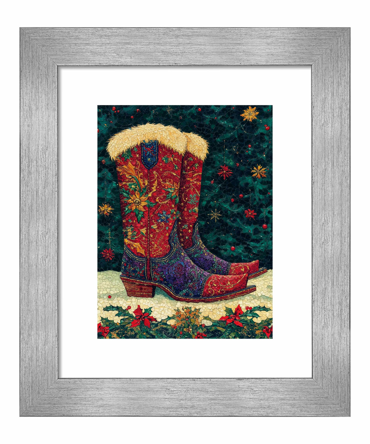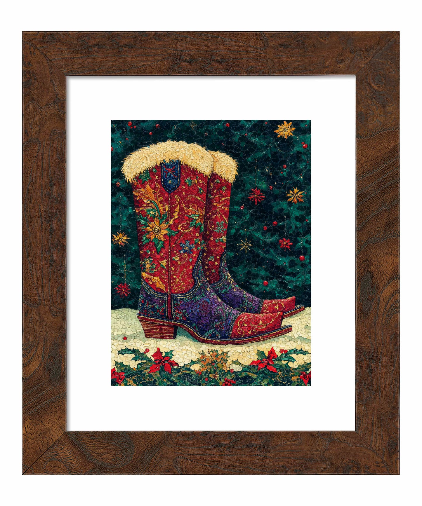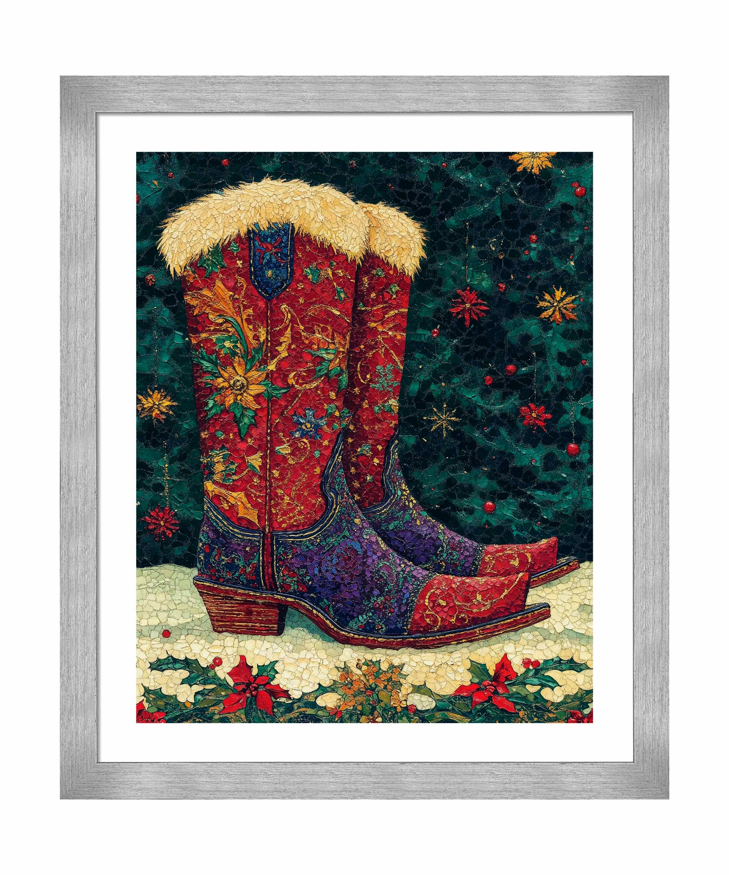 "Merry Trails to You" presents a festive and uniquely Western take on holiday imagery. The artwork features a pair of intricately decorated cowboy boots as its centerpiece, set against a deep green background reminiscent of a starry night sky. These boots are a riot of color and pattern, with rich reds, purples, and golds swirling in floral and paisley designs across their surface. The boots are topped with plush, golden fur trim, adding a touch of warmth and luxury. The artist's attention to detail is evident in the intricate stitching patterns and the textured appearance of the leather.