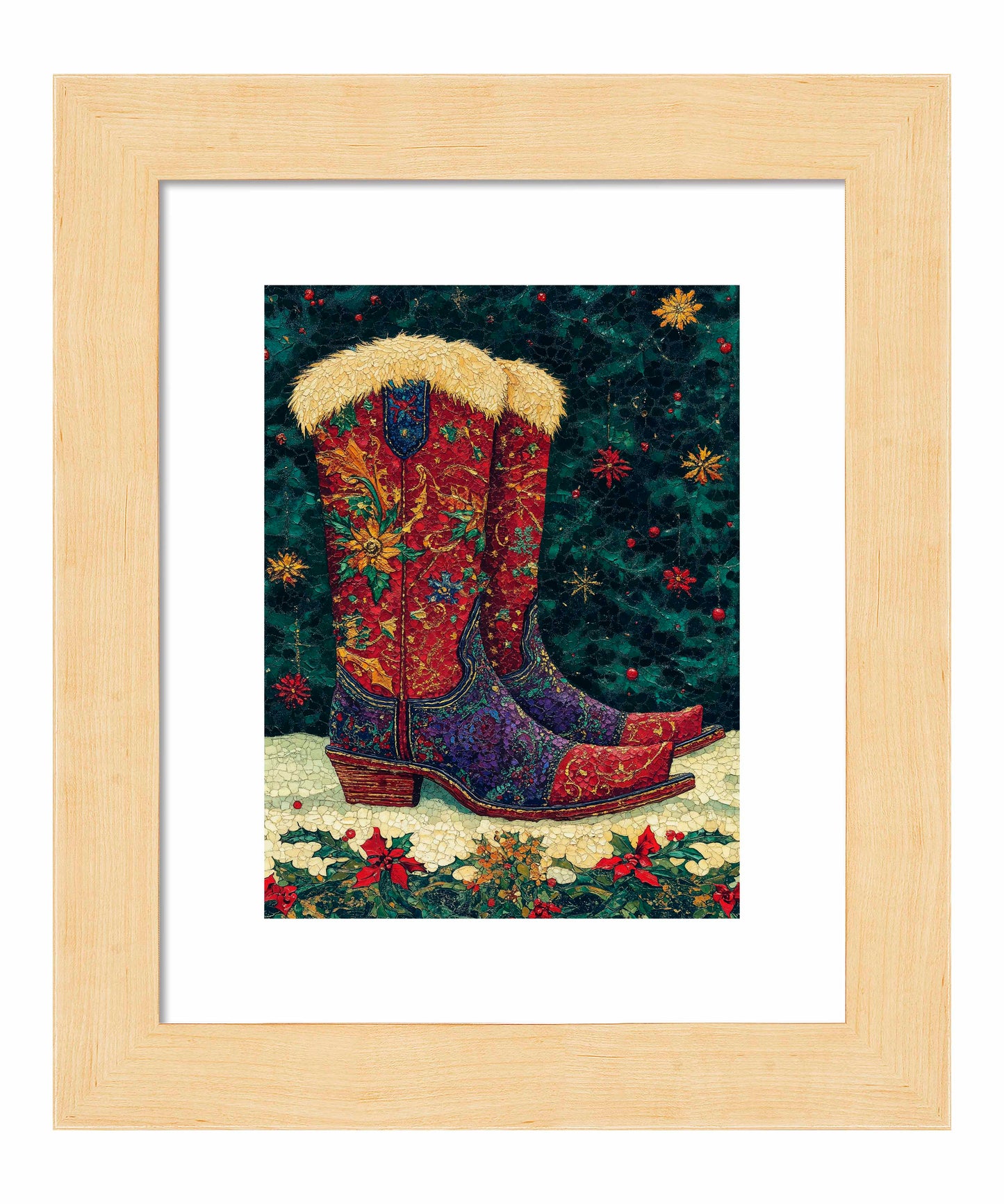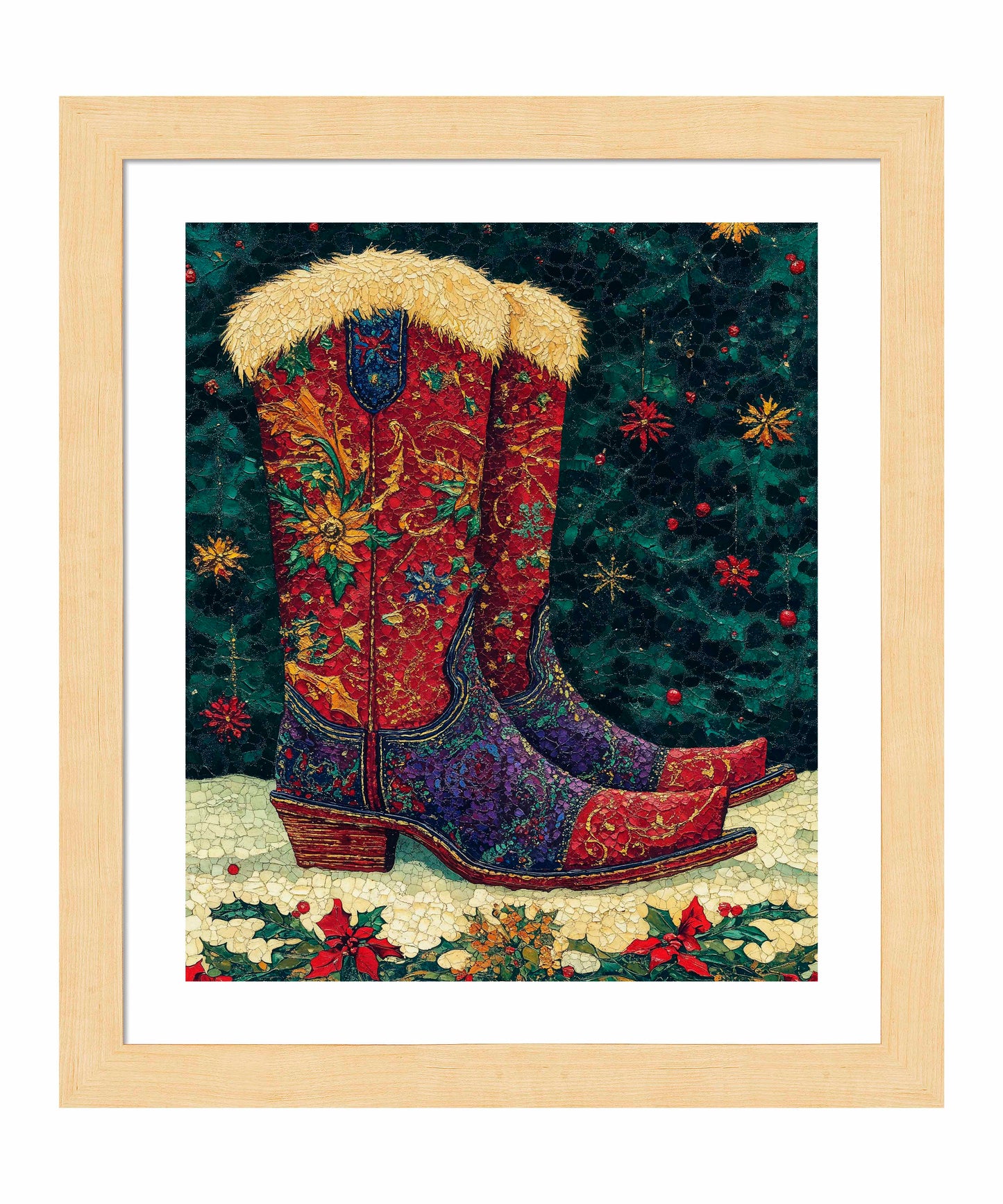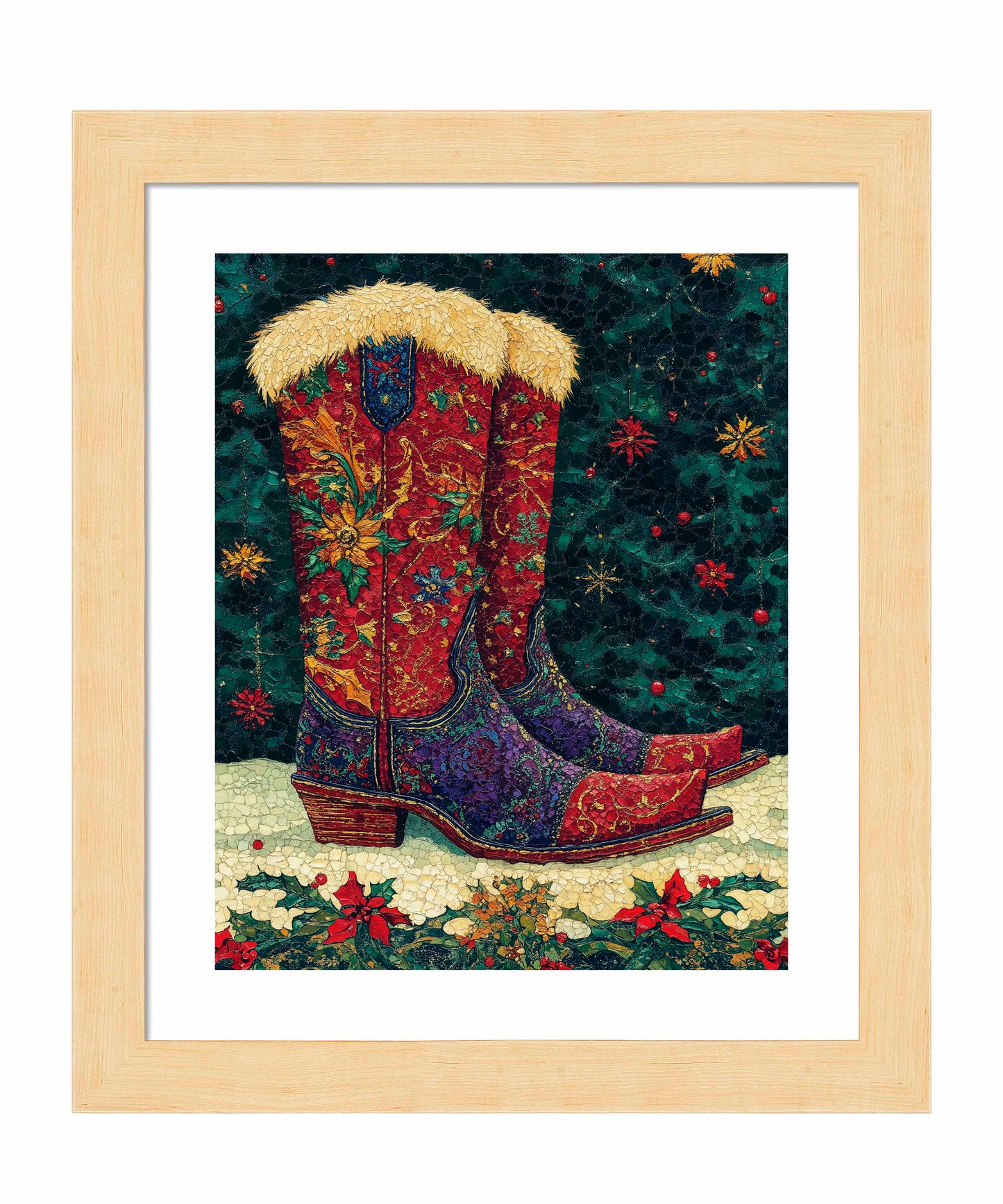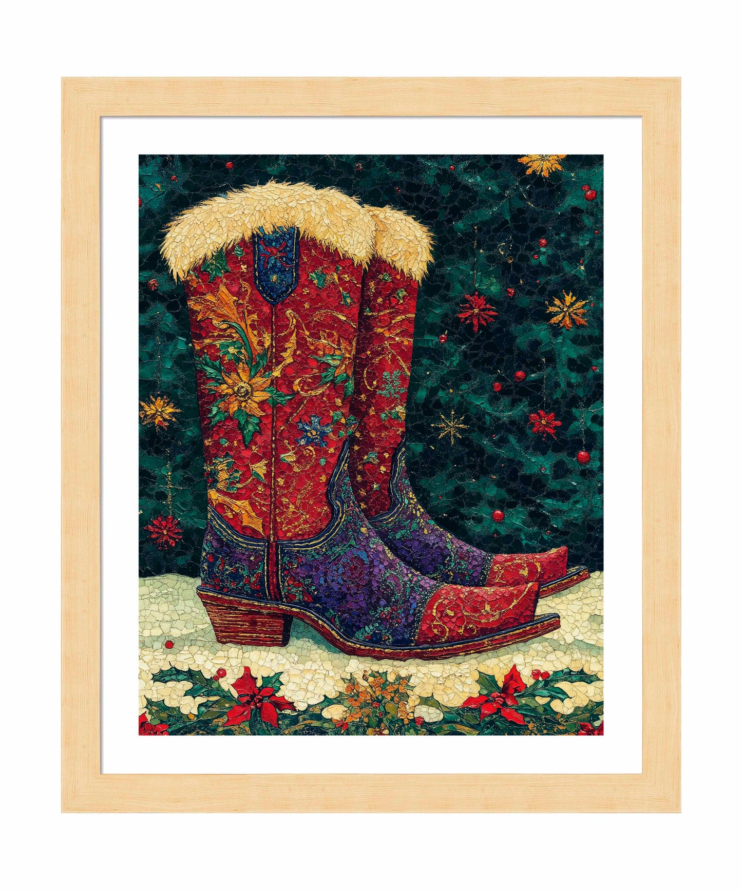 "Merry Trails to You" presents a festive and uniquely Western take on holiday imagery. The artwork features a pair of intricately decorated cowboy boots as its centerpiece, set against a deep green background reminiscent of a starry night sky. These boots are a riot of color and pattern, with rich reds, purples, and golds swirling in floral and paisley designs across their surface. The boots are topped with plush, golden fur trim, adding a touch of warmth and luxury. The artist's attention to detail is evident in the intricate stitching patterns and the textured appearance of the leather.