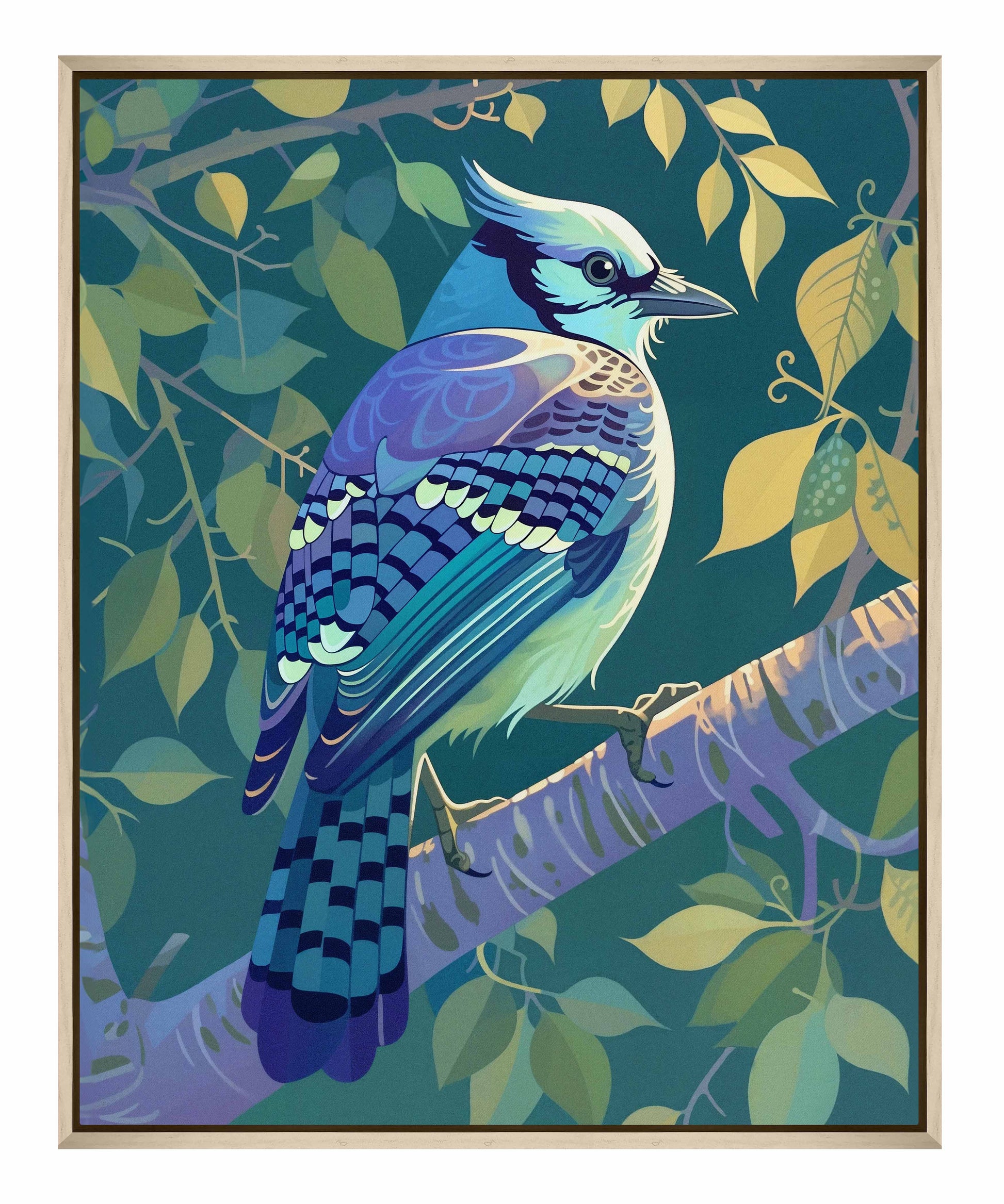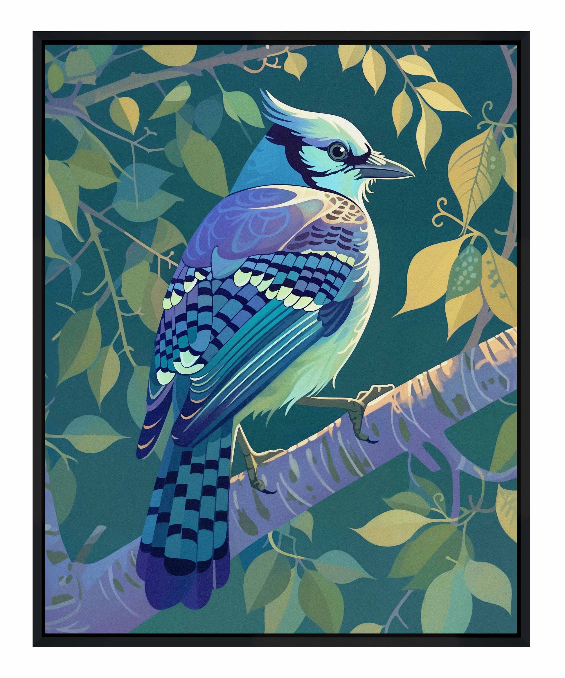 The artist's use of a rich, saturated color palette and dynamic lighting creates a sense of depth within the foliage. The interplay of light and shadow enhances the overall composition, making the Blue Jay the focal point against the varied shades of green and hints of yellow. The intricate patterns and bold colors draw the viewer's eye, adding a sense of vibrancy and natural beauty to the scene.