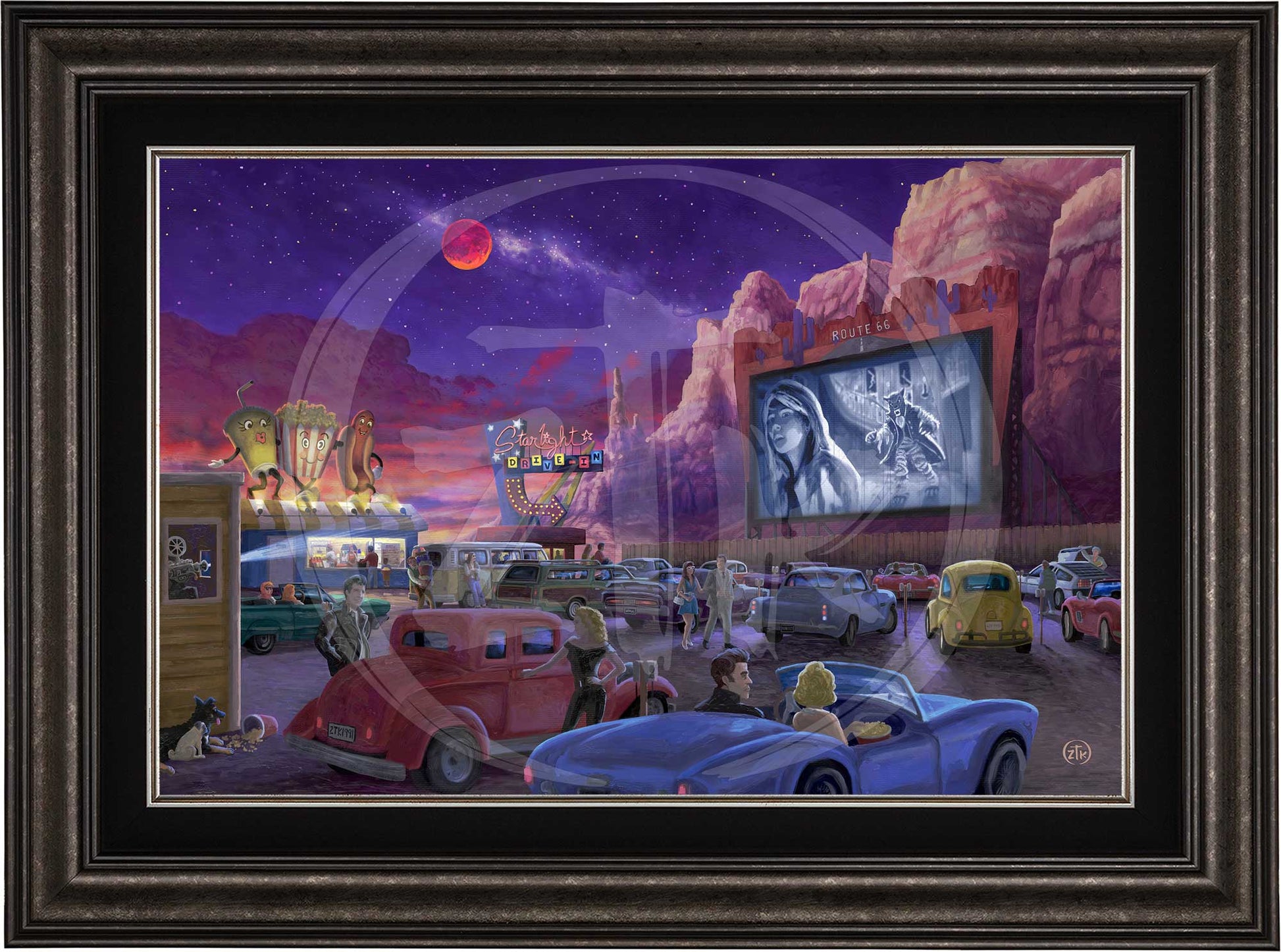Welcome back to America’s Main Street and one of this country’s great motoring traditions! As I continue to get my kicks on Route 66, I wanted to explore the fun and nostalgia for the drive-in movie. My father always tells stories of the Se Rancho drive-in where he and my Uncle Thom enjoyed countless family evenings at the theater playground and eating snow cones from the snack stand. In their teen years, they would hide in the trunks of friends’ cars to sneak into the movie or borrow their mother’s truck to go on dates with their girlfriends. In my imagination, the starlight is filled with automobiles and film characters that graced Hollywood’s silver screen. Look closely and you may see a British superspy and his signature sports car in addition to a very amorous beetle. Two female outlaws sit in their signature ride enjoying the film, while a musical couple stand by their Greased Lightning™ on a hot summer's night. There is a station wagon ready for a vacation and even a stainless steel car designed to get you to the future and back in film. Whether you are a fan of science fiction, horror, westerns or romance, I hope you enjoy your night at the movies. As always, thank you for sharing my adventure in art.