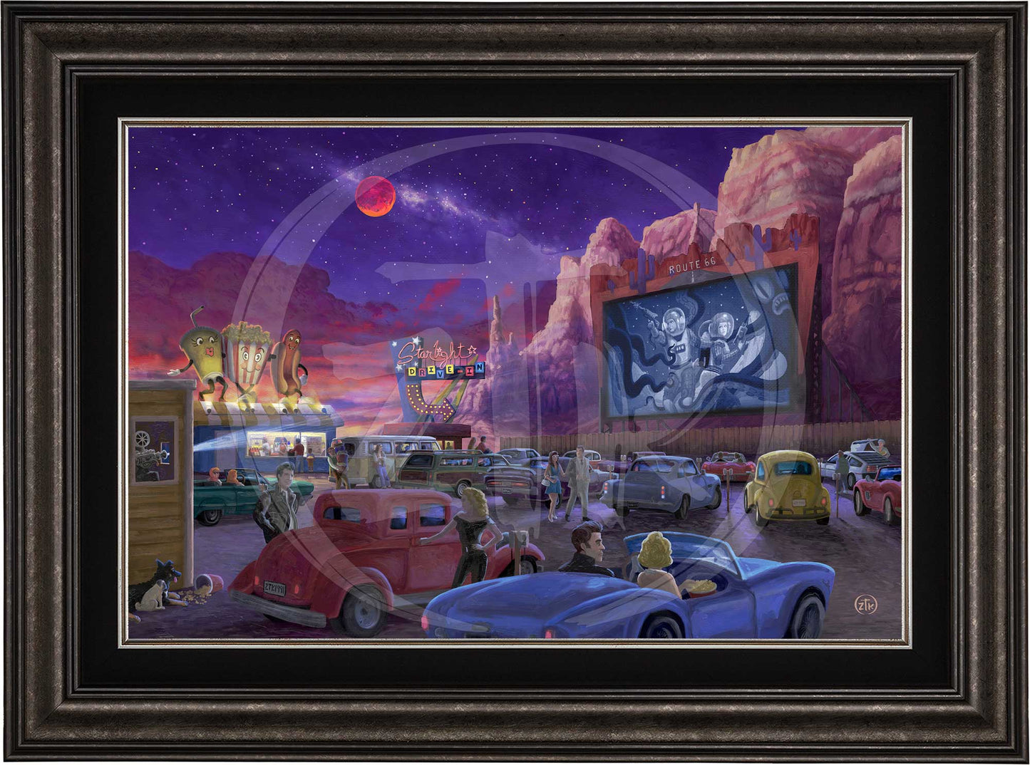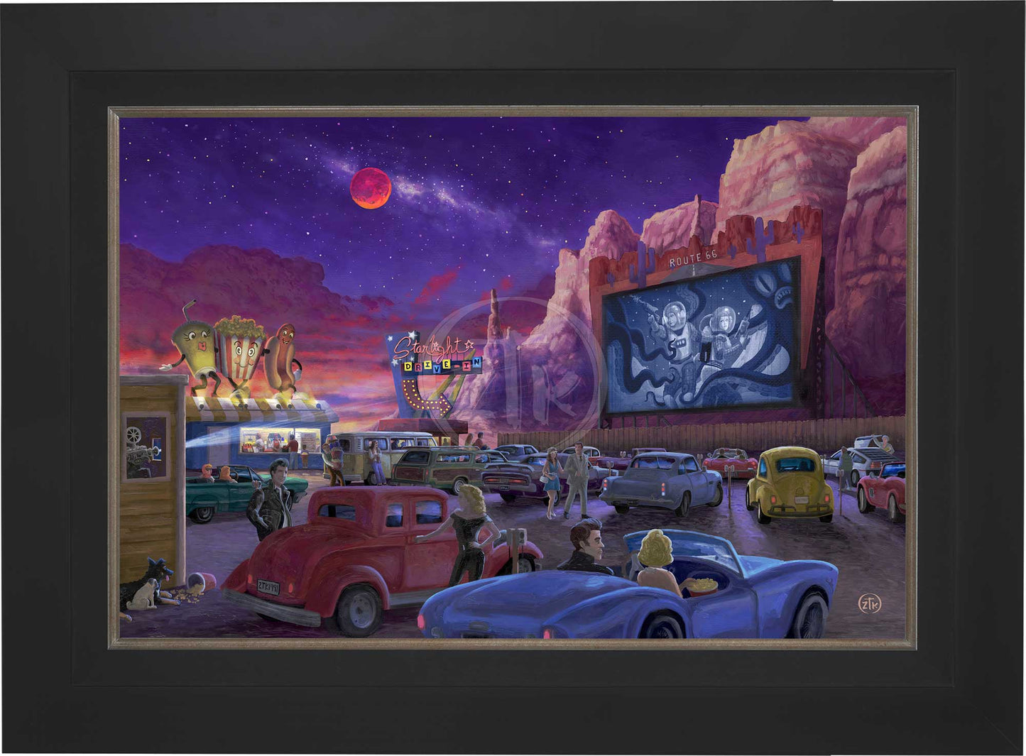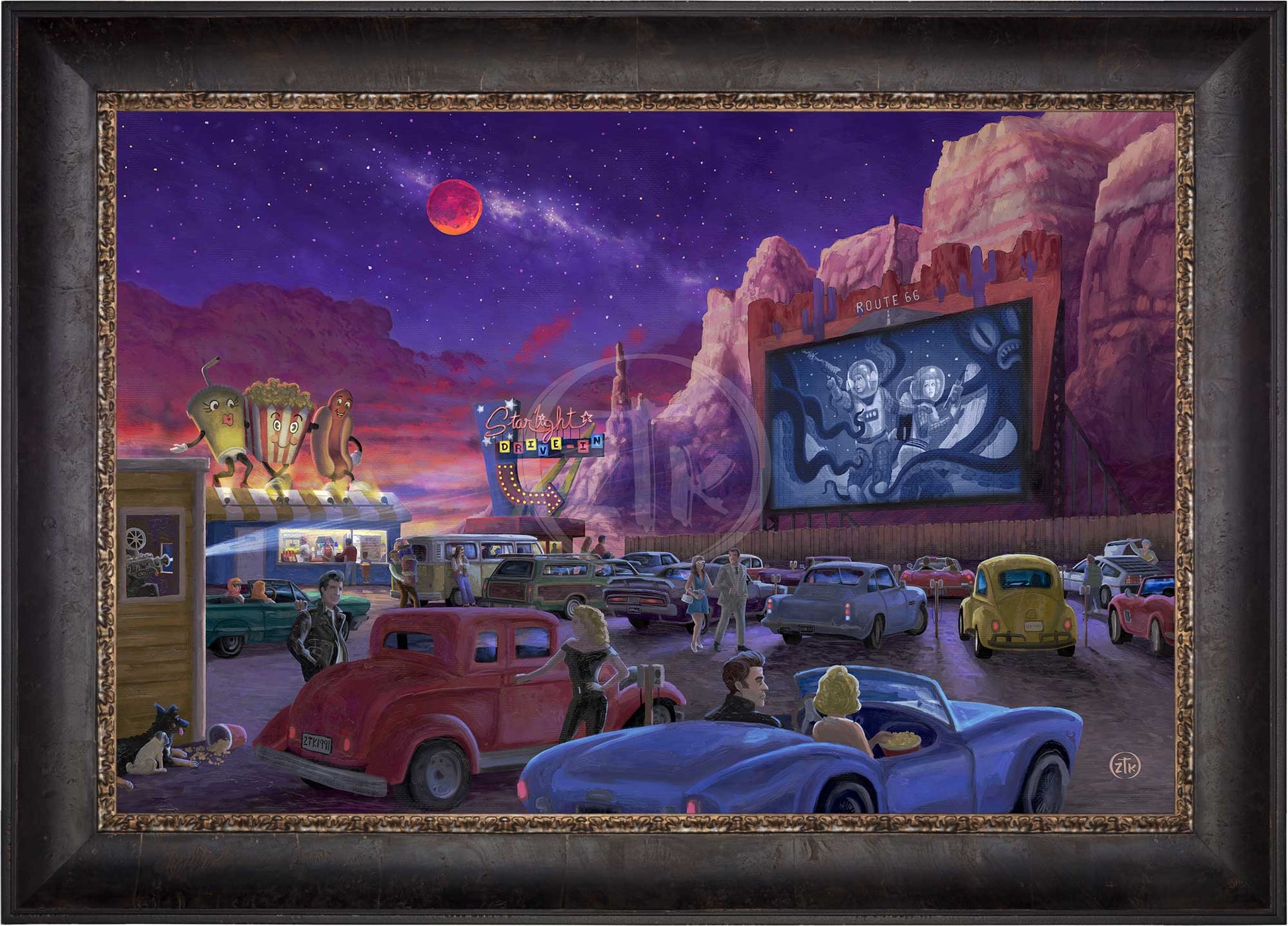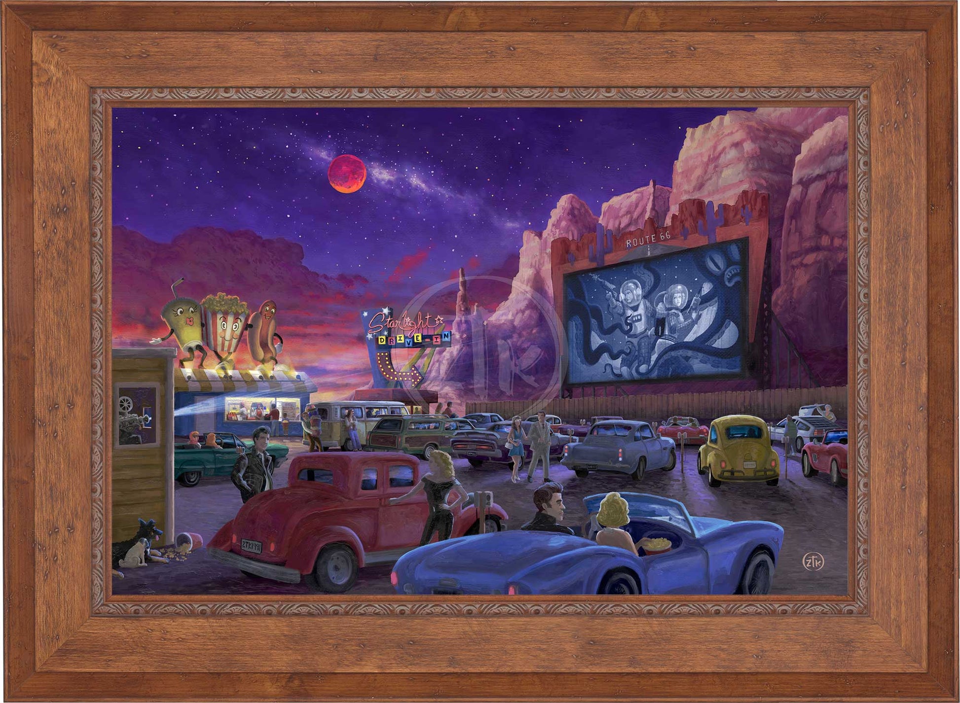 Welcome back to America’s Main Street and one of this country’s great motoring traditions! As I continue to get my kicks on Route 66, I wanted to explore the fun and nostalgia for the drive-in movie. My father always tells stories of the Se Rancho drive-in where he and my Uncle Thom enjoyed countless family evenings at the theater playground and eating snow cones from the snack stand. In their teen years, they would hide in the trunks of friends’ cars to sneak into the movie or borrow their mother’s truck to go on dates with their girlfriends. In my imagination, the starlight is filled with automobiles and film characters that graced Hollywood’s silver screen. Look closely and you may see a British superspy and his signature sports car in addition to a very amorous beetle. Two female outlaws sit in their signature ride enjoying the film, while a musical couple stand by their Greased Lightning™ on a hot summer's night. There is a station wagon ready for a vacation and even a stainless steel car designed to get you to the future and back in film. Whether you are a fan of science fiction, horror, westerns or romance, I hope you enjoy your night at the movies. As always, thank you for sharing my adventure in art.