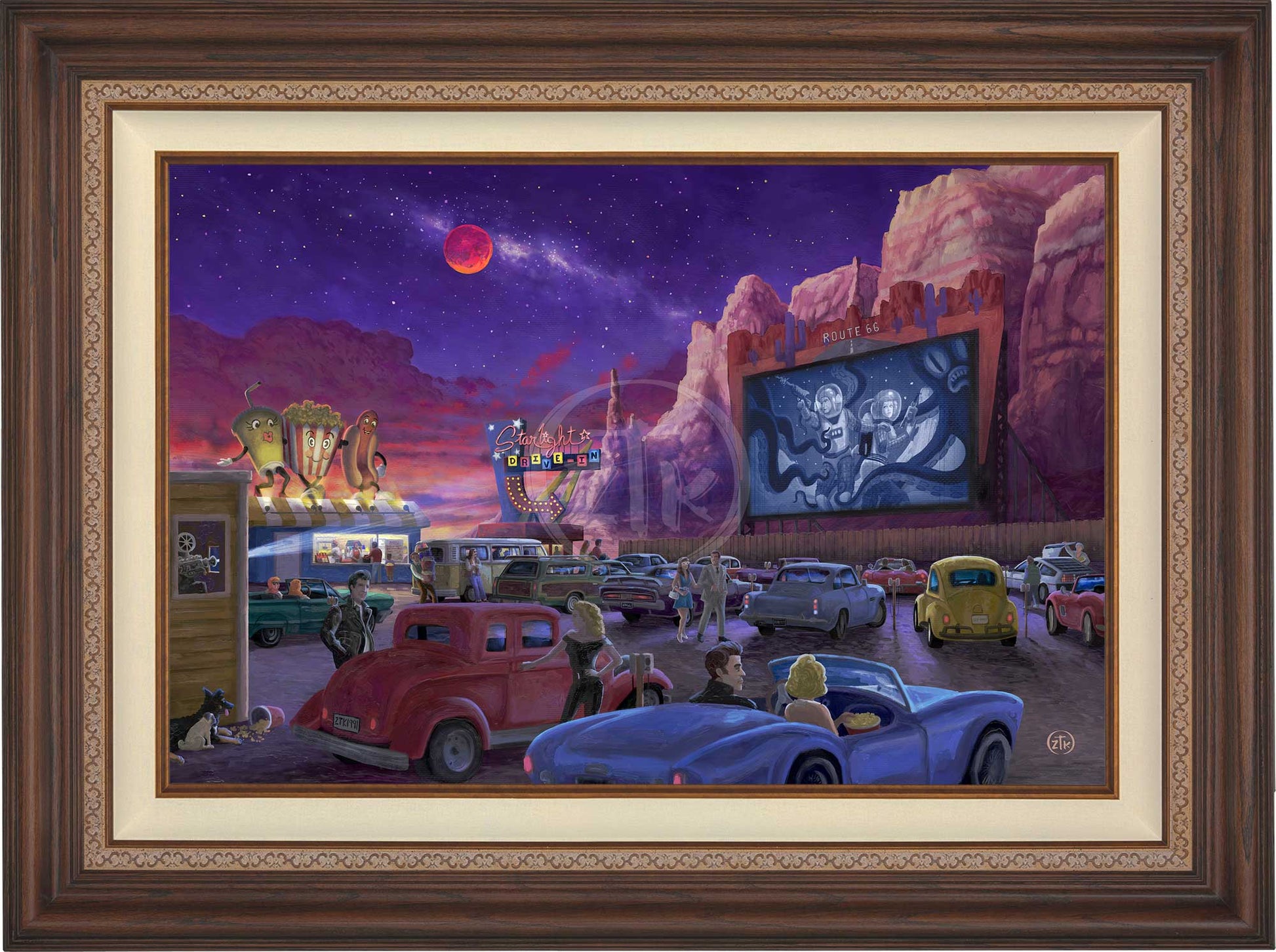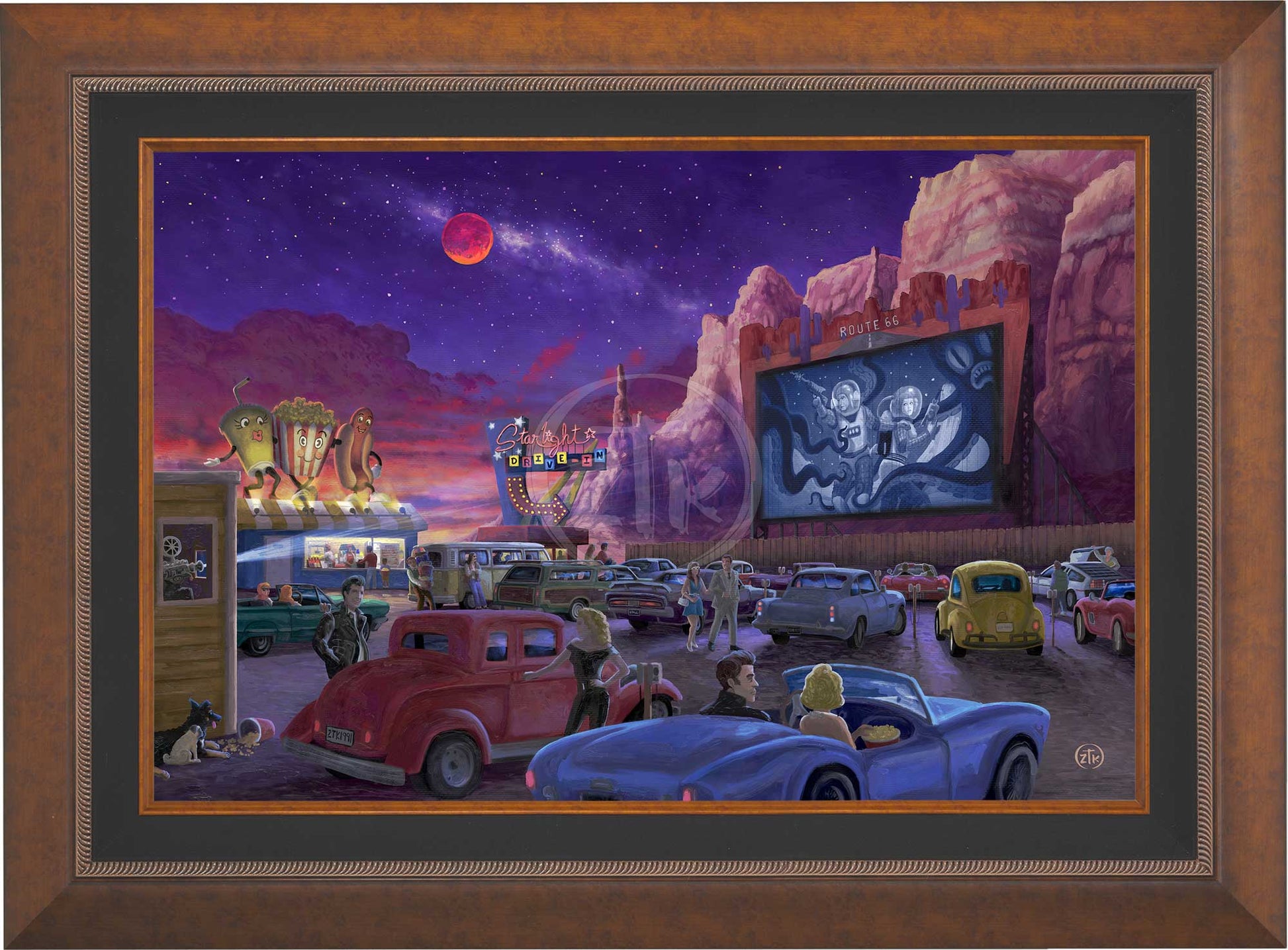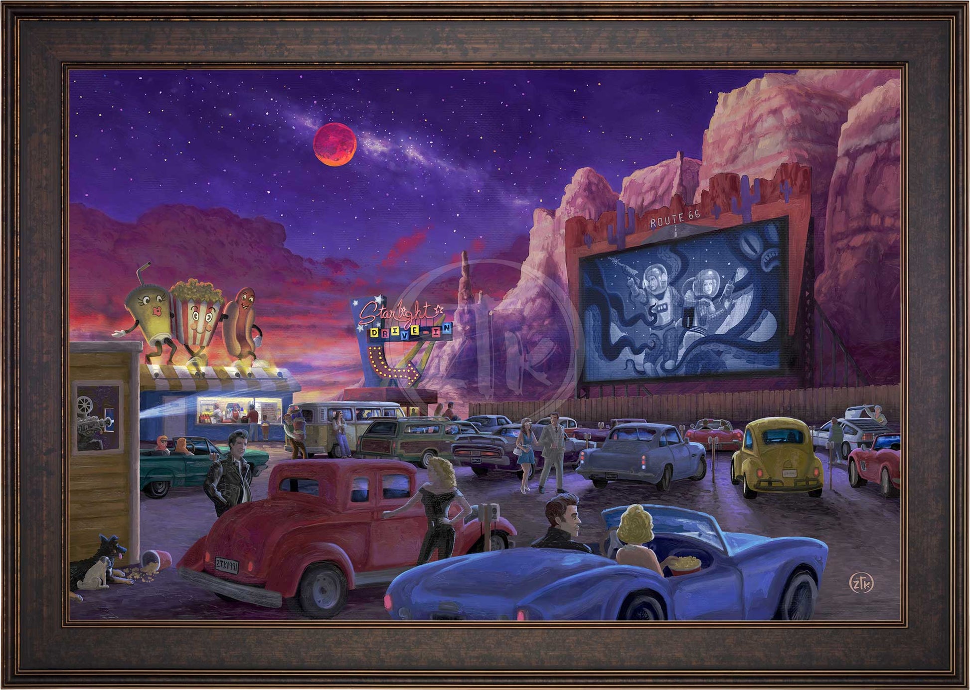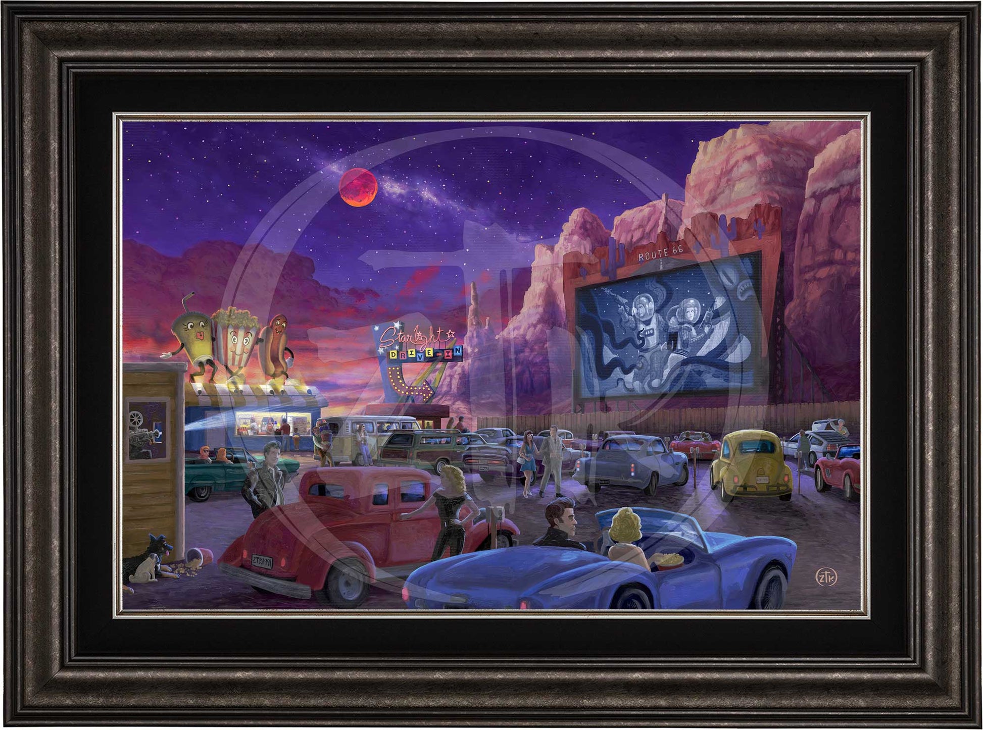 Welcome back to America’s Main Street and one of this country’s great motoring traditions! As I continue to get my kicks on Route 66, I wanted to explore the fun and nostalgia for the drive-in movie. My father always tells stories of the Se Rancho drive-in where he and my Uncle Thom enjoyed countless family evenings at the theater playground and eating snow cones from the snack stand. In their teen years, they would hide in the trunks of friends’ cars to sneak into the movie or borrow their mother’s truck to go on dates with their girlfriends. In my imagination, the starlight is filled with automobiles and film characters that graced Hollywood’s silver screen. Look closely and you may see a British superspy and his signature sports car in addition to a very amorous beetle. Two female outlaws sit in their signature ride enjoying the film, while a musical couple stand by their Greased Lightning™ on a hot summer's night. There is a station wagon ready for a vacation and even a stainless steel car designed to get you to the future and back in film. Whether you are a fan of science fiction, horror, westerns or romance, I hope you enjoy your night at the movies. As always, thank you for sharing my adventure in art.