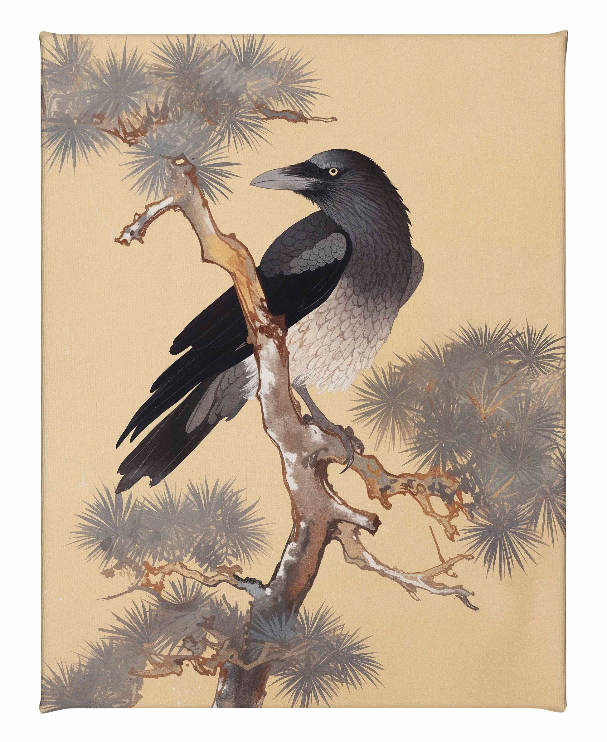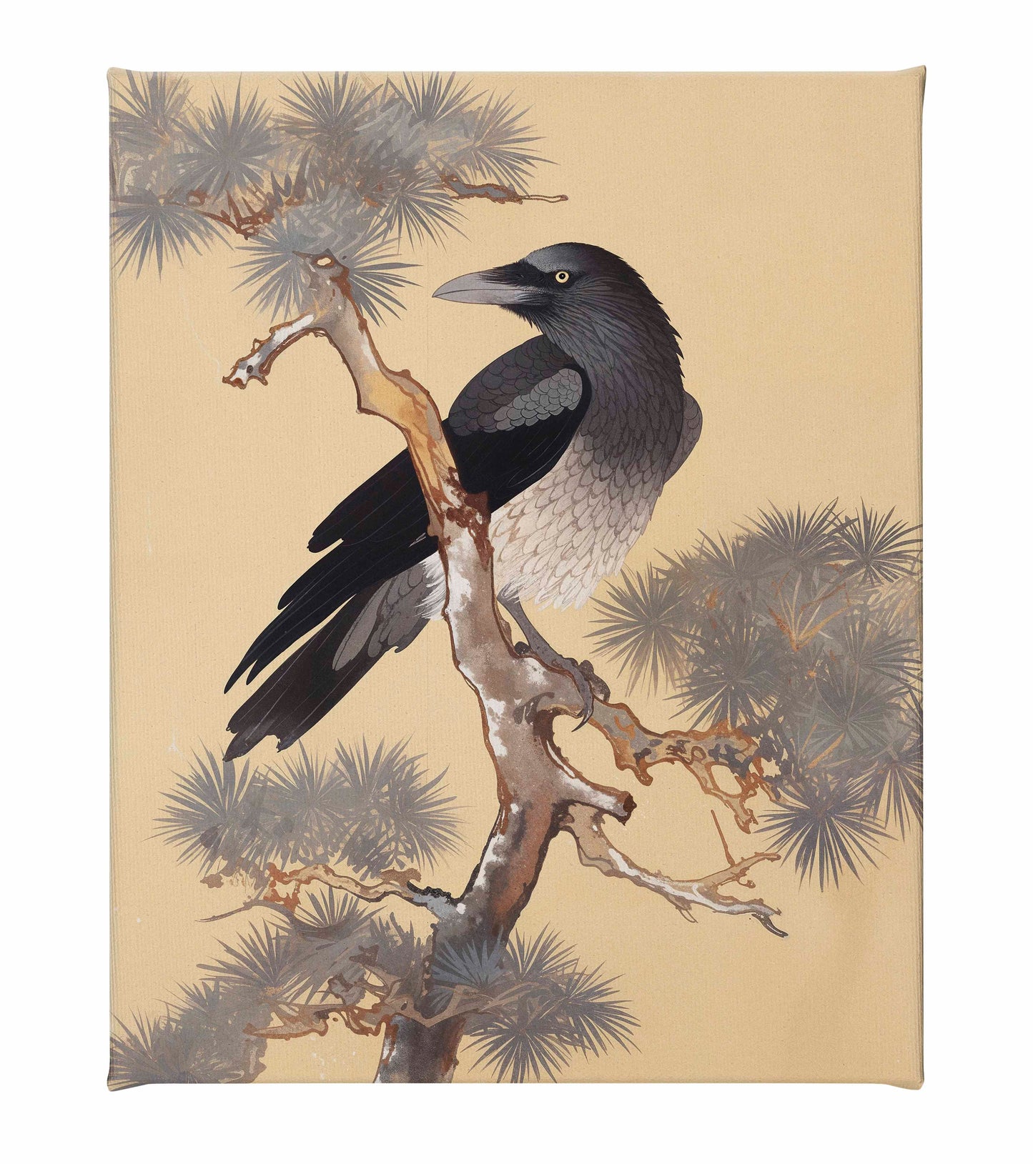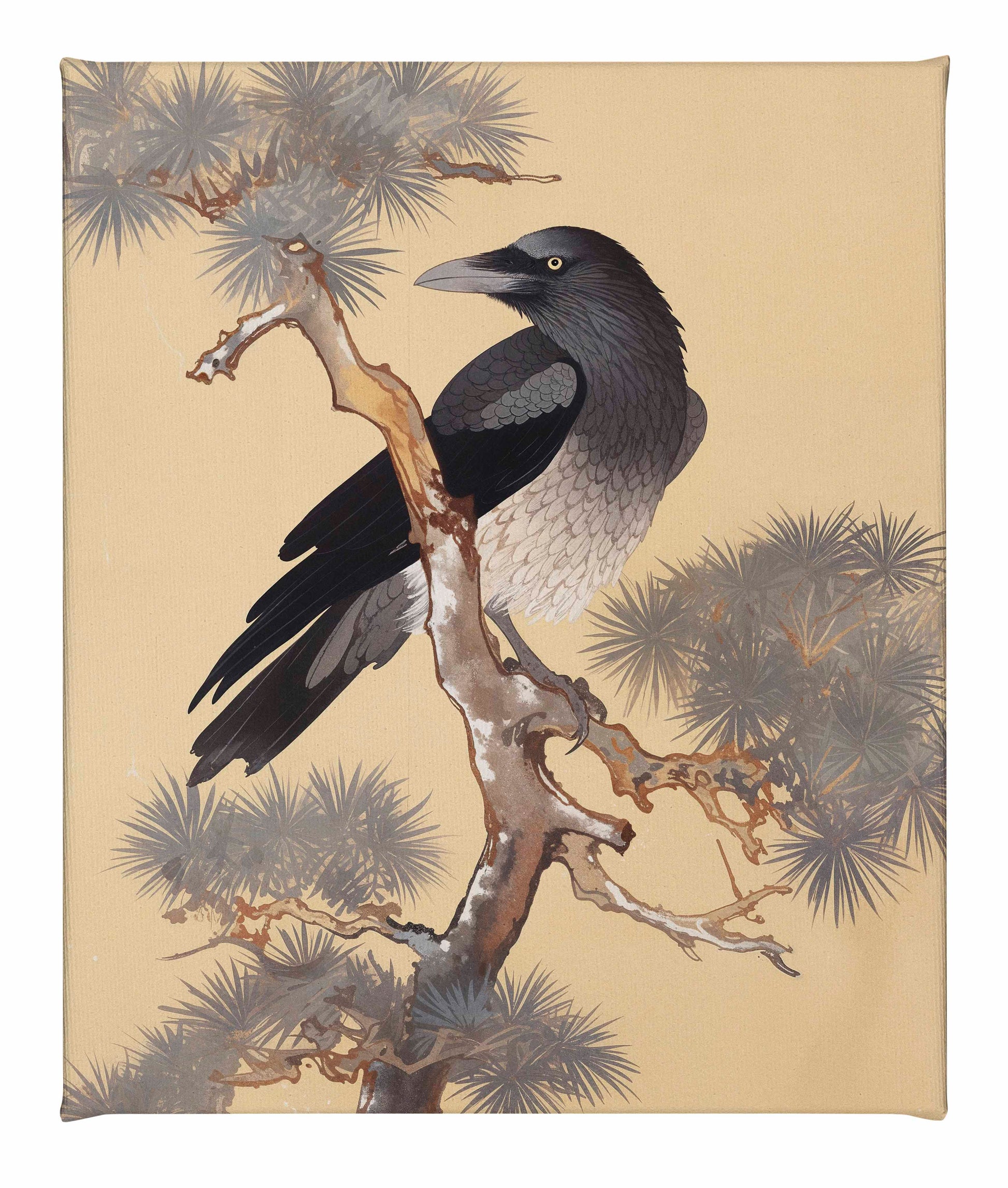 The artist's masterful use of color and composition highlights the raven's intelligent and watchful demeanor. This painting exudes a sense of mystery and contemplation, inviting viewers to ponder the symbolic meanings often associated with ravens. Mystic Watcher - Raven in Pine Grove is perfect for collectors and nature enthusiasts who appreciate the profound beauty and subtle intrigue of avian subjects, elegantly captured in the style of traditional Japanese art.
