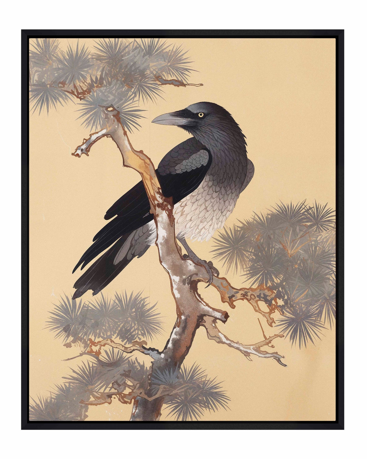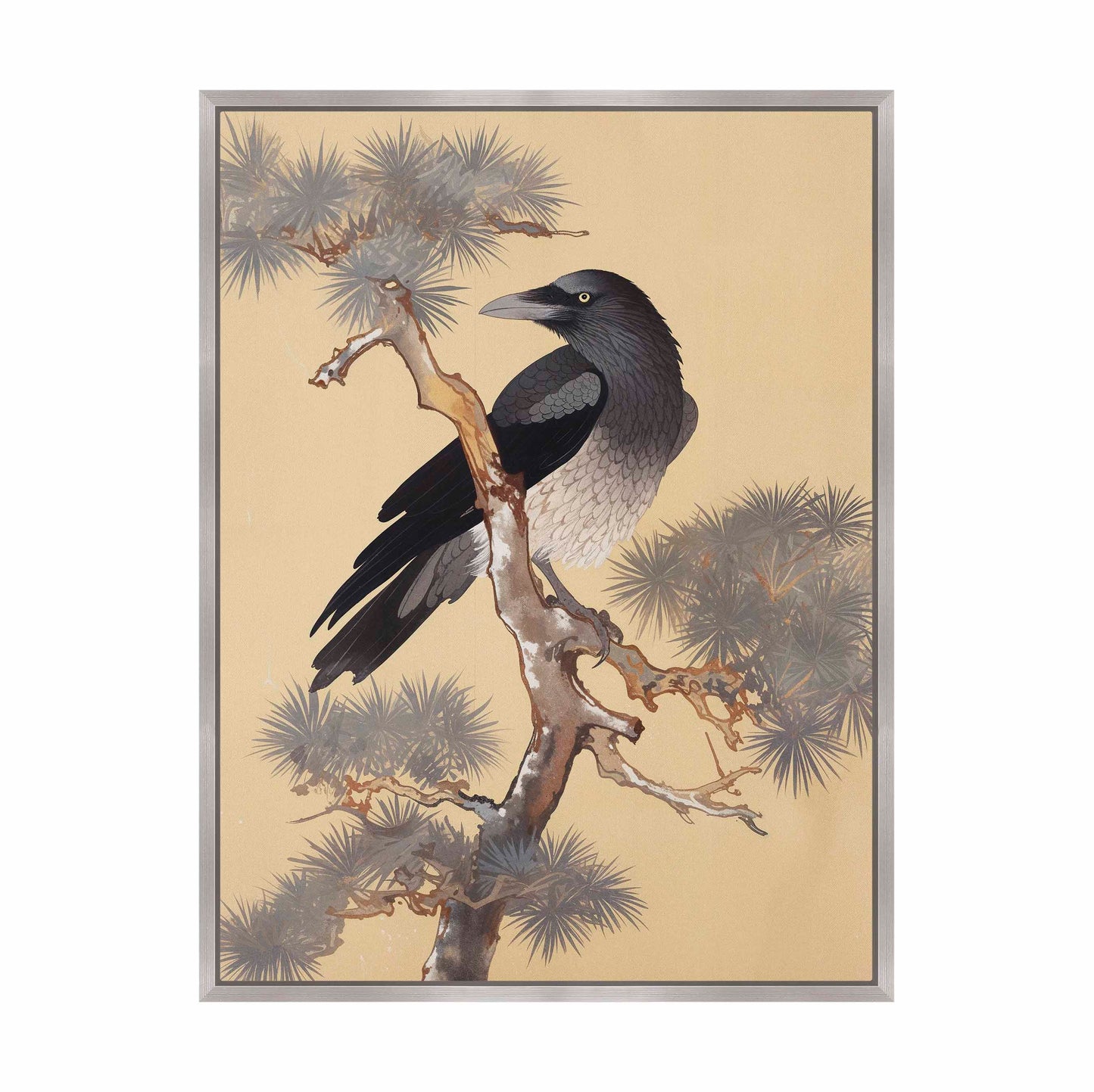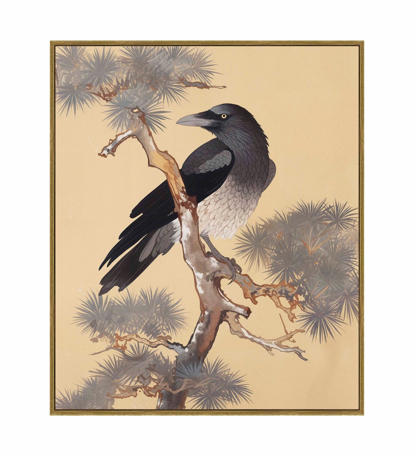 Mystic Watcher - Raven in Pine Grove is an evocative piece from the Kyoto Summer Collection, capturing the enigmatic presence of a raven perched gracefully amidst a tranquil pine grove. The raven's sleek black and grey feathers contrast beautifully against the warm, golden background and the soft needles of the pine tree.