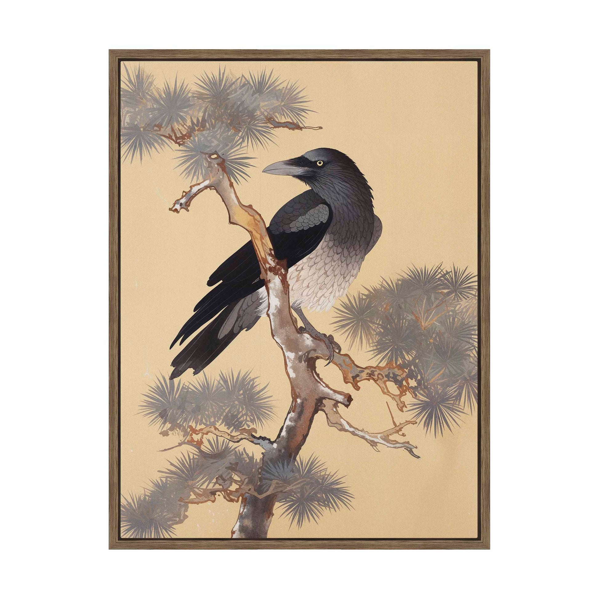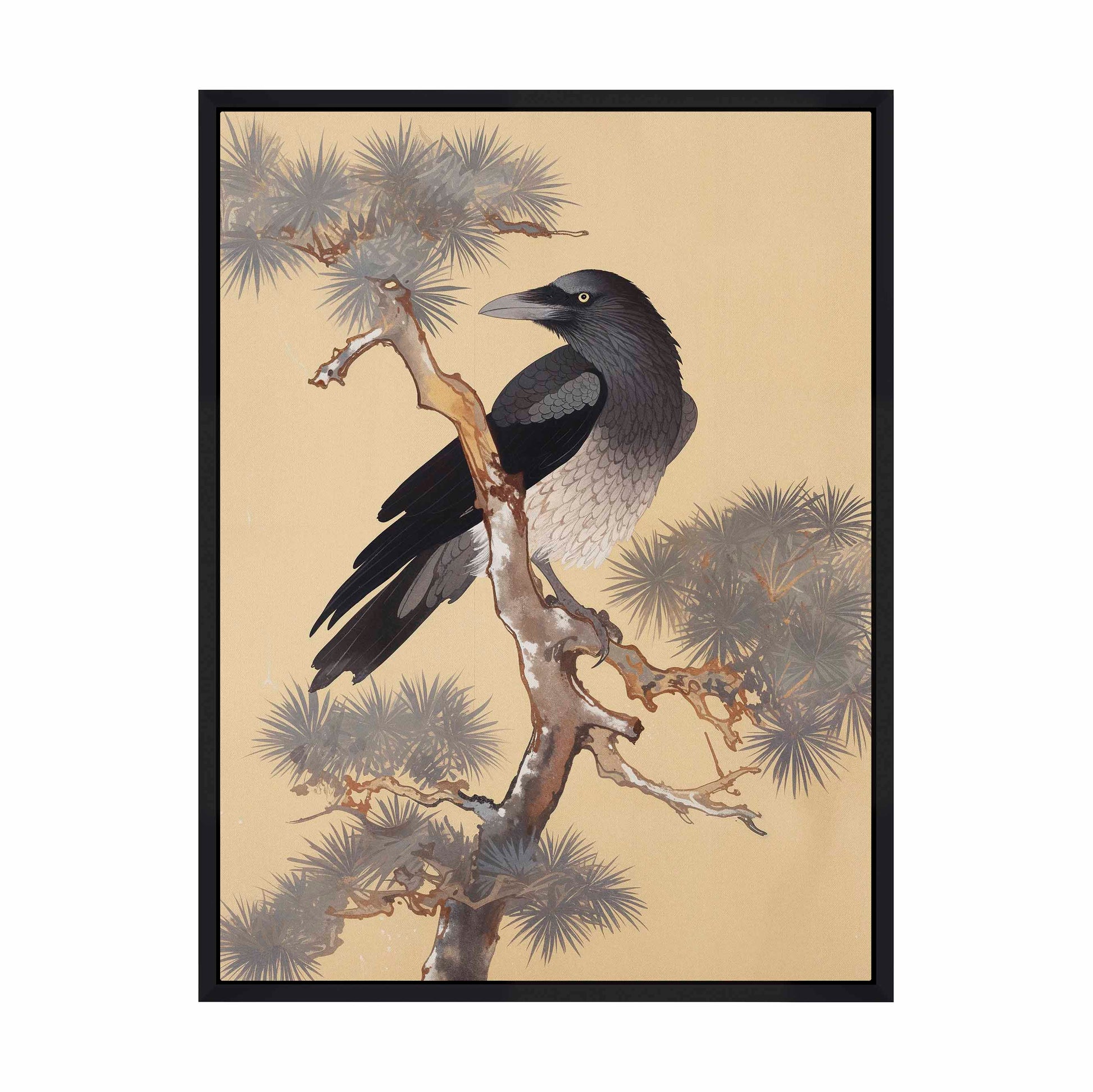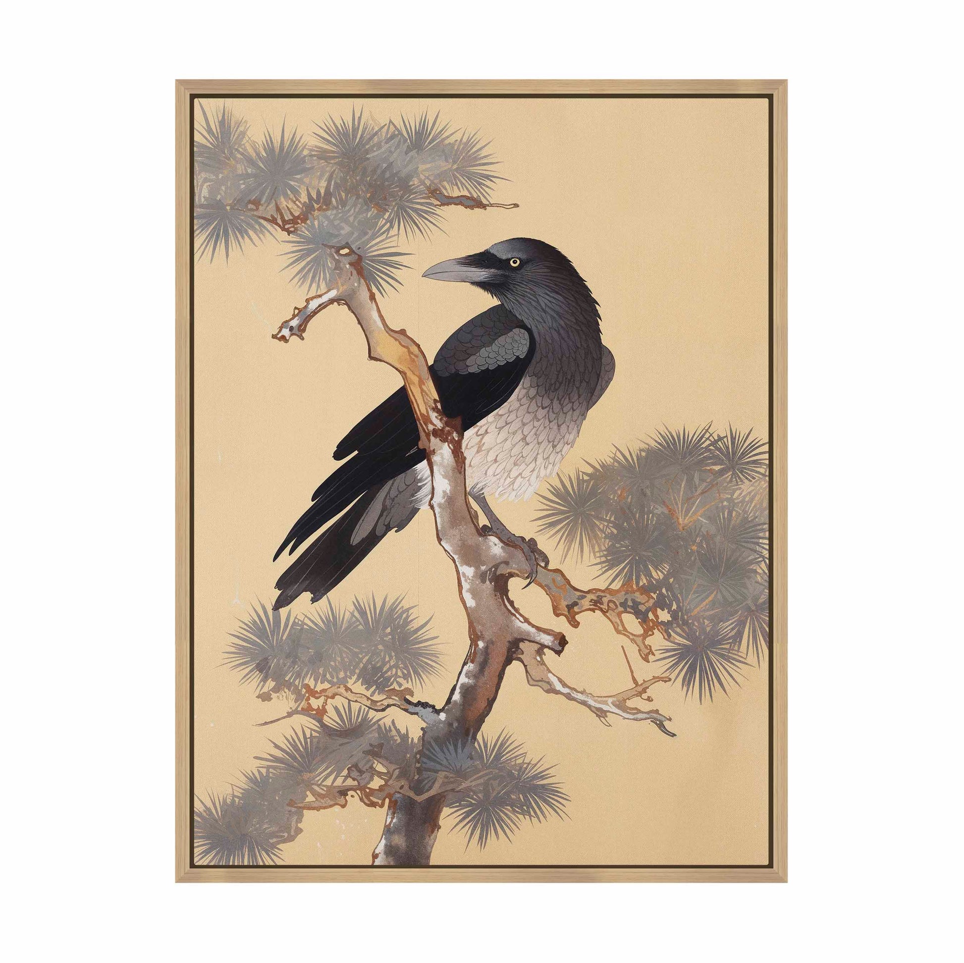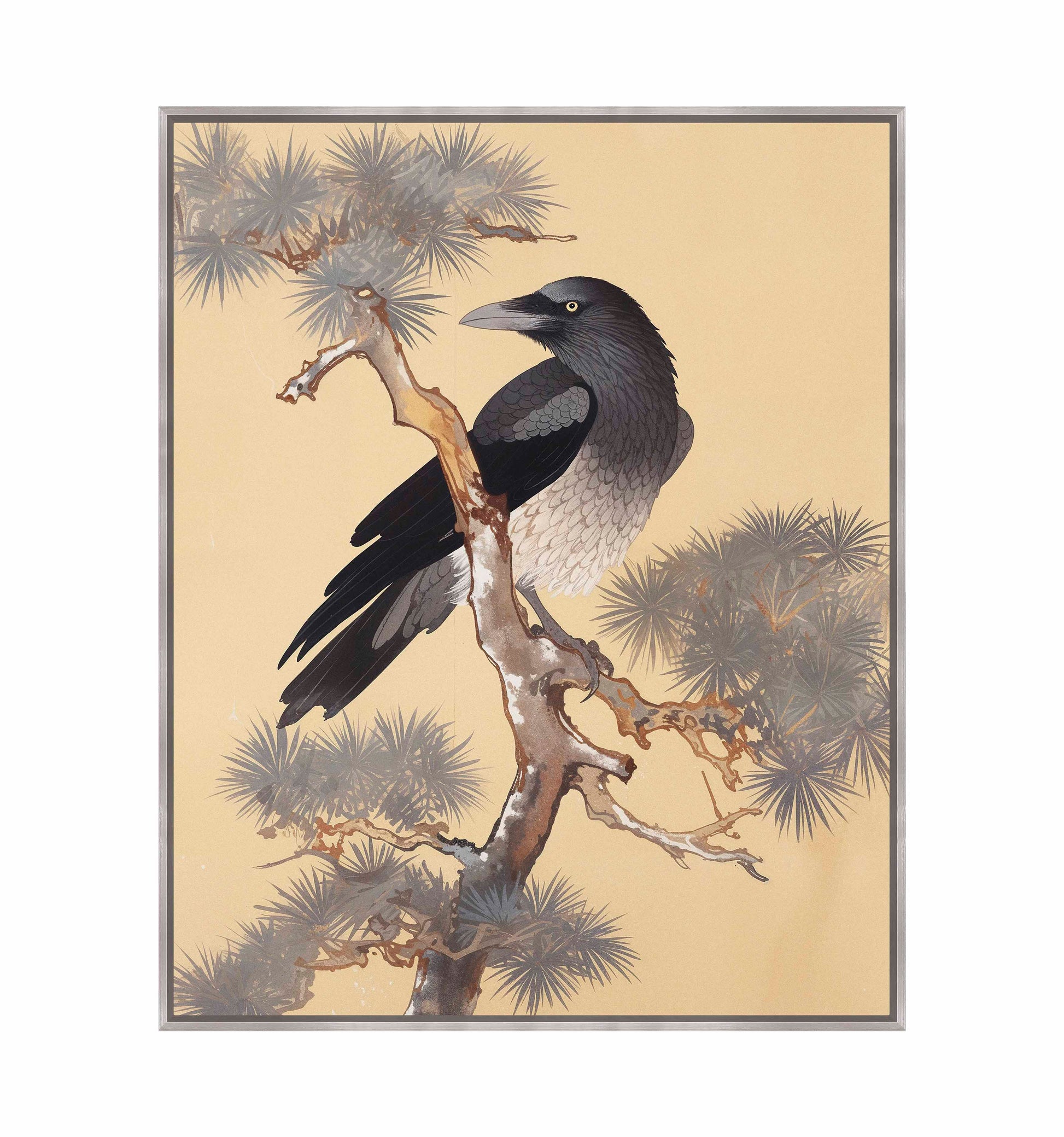 Mystic Watcher - Raven in Pine Grove is an evocative piece from the Kyoto Summer Collection, capturing the enigmatic presence of a raven perched gracefully amidst a tranquil pine grove. The raven's sleek black and grey feathers contrast beautifully against the warm, golden background and the soft needles of the pine tree.