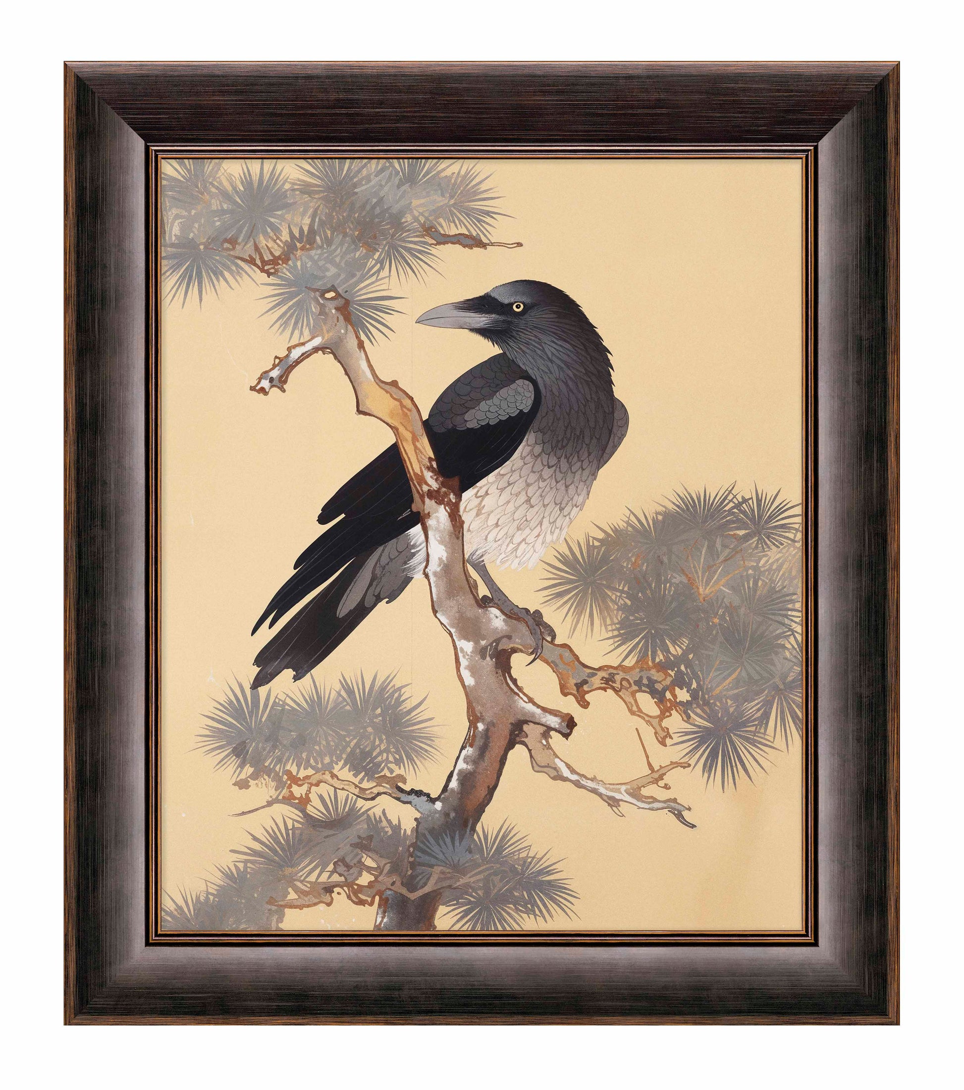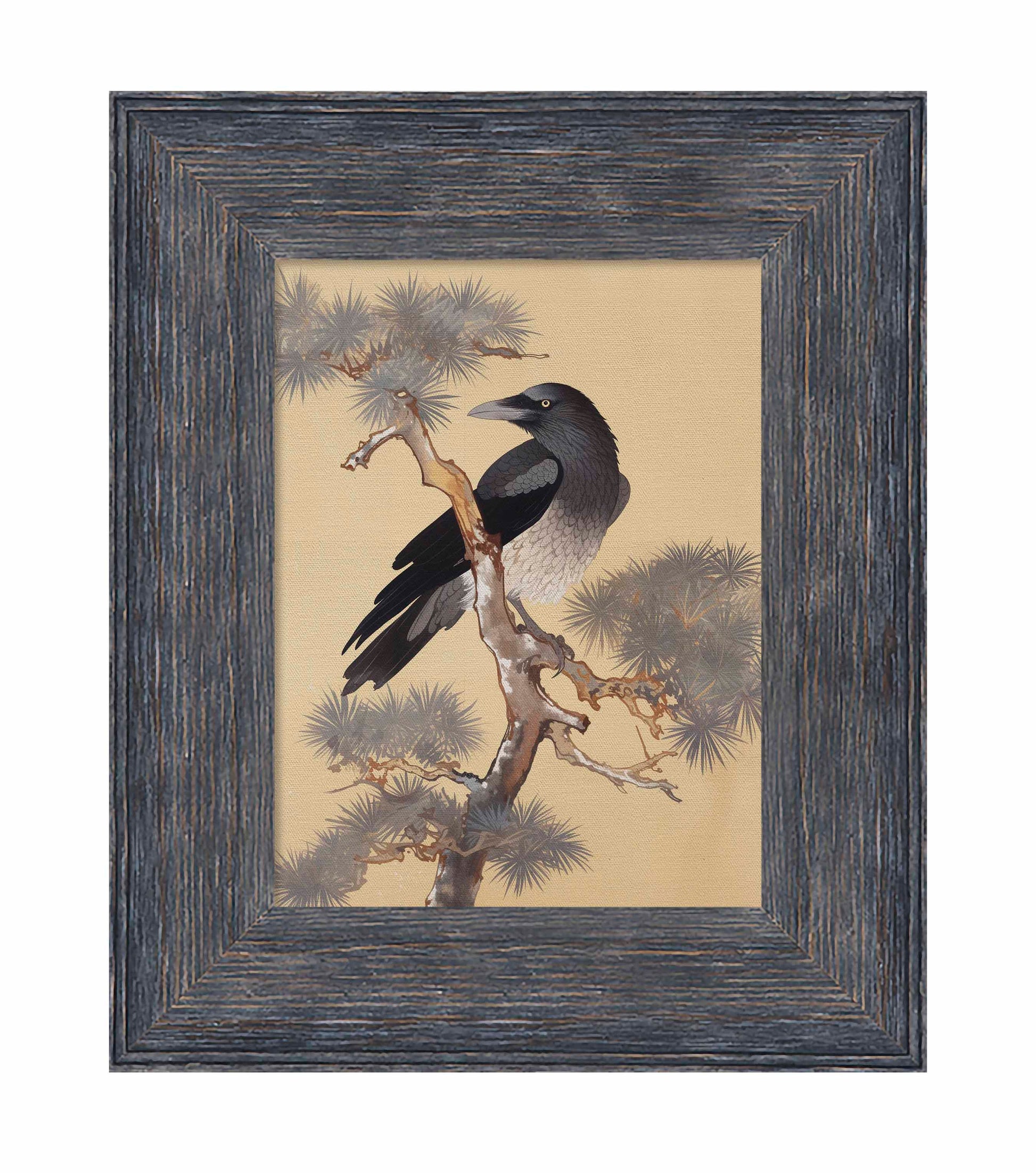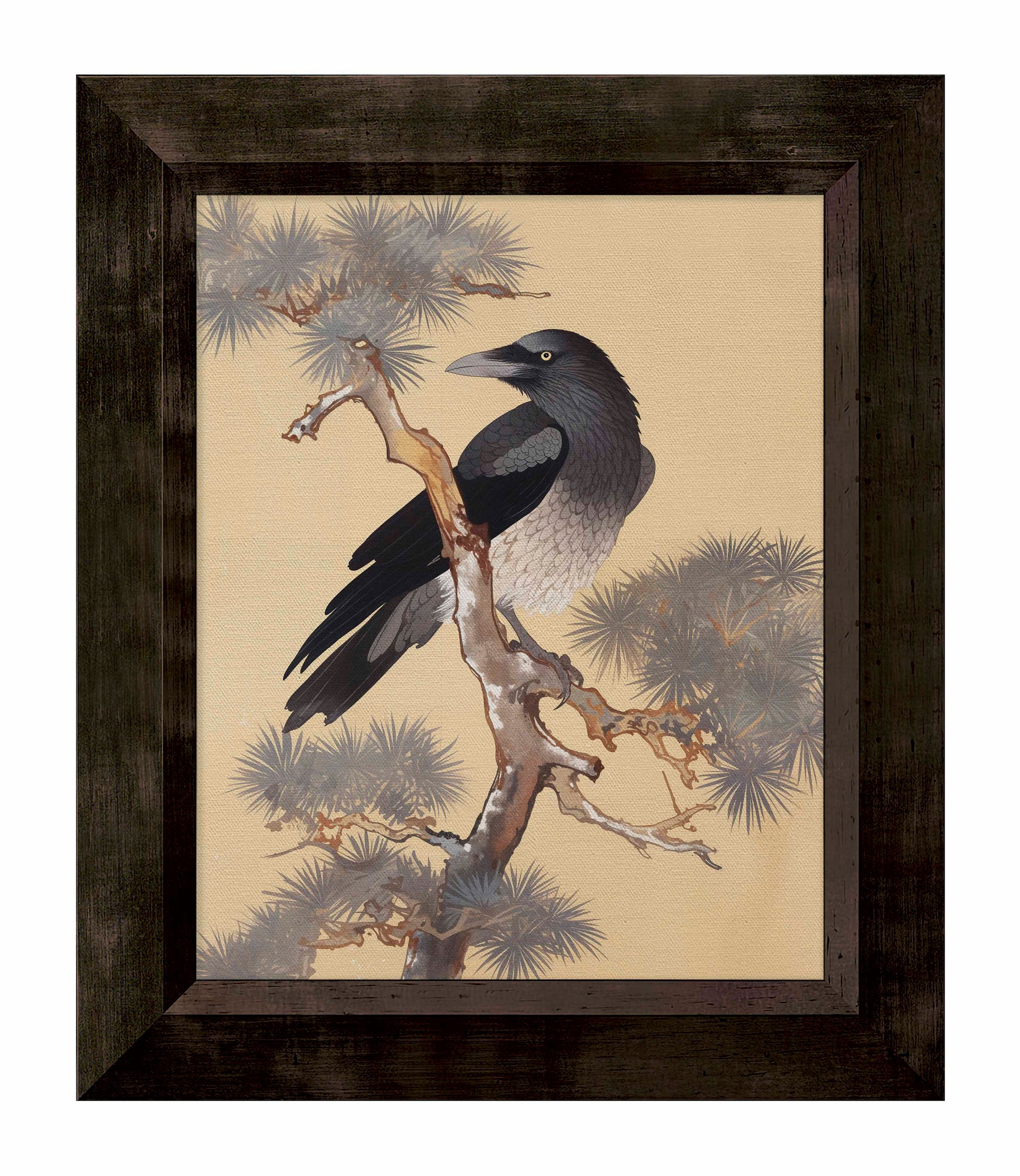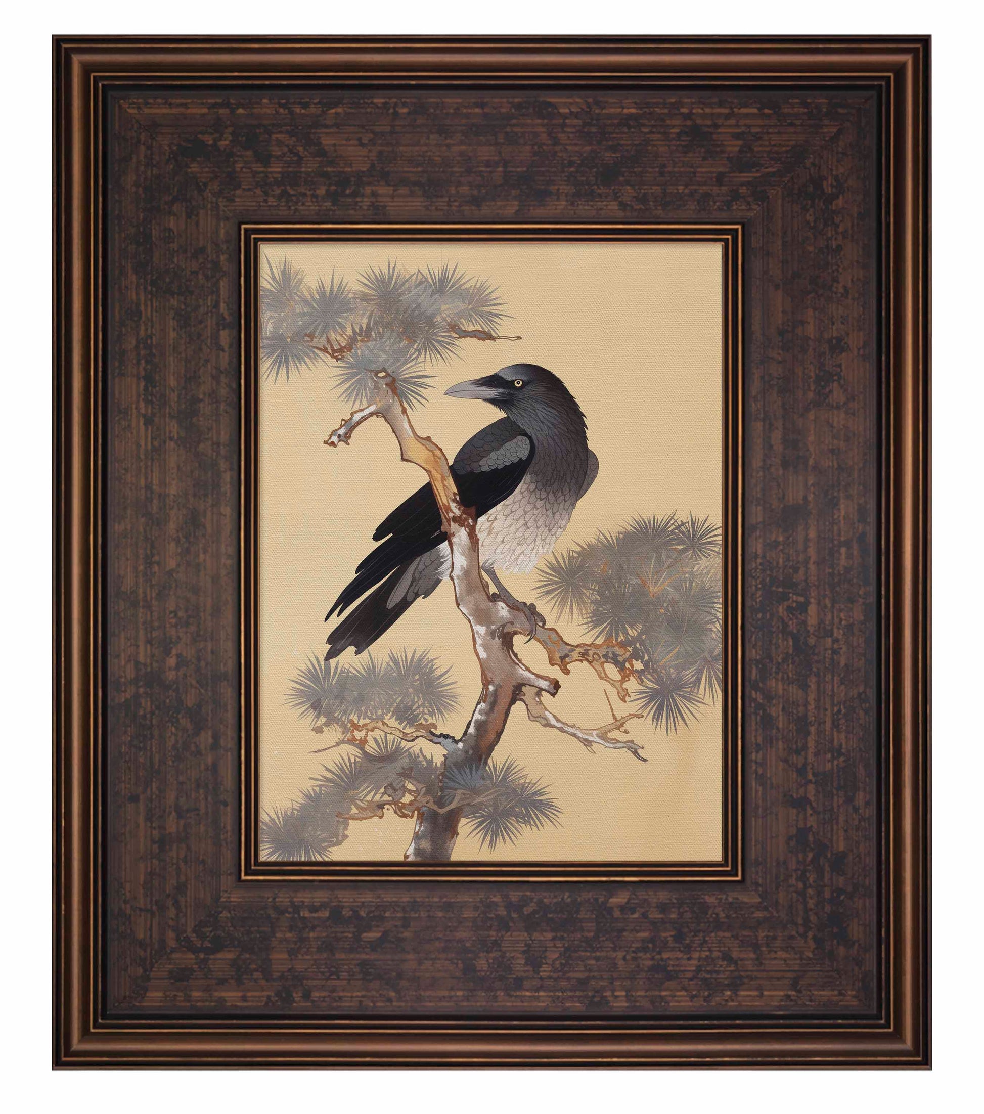 Mystic Watcher - Raven in Pine Grove is an evocative piece from the Kyoto Summer Collection, capturing the enigmatic presence of a raven perched gracefully amidst a tranquil pine grove. The raven's sleek black and grey feathers contrast beautifully against the warm, golden background and the soft needles of the pine tree.